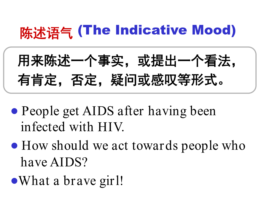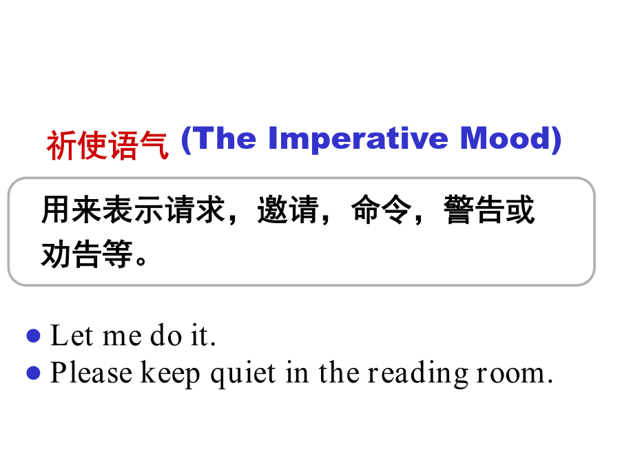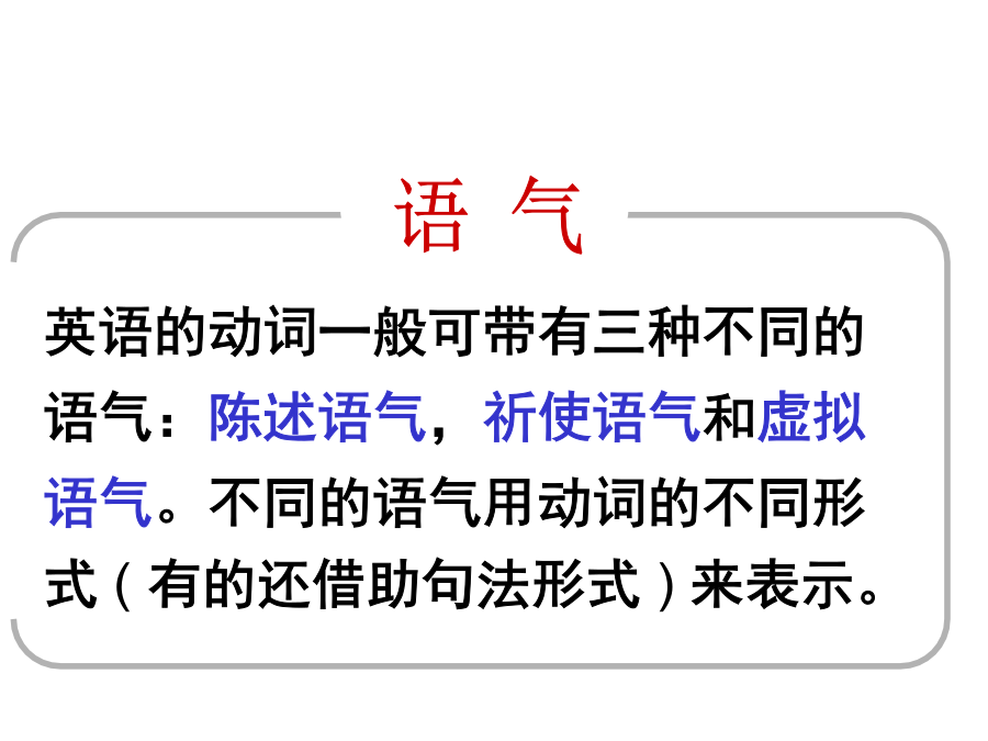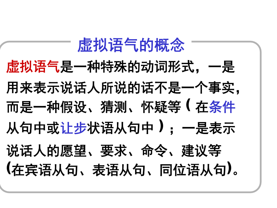 SubjunctiveMood英语的动词一般可带有三种不同的 语气:陈述语气,祈使语气和虚拟 语气。不同的语气用动词的不同形 式(有的还借助句法形式)来表示。用来陈述一个事实,或提出一个看法, 有肯定,否定,疑问或感叹等形式。用来表示请求,邀请,命令,警告或 劝告等。虚拟语气是一种特殊的动词形式,一是 用来表示说话人所说的话不是一个事实, 而是一种假设、猜测、怀疑等(在条件 从句中或让步状语从句中);一是表示 说话人的愿望、要求、命令、建议等 (在宾语从句、表语从句、同位语从句)。1.IfI_______(be)you,I______________ (take)heradvice. 2.IfI___________(be)therethen,I _______________________(help)them. 3.Ifyou___________________________ _____________(go)abroadinthe future,you______________(find) Englishreallyhelpful.1.Ifit_____________(rain)lastnight, it____________(be)verycooltoday.有时用butfor,withoutor otherwise等词代替条件句思考:还有哪些词语会引起类似的动词形式呢?wish,asif/asthough,would rather,ifonly等词所接的从句谓语 也用“时态前推”型4.HespeaksEnglishsowellasthoughhe _______________(study)Englishin England. 5.Itlooksasifit____(be)goingtorain. 6.I’dratherhe_____________(not,tell) youaboutit. 7.IfonlyI_______(be)asyoungasyou! 8.IfonlyI________________(follow) youradvicethen!二、(should)+动词原形型suggest(建议),propose, advise,ask,request, demand,require, insist(坚决主张),order, desire等。2.主语从句中Practice:(Translation)3.与suggestion,order,advice, request,demand(n.)等有关的 表语或同位语从句、一般过去式型四、情态动词+havedone型五、动词原形型(表祝愿时)