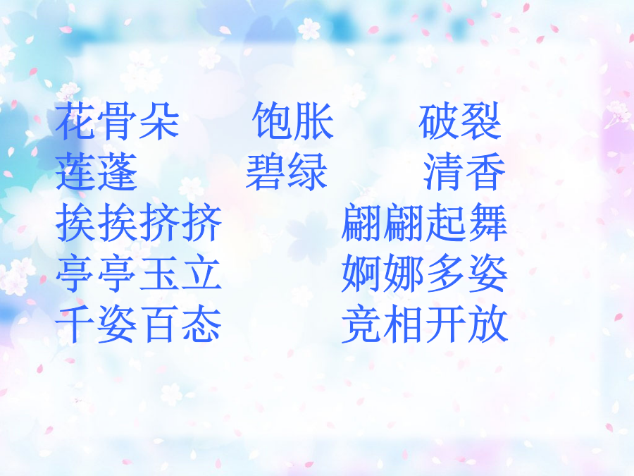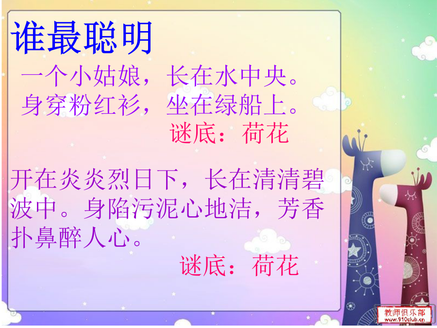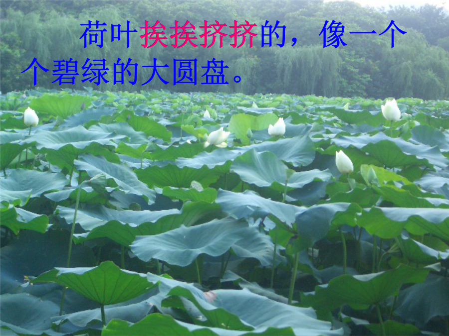 谁最聪明花骨朵饱胀破裂莲蓬碧绿清香挨挨挤挤翩翩起舞 亭亭玉立婀娜多姿千姿百态竞相开放请同学们自由读课文的第2、3自然段,边读边想,你觉得这段话中哪个句子写得特别美,哪几个词语用得好,在旁边写一写你的体会。白荷花在这些大圆盘之间冒出来。有的才展开两三片花瓣儿。有的花瓣儿全都展开了,露出嫩黄色的小莲蓬。有的还是花骨朵儿,看起来饱胀得马上要破裂似的。有的才展开两三片花瓣儿。这么多的白荷花,一朵有一朵的姿势。两三片花瓣的荷花马上要破裂的荷花花骨朵争奇斗艳如果把眼前的一池荷花看作一大幅活的画,那画家的本领可真了不起。