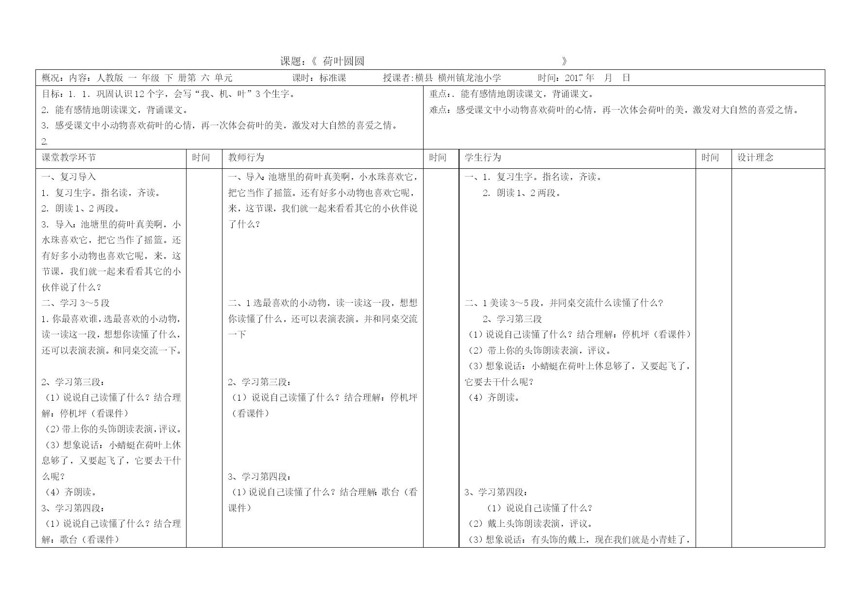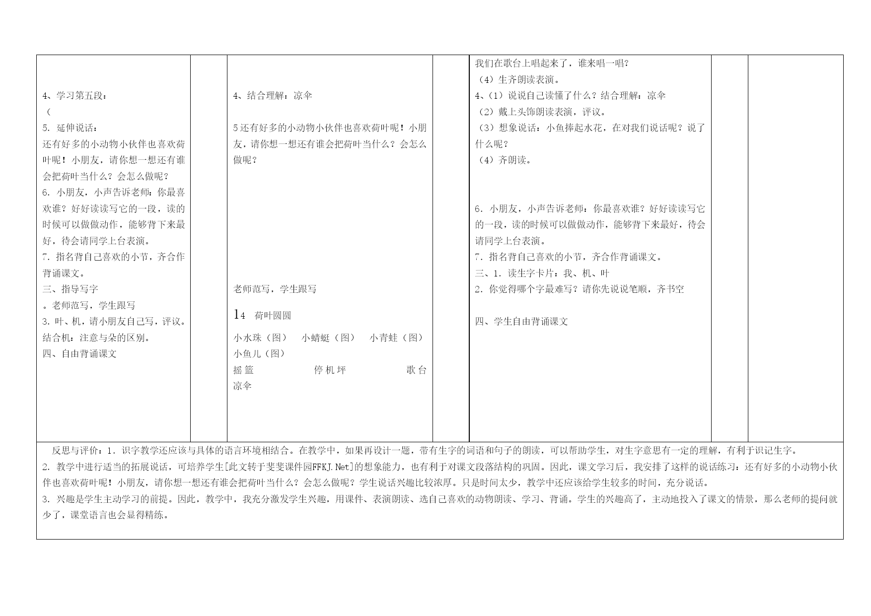 课题:《荷叶圆圆》 概况:内容:人教版一年级下册第六单元课时:标准课授课者:横县横州镇龙池小学时间:2017年月日目标:1.1.巩固认识12个字,会写“我、机、叶”3个生字。 2.能有感情地朗读课文,背诵课文。 3.感受课文中小动物喜欢荷叶的心情,再一次体会荷叶的美,激发对大自然的喜爱之情。 2.重点:.能有感情地朗读课文,背诵课文。 难点:感受课文中小动物喜欢荷叶的心情,再一次体会荷叶的美,激发对大自然的喜爱之情。课堂教学环节时间教师行为时间学生行为时间设计理念一、复习导入 1.复习生字。指名读,齐读。 2.朗读1、2两段。 3.导入:池塘里的荷叶真美啊,小水珠喜欢它,把它当作了摇篮。还有好多小动物也喜欢它呢,来,这节课,我们就一起来看看其它的小伙伴说了什么? 二、学习3~5段 1.你最喜欢谁,选最喜欢的小动物,读一读这一段,想想你读懂了什么,还可以表演表演。和同桌交流一下。 2、学习第三段: (1)说说自己读懂了什么?结合理解:停机坪(看课件) (2)带上你的头饰朗读表演,评议。 (3)想象说话:小蜻蜓在荷叶上休息够了,又要起飞了,它要去干什么呢? (4)齐朗读。 3、学习第四段: (1)说说自己读懂了什么?结合理解:歌台(看课件) 4、学习第五段: ( 5.延伸说话: 还有好多的小动物小伙伴也喜欢荷叶呢!小朋友,请你想一想还有谁会把荷叶当什么?会怎么做呢? 6.小朋友,小声告诉老师:你最喜欢谁?好好读读写它的一段,读的时候可以做做动作,能够背下来最好,待会请同学上台表演。 7.指名背自己喜欢的小节,齐合作背诵课文。 三、指导写字 。老师范写,学生跟写 3.叶、机,请小朋友自己写,评议。结合机:注意与朵的区别。 四、自由背诵课文 一、导入:池塘里的荷叶真美啊,小水珠喜欢它,把它当作了摇篮。还有好多小动物也喜欢它呢,来,这节课,我们就一起来看看其它的小伙伴说了什么? 二、1选最喜欢的小动物,读一读这一段,想想你读懂了什么,还可以表演表演。并和同桌交流一下 2、学习第三段: (1)说说自己读懂了什么?结合理解:停机坪(看课件) 3、学习第四段: (1)说说自己读懂了什么?结合理解:歌台(看课件) 4、结合理解:凉伞 5还有好多的小动物小伙伴也喜欢荷叶呢!小朋友,请你想一想还有谁会把荷叶当什么?会怎么做呢? 老师范写,学生跟写 14荷叶圆圆 小水珠(图)小蜻蜓(图)小青蛙(图)小鱼儿(图) 摇篮停机坪歌台凉伞 一、1.复习生字。指名读,齐读。 2.朗读1、2两段。 二、1美读3~5段,并同桌交流什么读懂了什么? 2、学习第三段 (1)说说自己读懂了什么?结合理解:停机坪(看课件) (2)带上你的头饰朗读表演,评议。 (3)想象说话:小蜻蜓在荷叶上休息够了,又要起飞了,它要去干什么呢? (4)齐朗读。 3、学习第四段: (1)说说自己读懂了什么? (2)戴上头饰朗读表演,评议。 (3)想象说话:有头饰的戴上,现在我们就是小青蛙了,我们在歌台上唱起来了,谁来唱一唱? (4)生齐朗读表演。 4、(1)说说自己读懂了什么?结合理解:凉伞 (2)戴上头饰朗读表演,评议。 (3)想象说话:小鱼捧起水花,在对我们说话呢?说了什么呢? (4)齐朗读。 6.小朋友,小声告诉老师:你最喜欢谁?好好读读写它的一段,读的时候可以做做动作,能够背下来最好,待会请同学上台表演。 7.指名背自己喜欢的小节,齐合作背诵课文。 三、1.读生字卡片:我、机、叶 2.你觉得哪个字最难写?请你先说说笔顺,齐书空 四、学生自由背诵课文 反思与评价:1.识字教学还应该与具体的语言环境相结合。在教学中,如果再设计一题,带有生字的词语和句子的朗读,可以帮助学生,对生字意思有一定的理解,有利于识记生字。 2.教学中进行适当的拓展说话,可培养学生[此文转于斐斐课件园FFKJ.Net]的想象能力,也有利于对课文段落结构的巩固。因此,课文学习后,我安排了这样的说话练习:还有好多的小动物小伙伴也喜欢荷叶呢!小朋友,请你想一想还有谁会把荷叶当什么?会怎么做呢?学生说话兴趣比较浓厚。只是时间太少,教学中还应该给学生较多的时间,充分说话。 3.兴趣是学生主动学习的前提。因此,教学中,我充分激发学生兴趣,用课件、表演朗读、选自己喜欢的动物朗读、学习、背诵。学生的兴趣高了,主动地投入了课文的情景,那么老师的提问就少了,课堂语言也会显得精练。