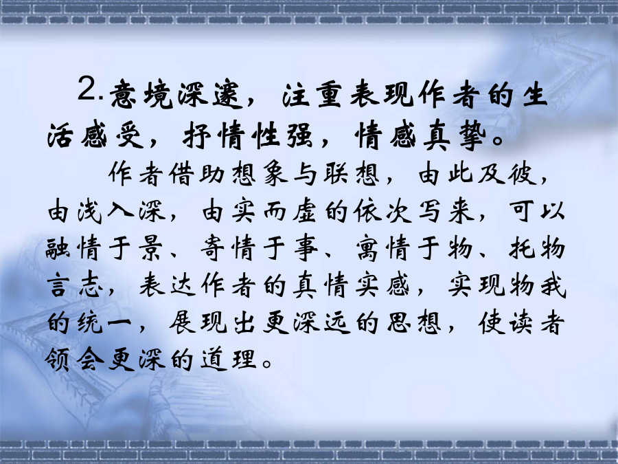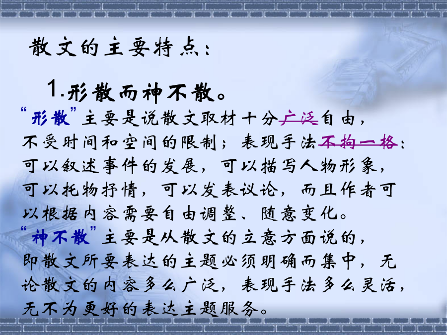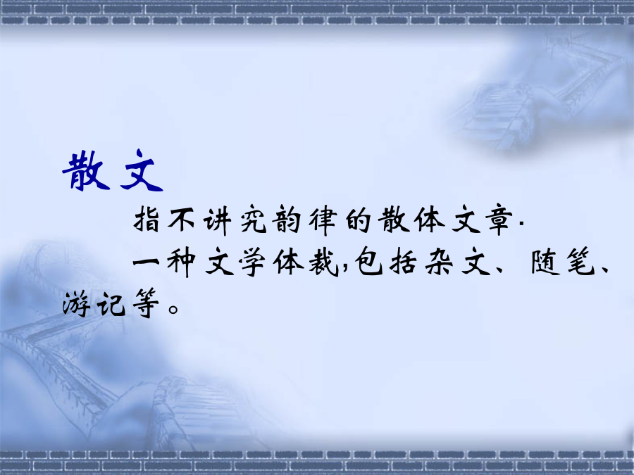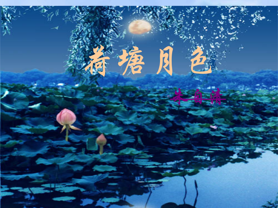 荷塘月色散文 指不讲究韵律的散体文章. 一种文学体裁,包括杂文、随笔、游记等。抒情散文 叙事散文 写景散文 哲理散文1.形散而神不散。 “形散”主要是说散文取材十分广泛自由,不受时间和空间的限制;表现手法不拘一格:可以叙述事件的发展,可以描写人物形象,可以托物抒情,可以发表议论,而且作者可以根据内容需要自由调整、随意变化。“神不散”主要是从散文的立意方面说的,即散文所要表达的主题必须明确而集中,无论散文的内容多么广泛,表现手法多么灵活,无不为更好的表达主题服务。2.意境深邃,注重表现作者的生活感受,抒情性强,情感真挚。 作者借助想象与联想,由此及彼,由浅入深,由实而虚的依次写来,可以融情于景、寄情于事、寓情于物、托物言志,表达作者的真情实感,实现物我的统一,展现出更深远的思想,使读者领会更深的道理。3.语言优美凝练,富于文采。 所谓优美,就是指散文的语言清新明丽,生动活泼,富于音乐感,行文如涓涓流水,叮咚有声,如娓娓而谈,情真意切。所谓凝练,是说散文的语言简洁质朴,自然流畅,寥寥数语就可以描绘出生动的形象,勾勒出动人的场景,显示出深远的意境。散文力求写景如在眼前,写情沁人心脾。散文的鉴赏技法2.读散文要抓住线索,理清作者思路,准确把握文章的立意。 结构是文章的骨架,线索是文章的脉络,二者是紧密联系的。抓住散文中的线索,便可对作品的思路了然于胸,不仅有助于理解作者的写作意图,而且也是对作者谋篇布局本领的鉴赏,从而透过散文的“形散”的表象抓住其传神的精髓,遵循作者的思路,分析文章的立意。4.抒情散文的写作技巧 也就是高考考点要求的“能鉴赏作品的表达技巧”。因此掌握诸如渲染、铺垫、象征、伏笔、照应、悬念等技巧有利于鉴赏散文,把握美文实质。关于荷花的诗文:晓出净慈寺送林子方 杨万里小池 杨万里朱自清,原名自华,字佩弦,号秋实,生于光绪二十四年十月初九(1898年11月22日),卒于1948年8月12日。原籍浙江绍兴。因三代人定居扬州,自己又毕业于当时设在扬州的江苏第八中学高中,且在扬州做过教师,故自称“扬州人”。他是诗人、散文家、学者,又是民主战士、爱国知识分子。毛泽东称他“表现了我们1920年毕业于北大后在江浙一带从事中学教育工作; 1924年出版诗文集《踪迹》 1928年出版散文集《背影》 搞战爆发后,在党抗日民主运动影响下,思想认识逐步提高。 1948年贫病中逝世 解题快速浏览课文,思考下列问题:1.本文写了作者的一次月下散步的经 历,作者为什么深更半夜的时候去月下散 步呢?用原文中的话回答.1927年4月12日,蒋介石发动反革命 政变,大肆屠杀共产党人,使国家人民 陷于水深火热之中。作为一个还没有掌 握马列主义的知识分子,作者既对现实 不满,又无法理解这样复杂的斗争形势,做不到投笔从戎,拿起枪来革命,于是“心里颇不宁静”,在夜深人静的时候忽然想到荷塘去,找一个幽静的环境平息自己心中的不平静。朱自清去月下散步的目的是什么?他找到宁静了吗? 我们首先看第三段“我也像超出了平常的自己,到了另一个世界里。”这个“另一个世界”指什么呢?从原文中找。 什么都可以想,什么都可以不想,便觉是个自由的人。白天里一定要做的事,一定要说的话,现在都可以不理。 作者在这里写得很超脱现实,这是作者内心渴望而现实达不到的,越是超脱,越是自由,便越是显出作者在现实中的苦闷。宁静过后他的心情又有怎样的变化?本文还有一条线索:课文中有哪些主要描写景色的语段: 认真阅读课文4—6段,看看作者着重以哪些景物来写荷塘,写月色,写荷塘四面的?拟人句修辞手法:通感月下荷塘(第七段) 由联想旧时江南采莲的情景 想到, 想到。 问:为什么作者忽然想起采莲的事情? 作者出其不意地将人们带到六朝时代采莲的热闹场景中,似乎古人生活在自由的天地中,是作者心驰神往的,宁静又到不宁静,深切微妙地反映出他“乐得暂时忘记”而又不能“忘记”的万分苦恼的心情。本文的语言具有哪些特点?动词流水“泻”的范围广,与“流水”相照应,而且有动态美,显得生动活泼。“照”的范围窄,不能与“流水”相照应,有点呆板,显得不灵泛。画叠词传神地描摹出眼前之景,同时有一种韵律美,渲染出雅而不俗的语言氛围。:”轻轻”、”悄悄”、“曲曲折折”、“田田”、“阴阴”等。小结1.下列加点字的注音完全正确的一项是() A.脉脉(mò)颤动(zhàn)乘凉(chéng)独处(chǔ)的妙处(chù) B.酣睡(hān)参差(cī)袅娜(nuó)蓊蓊郁郁(wěng) C.点缀(zhuì)倩影(qiàn)皱缬(xié)梵婀玲(fán) D.惦着(diàn)羞涩(sè)宛然(wǎn)踱着步(dù)2.指出下列句子修辞运用不同类的一项 [] A.突然是绿茸茸的草坂,像一支充满幽情的乐曲。 B.这一天,我像在一支雄伟而瑰丽的交