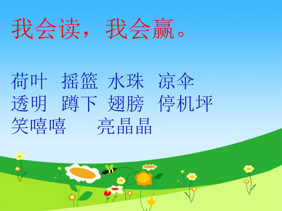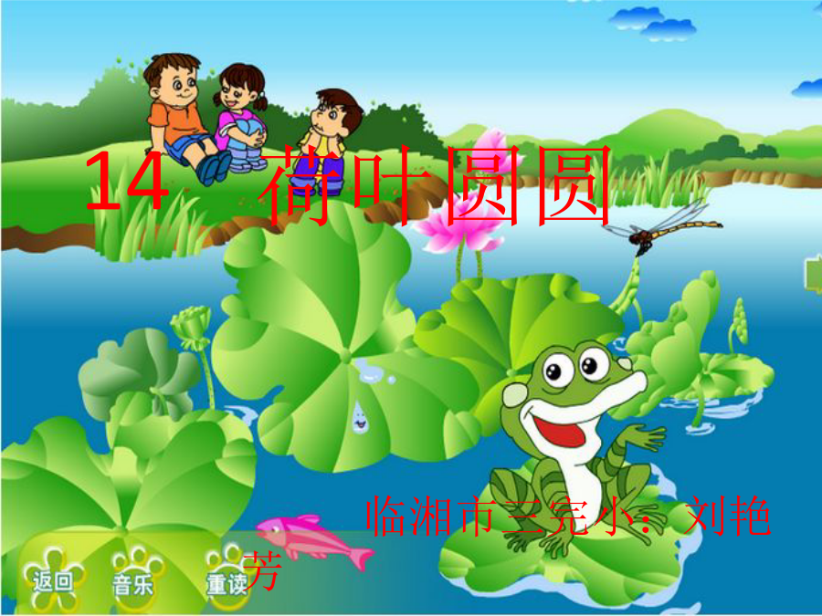 1你看到了什么? 2荷叶美在哪里? 小青蛙说:“荷叶是我的歌台。”小蜻蜓说:“荷叶是我的停机坪。”小鱼儿说:“荷叶是我的凉伞。”小鱼儿在荷叶下笑嘻嘻地游来游去,捧起一朵朵很美很美的水花。 情感训练我知道,我来填。荷叶是小朋友的。扩展训练
