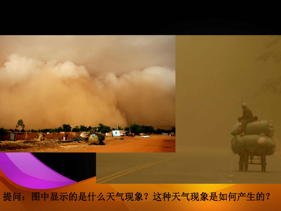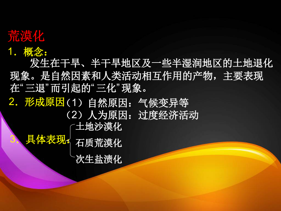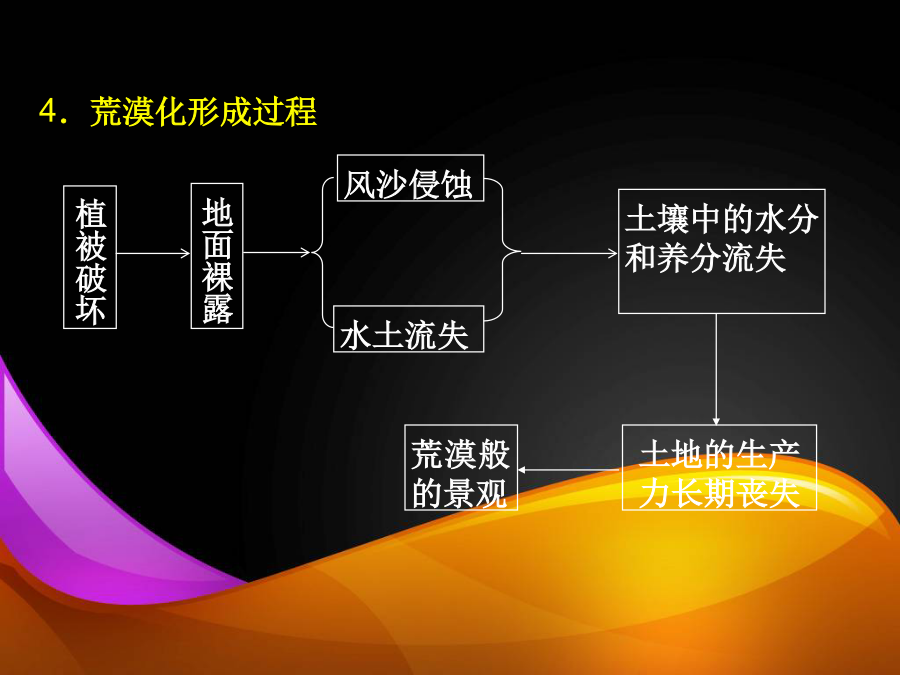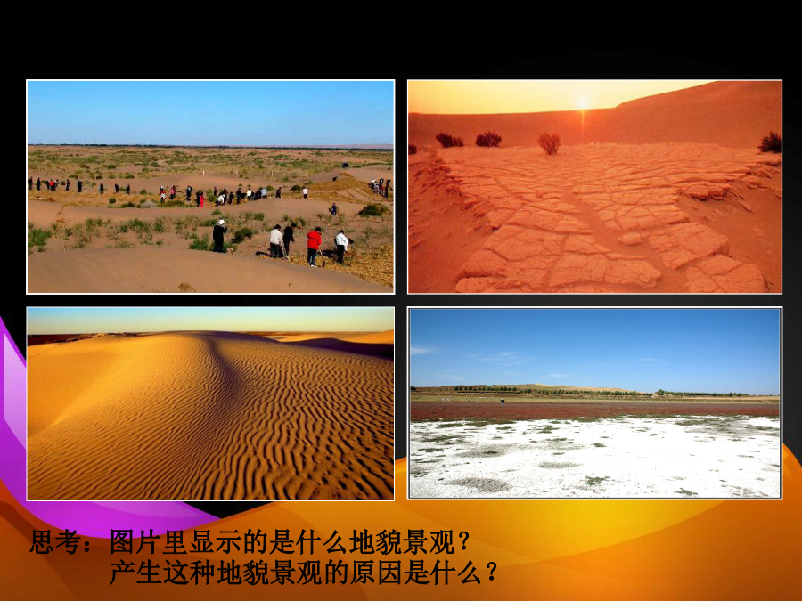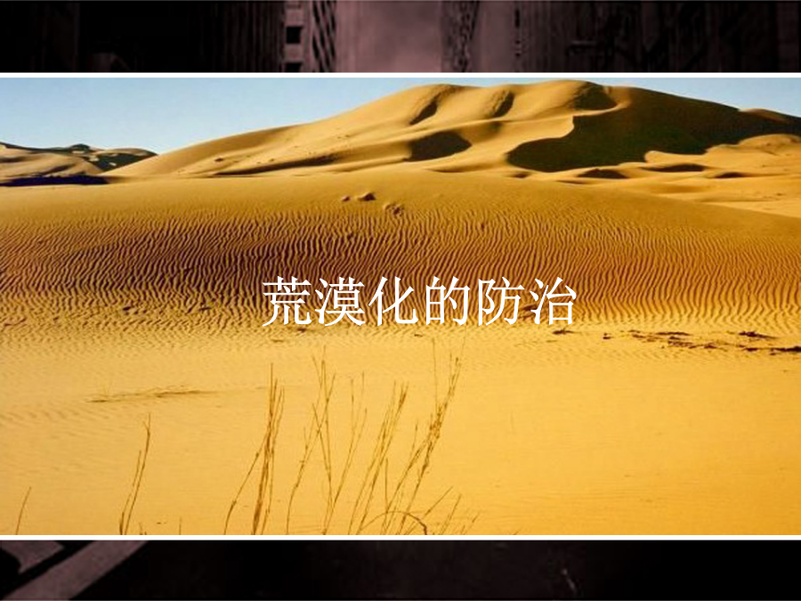 思考:图片里显示的是什么地貌景观? 产生这种地貌景观的原因是什么?提问:图中显示的是什么天气现象?这种天气现象是如何产生的?荒漠化植被破坏5.荒漠化地区的分布中国荒漠化分布干旱为主的自然特征2.西北地区的自然特征西北地区干旱成因:思考: 1.西北地区自东向西水分条件与植被景观的变化有什么关系?并分析原因。2.新疆的绿洲分布有什么特点?请联系水源和地形条件解释原因。3.西北地区荒漠化的自然因素——为荒漠化创造条件④气候异常可以使脆弱的生态环境失衡,是导致荒漠化进程的主要自然因素。讨论: 根据右图,分析说明荒漠化形成过程中各自然要素之间的相互作用。荒漠化形成的人为因素——加剧荒漠化进程2.西北地区荒漠化的人为因素的主要表现(1)过度樵采(2)过度放牧(3)过度开垦①能源缺乏地区把樵采天然植被作为解决燃料问题的主要手段(如鄂尔多斯沙区、内蒙古东部的库仑旗等地)②一些农牧民为了增加收入,无计划、无节制地在草原地区采挖药材、发菜等3.另一种荒漠化现象——次生盐渍化讨论:非洲萨赫勒地区荒漠化的自然、社会经济因素分析点拨:资料表明萨林勒地区正处于干旱与半干旱、热带沙漠与热带草原的过渡地带;津德尔是其中有代表性的居民点,其月均温都在22℃以上,甚至达到33℃,可想而知其蒸发量是巨大的。在降水方面,这里的年降水量不足500毫米,且基本集中在夏季,特别是7、8两个月。以其有限的而且特别集中的降水状况与其全年的高温、高蒸发量相比,确实是个容易产生环境问题的敏感地区。客观上,这里就潜在着荒漠化的自然因素,这是本地区的地理位置和当地的水热条件所决定的。2.气候的严酷性决定了萨赫勒地区的传统经济以自给性质的游牧业为主。20世纪以来,随着沿岸国家人口和经济的发展及本区交通条件的改善,这里的传统游牧经济向商品性的定居牧业经济转化。根据下图,分析这一社会经济因素的转变对牧场带来的环境影响。点拨:将传统的游牧经济和商业性的定居牧业进行对比,比较它们对草场的影响。从表中可知,传统的自给性的游牧经济,因其牲畜品种多样、经营规模小且分散、季节游牧,有利于牧草的恢复生长,是一种适应于当地自然条件的经济模式;而商业性的定居牧业从牲畜品种的单一性、大规模的集中经营、采取掘井定居的经营模式,势必增加草场的压力,结果必然导致草场的退化,甚至导致整个草场的毁灭。3.20世纪50年代以来,随着人口的急剧增加,对粮食需求迅速增加。这一因素促使萨赫勒以南的早作农业不断向北推进,农牧之争加剧。分析这一因素的加入,对本区草场生态环境及荒漠化的发展,又可能产生哪些影响?4.人口和贫困是萨赫勒地区最为突出的社会问题,也是造成这里生态环境恶化、上地荒漠化加剧的根源。请你解释下图,试提出一种解决非洲贫困问题的可能办法。不同历史时期的荒漠化不同历史时期的荒漠化思考:2.为什么我国北方的农牧过渡带,恰恰又是我国荒漠化最为严重的地区?荒漠化防治的对策和措施2.两条原则具体措施西b.利用生物措施和工程措施构建防护林c.调节农、林、牧用地之间的关系d.采取综合措施,多途径解决能源问题e.控制人口增长我国治理措施和经验讨论: 根据下面的图文资料,说明前苏联垦荒区土壤风蚀的潜在自然背景。并说明人们的生产活动怎样加剧了这个过程。2.20世纪60年代中期以来,前苏联在总结大规模垦荒经验教训的基础上,采取了一系列综合防护措施。仔细分析这些措施,你认为该地区防治荒漠化(土壤风蚀)的主要方向是什么?水土流失分析水土流失影响水土流失的因素中国水土流失的现状感知黄土高原感知黄土高原黄土高原是我国水土流失最严重的地区黄土高原水土流失严重的原因——黄土的特性1.读图,比较我国南方地区和北方地区降水季节分配的特点。 2.北方地区降水的季节特点对黄土高原的水土流失有什么影响?黄土高原水土流失严重的原因——植被稀少黄土高原水土流失严重的原因——植被稀少黄土高原水土流失严重的原因水土流失的危害——淤积江河湖库、加剧洪涝灾害水土流失的危害——淤积江河湖库,加剧洪涝灾水土流失的危害——侵蚀和淤积水土流失的危害水土流失的治理黄土高原水土流失的治理——生物措施(恢复植被)黄土高原水土流失的治理——工程措施(修建水平)梯田黄土高原水土流失的治理——工程措施(打坝淤地)黄土高原水土流失的治理——小流域综合治理黄土高原水土流失的治理1.西北干旱、半干旱地区由东向西的植被呈草原—荒漠草原—荒漠的变化主要是由() A.水分差异造成的 B.热量差异造成的 C.地形差异造成的 D.人类耕作方式不同造成的 2.关于西北干旱半干旱地区荒漠化的叙述,正确的是() A.常年受副热带高气压带控制是其主要原因 B.过度放牧、开垦、樵采是造成荒漠化的主要原因 C.实施跨流域调水是治理荒漠化的主要途径 D.建国以后,该地区的荒漠化得到了有效的控制 3.导致内蒙古高原草场载畜