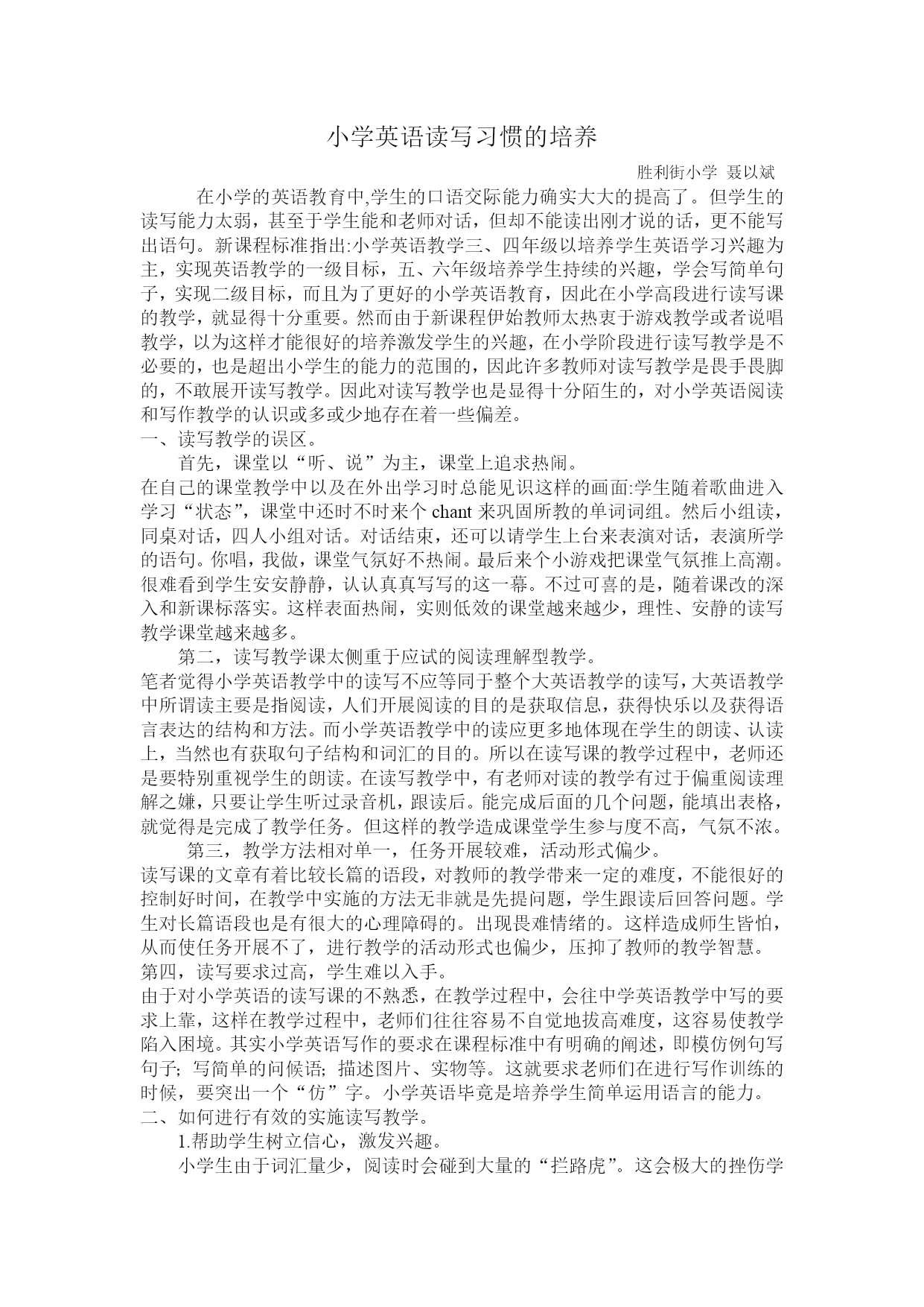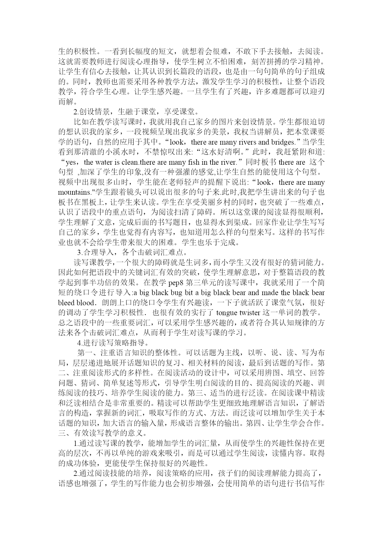 小学英语读写习惯的培养 胜利街小学聂以斌 在小学的英语教育中,学生的口语交际能力确实大大的提高了。但学生的读写能力太弱,甚至于学生能和老师对话,但却不能读出刚才说的话,更不能写出语句。新课程标准指出:小学英语教学三、四年级以培养学生英语学习兴趣为主,实现英语教学的一级目标,五、六年级培养学生持续的兴趣,学会写简单句子,实现二级目标,而且为了更好的小学英语教育,因此在小学高段进行读写课的教学,就显得十分重要。然而由于新课程伊始教师太热衷于游戏教学或者说唱教学,以为这样才能很好的培养激发学生的兴趣,在小学阶段进行读写教学是不必要的,也是超出小学生的能力的范围的,因此许多教师对读写教学是畏手畏脚的,不敢展开读写教学。因此对读写教学也是显得十分陌生的,对小学英语阅读和写作教学的认识或多或少地存在着一些偏差。 一、读写教学的误区。 首先,课堂以“听、说”为主,课堂上追求热闹。 在自己的课堂教学中以及在外出学习时总能见识这样的画面:学生随着歌曲进入学习“状态”,课堂中还时不时来个chant来巩固所教的单词词组。然后小组读,同桌对话,四人小组对话。对话结束,还可以请学生上台来表演对话,表演所学的语句。你唱,我做,课堂气氛好不热闹。最后来个小游戏把课堂气氛推上高潮。很难看到学生安安静静,认认真真写写的这一幕。不过可喜的是,随着课改的深入和新课标落实。这样表面热闹,实则低效的课堂越来越少,理性、安静的读写教学课堂越来越多。 第二,读写教学课太侧重于应试的阅读理解型教学。 笔者觉得小学英语教学中的读写不应等同于整个大英语教学的读写,大英语教学中所谓读主要是指阅读,人们开展阅读的目的是获取信息,获得快乐以及获得语言表达的结构和方法。而小学英语教学中的读应更多地体现在学生的朗读、认读上,当然也有获取句子结构和词汇的目的。所以在读写课的教学过程中,老师还是要特别重视学生的朗读。在读写教学中,有老师对读的教学有过于偏重阅读理解之嫌,只要让学生听过录音机,跟读后。能完成后面的几个问题,能填出表格,就觉得是完成了教学任务。但这样的教学造成课堂学生参与度不高,气氛不浓。 第三,教学方法相对单一,任务开展较难,活动形式偏少。 读写课的文章有着比较长篇的语段,对教师的教学带来一定的难度,不能很好的控制好时间,在教学中实施的方法无非就是先提问题,学生跟读后回答问题。学生对长篇语段也是有很大的心理障碍的。出现畏难情绪的。这样造成师生皆怕,从而使任务开展不了,进行教学的活动形式也偏少,压抑了教师的教学智慧。 第四,读写要求过高,学生难以入手。 由于对小学英语的读写课的不熟悉,在教学过程中,会往中学英语教学中写的要求上靠,这样在教学过程中,老师们往往容易不自觉地拔高难度,这容易使教学陷入困境。其实小学英语写作的要求在课程标准中有明确的阐述,即模仿例句写句子;写简单的问候语;描述图片、实物等。这就要求老师们在进行写作训练的时候,要突出一个“仿”字。小学英语毕竟是培养学生简单运用语言的能力。 二、如何进行有效的实施读写教学。 1.帮助学生树立信心,激发兴趣。 小学生由于词汇量少,阅读时会碰到大量的“拦路虎”。这会极大的挫伤学生的积极性。一看到长幅度的短文,就想着会很难,不敢下手去接触,去阅读。这就需要教师进行阅读心理指导,使学生树立不怕困难,刻苦拼搏的学习精神。让学生有信心去接触,让其认识到长篇段的语段,也是由一句句简单的句子组成的。同时,教师也需要采用各种教学方法,激发学生学习的积极性,让整个语段教学,符合学生心理。让学生感兴趣。一旦学生有了兴趣,许多难题都可以迎刃而解。 2.创设情景,生融于课堂,享受课堂。 比如在教学读写课时,我就用我自己家乡的图片来创设情景。学生都很迫切的想认识我的家乡,一段视频呈现出我家乡的美景,我权当讲解员,把本堂课要学的语句,自然的应用于其中。“look,therearemanyriversandbridges.”当学生看到那清澈的小溪水时,不禁惊叹出来:“这水好清啊。”此时,我赶紧附和道:“yes,thewaterisclean.therearemanyfishintheriver.”同时板书thereare这个句型,加深了学生的印象,没有一种强灌的感觉,让学生自然的能使用这个句型。视频中出现很多山时,学生能在老师轻声的提醒下说出:“look,therearemanymountains."学生跟着镜头可以说出很多的句子来.此时,我把学生讲出来的句子也板书在黑板上,让学生来认读。学生在享受美丽乡村的同时,也突破了一些难点,认识了语段中的重点语句,为阅读扫清了障碍。所以这堂课的阅读显得很顺利,学生理解了文意,完成后面的书写题目,也显得水到渠成。回家作业让学生写写自己的家乡,学生也觉得有内容写,也知道用怎么样的句型来写。这样的书写作业也就不会给学生带