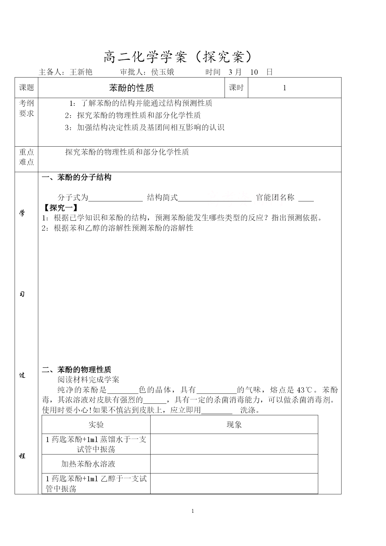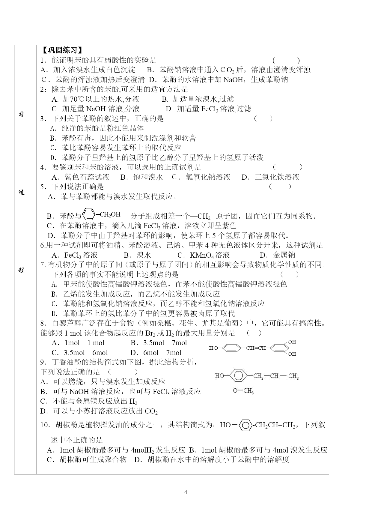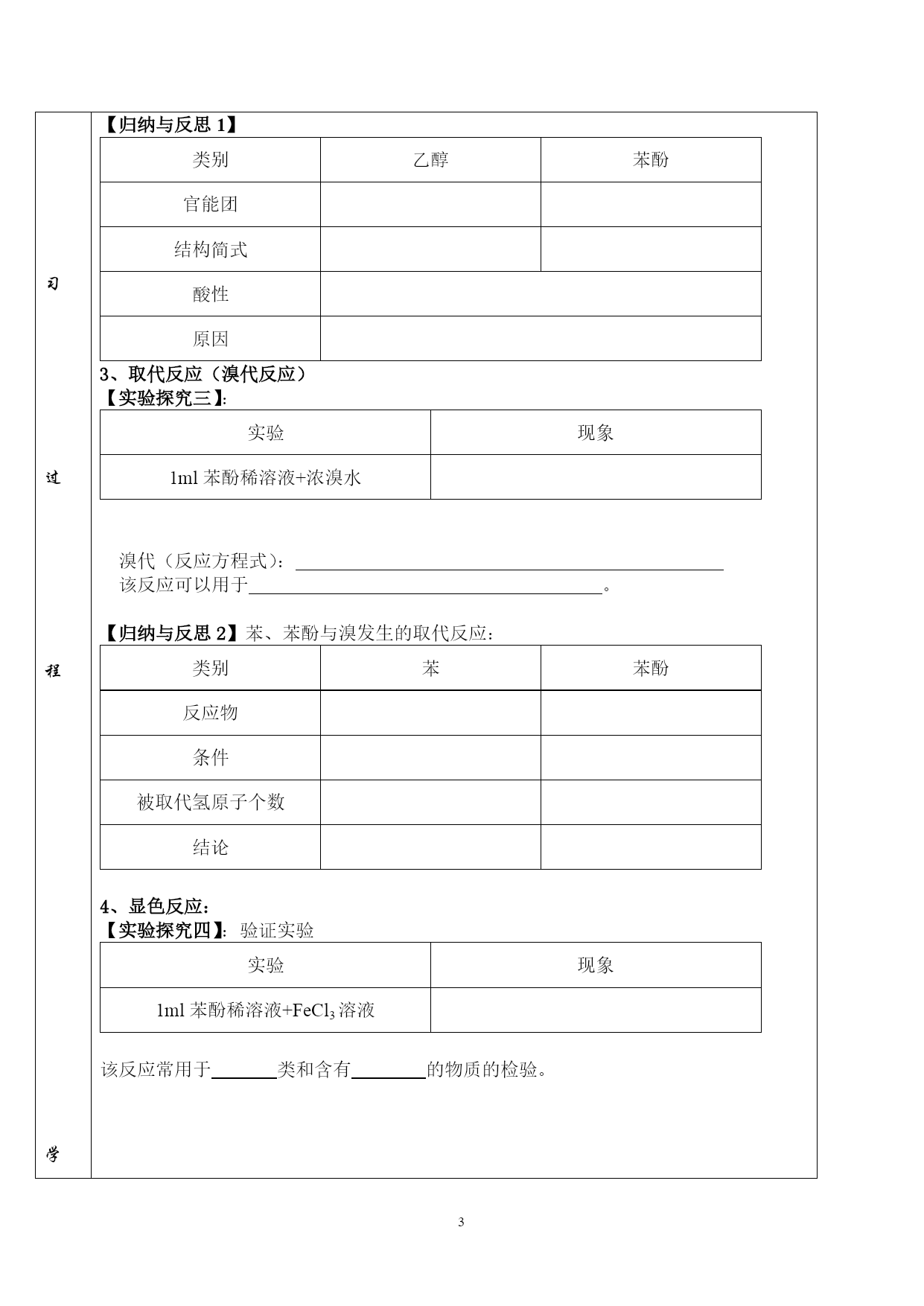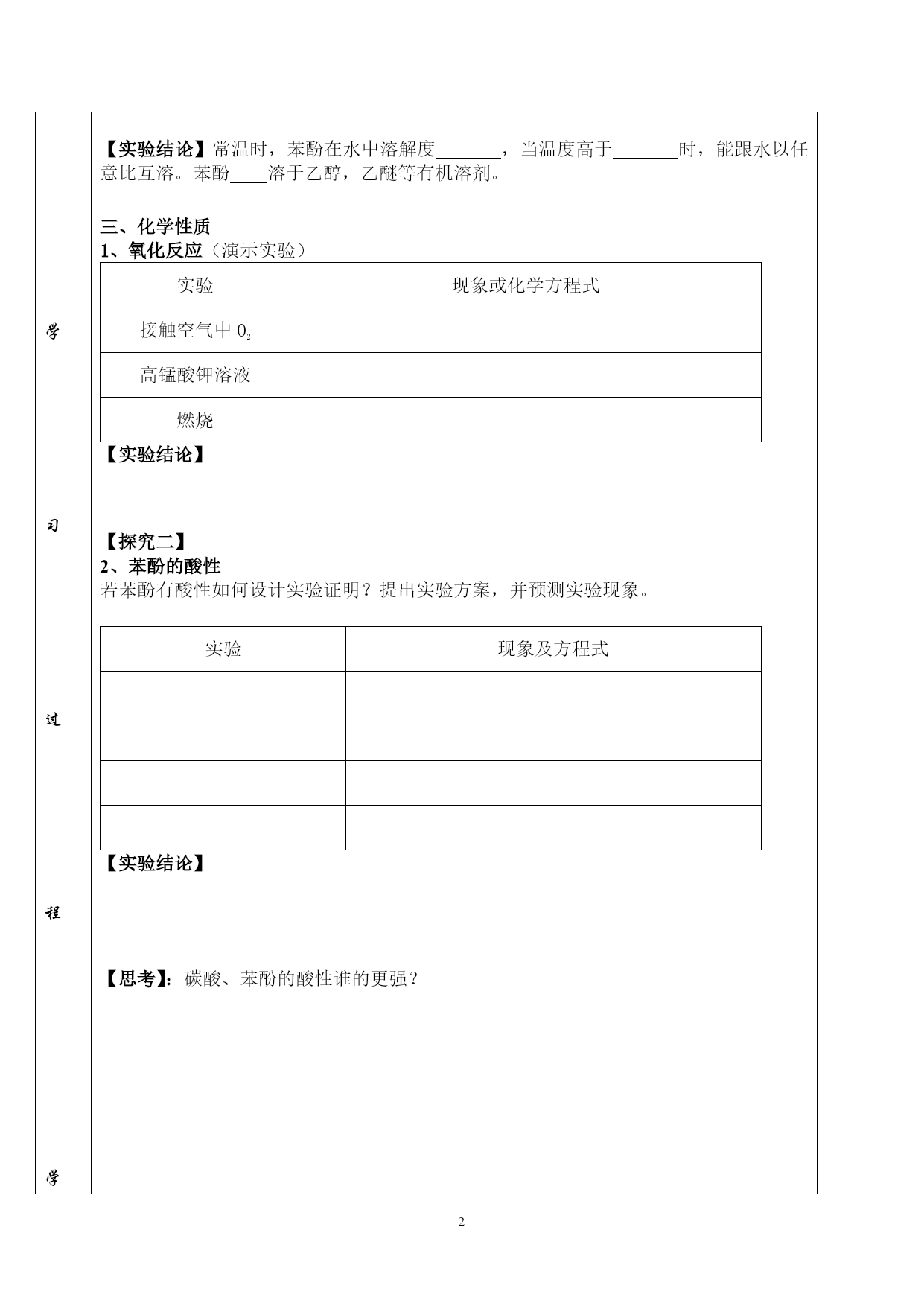 高二化学学案(探究案) 主备人:王新艳审批人:侯玉娥时间3月10日 课题苯酚的性质课时1考纲要求1:了解苯酚的结构并能通过结构预测性质 2:探究苯酚的物理性质和部分化学性质 3:加强结构决定性质及基团间相互影响的认识 重点难点探究苯酚的物理性质和部分化学性质 学 习 过 程 学 习 过 程 学 习 过 程 学 习 过 程 一、苯酚的分子结构 分子式为结构简式官能团名称 【探究一】 1:根据已学知识和苯酚的结构,预测苯酚能发生哪些类型的反应?指出预测依据。 2:根据苯和乙醇的溶解性预测苯酚的溶解性 二、苯酚的物理性质 阅读材料完成学案 纯净的苯酚是色的晶体,具有的气味,熔点是43℃。苯酚毒,其浓溶液对皮肤有强烈的,具有一定的杀菌消毒能力,可以做杀菌消毒剂。使用时要小心!如果不慎沾到皮肤上,应立即用洗涤。 实验现象1药匙苯酚+1ml蒸馏水于一支试管中振荡加热苯酚水溶液1药匙苯酚+1ml乙醇于一支试管中振荡 【实验结论】常温时,苯酚在水中溶解度,当温度高于时,能跟水以任意比互溶。苯酚溶于乙醇,乙醚等有机溶剂。 三、化学性质 1、氧化反应(演示实验) 实验现象或化学方程式接触空气中O2高锰酸钾溶液燃烧【实验结论】 【探究二】 2、苯酚的酸性 若苯酚有酸性如何设计实验证明?提出实验方案,并预测实验现象。 实验现象及方程式【实验结论】 【思考】:碳酸、苯酚的酸性谁的更强? 【归纳与反思1】 类别乙醇苯酚官能团结构简式酸性原因3、取代反应(溴代反应) 【实验探究三】: 实验现象1ml苯酚稀溶液+浓溴水 溴代(反应方程式): 该反应可以用于。 【归纳与反思2】苯、苯酚与溴发生的取代反应: 类别苯苯酚反应物条件被取代氢原子个数结论 4、显色反应: 【实验探究四】:验证实验 实验现象1ml苯酚稀溶液+FeCl3溶液 该反应常用于类和含有的物质的检验。 【巩固练习】 1.能证明苯酚具有弱酸性的实验是() A.加入浓溴水生成白色沉淀B.苯酚钠溶液中通入CO2后,溶液由澄清变浑浊 C.苯酚的浑浊液加热后变澄清D.苯酚的水溶液中加NaOH,生成苯酚钠 2:除去苯中所含的苯酚,可采用的适宜方法是 A.加70℃以上的热水,分液B.加适量浓溴水,过滤 C.加足量NaOH溶液,分液D.加适量FeCl3溶液,过滤 3.下列关于苯酚的叙述中,正确的是() A.纯净的苯酚是粉红色晶体 B.苯酚有毒,因此不能用来制洗涤剂和软膏 C.苯比苯酚容易发生苯环上的取代反应 D.苯酚分子里羟基上的氢原子比乙醇分子呈羟基上的氢原子活泼 4.要鉴别苯和苯酚溶液,可以选用的正确试剂是() A.紫色石蕊试液B.饱和溴水C.氢氧化钠溶液D.三氯化铁溶液 5.下列说法正确是() A.苯与苯酚都能与溴水发生取代反应。 CH2OH B.苯酚与 分子组成相差一个—CH2—原子团,因而它们互为同系物。 C.在苯酚溶液中,滴入几滴FeCl3溶液,溶液立即呈紫色。 D.苯酚分子中由于羟基对苯环的影响,使苯环上5个氢原子都容易取代。 6.用一种试剂即可将酒精、苯酚溶液、己烯、甲苯4种无色液体区分开来,这种试剂是 A.FeCl3溶液B.溴水C.KMnO4溶液D.金属钠 7.有机物分子中的原子间(或原子与原子团间)的相互影响会导致物质化学性质的不同。下列各项的事实不能说明上述观点的是() A.甲苯能使酸性高锰酸钾溶液褪色,而苯不能使酸性高锰酸钾溶液褪色 B.乙烯能发生加成反应,而乙烷不能发生加成反应 C.苯酚能和氢氧化钠溶液反应,而乙醇不能和氢氧化钠溶液反应 D.苯酚苯环上的氢比苯分子中的氢更容易被卤原子取代 8.白藜芦醇广泛存在于食物(例如桑椹、花生、尤其是葡萄)中,它可能具有搞癌性。能够跟1mol该化合物起反应的Br2或H2的最大用量分别是() A.1mol1molB.3.5mol7mol C.3.5mol6molD.6mol7mol 9.丁香油酚的结构简式如下图,据此结构分析, 下列说法正确的是() A.可以燃烧,只与溴水发生加成反应 B.可与NaOH溶液反应,也可与FeCl3溶液反应 C.不能与金属镁反应放出H2 D.可以与小苏打溶液反应放出CO2 10.胡椒酚是植物挥发油的成分之一,其结构简式为:HO-AUTOTEXT苯环\*MERGEFORMAT-CH2CH=CH2,下列叙述中不正确的是 A.1mol胡椒酚最多可与4molH2发生反应B.1mol胡椒酚最多可与4mol溴发生反应 C.胡椒酚可生成聚合物D.胡椒酚在水中的溶解度小于苯酚中的溶解度