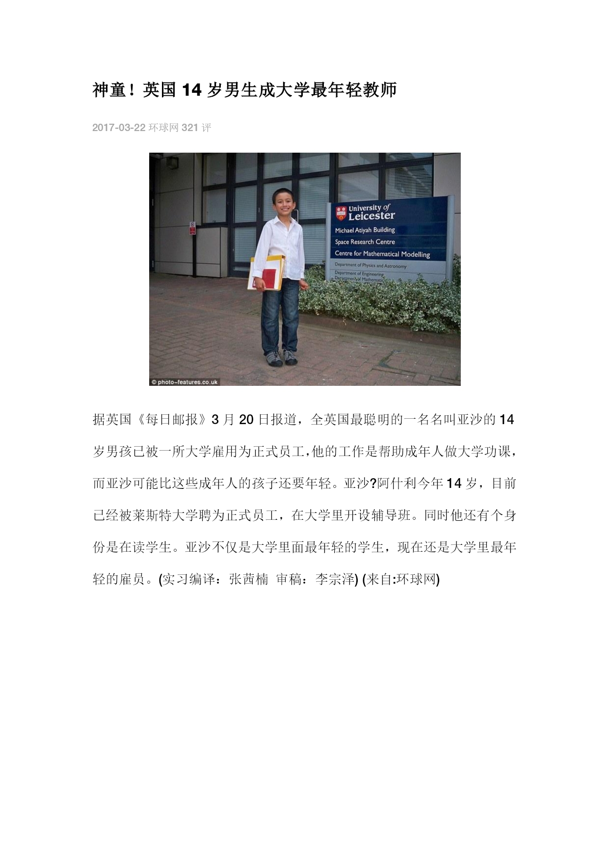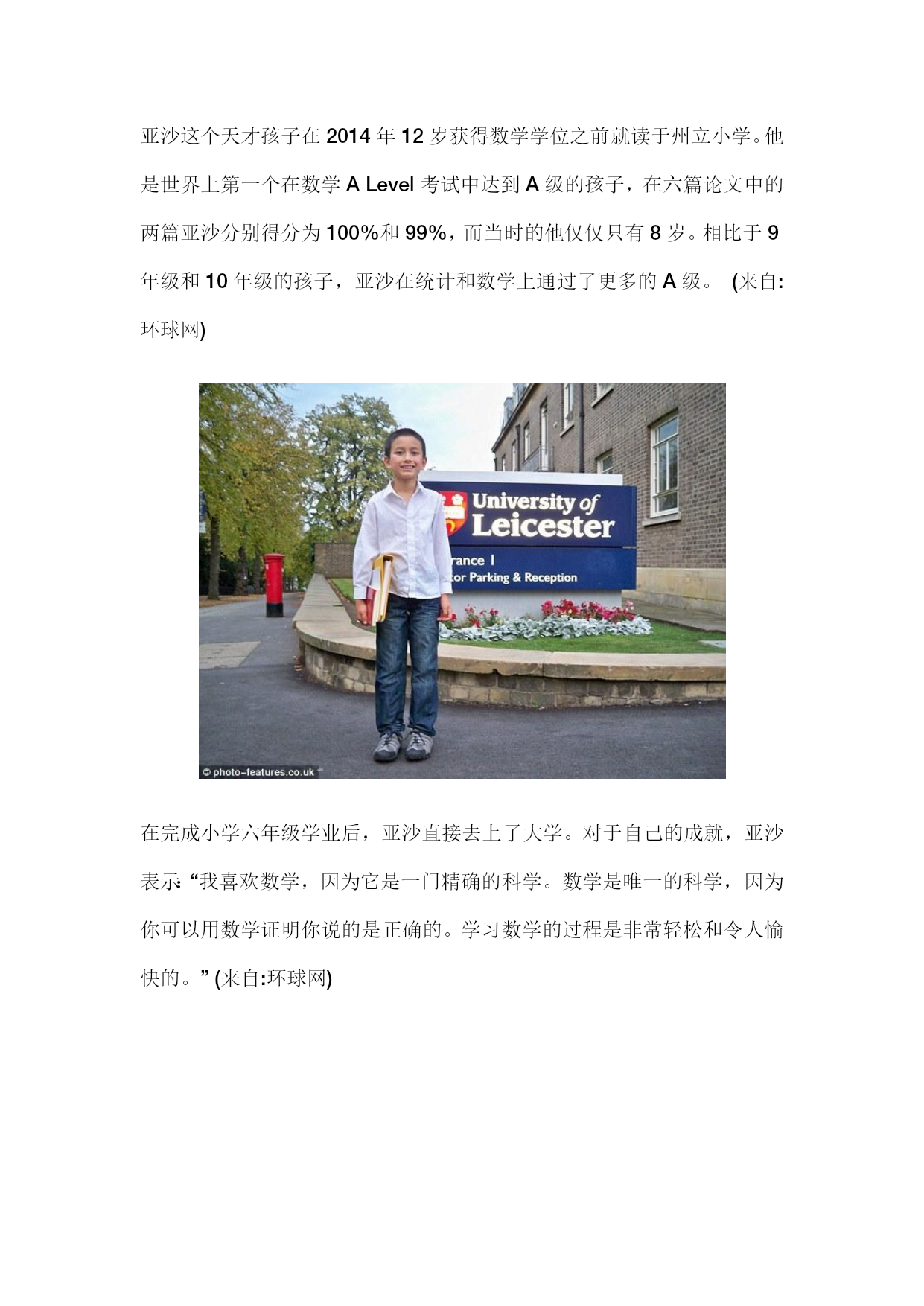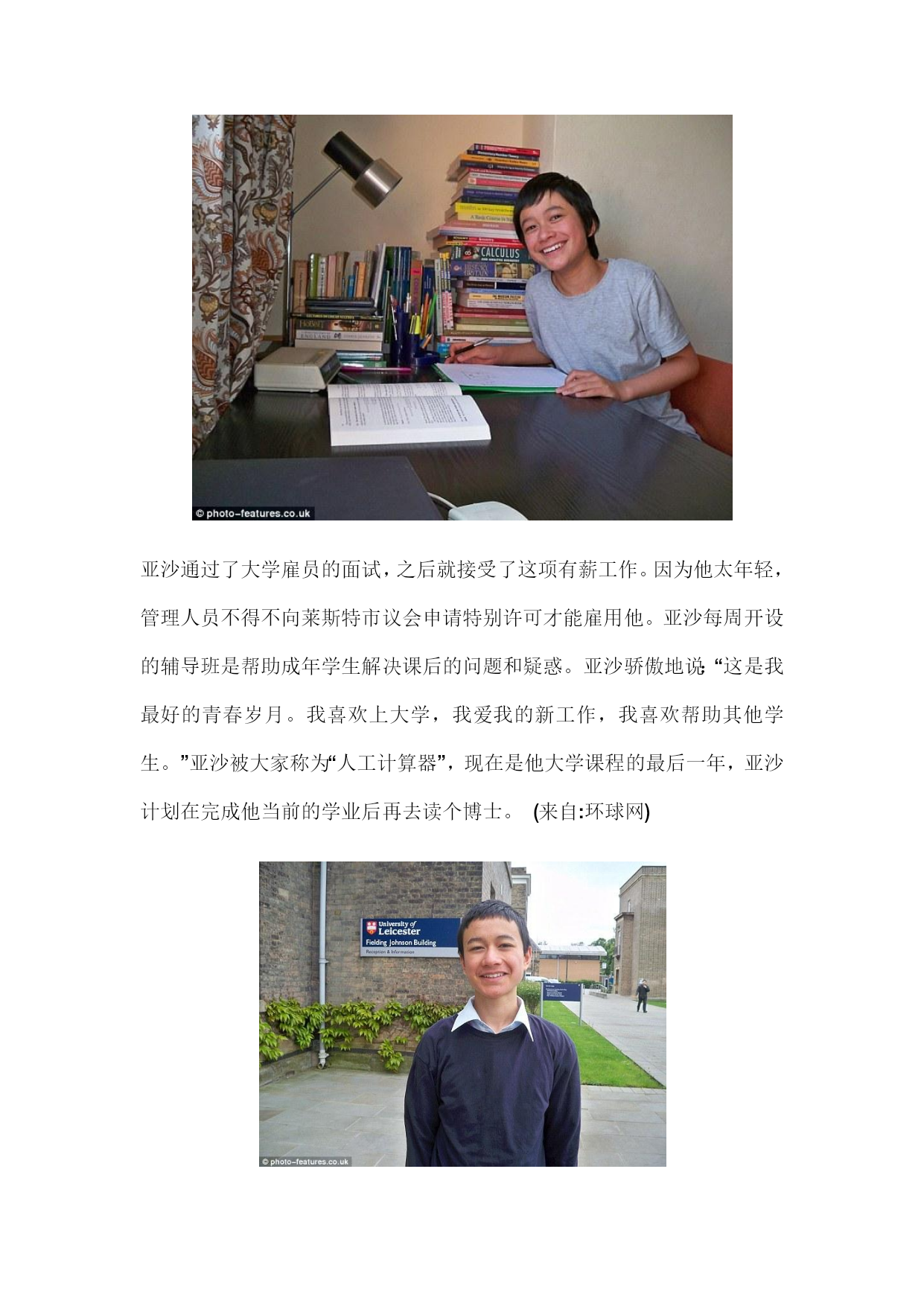 神童!英国14岁男生成大学最年轻教师 2017-03-22环球网321评 据英国《每日邮报》3月20日报道,全英国最聪明的一名名叫亚沙的14岁男孩已被一所大学雇用为正式员工,他的工作是帮助成年人做大学功课,而亚沙可能比这些成年人的孩子还要年轻。亚沙?阿什利今年14岁,目前已经被莱斯特大学聘为正式员工,在大学里开设辅导班。同时他还有个身份是在读学生。亚沙不仅是大学里面最年轻的学生,现在还是大学里最年轻的雇员。(实习编译:张茜楠审稿:李宗泽)(来自:环球网) 亚沙通过了大学雇员的面试,之后就接受了这项有薪工作。因为他太年轻,管理人员不得不向莱斯特市议会申请特别许可才能雇用他。亚沙每周开设的辅导班是帮助成年学生解决课后的问题和疑惑。亚沙骄傲地说:“这是我最好的青春岁月。我喜欢上大学,我爱我的新工作,我喜欢帮助其他学生。”亚沙被大家称为“人工计算器”,现在是他大学课程的最后一年,亚沙计划在完成他当前的学业后再去读个博士。(来自:环球网) 亚沙这个天才孩子在2014年12岁获得数学学位之前就读于州立小学。他是世界上第一个在数学ALevel考试中达到A级的孩子,在六篇论文中的两篇亚沙分别得分为100%和99%,而当时的他仅仅只有8岁。相比于9年级和10年级的孩子,亚沙在统计和数学上通过了更多的A级。(来自:环球网) 在完成小学六年级学业后,亚沙直接去上了大学。对于自己的成就,亚沙表示:“我喜欢数学,因为它是一门精确的科学。数学是唯一的科学,因为你可以用数学证明你说的是正确的。学习数学的过程是非常轻松和令人愉快的。”(来自:环球网)