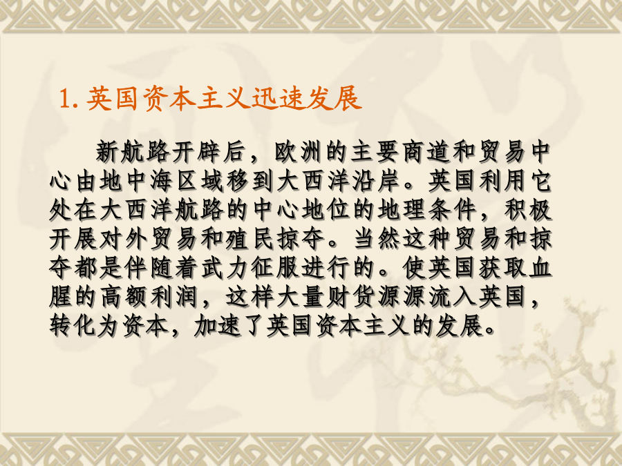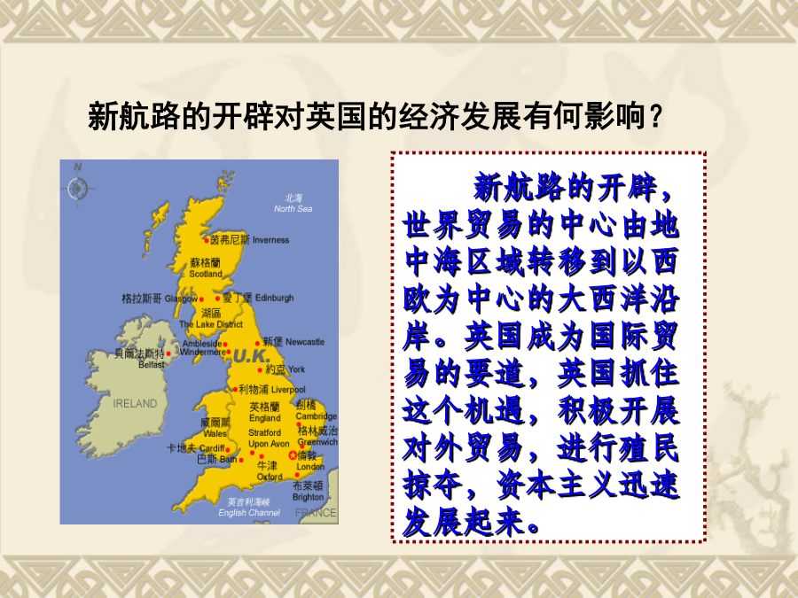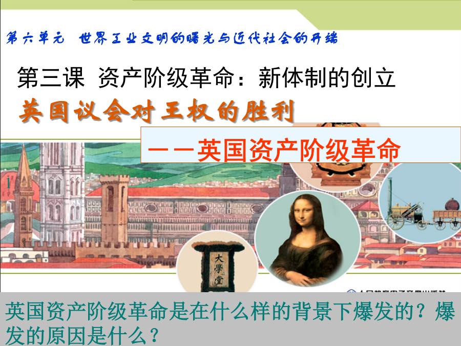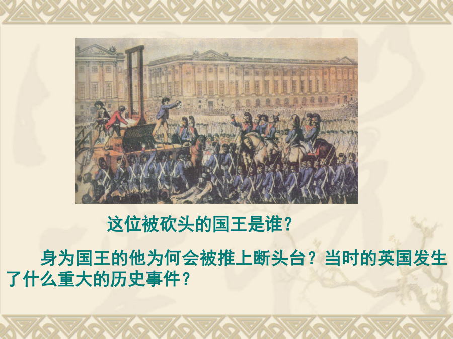 这位被砍头的国王是谁?1新航路开辟航线图新航路的开辟对英国的经济发展有何影响?新航路开辟后,欧洲的主要商道和贸易中心由地中海区域移到大西洋沿岸。英国利用它处在大西洋航路的中心地位的地理条件,积极开展对外贸易和殖民掠夺。当然这种贸易和掠夺都是伴随着武力征服进行的。使英国获取血腥的高额利润,这样大量财货源源流入英国,转化为资本,加速了英国资本主义的发展。1603年,苏格兰国王詹姆士·斯图亚特继承英国王位,称詹姆士一世,开始了斯图亚特王朝在英国的统治。(这个王朝的国王家族姓斯图亚特)。詹姆士一世为了维护封建专制统治,竭力鼓吹“君权神授”。詹姆士一世认为王权不受人间世俗法律的限制,国王有无限的权力。所以他极力反对议会对王权的任何限制。根据英国议会传统,法律的制定和废除以及征税都必须得到议会同意。而詹姆士要实行独裁统治,不允许议会参政议政,严重损害了资产阶级和新贵族利益,引起了他们的强烈不满。詹姆士一世死后,儿子查理一世继位,仍然独断专行。无视英国议会的传统,寻找种种借口,巧立名目,任意征税。议会反对,他竟蛮横地解散了议会,结果从1629年至1640年11年间,形成无议会统治的局面,并大量出售专卖权,把肥皂、盐、酒、煤、铁、麻布甚至针和钮扣等许多生活必需品都列入专卖范围。把专卖权出售给他的亲信和大商人,一般工商业主因为没有获得专卖权而被逼迫停业,造成生产混乱,工商业萧条,许多工人失业,严重阻碍了资本主义的发展,既损害了资产阶级的利益,又引起广大城乡人民的不满。一、英国资产阶级革命爆发的原因1.英国议会成立于什么时候? 2.成立议会的目的是什么? 3.议会的组成人员有哪些? 4.议会有哪些权利?在这次议会上,议员们如何反对查理一世的专制统治的?他们胜利了还是失败了?为什么? 查理一世甘心自己失败吗?他是怎么做的?和他的王党军作战的是什么军队?谁领导的?这些军队战斗力如何?为什么?资产阶级议会 ↓↓激化内战 封建专制统治王权二、英国资产阶级革命的过程历史的真相二、英国资产阶级革命的过程1.驱散掘地派; 2.远征爱尔兰; 3.驱散议会,旧任“护国主”。1、克伦威尔率领的议会军取得胜利的原因是什么? 二、英国资产阶级革命的过程革命的曲折和反复 ——斯图亚特王朝的复辟模拟国会:二、英国资产阶级革命的过程“光荣革命”和君主立宪制的确立权利法案1.《权利法案》颁布前后英国政体有何变化? 2.他们推举新国王与中国封建社会皇帝的产生有哪些不同?“光荣革命”留下了一条长长的封建主义尾巴,被后人讥笑为即不“光荣”又不“革命”,英国至今仍实行君主立宪制。 三、英国资产阶级革命的历史意义英国的资产阶级革命给我们哪些启示?时间1.英国资产阶级革命开始于()A.1640年B.1646年C.1660年D.1689年 2.英国《权利法案》的实质是()A.保障了资产阶级独掌共和国大权B.使议会获得了自由选举国王的权利C.废除了英国的君主制度D.为限制王权提供了宪法保障 3.17世纪英国资产阶级革命是英国历史的分水岭, 主要是因为它()A.改变了社会性质B.确立了君主立宪制度C.处死了封建君主D.创立了议会民主制阅读材料:①未经议会同意,国王无权废除法律或停止法律的执 行。②不经议会同意,国王不能征税。③不经议会同意,国王不能在和平时期维持常备军。④议会必须定期召开。⑤议员的选举不受国王干涉。 请回答:⑴以上条款出自什么文献?⑵颁布该文献的时间和机构是什么?⑶该文献颁布的意义是什么?