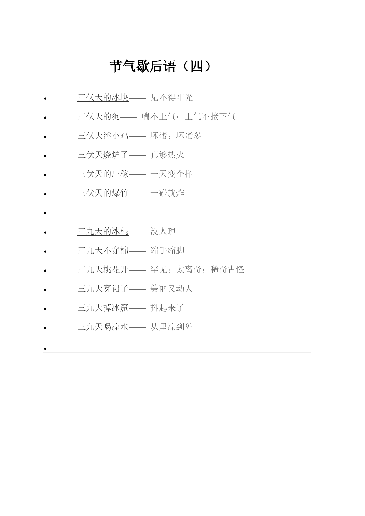节气歇后语(四) HYPERLINK"http://www.so.com/link?url=http://www.hengexing.com/xiehouyu/30578.html&q=%E6%AD%87%E5%90%8E%E8%AF%AD&ts=1500001249&t=658aa27972dba85a98a566697b7fd9f"\t"https://www.so.com/_blank"三伏天的冰块——见不得阳光 HYPERLINK"http://www.so.com/link?url=http://www.hengexing.com/xiehouyu/30579.html&q=%E6%AD%87%E5%90%8E%E8%AF%AD&ts=1500001249&t=5b997e8605f16c62731685a44626245"\t"https://www.so.com/_blank"三伏天的狗——喘不上气;上气不接下气 HYPERLINK"http://www.so.com/link?url=http://www.hengexing.com/xiehouyu/30580.html&q=%E6%AD%87%E5%90%8E%E8%AF%AD&ts=1500001249&t=4e4831aaf22a6f18c19f2b25055960e"\t"https://www.so.com/_blank"三伏天孵小鸡——坏蛋;坏蛋多 HYPERLINK"http://www.so.com/link?url=http://www.hengexing.com/xiehouyu/30581.html&q=%E6%AD%87%E5%90%8E%E8%AF%AD&ts=1500001249&t=f5778be7376e24915d8c9027ffe78b5"\t"https://www.so.com/_blank"三伏天烧炉子——真够热火 HYPERLINK"http://www.so.com/link?url=http://www.hengexing.com/xiehouyu/30582.html&q=%E6%AD%87%E5%90%8E%E8%AF%AD&ts=1500001249&t=9f095c0ad79062f2e83eb4f86bd76cf"\t"https://www.so.com/_blank"三伏天的庄稼——一天变个样 HYPERLINK"http://www.so.com/link?url=http://www.hengexing.com/xiehouyu/30583.html&q=%E6%AD%87%E5%90%8E%E8%AF%AD&ts=1500001249&t=9c3960a6b2c7af2b03633d7078d188e"\t"https://www.so.com/_blank"三伏天的爆竹——一碰就炸 HYPERLINK"http://www.so.com/link?url=http://www.hengexing.com/xiehouyu/30586.html&q=%E6%AD%87%E5%90%8E%E8%AF%AD&ts=1500001261&t=9c32b851adba1e8ab3c98b162ffd17c"\t"https://www.so.com/_blank"三九天的冰棍——没人理 HYPERLINK"http://www.so.com/link?url=http://www.hengexing.com/xiehouyu/30587.html&q=%E6%AD%87%E5%90%8E%E8%AF%AD&ts=1500001261&t=5cd6c1441bf1769b1f09c1d0412c8a3"\t"https://www.so.com/_blank"三九天不穿棉——缩手缩脚 HYPERLINK"http://www.so.com/link?url=http://www.hengexing.com/xiehouyu/30588.html&q=%E6%AD%87%E5%90%8E%E8%AF%AD&ts=1500001261&t=bfd13862e4932acc15befe6ab3834c0"\t"https://www.so.com/_blank"三九天桃花开——罕见;太离奇;稀奇古怪 HYPERLINK"http://www.so.com/link?url=http://www.hengexing.com/xiehouyu/30589.html&q=%E6%AD%87%E5%90%8E%E8%AF%AD&ts=1500001261&t=