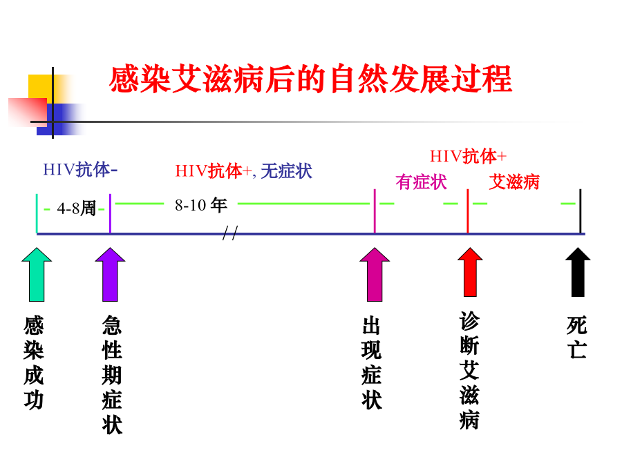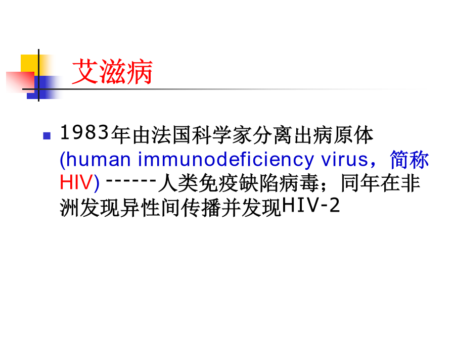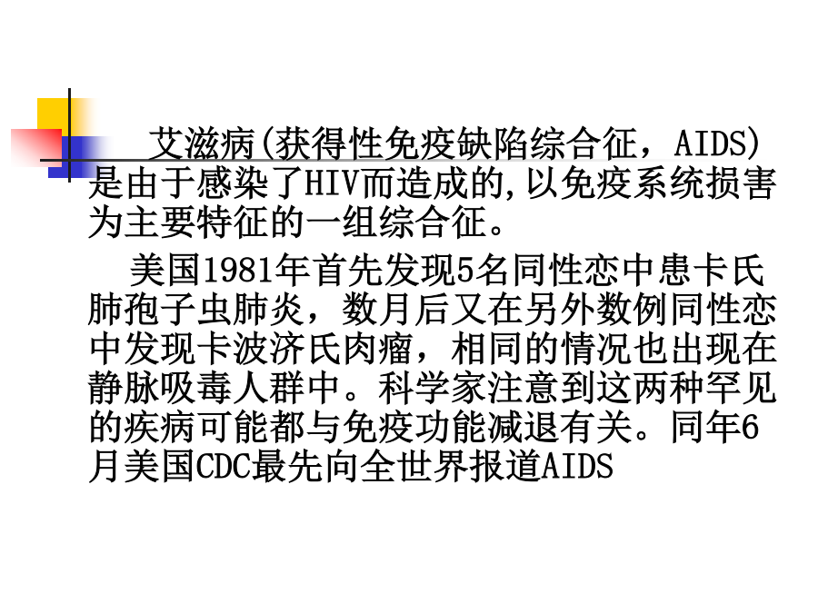 艾滋病艾滋病(获得性免疫缺陷综合征,AIDS)是由于感染了HIV而造成的,以免疫系统损害为主要特征的一组综合征。 美国1981年首先发现5名同性恋中患卡氏肺孢子虫肺炎,数月后又在另外数例同性恋中发现卡波济氏肉瘤,相同的情况也出现在静脉吸毒人群中。科学家注意到这两种罕见的疾病可能都与免疫功能减退有关。同年6月美国CDC最先向全世界报道AIDS 艾滋病感染成功认识艾滋病艾滋病的传播途径艾滋病的传播途径艾滋病的传播途径HIV传播效率不会传染艾滋病病毒的途径艾滋病是特殊的慢性传染病、特殊的行为性疾病 第一个时期(1985—1988)为散发期:全国只报告19例HIV感染者,多为散发,分布于沿海各大城市,多为外籍公民或海外华人,只在浙江有4例血友病病人因应用污染的进口第Ⅷ因子而被感染。 “国外的问题”。“这种病不会在中国发展,因为同性恋和性乱在中国受到限制” 对策:禁止从国外进口血液制品,禁止国外艾滋病病毒感染者在中国居住第二个时期(1989—1994)为局部流行期:1989年10月在云南西南边境瑞丽吸毒人群中发现146例HIV感染者,系从境外传入,此后在德宏州的几个市县局部流行。其它省份吸毒人群中仅偶有HIV感染者发现。全国各地在性病患者、暗娼、归国人员中以性接触传播HIV感染的例数逐年增加。我国艾滋病主要呈现四个特点 17我国应采取的艾滋病预防控制措施 加强组织领导,多部门合作,积极履行承诺温家宝总理看望医务人员和病人加强监测,预防二代传播127个艾滋病综合防治示范区传染病控制的关键-三早隐藏的传染源发现报告艾滋病感染者/病人数为何发现的感染人数越来越多?全面开展综合预防干预措施以宽容策略对高危人群行为干预,改变危险行为 在暗娼人群中,在积极开展打击卖淫嫖娼行为的同时,在娱乐场所推广使用安全套工作,努力提高暗娼和嫖客的的安全套使用率,促进性病感染者及时就医,并开展同伴教育活动。 在吸毒人群中一方面禁止贩毒吸毒行为,同进开展针具交换、美沙酮维持治疗和同伴教育活动,控制HIV在吸毒人群中的蔓延及从吸毒人群向一般人群的传播。吸毒者针具交换暗娼商业性性行为安全套使用率加强男男性接触人群的预防干预 按男性成人人口比例(城市1.4-2.8%,农村0.2-0.4%) 将成为今后性传播的重要人群“四免一关怀”政策艾滋病毒感染者终生服用抗病毒药物