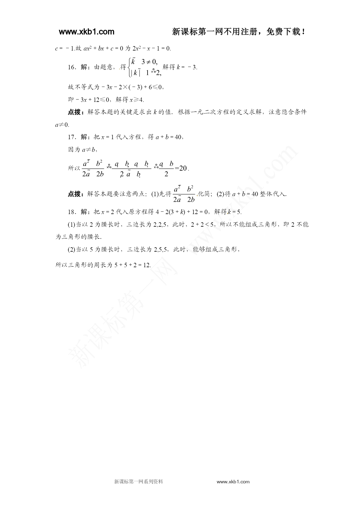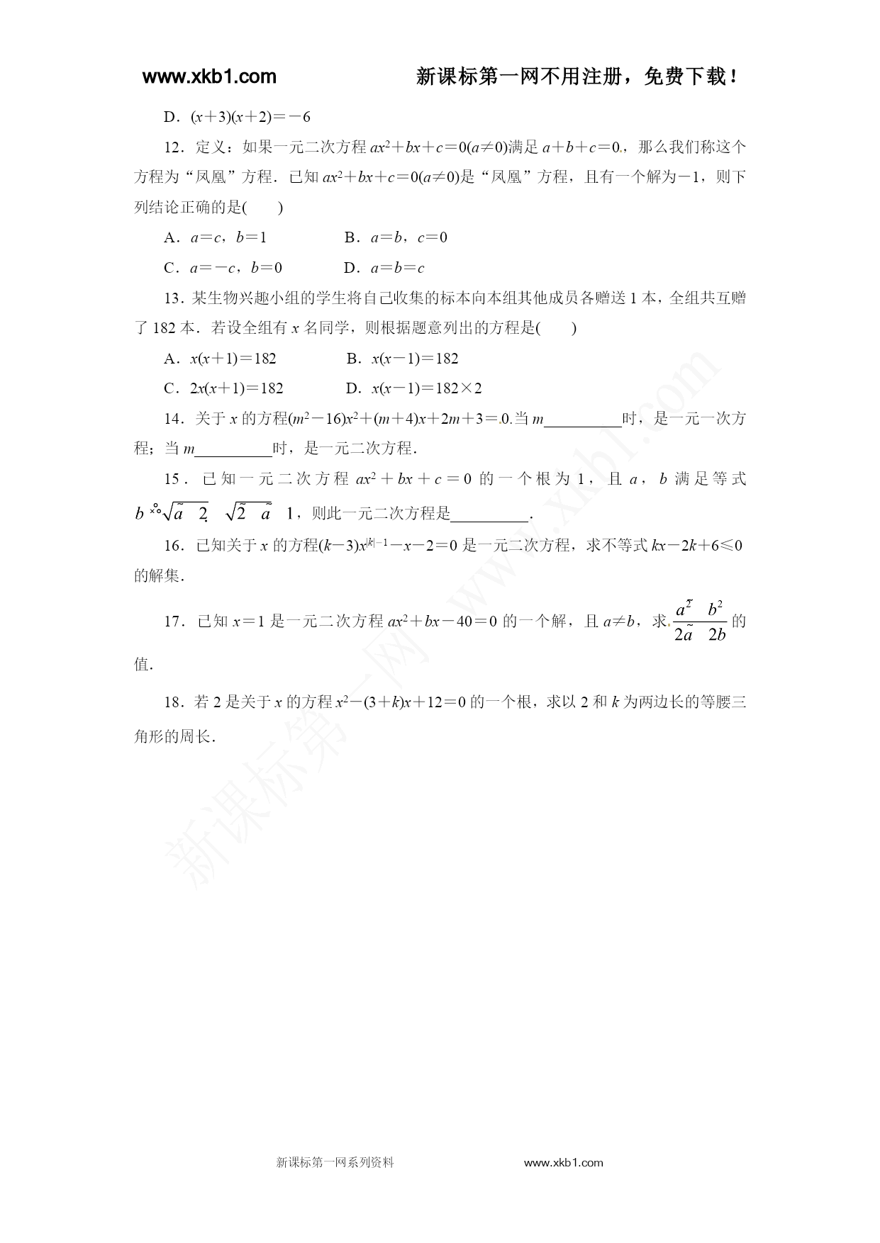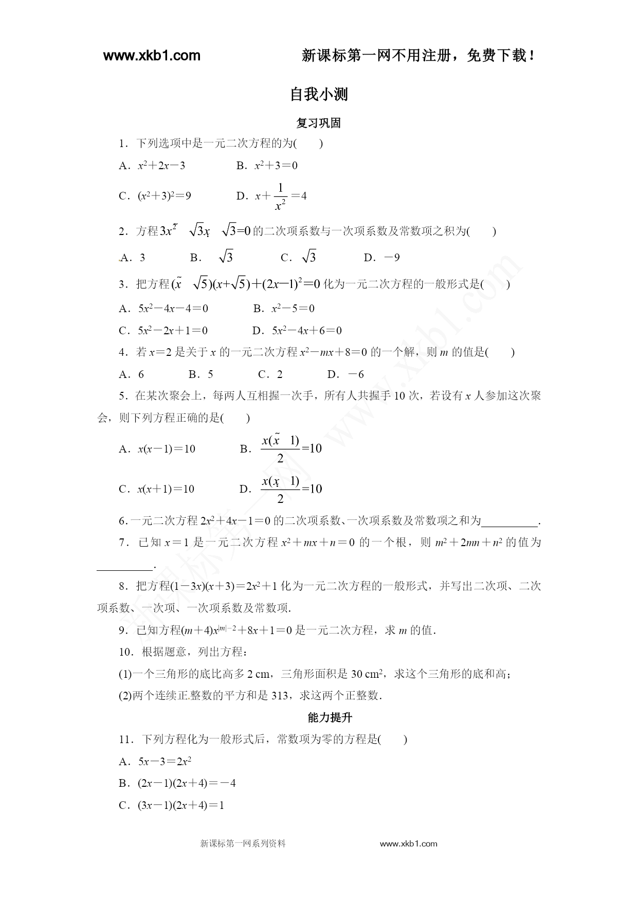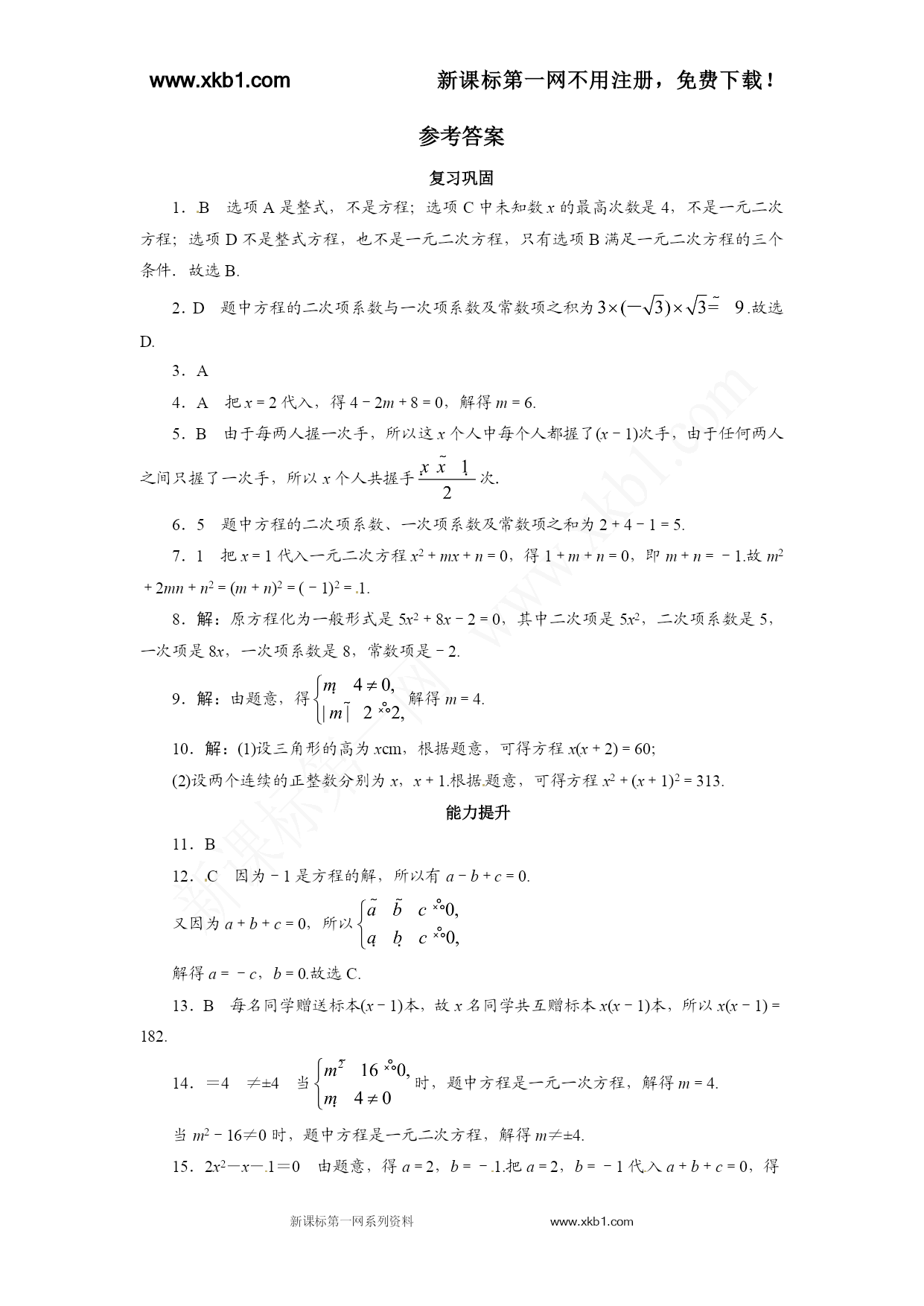 www.xkb1.com新课标第一网不用注册,免费下载! 新课标第一网系列资料www.xkb1.com 自我小测 复习巩固 1.下列选项中是一元二次方程的为() A.x2+2x-3B.x2+3=0 C.(x2+3)2=9D.x+=4 2.方程的二次项系数与一次项系数及常数项之积为() A.3B.C.D.-9 3.把方程化为一元二次方程的一般形式是() A.5x2-4x-4=0B.x2-5=0 C.5x2-2x+1=0D.5x2-4x+6=0xkb1.com 4.若x=2是关于x的一元二次方程x2-mx+8=0的一个解,则m的值是() A.6B.5C.2D.-6 5.在某次聚会上,每两人互相握一次手,所有人共握手10次,若设有x人参加这次聚会,则下列方程正确的是() A.x(x-1)=10B. C.x(x+1)=10D. 6.一元二次方程2x2+4x-1=0的二次项系数、一次项系数及常数项之和为__________. 7.已知x=1是一元二次方程x2+mx+n=0的一个根,则m2+2mn+n2的值为__________. 8.把方程(1-3x)(x+3)=2x2+1化为一元二次方程的一般形式,并写出二次项、二次项系数、一次项、一次项系数及常数项. 9.已知方程(m+4)x|m|-2+8x+1=0是一元二次方程,求m的值. 10.根据题意,列出方程: (1)一个三角形的底比高多2cm,三角形面积是30cm2,求这个三角形的底和高; (2)两个连续正整数的平方和是313,求这两个正整数. 能力提升 11.下列方程化为一般形式后,常数项为零的方程是() A.5x-3=2x2 B.(2x-1)(2x+4)=-4 C.(3x-1)(2x+4)=1 D.(x+3)(x+2)=-6www.xkb1.com 12.定义:如果一元二次方程ax2+bx+c=0(a≠0)满足a+b+c=0,那么我们称这个方程为“凤凰”方程.已知ax2+bx+c=0(a≠0)是“凤凰”方程,且有一个解为-1,则下列结论正确的是() A.a=c,b=1B.a=b,c=0 C.a=-c,b=0D.a=b=c 13.某生物兴趣小组的学生将自己收集的标本向本组其他成员各赠送1本,全组共互赠了182本.若设全组有x名同学,则根据题意列出的方程是() A.x(x+1)=182B.x(x-1)=182 C.2x(x+1)=182D.x(x-1)=182×2 14.关于x的方程(m2-16)x2+(m+4)x+2m+3=0.当m__________时,是一元一次方程;当m__________时,是一元二次方程. 15.已知一元二次方程ax2+bx+c=0的一个根为1,且a,b满足等式,则此一元二次方程是__________. 16.已知关于x的方程(k-3)x|k|-1-x-2=0是一元二次方程,求不等式kx-2k+6≤0的解集. 17.已知x=1是一元二次方程ax2+bx-40=0的一个解,且a≠b,求的值. 18.若2是关于x的方程x2-(3+k)x+12=0的一个根,求以2和k为两边长的等腰三角形的周长. 参考答案 复习巩固 1.B选项A是整式,不是方程;选项C中未知数x的最高次数是4,不是一元二次方程;选项D不是整式方程,也不是一元二次方程,只有选项B满足一元二次方程的三个条件.故选B. 2.D题中方程的二次项系数与一次项系数及常数项之积为.故选D. 3.Awww.xkb1.comwww.xkb1.com 4.A把x=2代入,得4-2m+8=0,解得m=6. 5.B由于每两人握一次手,所以这x个人中每个人都握了(x-1)次手,由于任何两人之间只握了一次手,所以x个人共握手次. 6.5题中方程的二次项系数、一次项系数及常数项之和为2+4-1=5. 7.1把x=1代入一元二次方程x2+mx+n=0,得1+m+n=0,即m+n=-1.故m2+2mn+n2=(m+n)2=(-1)2=1. 8.解:原方程化为一般形式是5x2+8x-2=0,其中二次项是5x2,二次项系数是5,一次项是8x,一次项系数是8,常数项是-2. 9.解:由题意,得解得m=4. 10.解:(1)设三角形的高为xcm,根据题意,可得方程x(x+2)=60; (2)设两个连续的正整数分别为x,x+1.根据题意,可得方程x2+(x+1)2=313. 能力提升 11.B 12.C因为-1是方程的解,所以有a-b+c=0. 又因为a+b+c=0,所以 解得a=-c,b=0.故选C.新*课标*第*一*网 13.B每名同学赠送标本(x-1)本,故x名同学共互赠标本x(x-1)本,所以x(x-1)=182. 14.=4≠±4当时,题中方程是一元一次方程,解得m=4. 当m2-16≠0时,题中方程是一元二次方程,解得m