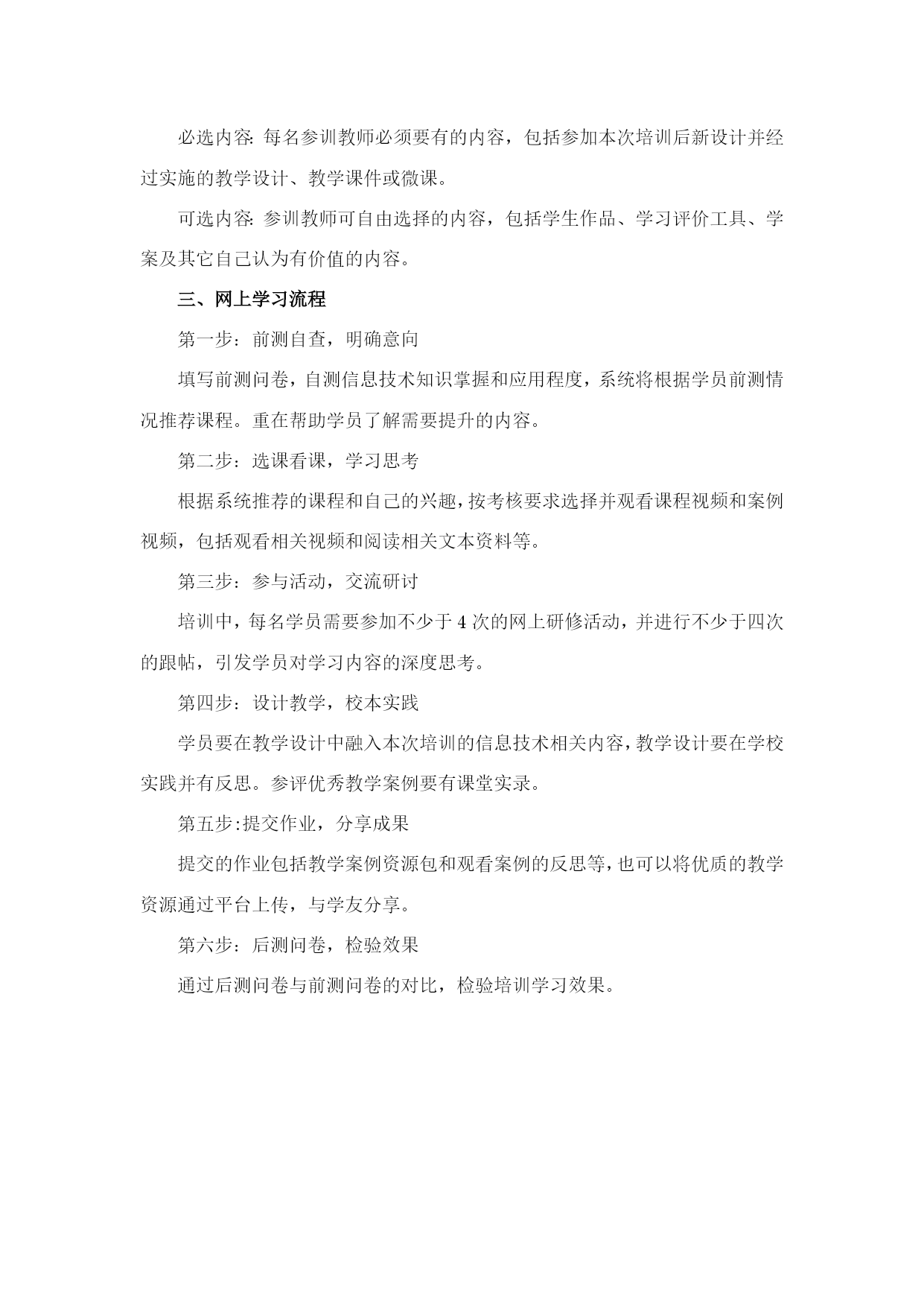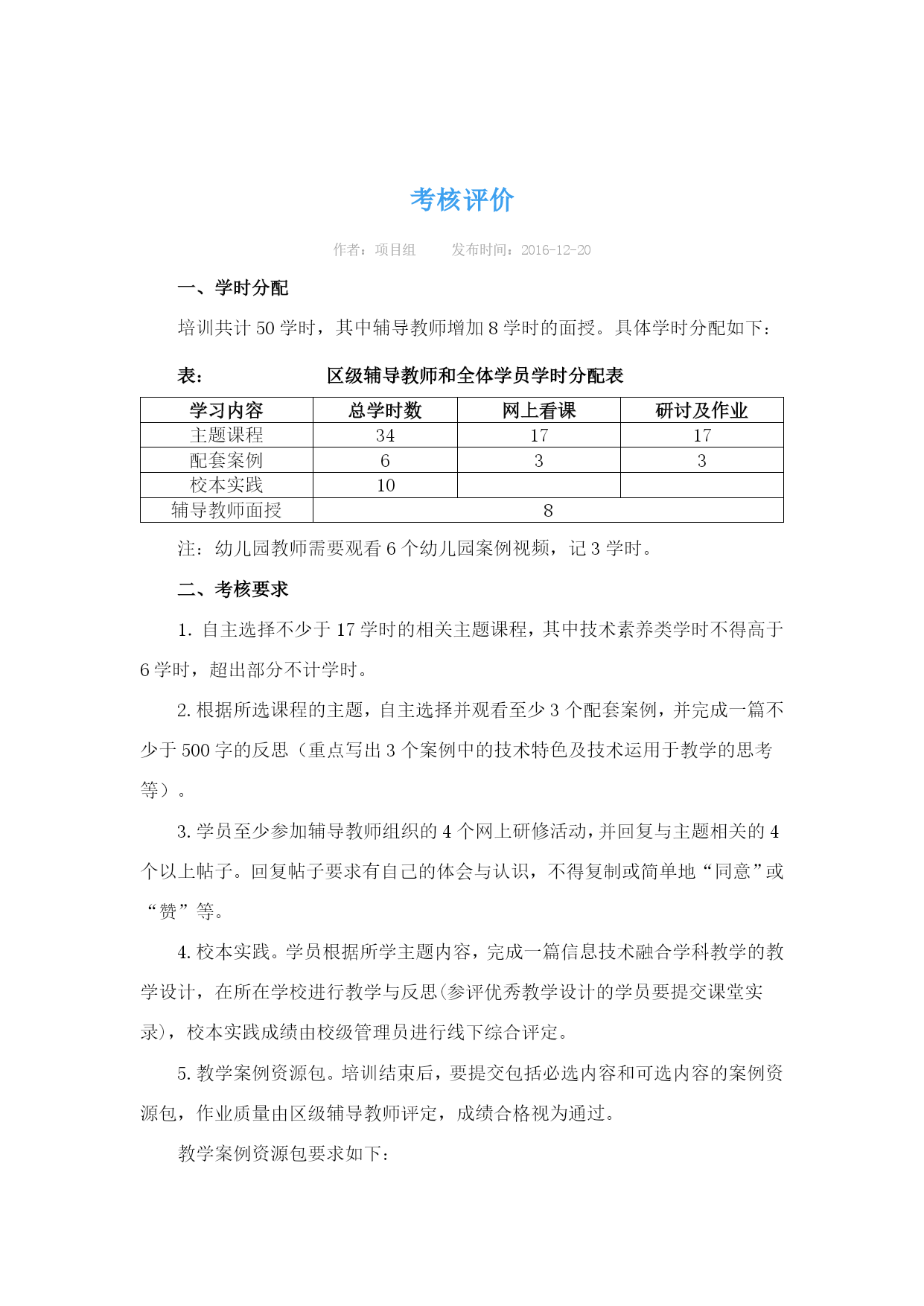 考核评价 作者:项目组发布时间:2016-12-20 一、学时分配 培训共计50学时,其中辅导教师增加8学时的面授。具体学时分配如下: 表:区级辅导教师和全体学员学时分配表 学习内容总学时数网上看课研讨及作业主题课程341717配套案例633校本实践10辅导教师面授8注:幼儿园教师需要观看6个幼儿园案例视频,记3学时。 二、考核要求 1.自主选择不少于17学时的相关主题课程,其中技术素养类学时不得高于6学时,超出部分不计学时。 2.根据所选课程的主题,自主选择并观看至少3个配套案例,并完成一篇不少于500字的反思(重点写出3个案例中的技术特色及技术运用于教学的思考等)。 3.学员至少参加辅导教师组织的4个网上研修活动,并回复与主题相关的4个以上帖子。回复帖子要求有自己的体会与认识,不得复制或简单地“同意”或“赞”等。 4.校本实践。学员根据所学主题内容,完成一篇信息技术融合学科教学的教学设计,在所在学校进行教学与反思(参评优秀教学设计的学员要提交课堂实录),校本实践成绩由校级管理员进行线下综合评定。 5.教学案例资源包。培训结束后,要提交包括必选内容和可选内容的案例资源包,作业质量由区级辅导教师评定,成绩合格视为通过。 教学案例资源包要求如下: 必选内容:每名参训教师必须要有的内容,包括参加本次培训后新设计并经过实施的教学设计、教学课件或微课。 可选内容:参训教师可自由选择的内容,包括学生作品、学习评价工具、学案及其它自己认为有价值的内容。 三、网上学习流程 第一步:前测自查,明确意向 填写前测问卷,自测信息技术知识掌握和应用程度,系统将根据学员前测情况推荐课程。重在帮助学员了解需要提升的内容。 第二步:选课看课,学习思考 根据系统推荐的课程和自己的兴趣,按考核要求选择并观看课程视频和案例视频,包括观看相关视频和阅读相关文本资料等。 第三步:参与活动,交流研讨 培训中,每名学员需要参加不少于4次的网上研修活动,并进行不少于四次的跟帖,引发学员对学习内容的深度思考。 第四步:设计教学,校本实践 学员要在教学设计中融入本次培训的信息技术相关内容,教学设计要在学校实践并有反思。参评优秀教学案例要有课堂实录。 第五步:提交作业,分享成果 提交的作业包括教学案例资源包和观看案例的反思等,也可以将优质的教学资源通过平台上传,与学友分享。 第六步:后测问卷,检验效果 通过后测问卷与前测问卷的对比,检验培训学习效果。