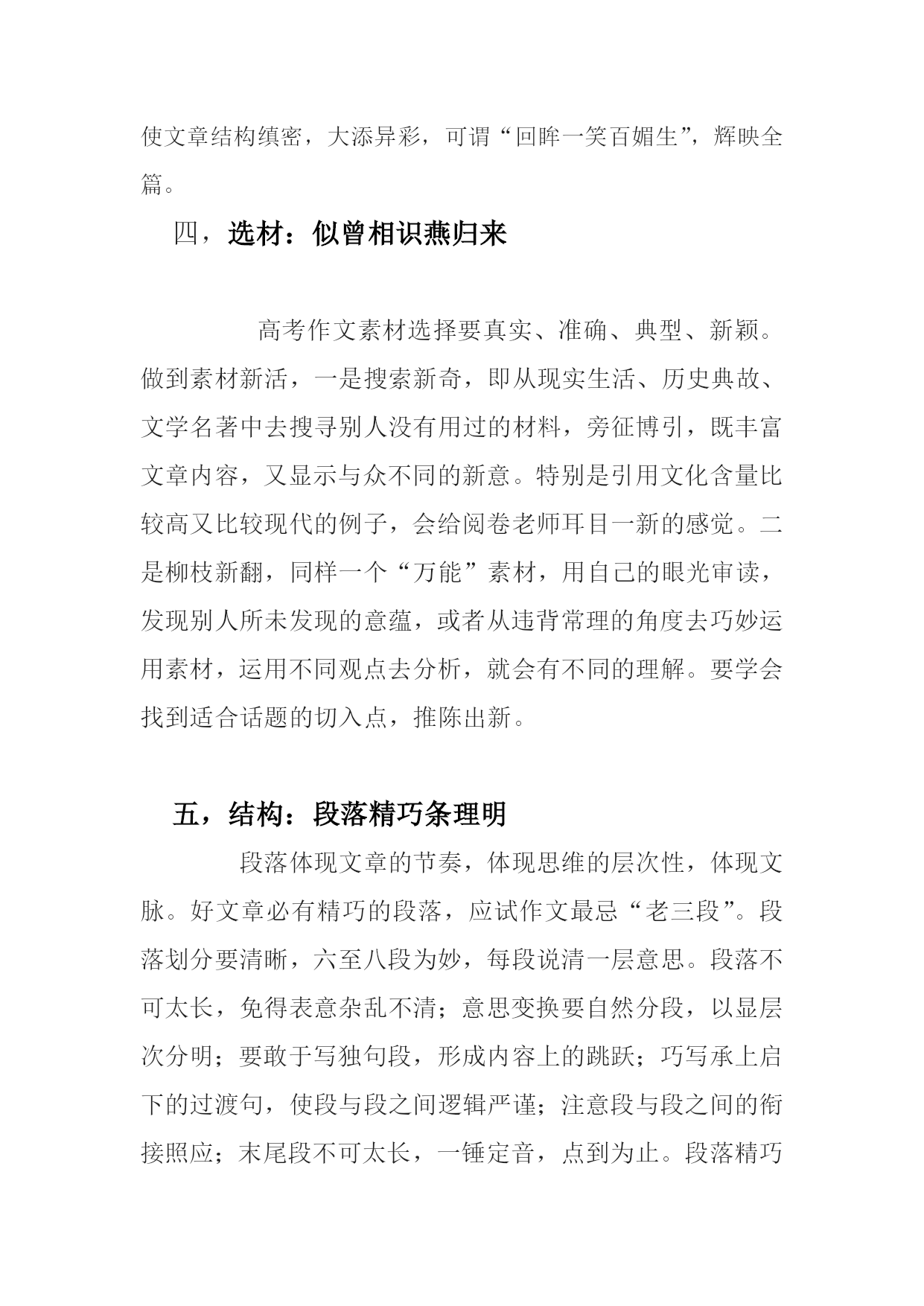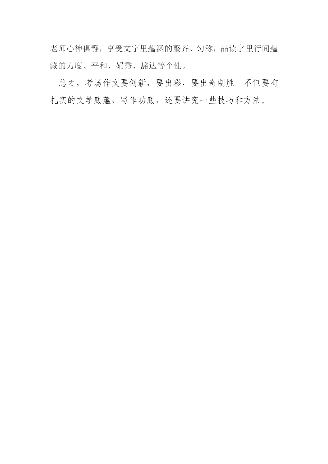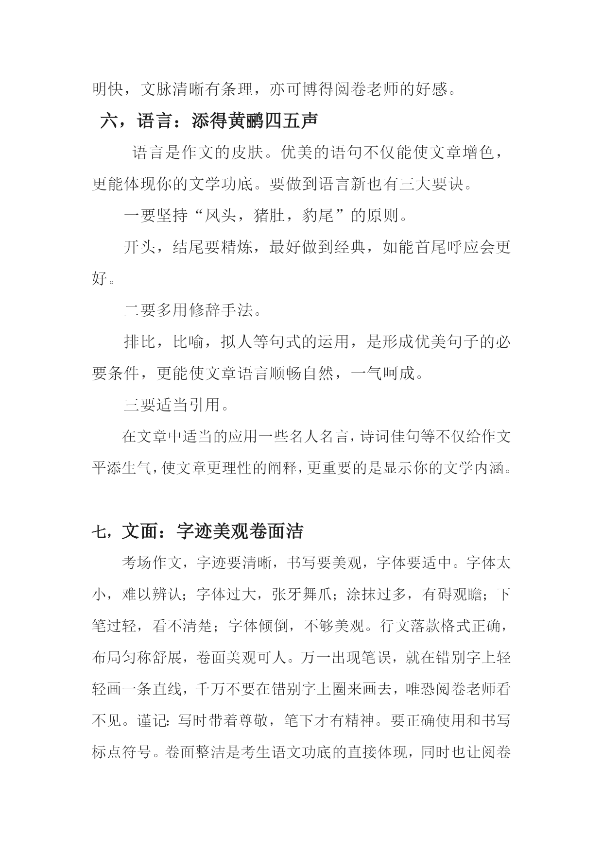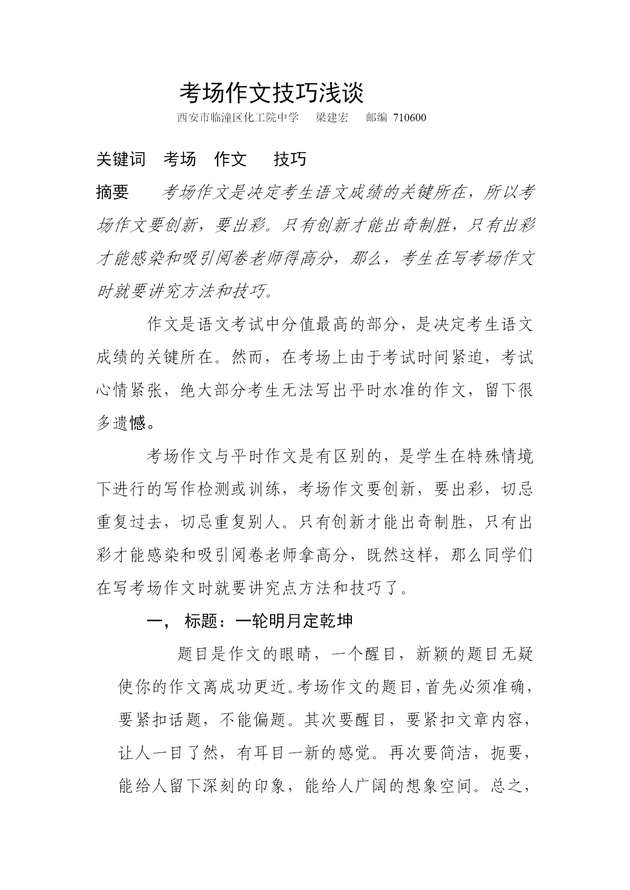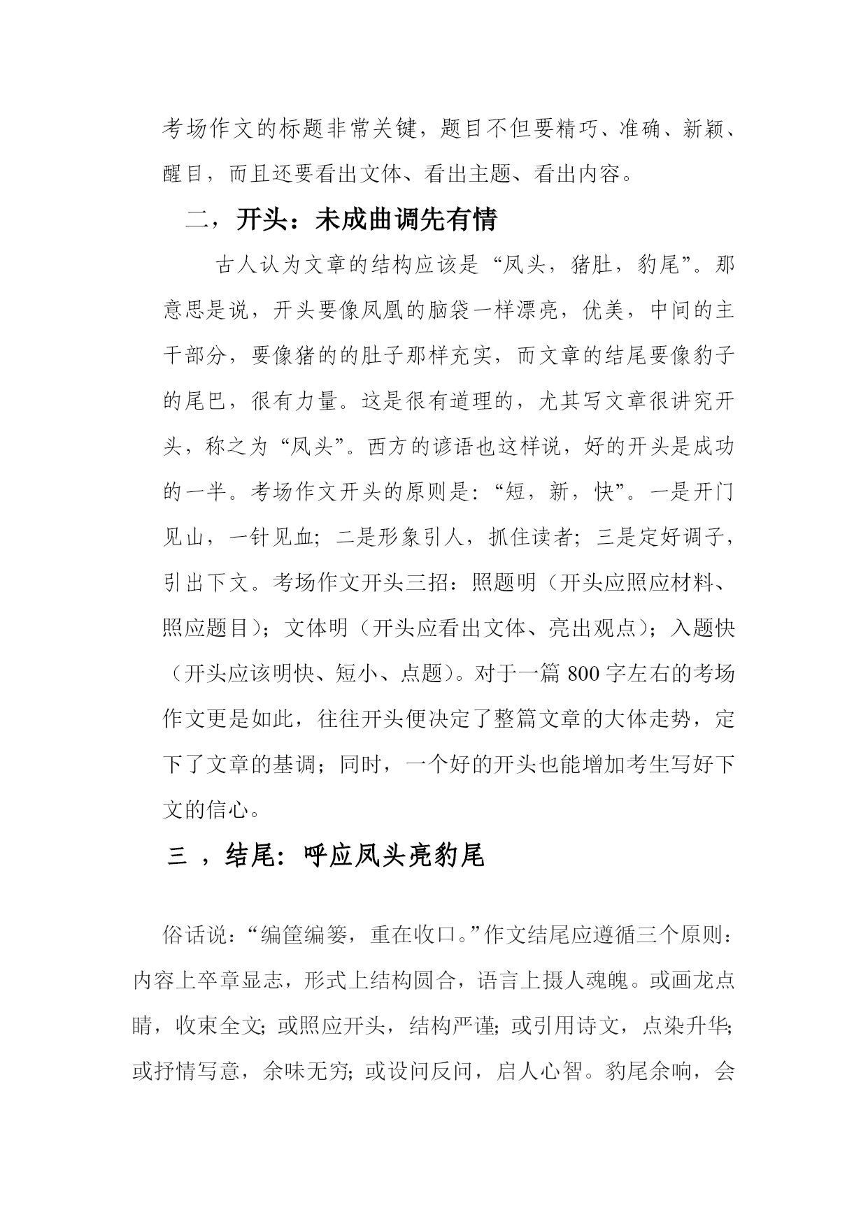 考场作文技巧浅谈 西安市临潼区化工院中学梁建宏邮编710600 关键词考场作文技巧 摘要考场作文是决定考生语文成绩的关键所在,所以考场作文要创新,要出彩。只有创新才能出奇制胜,只有出彩才能感染和吸引阅卷老师得高分,那么,考生在写考场作文时就要讲究方法和技巧。 作文是语文考试中分值最高的部分,是决定考生语文成绩的关键所在。然而,在考场上由于考试时间紧迫,考试心情紧张,绝大部分考生无法写出平时水准的作文,留下很多遗憾。 考场作文与平时作文是有区别的,是学生在特殊情境下进行的写作检测或训练,考场作文要创新,要出彩,切忌重复过去,切忌重复别人。只有创新才能出奇制胜,只有出彩才能感染和吸引阅卷老师拿高分,既然这样,那么同学们在写考场作文时就要讲究点方法和技巧了。 标题:一轮明月定乾坤 题目是作文的眼睛,一个醒目,新颖的题目无疑使你的作文离成功更近。考场作文的题目,首先必须准确,要紧扣话题,不能偏题。其次要醒目,要紧扣文章内容,让人一目了然,有耳目一新的感觉。再次要简洁,扼要,能给人留下深刻的印象,能给人广阔的想象空间。总之,考场作文的标题非常关键,题目不但要精巧、准确、新颖、醒目,而且还要看出文体、看出主题、看出内容。 二,开头:未成曲调先有情 古人认为文章的结构应该是“凤头,猪肚,豹尾”。那意思是说,开头要像凤凰的脑袋一样漂亮,优美,中间的主干部分,要像猪的的肚子那样充实,而文章的结尾要像豹子的尾巴,很有力量。这是很有道理的,尤其写文章很讲究开头,称之为“凤头”。西方的谚语也这样说,好的开头是成功的一半。考场作文开头的原则是:“短,新,快”。一是开门见山,一针见血;二是形象引人,抓住读者;三是定好调子,引出下文。考场作文开头三招:照题明(开头应照应材料、照应题目);文体明(开头应看出文体、亮出观点);入题快(开头应该明快、短小、点题)。对于一篇800字左右的考场作文更是如此,往往开头便决定了整篇文章的大体走势,定下了文章的基调;同时,一个好的开头也能增加考生写好下文的信心。 三,结尾:呼应凤头亮豹尾 俗话说:“编筐编篓,重在收口。”作文结尾应遵循三个原则:内容上卒章显志,形式上结构圆合,语言上摄人魂魄。或画龙点睛,收束全文;或照应开头,结构严谨;或引用诗文,点染升华;或抒情写意,余味无穷;或设问反问,启人心智。豹尾余响,会使文章结构缜密,大添异彩,可谓“回眸一笑百媚生”,辉映全篇。 四,选材:似曾相识燕归来 高考作文素材选择要真实、准确、典型、新颖。做到素材新活,一是搜索新奇,即从现实生活、历史典故、文学名著中去搜寻别人没有用过的材料,旁征博引,既丰富文章内容,又显示与众不同的新意。特别是引用文化含量比较高又比较现代的例子,会给阅卷老师耳目一新的感觉。二是柳枝新翻,同样一个“万能”素材,用自己的眼光审读,发现别人所未发现的意蕴,或者从违背常理的角度去巧妙运用素材,运用不同观点去分析,就会有不同的理解。要学会找到适合话题的切入点,推陈出新。 五,结构:段落精巧条理明 段落体现文章的节奏,体现思维的层次性,体现文脉。好文章必有精巧的段落,应试作文最忌“老三段”。段落划分要清晰,六至八段为妙,每段说清一层意思。段落不可太长,免得表意杂乱不清;意思变换要自然分段,以显层次分明;要敢于写独句段,形成内容上的跳跃;巧写承上启下的过渡句,使段与段之间逻辑严谨;注意段与段之间的衔接照应;末尾段不可太长,一锤定音,点到为止。段落精巧明快,文脉清晰有条理,亦可博得阅卷老师的好感。 六,语言:添得黄鹂四五声 语言是作文的皮肤。优美的语句不仅能使文章增色,更能体现你的文学功底。要做到语言新也有三大要诀。 一要坚持“凤头,猪肚,豹尾”的原则。 开头,结尾要精炼,最好做到经典,如能首尾呼应会更好。 二要多用修辞手法。 排比,比喻,拟人等句式的运用,是形成优美句子的必要条件,更能使文章语言顺畅自然,一气呵成。 三要适当引用。 在文章中适当的应用一些名人名言,诗词佳句等不仅给作文平添生气,使文章更理性的阐释,更重要的是显示你的文学内涵。 七,文面:字迹美观卷面洁考场作文,字迹要清晰,书写要美观,字体要适中。字体太小,难以辨认;字体过大,张牙舞爪;涂抹过多,有碍观瞻;下笔过轻,看不清楚;字体倾倒,不够美观。行文落款格式正确,布局匀称舒展,卷面美观可人。万一出现笔误,就在错别字上轻轻画一条直线,千万不要在错别字上圈来画去,唯恐阅卷老师看不见。谨记:写时带着尊敬,笔下才有精神。要正确使用和书写标点符号。卷面整洁是考生语文功底的直接体现,同时也让阅卷老师心神俱静,享受文字里蕴涵的整齐、匀称,品读字里行间蕴藏的力度、平和、娟秀、豁达等个性。 总之,考场作文要创新,要出彩,要出奇制胜。不但要有扎实的文学底蕴,写作功底,还要讲究一些技巧和方法。