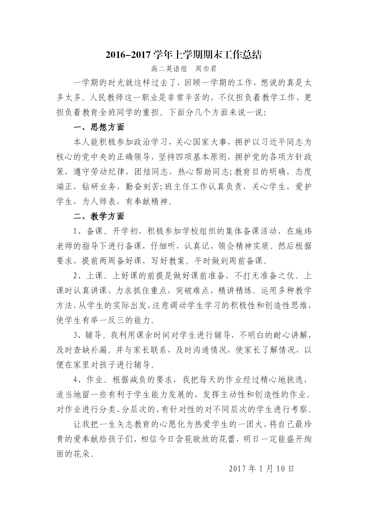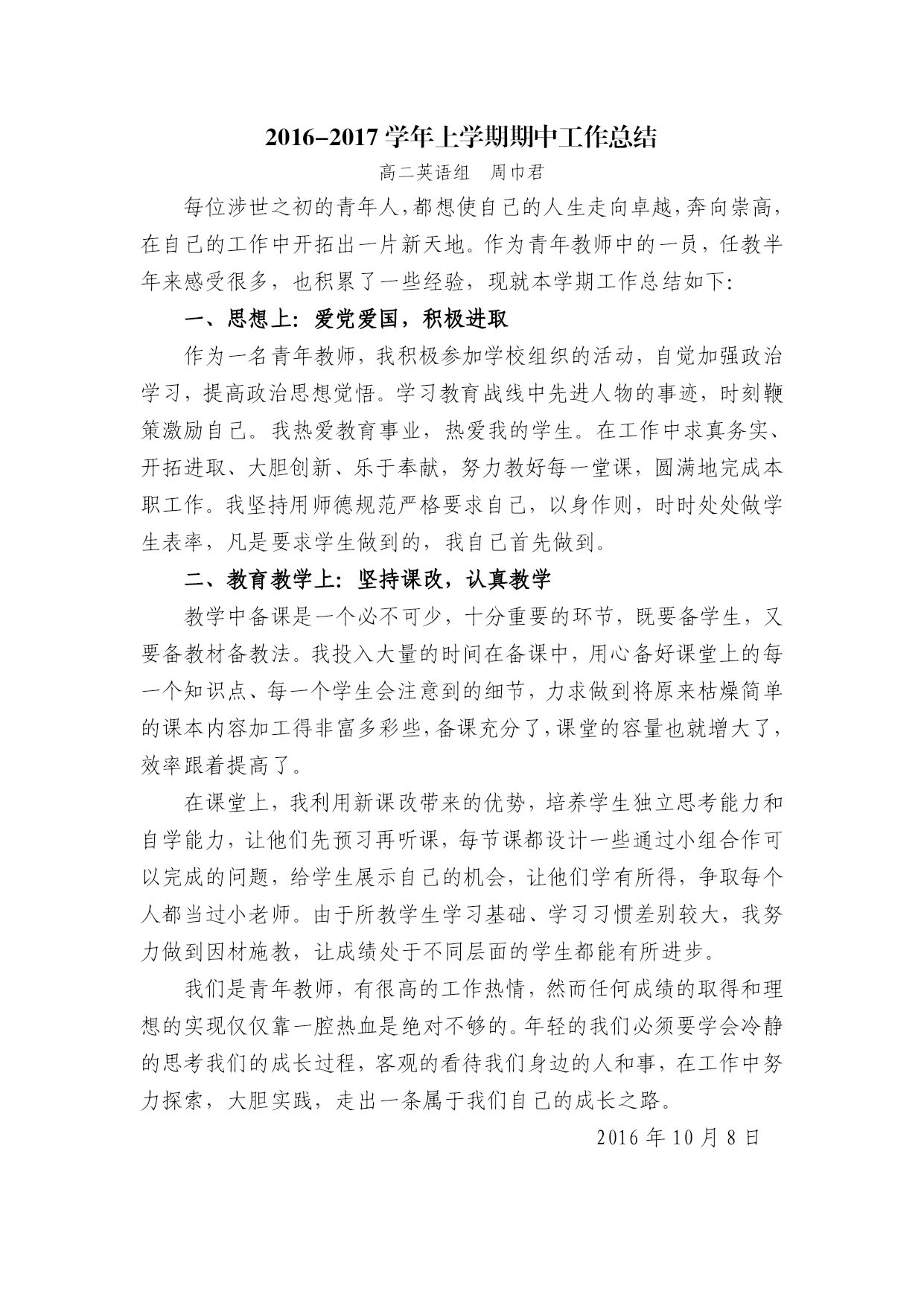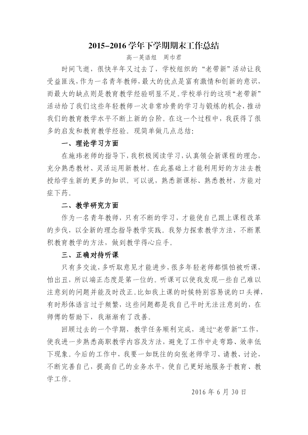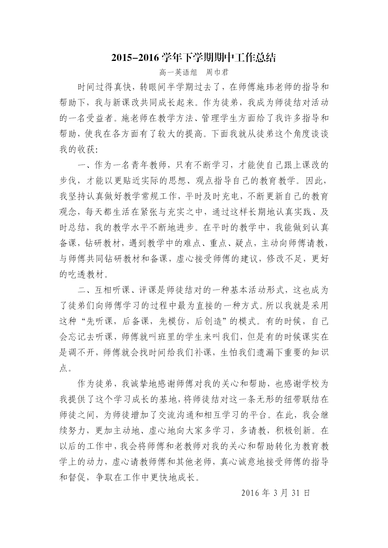 2015-2016学年下学期期中工作总结 高一英语组周巾君 时间过得真快,转眼间半学期过去了,在师傅施玮老师的指导和帮助下,我与新课改共同成长起来。作为徒弟,我成为师徒结对活动的一名受益者。施老师在教学方法、管理学生方面给了我许多指导和帮助,使我在各方面有了较大的提高。下面我就从徒弟这个角度谈谈我的收获: 一、作为一名青年教师,只有不断学习,才能使自己跟上课改的步伐,才能以更贴近实际的思想、观点指导自己的教育教学。因此,我坚持认真做好教学常规工作,平时及时充电,不断更新自己的教育观念,每天都生活在紧张与充实之中,通过这样长期地认真实践、及时总结,我的教学水平不断地进步。在平时的教学中,我能做到认真备课,钻研教材,遇到教学中的难点、重点、疑点,主动向师傅请教,与师傅共同钻研教材和备课,虚心接受师傅的建议,修改不足,更好的吃透教材。 二、互相听课、评课是师徒结对的一种基本活动形式,这也成为了徒弟们向师傅学习的过程中最为直接的一种方式。所以我就是采用这种“先听课,后备课,先模仿,后创造”的模式。有的时候,自己会忘记去听课,师傅就叫班里的学生来叫我们,但是有的时候课实在是调不开,师傅就会找时间给我们补课,生怕我们遗漏下重要的知识点。 作为徒弟,我诚挚地感谢师傅对我的关心和帮助,也感谢学校为我提供了这个学习成长的基地,将师徒结对这一条无形的纽带联结在师徒之间,为师徒增加了交流沟通和相互学习的平台。在此,我会继续努力,更加主动地、虚心地向大家多学习,多请教,积极创新。在以后的工作中,我会将师傅和老教师对我的关心和帮助转化为教育教学上的动力,虚心请教师傅和其他老师,真心诚意地接受师傅的指导和督促,争取在工作中更快地成长。 2016年3月31日 2015-2016学年下学期期末工作总结 高一英语组周巾君 时间飞逝,很快半年又过去了,学校组织的“老带新”活动让我受益匪浅,作为一名青年教师,最大的优点是富有激情和创新的意识,而最大的缺点则是教育教学经验明显不足。学校举行的这项“老带新”活动给了我们这些年轻教师一次非常珍贵的学习与锻炼的机会,推动我们的教育教学水平不断上新的台阶。在这一个过程中,我获得了很多的启发和教育教学经验。现简单做几点总结: 一、理论学习方面 在施玮老师的指导下,我积极阅读学习,认真领会新课程的理念,充分熟悉教材、灵活运用新教材。在此基础上才能利用好的方法去教授给学生新的更多的知识。可以说,熟悉新课标、熟悉教材,方能对症下药。 二、教学研究方面 作为一名青年教师,只有不断的学习,才能使自己跟上课程改革的步伐,以全新的理念指导教学实践。我努力探索教学方法,不断累积教育教学的方法,做到教学得心应手。 三、正确对待听课 只有多交流,多听取意见才能进步,很多年轻老师都惧怕被听课,怕出丑,所以端正态度是第一位的。听课可以使我发现一些自己难以注意到的问题并能及时改正。比如我上课的时候特别容易说的口头禅,有时形体语言过于频繁,这些问题都是我自己平时无法注意到的,在师傅的帮助下,我渐渐有了改善。 回顾过去的一个学期,教学任务顺利完成,通过“老带新”工作,使我进一步熟悉高职教学内容及方法,避免了工作中走弯路、效率低下现象。今后的工作中,我要一如既往的向张老师学习、请教、讨论,不断完善自己,提高自己的业务水平,使自己更好地服务于教育、教学工作。 2016年6月30日 2016-2017学年上学期期中工作总结 高二英语组周巾君 每位涉世之初的青年人,都想使自己的人生走向卓越,奔向崇高,在自己的工作中开拓出一片新天地。作为青年教师中的一员,任教半年来感受很多,也积累了一些经验,现就本学期工作总结如下: 一、思想上:爱党爱国,积极进取 作为一名青年教师,我积极参加学校组织的活动,自觉加强政治学习,提高政治思想觉悟。学习教育战线中先进人物的事迹,时刻鞭策激励自己。我热爱教育事业,热爱我的学生。在工作中求真务实、开拓进取、大胆创新、乐于奉献,努力教好每一堂课,圆满地完成本职工作。我坚持用师德规范严格要求自己,以身作则,时时处处做学生表率,凡是要求学生做到的,我自己首先做到。 二、教育教学上:坚持课改,认真教学 教学中备课是一个必不可少,十分重要的环节,既要备学生,又要备教材备教法。我投入大量的时间在备课中,用心备好课堂上的每一个知识点、每一个学生会注意到的细节,力求做到将原来枯燥简单的课本内容加工得非富多彩些,备课充分了,课堂的容量也就增大了,效率跟着提高了。 在课堂上,我利用新课改带来的优势,培养学生独立思考能力和自学能力,让他们先预习再听课,每节课都设计一些通过小组合作可以完成的问题,给学生展示自己的机会,让他们学有所得,争取每个人都当过小老师。由于所教学生学习基础、学习习惯差别较大,我努力做到因材施教,让成绩处于不同层面的学生都能有所进步。 我们是青