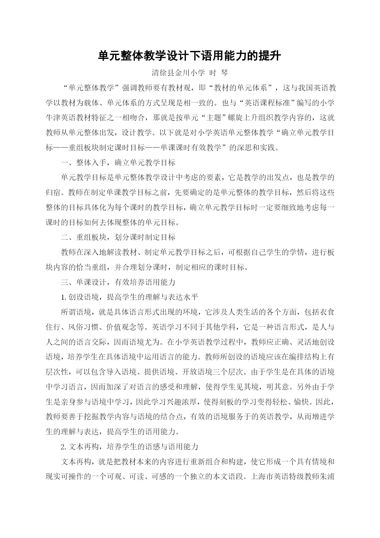 单元整体教学设计下语用能力的提升 清徐县金川小学时琴 “单元整体教学”强调教师要有教材观,即“教材的单元体系”,这与我国英语教学以教材为载体、单元体系的方式呈现是相一致的。也与“英语课程标准”编写的小学牛津英语教材特征之一相吻合,那就是按单元“主题”螺旋上升组织教学内容的,这就教师从单元整体出发,设计教学。以下就是对小学英语单元整体教学“确立单元教学目标——重组板块制定课时目标——单课课时有效教学”的深思和实践。 一、整体入手,确立单元教学目标 单元教学目标是单元整体教学设计中考虑的要素,它是教学的出发点,也是教学的归宿。教师在制定单课教学目标之前,先要确定的是单元整体的教学目标,然后将这些整体的目标具体化为每个课时的教学目标,确立单元教学目标时一定要细致地考虑每一课时的目标如何去体现整体的单元目标。 二、重组板块,划分课时制定目标 教师在深入地解读教材、制定单元教学目标之后,可根据自己学生的学情,进行板块内容的恰当重组,并合理划分课时,制定相应的课时目标。 三、单课设计,有效培养语用能力 1.创设语境,提高学生的理解与表达水平 所谓语境,就是具体语言形式出现的环境,它涉及人类生活的各个方面,包括衣食住行、风俗习惯、价值观念等。英语学习不同于其他学科,它是一种语言形式,是人与人之间的语言交际,因而语境尤为。在小学英语教学过程中,教师应正确、灵活地创设语境,培养学生在具体语境中运用语言的能力。教师所创设的语境应该在编排结构上有层次性,可以包含导入语境、提供语境、开放语境三个层次。由于学生是在具体的语境中学习语言,因而加深了对语言的感受和理解,使得学生见其境,明其意。另外由于学生是亲身参与语境中学习,因此学习兴趣浓厚,使得刻板的学习变得轻松、愉快。因此,教师要善于挖掘教学内容与语境的结合点,有效的语境服务于的英语教学,从而增进学生的理解与表达,提高学生的语用能力。 2.文本再构,培养学生的语感与语用能力 文本再构,就是把教材本来的内容进行重新组合和构建,使它形成一个具有情境和现实可操作的一个可观、可读、可感的一个独立的本文语段。上海市英语特级教师朱浦老师强调:“文本再构体现教材原有的主题和教材内容的安排,符合单元教学的整体”。因此,这对于这些一线教师来讲,是有一定的教学挑战性。,教师应认识到文本再构一定是基于教材的再构,也就是说一定是以“用教材来教英语”作为出发点和落脚点的。而且最的是文本再构不是为了去增加文本的难度,而是要体现文本的适度。其次,文本再构一定是基于学生的再构。一切都要从学生出发,一切都从学生的认知水平和语言基础出发进行合理的文本再构。如果教师再构的“文本”既能符合学生的学情,又能体现教材的主题,并融合了所要掌握的语言技能和语言知识,那么,这样的课堂教学一定能真正培养学生的语言运用能力。 3.无痕渗透,增强学生的文化与情感体验 语言是文化的组成。在小学英语教学中,学习英语就是包括了学习和了解语言有关的风土人情,文化习俗和生活特点。情感态度是指兴趣、动机、自信、意志和合作精神等影响学生学习过程和学习结果的相关因素以及在学习过程中逐步形成的爱国意识和国际视野。积极的情感态度是学生英语学习成功的关键。作为一名小学英语教师,要善于挖掘教材中的文化与情感教育因素,发现和捕捉契机,将教材内容和文化情感渗透有机巧妙地结合起来,还要善于设计学生易于更乐于接受的方式对学生进行启发、诱导、渗透、感染和熏陶,进行一种“随风潜入夜,润物细无声”式的“无痕”教育。学生在这样的情感体验中,积极踊跃地表达着自己的感受和心情,在习得语言、体验文化、熏陶情感的同时,培养了语用能力。 2015.5
