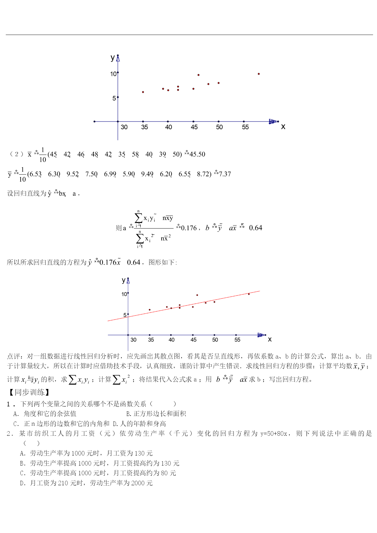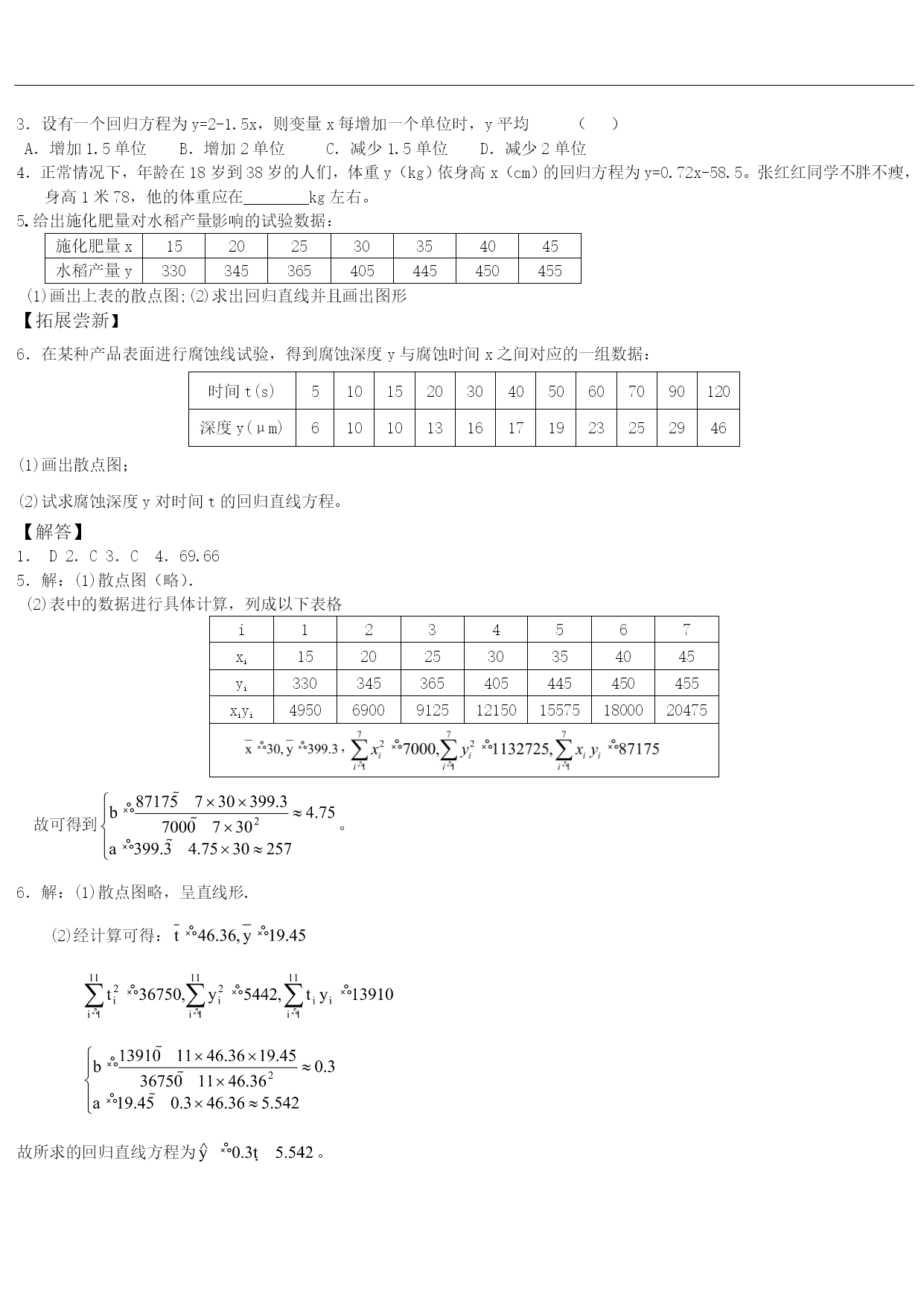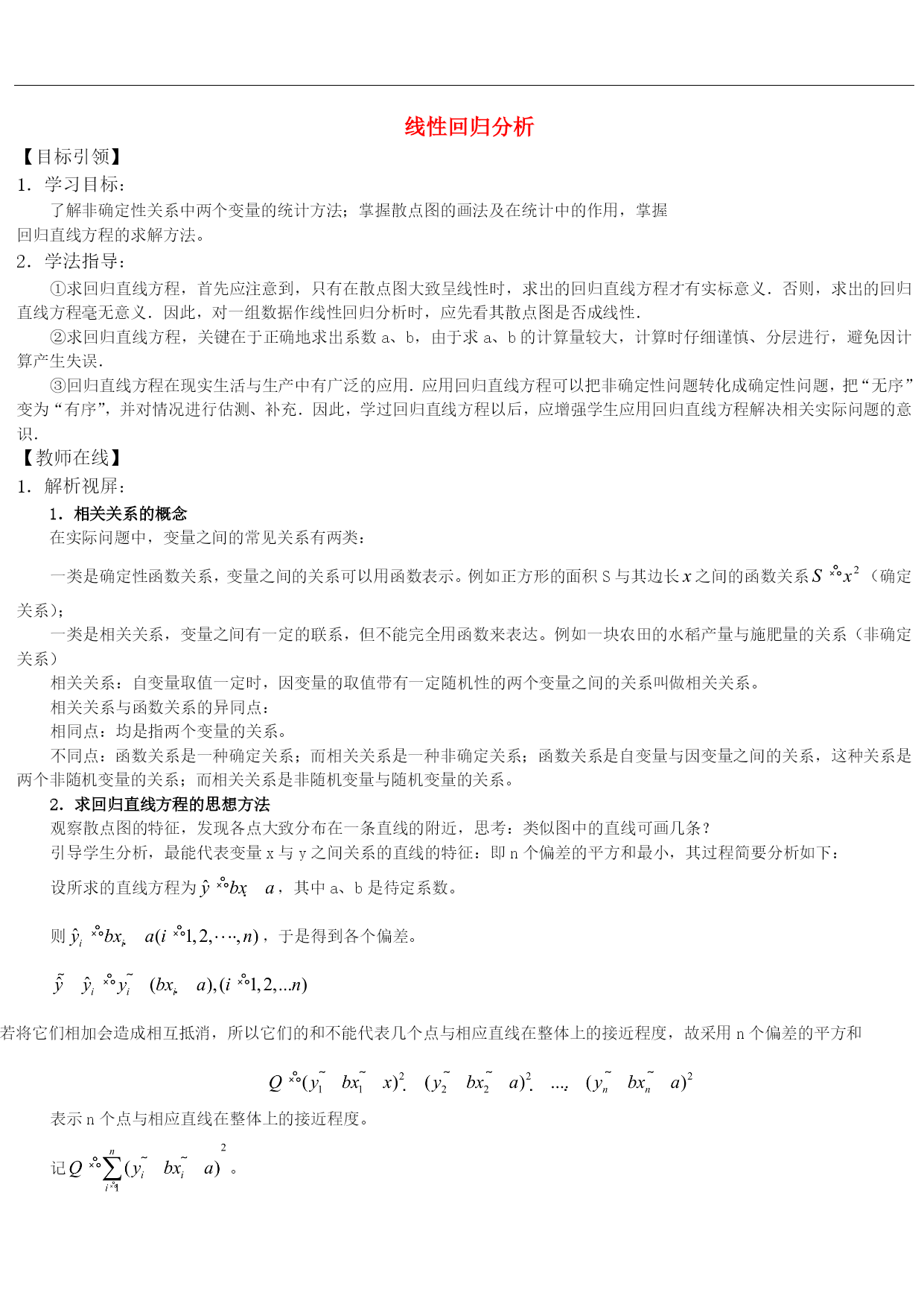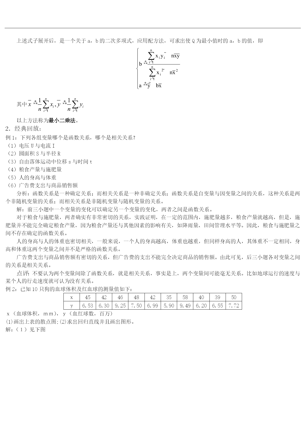 线性回归分析 【目标引领】 学习目标: 了解非确定性关系中两个变量的统计方法;掌握散点图的画法及在统计中的作用,掌握 回归直线方程的求解方法。 学法指导: ①求回归直线方程,首先应注意到,只有在散点图大致呈线性时,求出的回归直线方程才有实标意义.否则,求出的回归直线方程毫无意义.因此,对一组数据作线性回归分析时,应先看其散点图是否成线性. ②求回归直线方程,关键在于正确地求出系数a、b,由于求a、b的计算量较大,计算时仔细谨慎、分层进行,避免因计算产生失误. ③回归直线方程在现实生活与生产中有广泛的应用.应用回归直线方程可以把非确定性问题转化成确定性问题,把“无序”变为“有序”,并对情况进行估测、补充.因此,学过回归直线方程以后,应增强学生应用回归直线方程解决相关实际问题的意识. 【教师在线】 解析视屏: 1.相关关系的概念 在实际问题中,变量之间的常见关系有两类: 一类是确定性函数关系,变量之间的关系可以用函数表示。例如正方形的面积S与其边长之间的函数关系(确定关系); 一类是相关关系,变量之间有一定的联系,但不能完全用函数来表达。例如一块农田的水稻产量与施肥量的关系(非确定关系) 相关关系:自变量取值一定时,因变量的取值带有一定随机性的两个变量之间的关系叫做相关关系。 相关关系与函数关系的异同点: 相同点:均是指两个变量的关系。 不同点:函数关系是一种确定关系;而相关关系是一种非确定关系;函数关系是自变量与因变量之间的关系,这种关系是两个非随机变量的关系;而相关关系是非随机变量与随机变量的关系。 2.求回归直线方程的思想方法 观察散点图的特征,发现各点大致分布在一条直线的附近,思考:类似图中的直线可画几条? 引导学生分析,最能代表变量x与y之间关系的直线的特征:即n个偏差的平方和最小,其过程简要分析如下: 设所求的直线方程为,其中a、b是待定系数。 则,于是得到各个偏差。 显见,偏差的符号有正负,若将它们相加会造成相互抵消,所以它们的和不能代表几个点与相应直线在整体上的接近程度,故采用n个偏差的平方和 表示n个点与相应直线在整体上的接近程度。 记。 上述式子展开后,是一个关于a,b的二次多项式,应用配方法,可求出使Q为最小值时的a,b的值,即 其中 以上方法称为最小二乘法。 经典回放: 例1:下列各组变量哪个是函数关系,哪个是相关关系? (1)电压U与电流I (2)圆面积S与半径R (3)自由落体运动中位移s与时间t (4)粮食产量与施肥量 (5)人的身高与体重 (6)广告费支出与商品销售额 分析:函数关系是一种确定关系;而相关关系是一种非确定关系;函数关系是自变量与因变量之间的关系,这种关系是两个非随机变量的关系;而相关关系是非随机变量与随机变量的关系。 解:前三小题中一个变量的变化可以确定另一个变量的变化,两者之间是函数关系。 对于粮食与施肥量,两者确实有非常密切的关系,实践证明,在一定的范围内,施肥量越多,粮食产量就越高,但是,施肥量并不能完全确定粮食产量,因为粮食产量还与其他因素的影响有关,如降雨量、田间管理水平等。因此,粮食与施肥量之间不存在确定的函数关系。 人的身高与人的体重也密切相关,一般来说,一个人的身高越高,体重也越重,但同样身高的人,其体重不一定相同,身高和体重这两个变量之间并不是严格的函数关系。 广告费支出与商品销售额有密切的关系,但广告费的支出不能完全决定商品的销售额。由此可见,后三小题各对变量之间的关系是相关关系。 点评:不要认为两个变量间除了函数关系,就是相关关系,事实是上,两个变量间可能毫无关系。比如地球运行的速度与某个人的行走速度就可认为没有关系。 例2:已知10只狗的血球体积及红血球的测量值如下: x45424648423558403950y6.536.309.257.506.995.909.496.206.557.72x(血球体积,mm),y(血红球数,百万) (1)画出上表的散点图;(2)求出回归直线并且画出图形。 解:(1)见下图 (2) 设回归直线为, 则, 所以所求回归直线的方程为,图形如下: 点评:对一组数据进行线性回归分析时,应先画出其散点图,看其是否呈直线形,再依系数a、b的计算公式,算出a、b.由于计算量较大,所以在计算时应借助技术手段,认真细致,谨防计算中产生错误.求线性回归方程的步骤:计算平均数;计算的积,求;计算;将结果代入公式求a;用求b;写出回归方程。 【同步训练】 1.下列两个变量之间的关系哪个不是函数关系() A.角度和它的余弦值 B.正方形边长和面积 C.正n边形的边数和它的内角和 D.人的年龄和身高 2.某市纺织工人的月工资(元)依劳动生产率(千元)变化的回归方程为y=50+80x,则下列说法中正确的是() A.劳动生产率为1