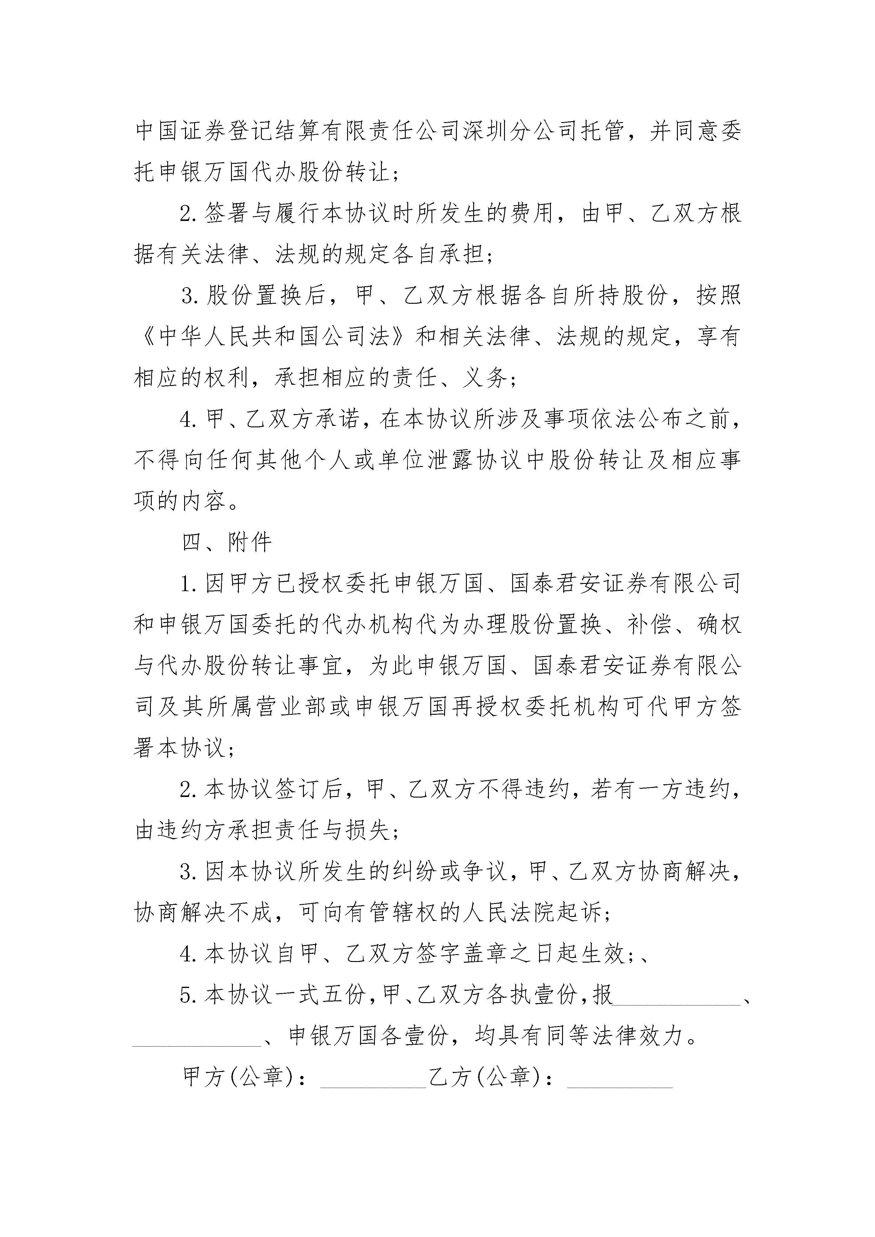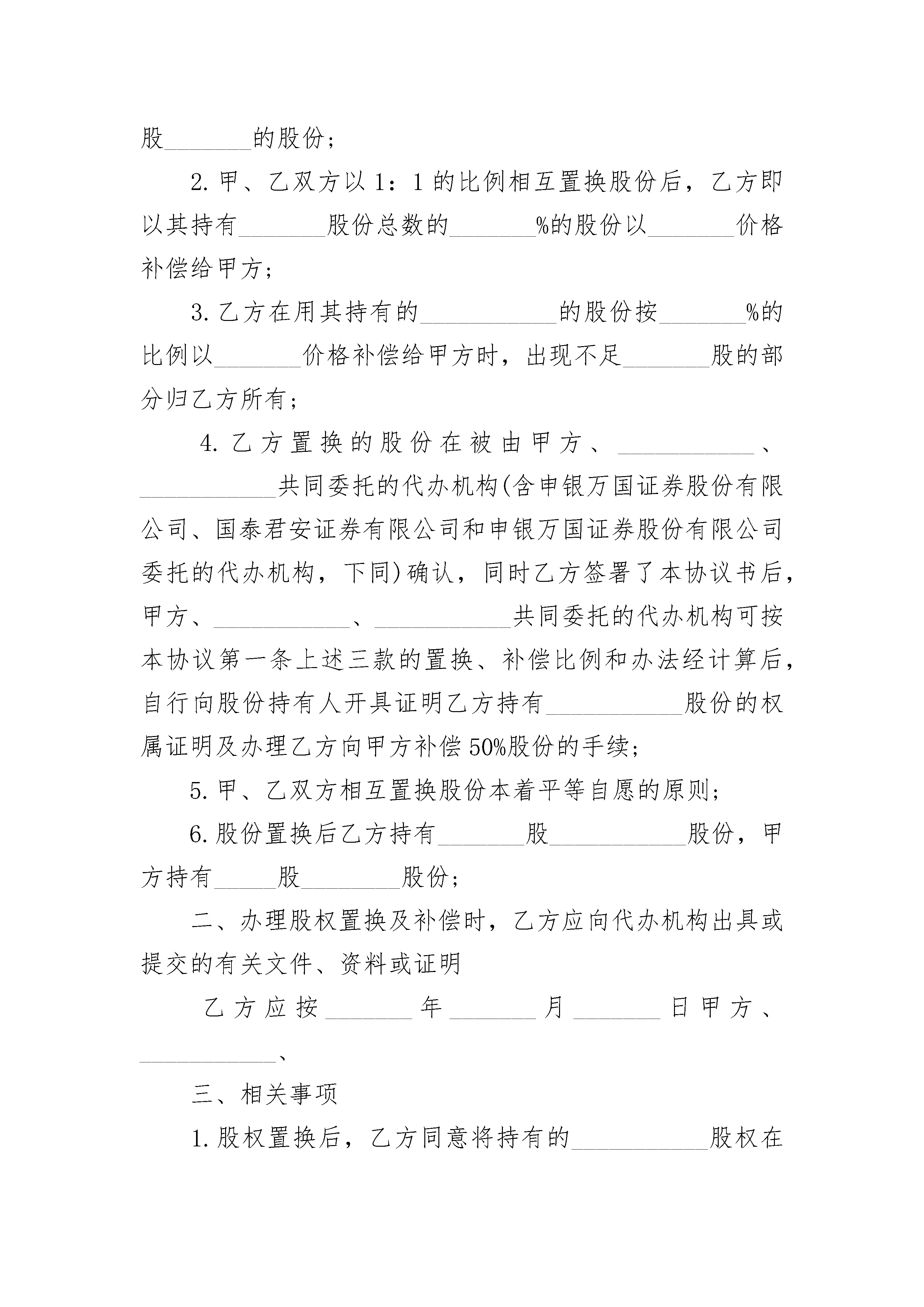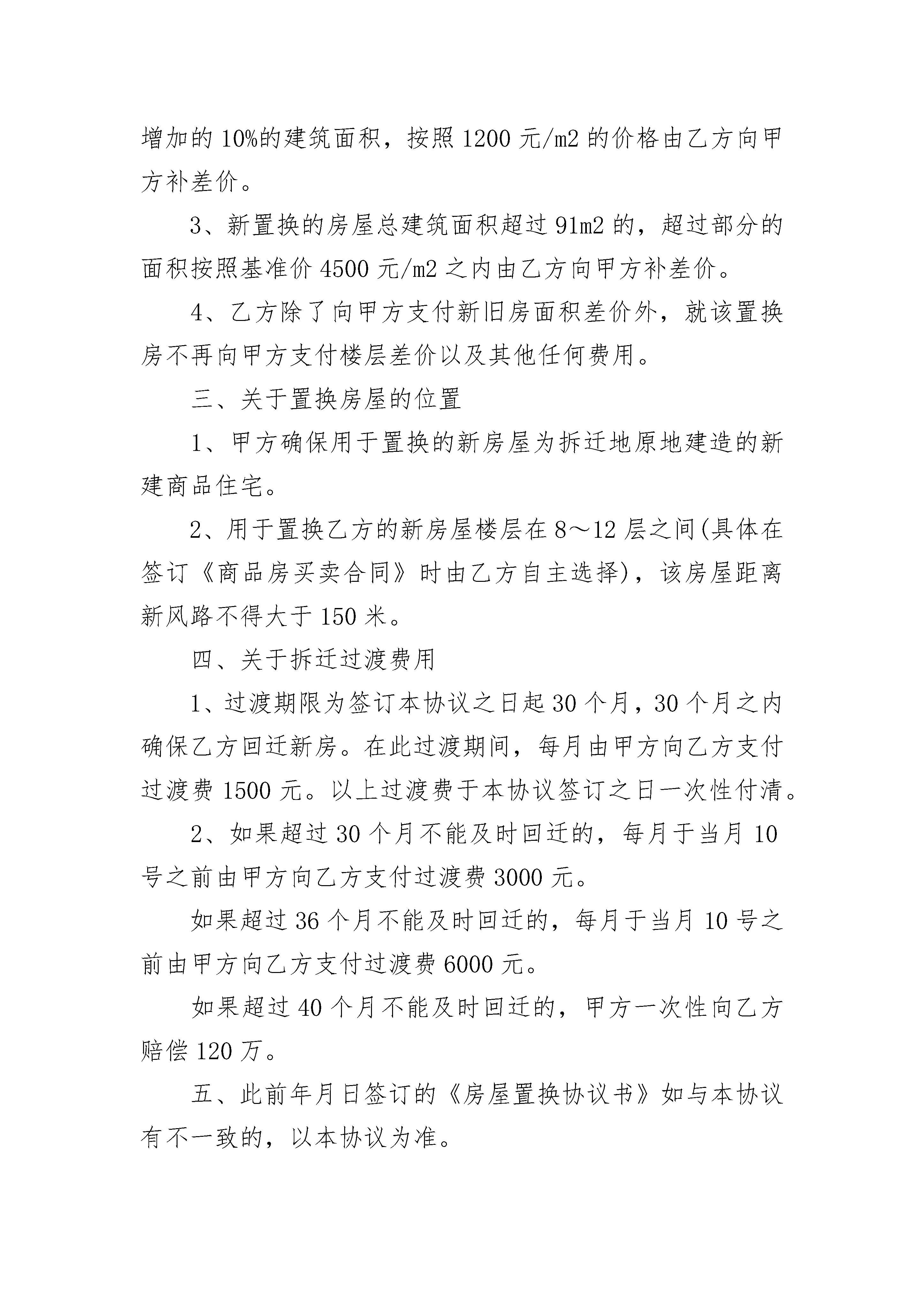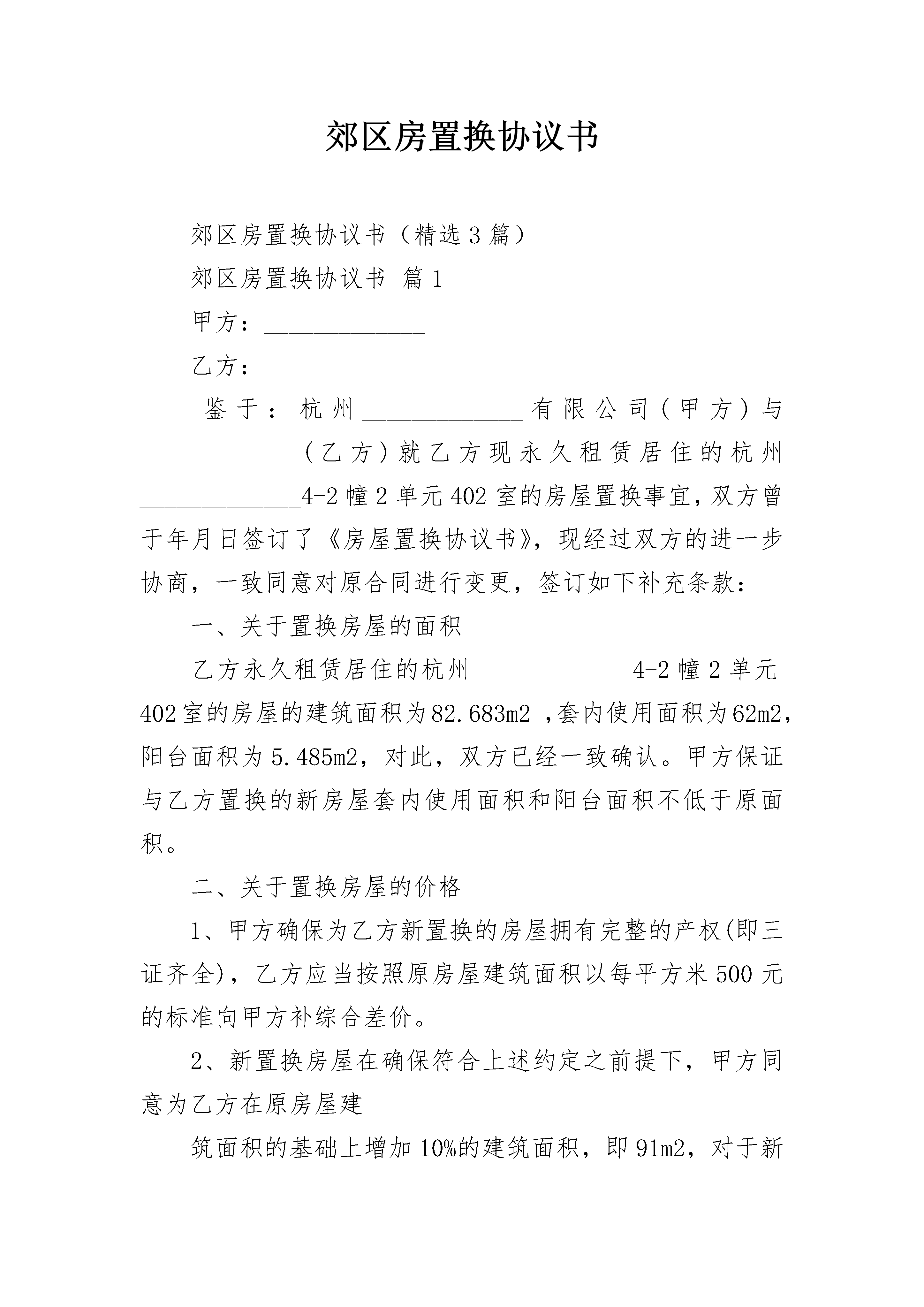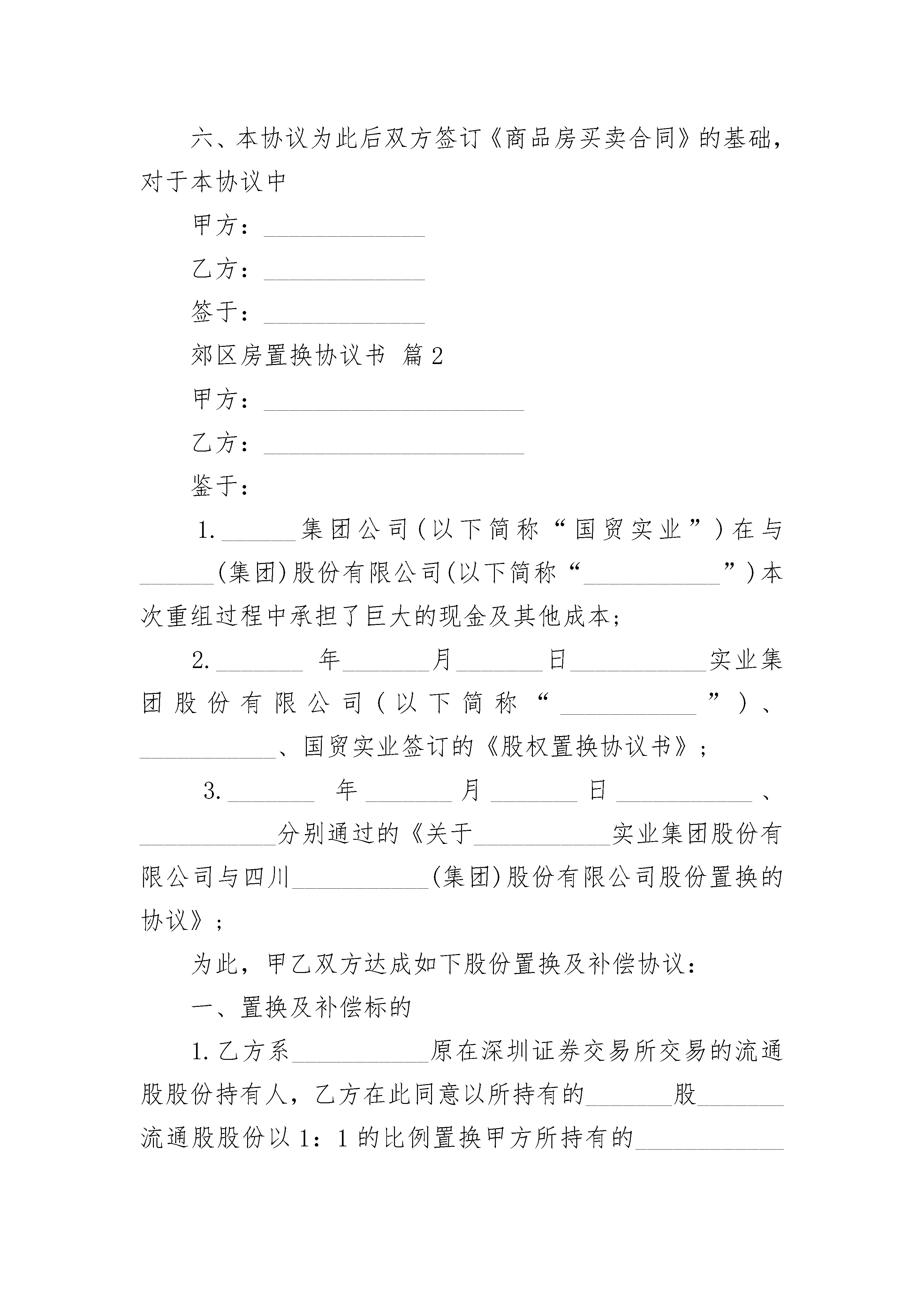 郊区房置换协议书郊区房置换协议书(精选3篇)郊区房置换协议书篇1甲方:_____________乙方:_____________鉴于:杭州_____________有限公司(甲方)与_____________(乙方)就乙方现永久租赁居住的杭州_____________4-2幢2单元402室的房屋置换事宜,双方曾于年月日签订了《房屋置换协议书》,现经过双方的进一步协商,一致同意对原合同进行变更,签订如下补充条款:一、关于置换房屋的面积乙方永久租赁居住的杭州_____________4-2幢2单元402室的房屋的建筑面积为82.683m2,套内使用面积为62m2,阳台面积为5.485m2,对此,双方已经一致确认。甲方保证与乙方置换的新房屋套内使用面积和阳台面积不低于原面积。二、关于置换房屋的价格1、甲方确保为乙方新置换的房屋拥有完整的产权(即三证齐全),乙方应当按照原房屋建筑面积以每平方米500元的标准向甲方补综合差价。2、新置换房屋在确保符合上述约定之前提下,甲方同意为乙方在原房屋建筑面积的基础上增加10%的建筑面积,即91m2,对于新增加的10%的建筑面积,按照1200元/m2的价格由乙方向甲方补差价。3、新置换的房屋总建筑面积超过91m2的,超过部分的面积按照基准价4500元/m2之内由乙方向甲方补差价。4、乙方除了向甲方支付新旧房面积差价外,就该置换房不再向甲方支付楼层差价以及其他任何费用。三、关于置换房屋的位置1、甲方确保用于置换的新房屋为拆迁地原地建造的新建商品住宅。2、用于置换乙方的新房屋楼层在8~12层之间(具体在签订《商品房买卖合同》时由乙方自主选择),该房屋距离新风路不得大于150米。四、关于拆迁过渡费用1、过渡期限为签订本协议之日起30个月,30个月之内确保乙方回迁新房。在此过渡期间,每月由甲方向乙方支付过渡费1500元。以上过渡费于本协议签订之日一次性付清。2、如果超过30个月不能及时回迁的,每月于当月10号之前由甲方向乙方支付过渡费3000元。如果超过36个月不能及时回迁的,每月于当月10号之前由甲方向乙方支付过渡费6000元。如果超过40个月不能及时回迁的,甲方一次性向乙方赔偿120万。五、此前年月日签订的《房屋置换协议书》如与本协议有不一致的,以本协议为准。六、本协议为此后双方签订《商品房买卖合同》的基础,对于本协议中甲方:_____________乙方:_____________签于:_____________郊区房置换协议书篇2甲方:_____________________乙方:_____________________鉴于:1.______集团公司(以下简称“国贸实业”)在与______(集团)股份有限公司(以下简称“___________”)本次重组过程中承担了巨大的现金及其他成本;2._______年_______月_______日___________实业集团股份有限公司(以下简称“___________”)、___________、国贸实业签订的《股权置换协议书》;3._______年_______月_______日___________、___________分别通过的《关于___________实业集团股份有限公司与四川___________(集团)股份有限公司股份置换的协议》;为此,甲乙双方达成如下股份置换及补偿协议:一、置换及补偿标的1.乙方系___________原在深圳证券交易所交易的流通股股份持有人,乙方在此同意以所持有的_______股_______流通股股份以1:1的比例置换甲方所持有的____________股_______的股份;2.甲、乙双方以1:1的比例相互置换股份后,乙方即以其持有_______股份总数的_______%的股份以_______价格补偿给甲方;3.乙方在用其持有的___________的股份按_______%的比例以_______价格补偿给甲方时,出现不足_______股的部分归乙方所有;4.乙方置换的股份在被由甲方、___________、___________共同委托的代办机构(含申银万国证券股份有限公司、国泰君安证券有限公司和申银万国证券股份有限公司委托的代办机构,下同)确认,同时乙方签署了本协议书后,甲方、___________、___________共同委托的代办机构可按本协议第一条上述三款的置换、补偿比例和办法经计算后,自行向股份持有人开具证明乙方持有___________股份的权属证明及办理乙方向甲方补偿50%股份的手续;5.甲、乙双方相互置换股份本着平等自愿的原则;6.股份置换后乙方持有_______股___________股份,甲方持有_____股________股份;二、办理股权置换及补偿时,乙方应向代办机构出具或提交的