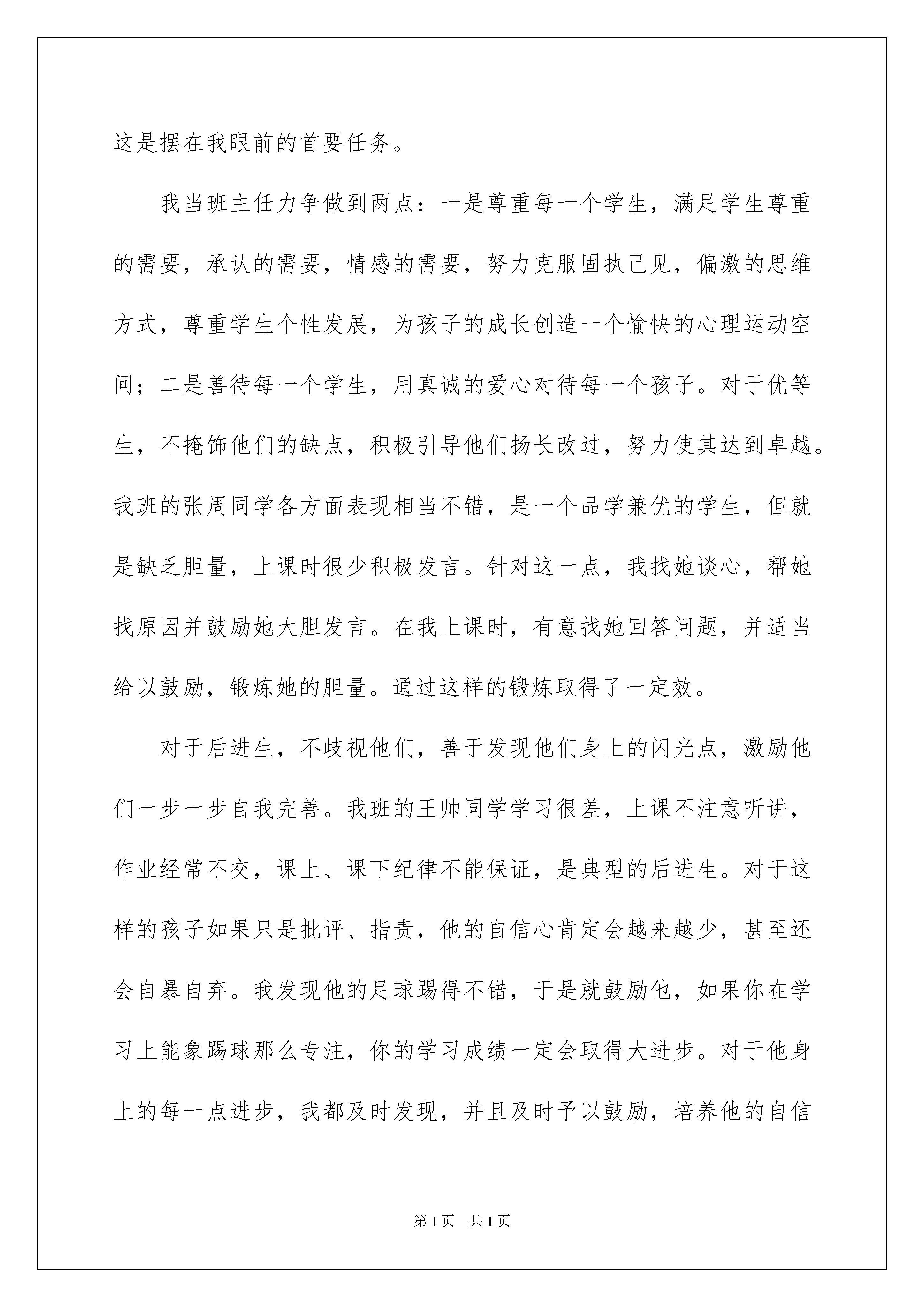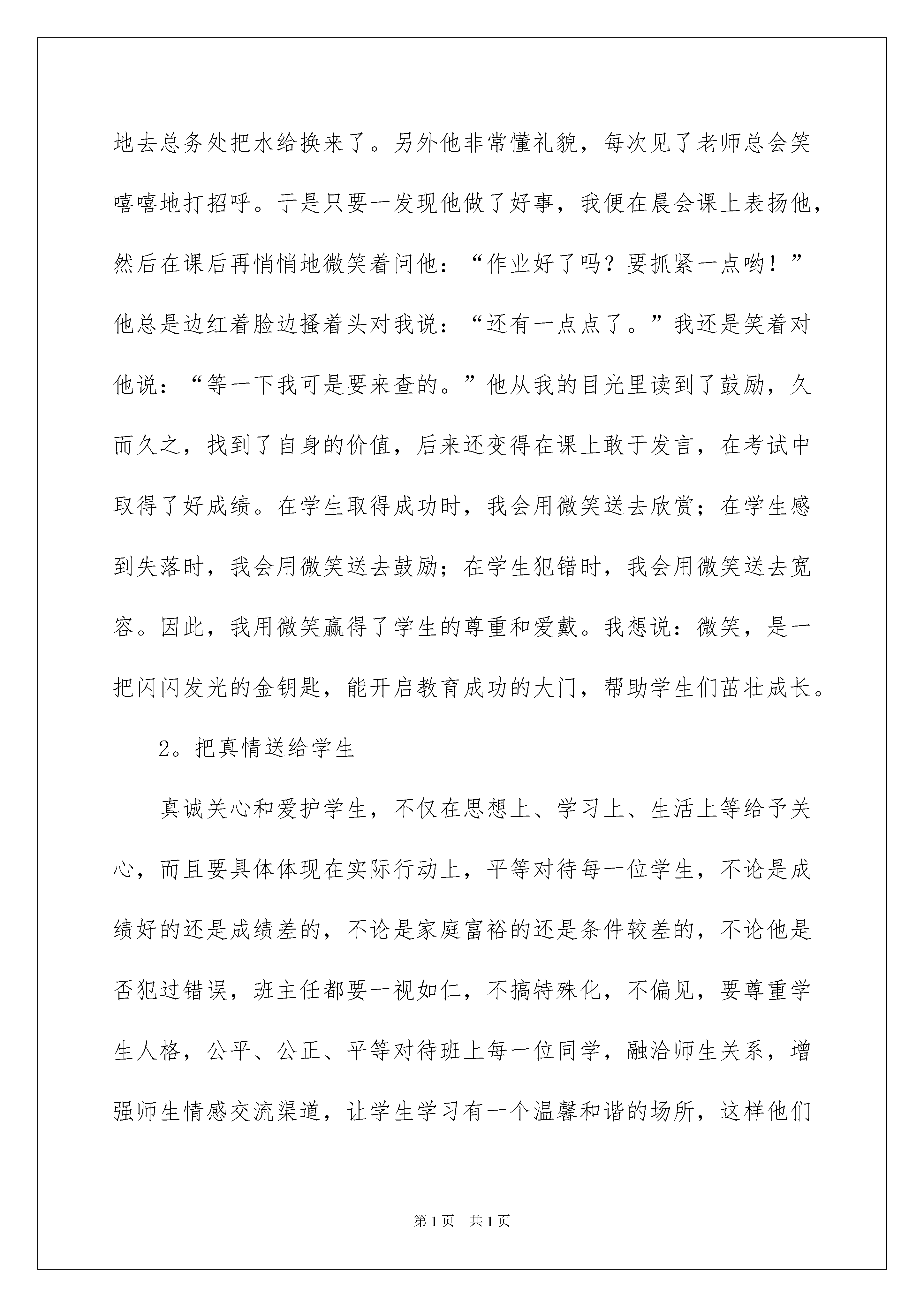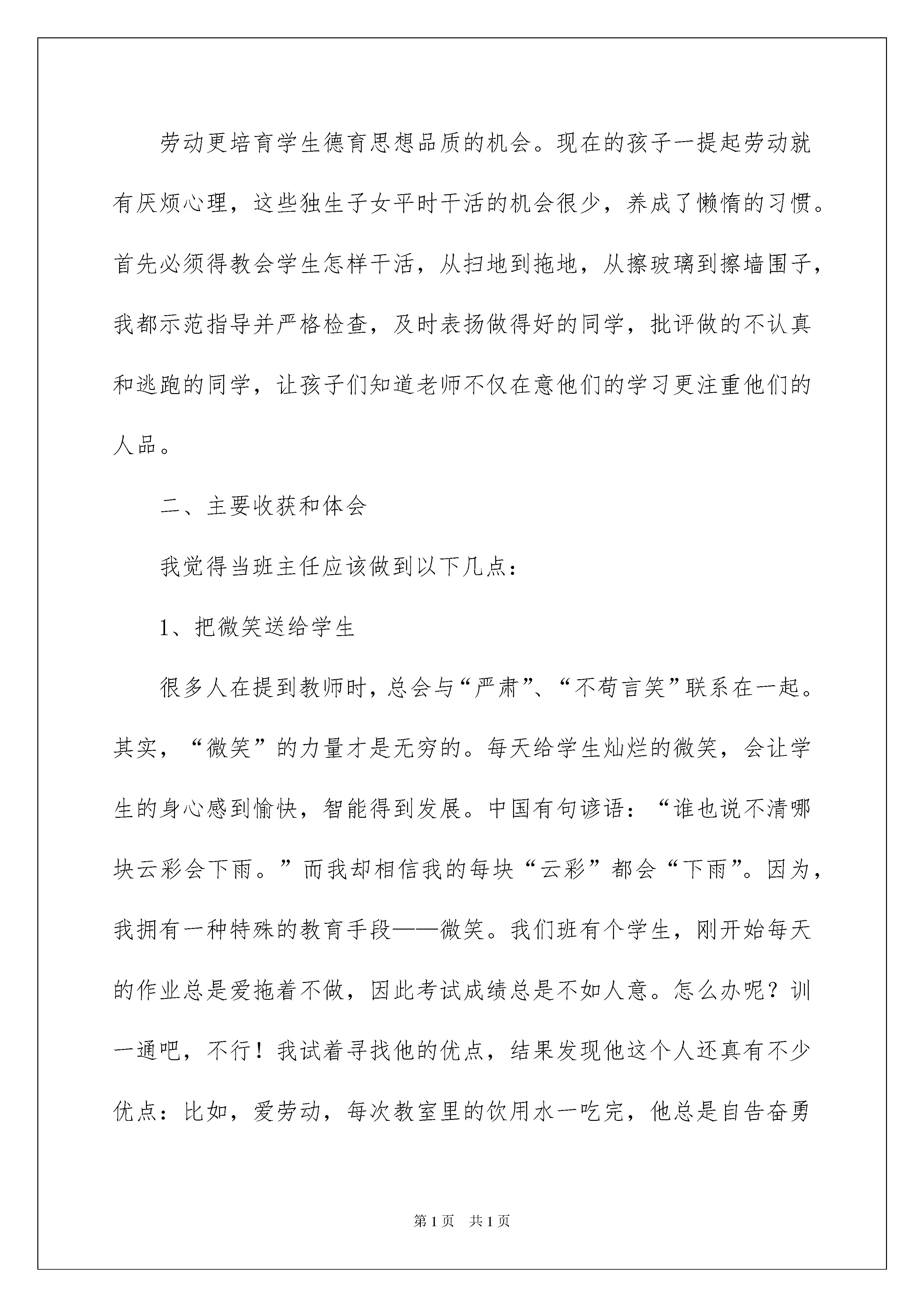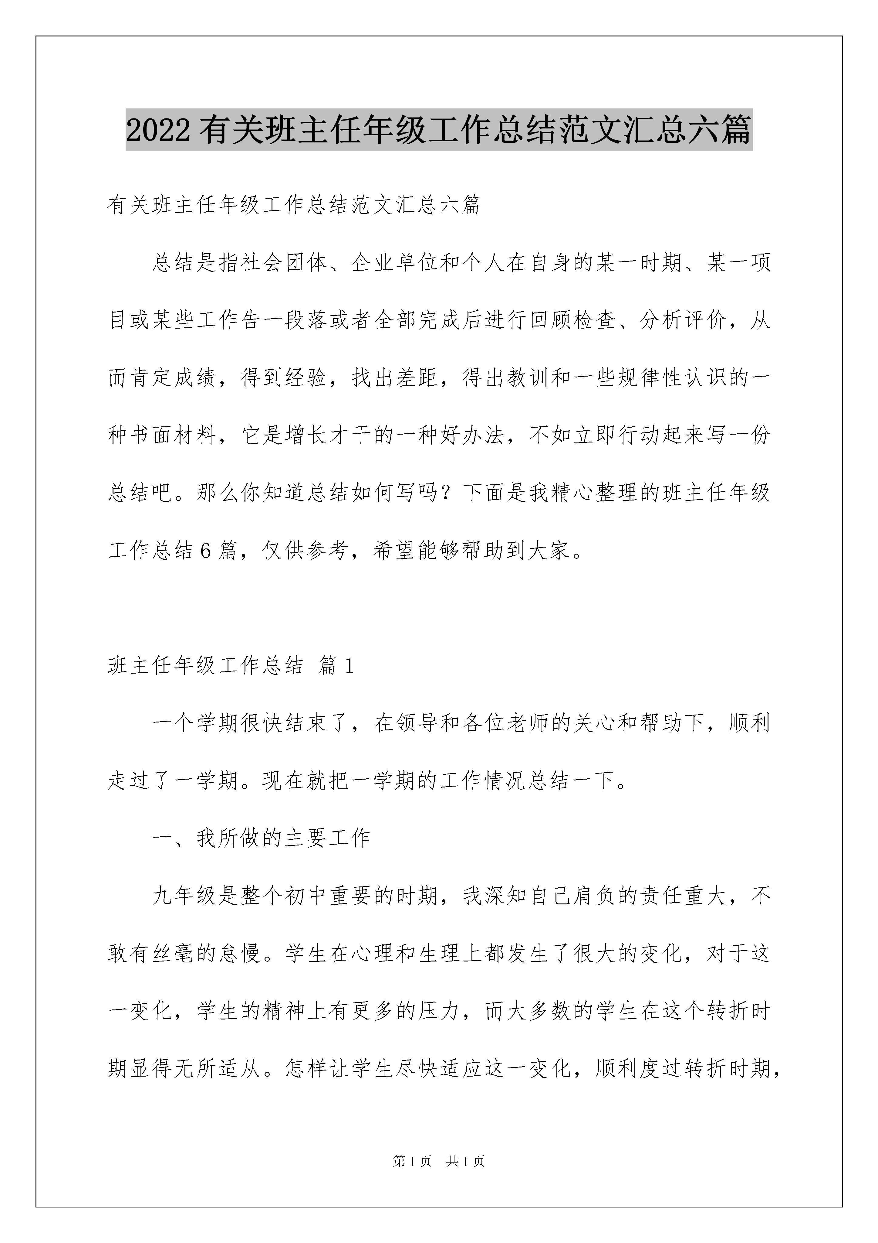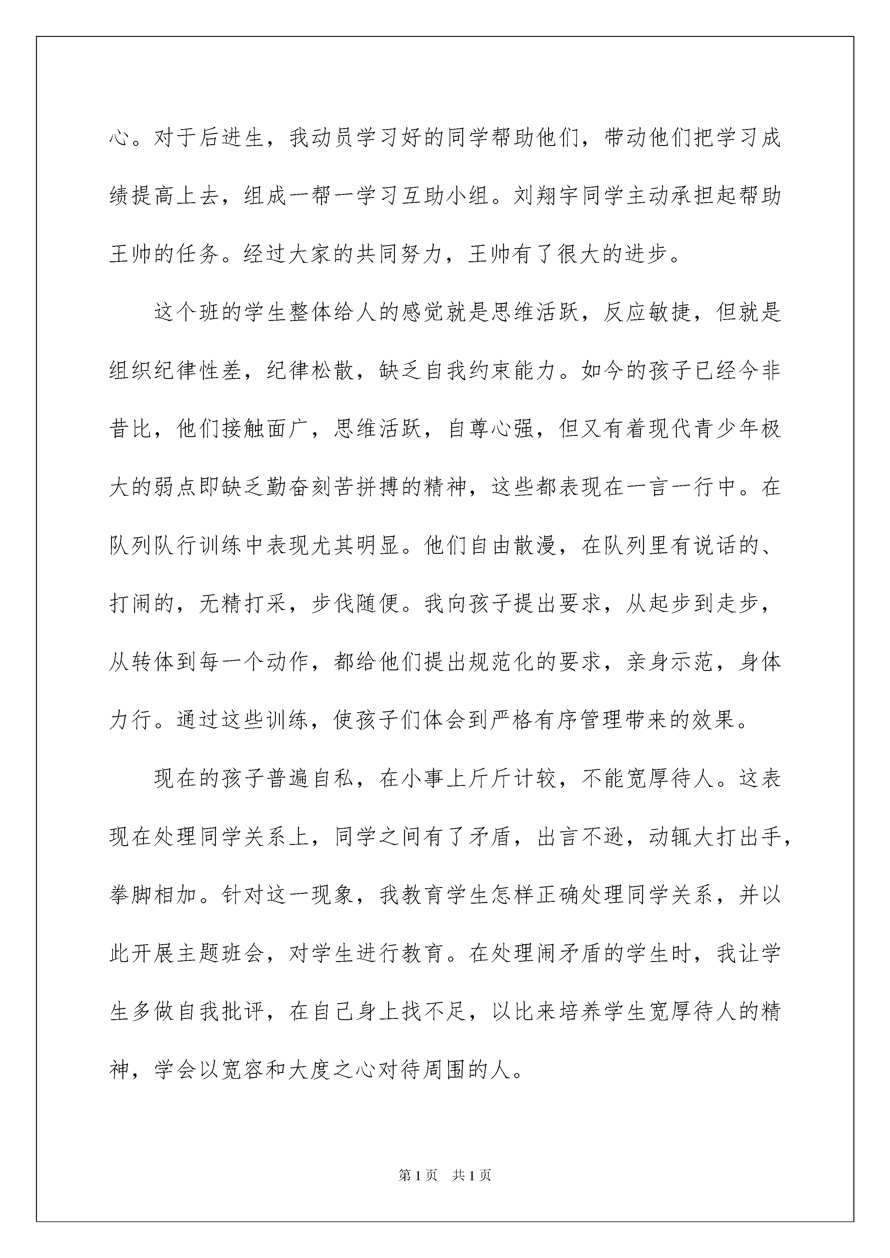 2022有关班主任年级工作总结范文汇总六篇有关班主任年级工作总结范文汇总六篇总结是指社会团体、企业单位和个人在自身的某一时期、某一项目或某些工作告一段落或者全部完成后进行回顾检查、分析评价,从而肯定成绩,得到经验,找出差距,得出教训和一些规律性认识的一种书面材料,它是增长才干的一种好办法,不如立即行动起来写一份总结吧。那么你知道总结如何写吗?下面是我精心整理的班主任年级工作总结6篇,仅供参考,希望能够帮助到大家。班主任年级工作总结篇1一个学期很快结束了,在领导和各位老师的关心和帮助下,顺利走过了一学期。现在就把一学期的工作情况总结一下。一、我所做的主要工作九年级是整个初中重要的时期,我深知自己肩负的责任重大,不敢有丝毫的怠慢。学生在心理和生理上都发生了很大的变化,对于这一变化,学生的精神上有更多的压力,而大多数的学生在这个转折时期显得无所适从。怎样让学生尽快适应这一变化,顺利度过转折时期,这是摆在我眼前的首要任务。我当班主任力争做到两点:一是尊重每一个学生,满足学生尊重的需要,承认的需要,情感的需要,努力克服固执己见,偏激的思维方式,尊重学生个性发展,为孩子的成长创造一个愉快的心理运动空间;二是善待每一个学生,用真诚的爱心对待每一个孩子。对于优等生,不掩饰他们的缺点,积极引导他们扬长改过,努力使其达到卓越。我班的张周同学各方面表现相当不错,是一个品学兼优的学生,但就是缺乏胆量,上课时很少积极发言。针对这一点,我找她谈心,帮她找原因并鼓励她大胆发言。在我上课时,有意找她回答问题,并适当给以鼓励,锻炼她的胆量。通过这样的锻炼取得了一定效。对于后进生,不歧视他们,善于发现他们身上的闪光点,激励他们一步一步自我完善。我班的王帅同学学习很差,上课不注意听讲,作业经常不交,课上、课下纪律不能保证,是典型的后进生。对于这样的孩子如果只是批评、指责,他的自信心肯定会越来越少,甚至还会自暴自弃。我发现他的足球踢得不错,于是就鼓励他,如果你在学习上能象踢球那么专注,你的学习成绩一定会取得大进步。对于他身上的每一点进步,我都及时发现,并且及时予以鼓励,培养他的自信心。对于后进生,我动员学习好的同学帮助他们,带动他们把学习成绩提高上去,组成一帮一学习互助小组。刘翔宇同学主动承担起帮助王帅的任务。经过大家的共同努力,王帅有了很大的进步。这个班的学生整体给人的感觉就是思维活跃,反应敏捷,但就是组织纪律性差,纪律松散,缺乏自我约束能力。如今的孩子已经今非昔比,他们接触面广,思维活跃,自尊心强,但又有着现代青少年极大的弱点即缺乏勤奋刻苦拼搏的精神,这些都表现在一言一行中。在队列队行训练中表现尤其明显。他们自由散漫,在队列里有说话的、打闹的,无精打采,步伐随便。我向孩子提出要求,从起步到走步,从转体到每一个动作,都给他们提出规范化的要求,亲身示范,身体力行。通过这些训练,使孩子们体会到严格有序管理带来的效果。现在的孩子普遍自私,在小事上斤斤计较,不能宽厚待人。这表现在处理同学关系上,同学之间有了矛盾,出言不逊,动辄大打出手,拳脚相加。针对这一现象,我教育学生怎样正确处理同学关系,并以此开展主题班会,对学生进行教育。在处理闹矛盾的学生时,我让学生多做自我批评,在自己身上找不足,以比来培养学生宽厚待人的精神,学会以宽容和大度之心对待周围的人。劳动更培育学生德育思想品质的机会。现在的孩子一提起劳动就有厌烦心理,这些独生子女平时干活的机会很少,养成了懒惰的习惯。首先必须得教会学生怎样干活,从扫地到拖地,从擦玻璃到擦墙围子,我都示范指导并严格检查,及时表扬做得好的同学,批评做的不认真和逃跑的同学,让孩子们知道老师不仅在意他们的学习更注重他们的人品。二、主要收获和体会我觉得当班主任应该做到以下几点:1、把微笑送给学生很多人在提到教师时,总会与“严肃”、“不苟言笑”联系在一起。其实,“微笑”的力量才是无穷的。每天给学生灿烂的微笑,会让学生的身心感到愉快,智能得到发展。中国有句谚语:“谁也说不清哪块云彩会下雨。”而我却相信我的每块“云彩”都会“下雨”。因为,我拥有一种特殊的教育手段——微笑。我们班有个学生,刚开始每天的作业总是爱拖着不做,因此考试成绩总是不如人意。怎么办呢?训一通吧,不行!我试着寻找他的优点,结果发现他这个人还真有不少优点:比如,爱劳动,每次教室里的饮用水一吃完,他总是自告奋勇地去总务处把水给换来了。另外他非常懂礼貌,每次见了老师总会笑嘻嘻地打招呼。于是只要一发现他做了好事,我便在晨会课上表扬他,然后在课后再悄悄地微笑着问他:“作业好了吗?要抓紧一点哟!”他总是边红着脸边搔着头对我说:“还有一点点了。”我
