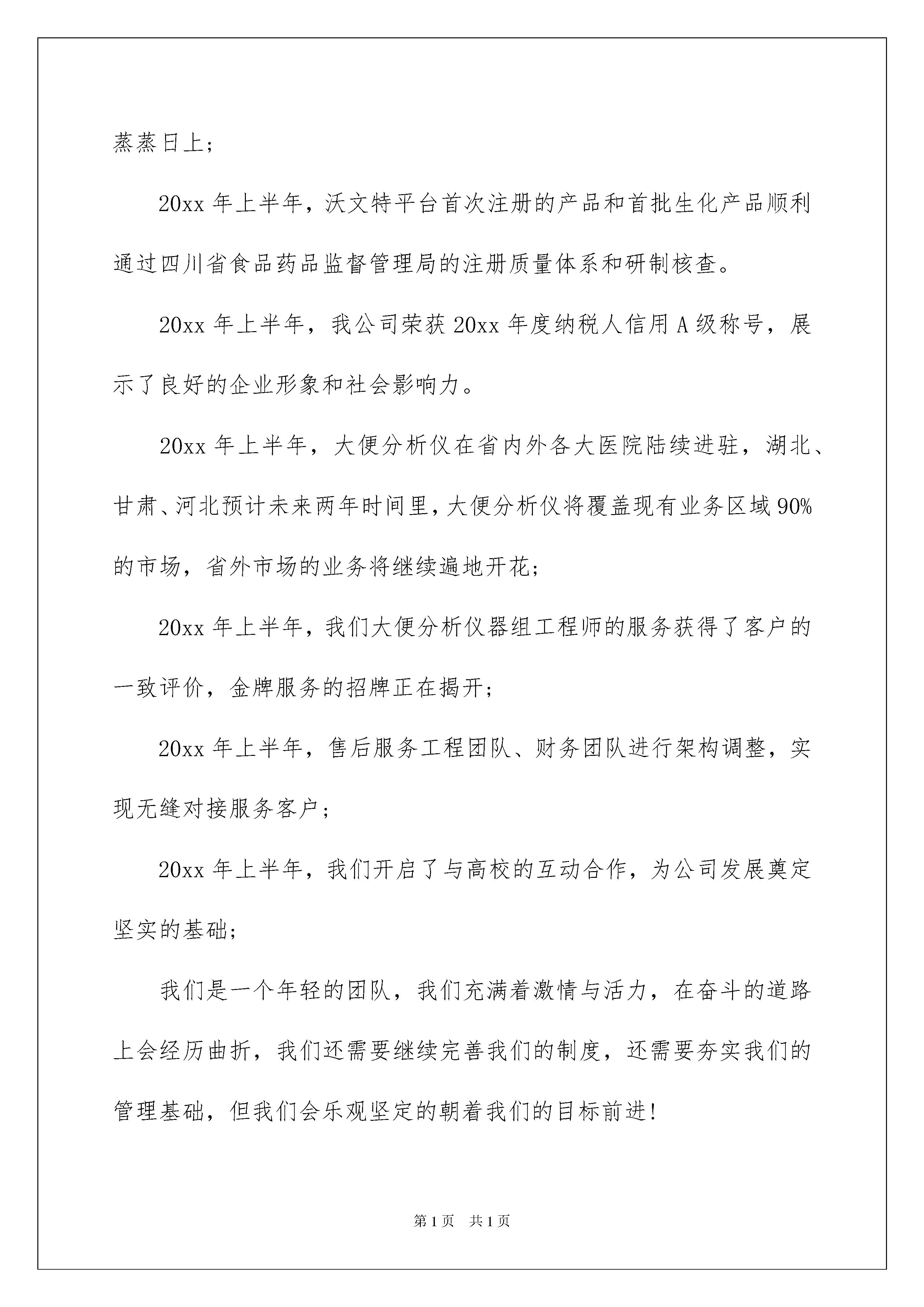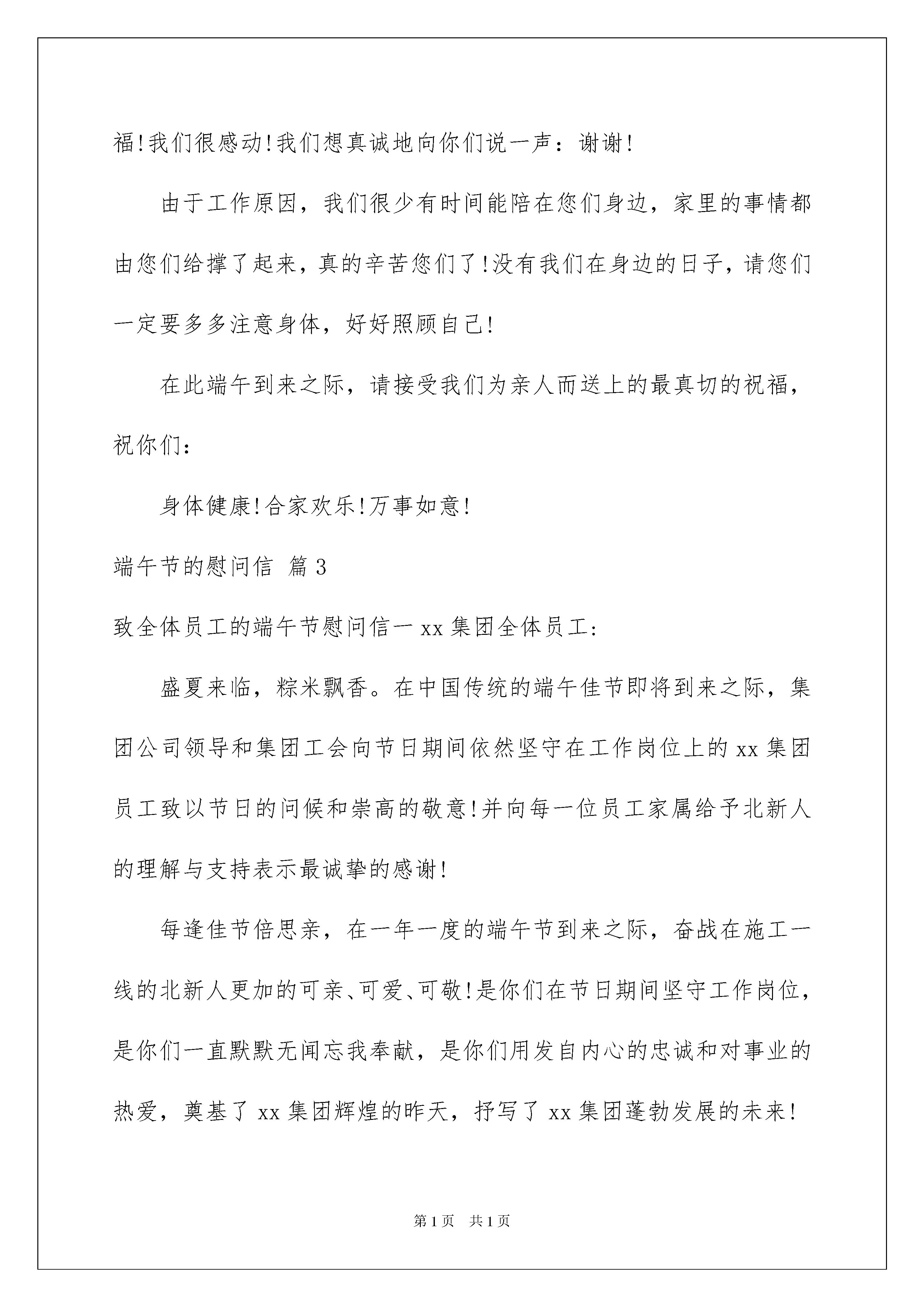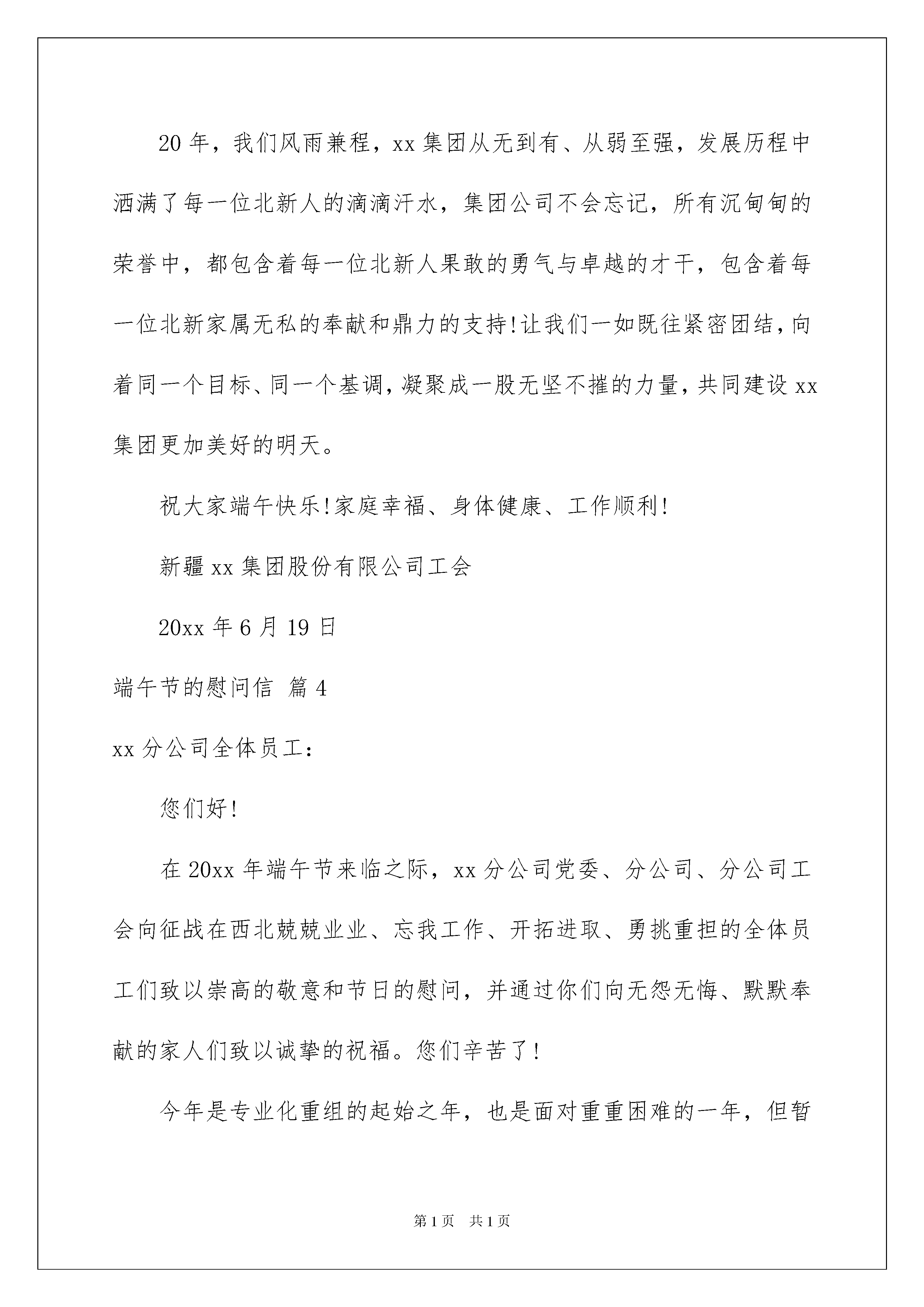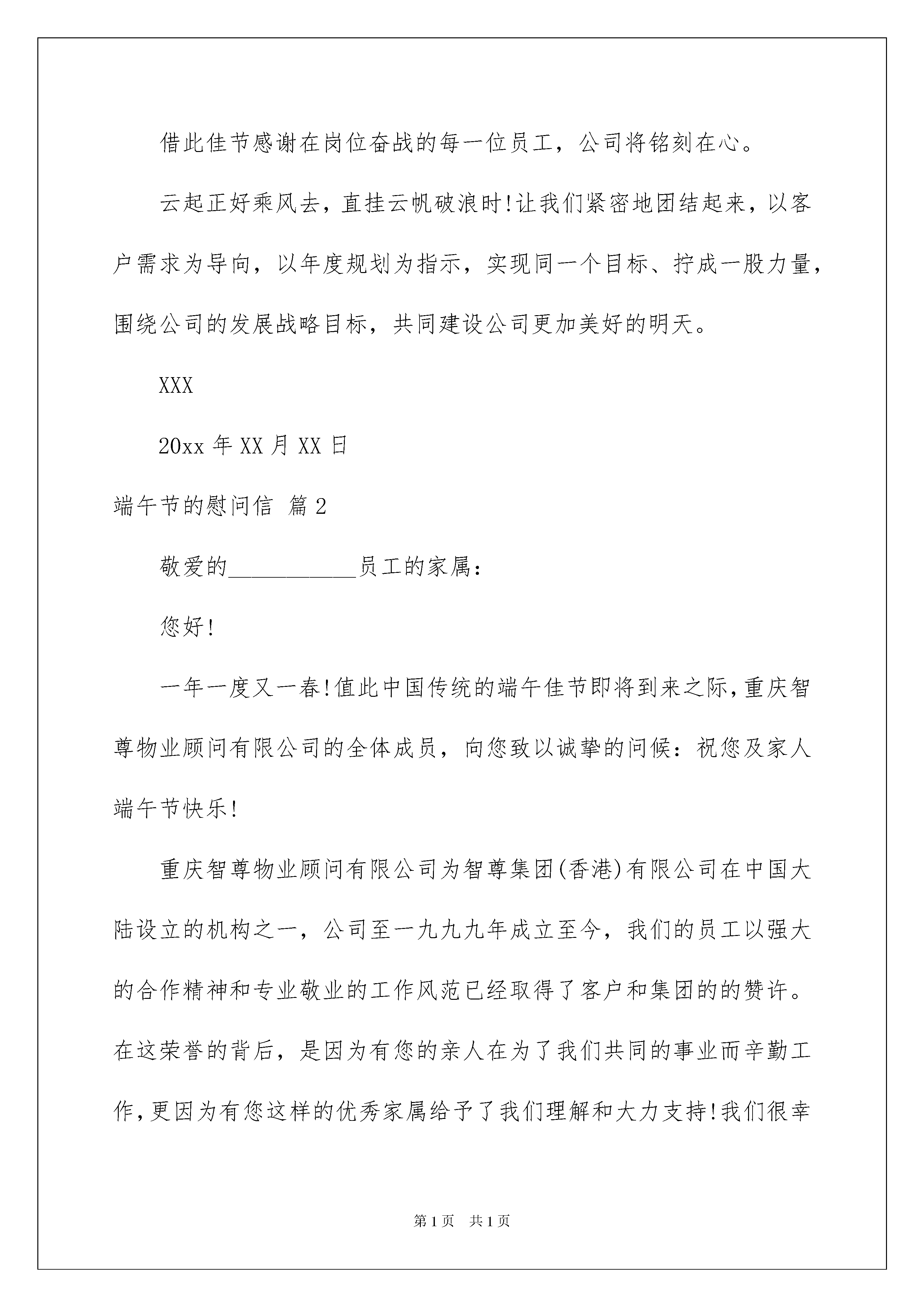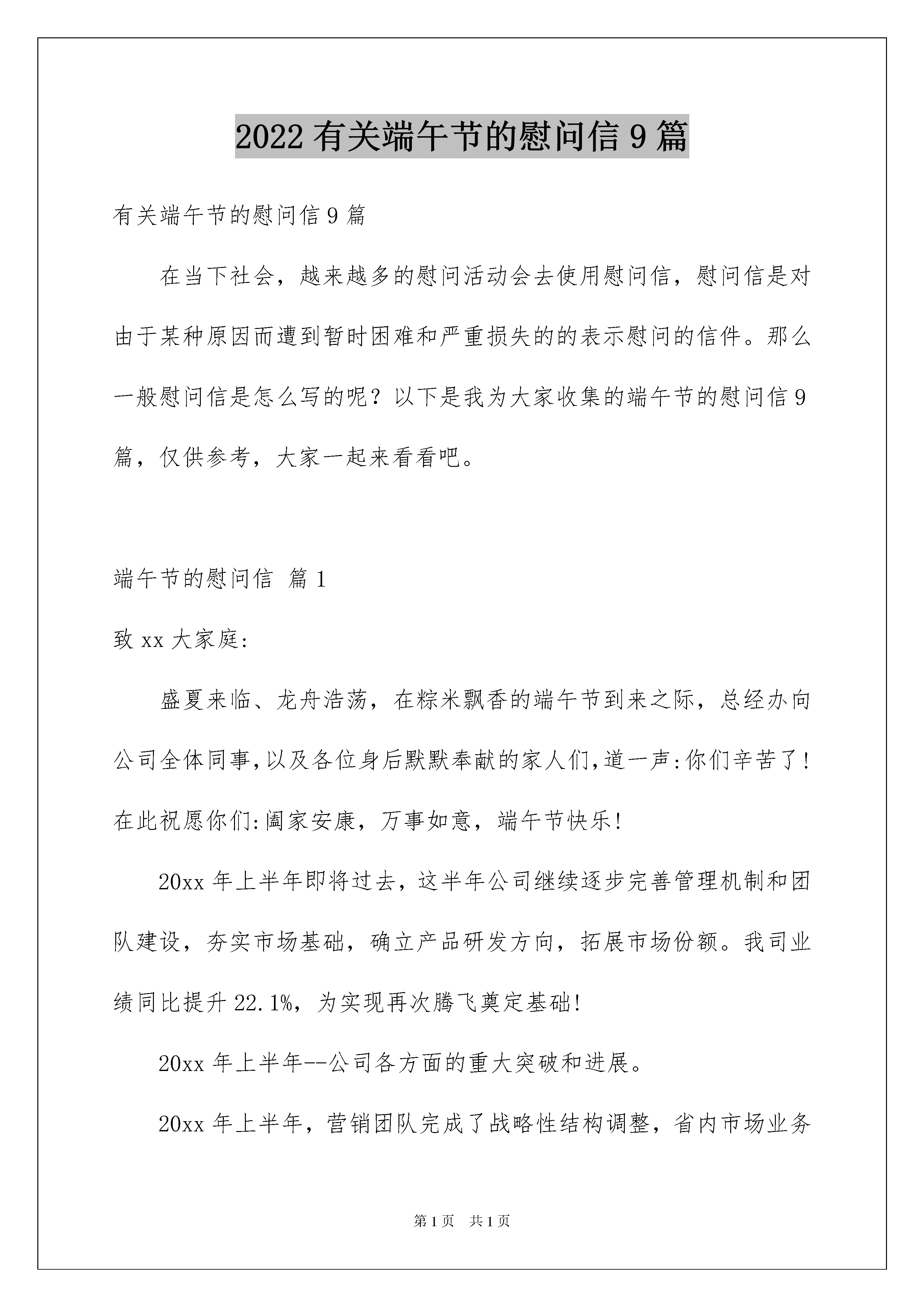 2022有关端午节的慰问信9篇有关端午节的慰问信9篇在当下社会,越来越多的慰问活动会去使用慰问信,慰问信是对由于某种原因而遭到暂时困难和严重损失的的表示慰问的信件。那么一般慰问信是怎么写的呢?以下是我为大家收集的端午节的慰问信9篇,仅供参考,大家一起来看看吧。端午节的慰问信篇1致xx大家庭:盛夏来临、龙舟浩荡,在粽米飘香的端午节到来之际,总经办向公司全体同事,以及各位身后默默奉献的家人们,道一声:你们辛苦了!在此祝愿你们:阖家安康,万事如意,端午节快乐!20xx年上半年即将过去,这半年公司继续逐步完善管理机制和团队建设,夯实市场基础,确立产品研发方向,拓展市场份额。我司业绩同比提升22.1%,为实现再次腾飞奠定基础!20xx年上半年--公司各方面的重大突破和进展。20xx年上半年,营销团队完成了战略性结构调整,省内市场业务蒸蒸日上;20xx年上半年,沃文特平台首次注册的产品和首批生化产品顺利通过四川省食品药品监督管理局的注册质量体系和研制核查。20xx年上半年,我公司荣获20xx年度纳税人信用A级称号,展示了良好的企业形象和社会影响力。20xx年上半年,大便分析仪在省内外各大医院陆续进驻,湖北、甘肃、河北预计未来两年时间里,大便分析仪将覆盖现有业务区域90%的市场,省外市场的业务将继续遍地开花;20xx年上半年,我们大便分析仪器组工程师的服务获得了客户的一致评价,金牌服务的招牌正在揭开;20xx年上半年,售后服务工程团队、财务团队进行架构调整,实现无缝对接服务客户;20xx年上半年,我们开启了与高校的互动合作,为公司发展奠定坚实的基础;我们是一个年轻的团队,我们充满着激情与活力,在奋斗的道路上会经历曲折,我们还需要继续完善我们的制度,还需要夯实我们的管理基础,但我们会乐观坚定的朝着我们的目标前进!借此佳节感谢在岗位奋战的每一位员工,公司将铭刻在心。云起正好乘风去,直挂云帆破浪时!让我们紧密地团结起来,以客户需求为导向,以年度规划为指示,实现同一个目标、拧成一股力量,围绕公司的发展战略目标,共同建设公司更加美好的明天。XXX20xx年XX月XX日端午节的慰问信篇2敬爱的___________员工的家属:您好!一年一度又一春!值此中国传统的端午佳节即将到来之际,重庆智尊物业顾问有限公司的全体成员,向您致以诚挚的问候:祝您及家人端午节快乐!重庆智尊物业顾问有限公司为智尊集团(香港)有限公司在中国大陆设立的机构之一,公司至一九九九年成立至今,我们的员工以强大的合作精神和专业敬业的工作风范已经取得了客户和集团的的赞许。在这荣誉的背后,是因为有您的亲人在为了我们共同的事业而辛勤工作,更因为有您这样的优秀家属给予了我们理解和大力支持!我们很幸福!我们很感动!我们想真诚地向你们说一声:谢谢!由于工作原因,我们很少有时间能陪在您们身边,家里的事情都由您们给撑了起来,真的辛苦您们了!没有我们在身边的日子,请您们一定要多多注意身体,好好照顾自己!在此端午到来之际,请接受我们为亲人而送上的最真切的祝福,祝你们:身体健康!合家欢乐!万事如意!端午节的慰问信篇3致全体员工的端午节慰问信一xx集团全体员工:盛夏来临,粽米飘香。在中国传统的端午佳节即将到来之际,集团公司领导和集团工会向节日期间依然坚守在工作岗位上的xx集团员工致以节日的问候和崇高的敬意!并向每一位员工家属给予北新人的理解与支持表示最诚挚的感谢!每逢佳节倍思亲,在一年一度的端午节到来之际,奋战在施工一线的北新人更加的可亲、可爱、可敬!是你们在节日期间坚守工作岗位,是你们一直默默无闻忘我奉献,是你们用发自内心的忠诚和对事业的热爱,奠基了xx集团辉煌的昨天,抒写了xx集团蓬勃发展的未来!20年,我们风雨兼程,xx集团从无到有、从弱至强,发展历程中洒满了每一位北新人的滴滴汗水,集团公司不会忘记,所有沉甸甸的荣誉中,都包含着每一位北新人果敢的勇气与卓越的才干,包含着每一位北新家属无私的奉献和鼎力的支持!让我们一如既往紧密团结,向着同一个目标、同一个基调,凝聚成一股无坚不摧的力量,共同建设xx集团更加美好的明天。祝大家端午快乐!家庭幸福、身体健康、工作顺利!新疆xx集团股份有限公司工会20xx年6月19日端午节的慰问信篇4xx分公司全体员工:您们好!在20xx年端午节来临之际,xx分公司党委、分公司、分公司工会向征战在西北兢兢业业、忘我工作、开拓进取、勇挑重担的全体员工们致以崇高的敬意和节日的慰问,并通过你们向无怨无悔、默默奉献的家人们致以诚挚的祝福。您们辛苦了!今年是专业化重组的起始之年,也是面对重重困难的一年,但暂时的困难遮挡不住分公司前进的方