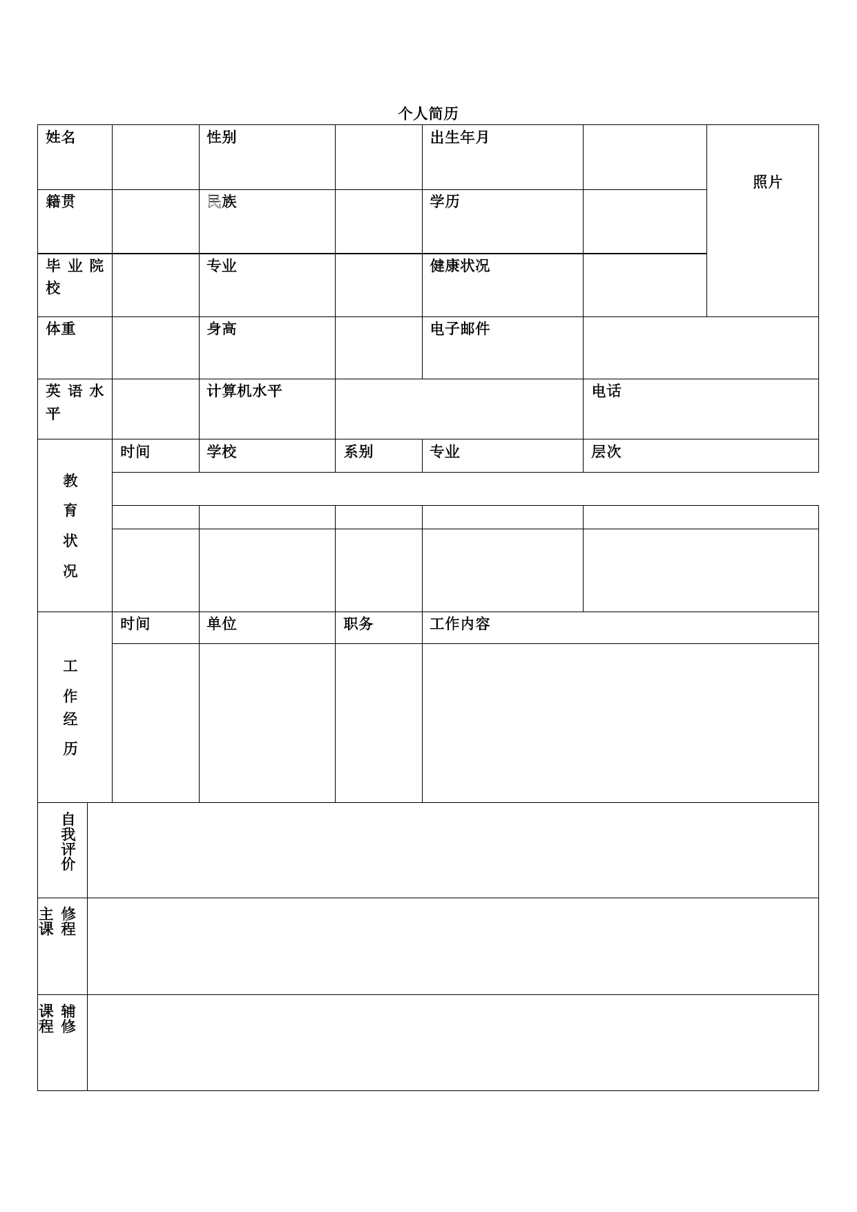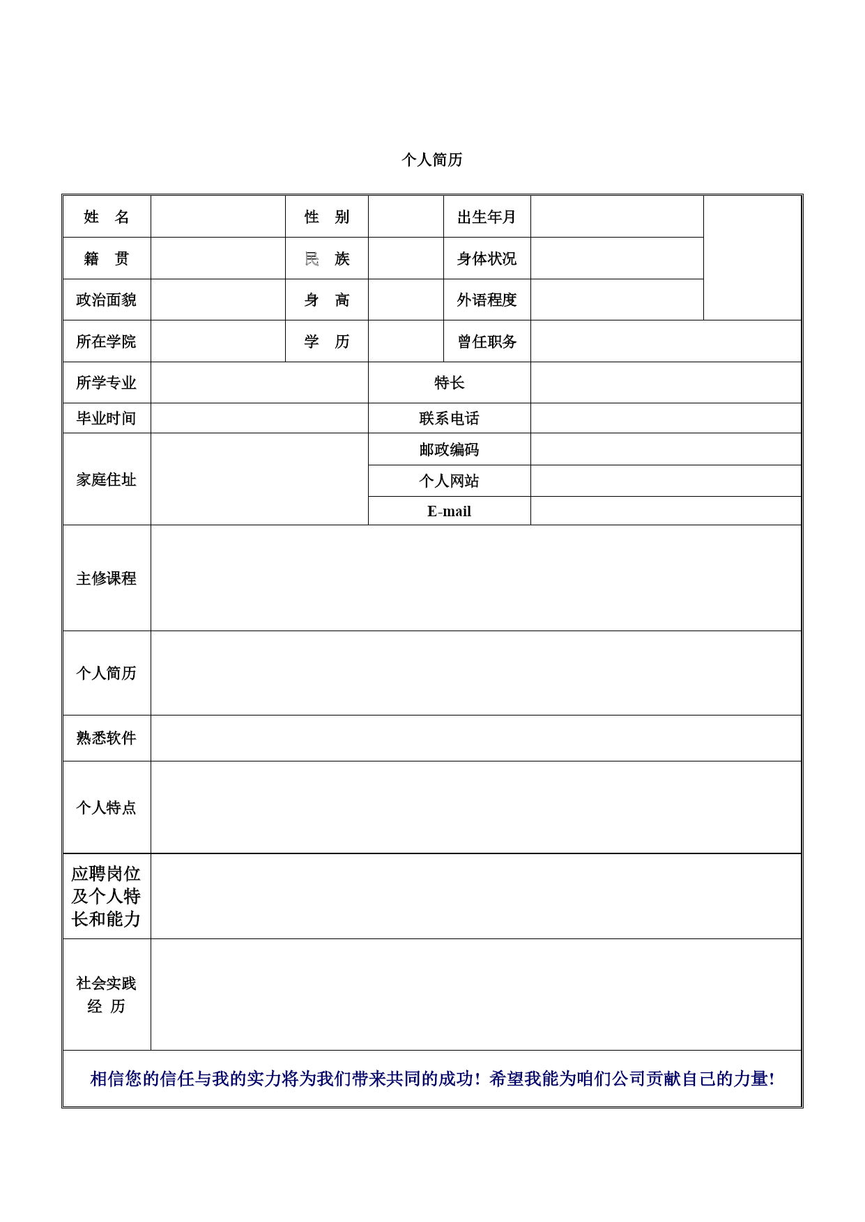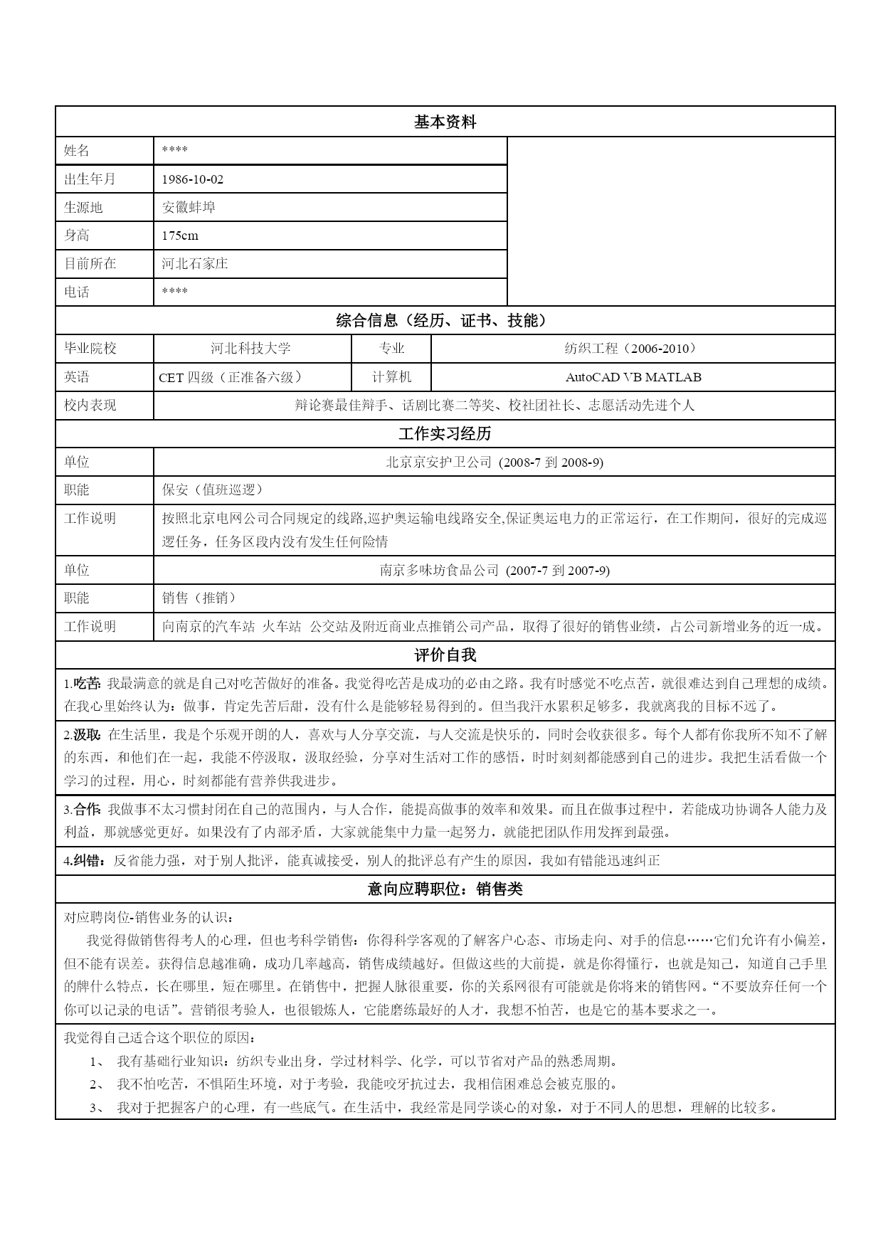 个人简历表 姓名性别出身年月照 片身份证 号码民族政治面貌婚姻 状况健康 状况身高现户口 所在地所学 专业学历最后毕 业学校毕业 时间技术 职称现工作 单位参加工 作时间现从事 专业 主 要 简 历起止年月在何单位(学校)任何职务 自身业务 专长 及在校 学习 成果 通讯地址邮政编码联系电话Email地址 个人简历学院照 片专业姓名性别民族出生年月 籍贯身高学历政治面貌就业意向兴趣爱好个人说明家庭地址住宿地址 联系电话手机任职情况本 人 简 历时间学校任职 奖 惩 情 况 姓名性别出生年月照片籍贯民族学历毕业院校专业健康状况体重身高电子邮件英语水平计算机水平电话 教育状况时间学校系别专业层次工作经历时间单位职务工作内容自我评价修程 主课辅修 课程个人简历 个人简历 姓名性别出生年月籍贯民族身体状况政治面貌身高外语程度所在学院学历曾任职务所学专业特长毕业时间联系电话家庭住址邮政编码个人网站E-mail主修课程个人简历熟悉软件个人特点应聘岗位及个人特长和能力社会实践 经历相信您的信任与我的实力将为我们带来共同的成功!希望我能为咱们公司贡献自己的力量! 基本资料姓名****出生年月1986-10-02生源地安徽蚌埠身高175cm目前所在河北石家庄电话****综合信息(经历、证书、技能)毕业院校河北科技大学专业纺织工程(2006-2010)英语CET四级(正准备六级)计算机AutoCADVBMATLAB校内表现辩论赛最佳辩手、话剧比赛二等奖、校社团社长、志愿活动先进个人工作实习经历单位北京京安护卫公司(2008-7到2008-9)职能保安(值班巡逻)工作说明按照北京电网公司合同规定的线路,巡护奥运输电线路安全,保证奥运电力的正常运行,在工作期间,很好的完成巡逻任务,任务区段内没有发生任何险情单位南京多味坊食品公司(2007-7到2007-9)职能销售(推销)工作说明向南京的汽车站火车站公交站及附近商业点推销公司产品,取得了很好的销售业绩,占公司新增业务的近一成。评价自我1.吃苦:我最满意的就是自己对吃苦做好的准备。我觉得吃苦是成功的必由之路。我有时感觉不吃点苦,就很难达到自己理想的成绩。在我心里始终认为:做事,肯定先苦后甜,没有什么是能够轻易得到的。但当我汗水累积足够多,我就离我的目标不远了。2.汲取:在生活里,我是个乐观开朗的人,喜欢与人分享交流,与人交流是快乐的,同时会收获很多。每个人都有你我所不知不了解的东西,和他们在一起,我能不停汲取,汲取经验,分享对生活对工作的感悟,时时刻刻都能感到自己的进步。我把生活看做一个学习的过程,用心,时刻都能有营养供我进步。3.合作:我做事不太习惯封闭在自己的范围内,与人合作,能提高做事的效率和效果。而且在做事过程中,若能成功协调各人能力及利益,那就感觉更好。如果没有了内部矛盾,大家就能集中力量一起努力,就能把团队作用发挥到最强。4.纠错:反省能力强,对于别人批评,能真诚接受,别人的批评总有产生的原因,我如有错能迅速纠正意向应聘职位:销售类对应聘岗位-销售业务的认识: 我觉得做销售得考人的心理,但也考科学销售:你得科学客观的了解客户心态、市场走向、对手的信息……它们允许有小偏差,但不能有误差。获得信息越准确,成功几率越高,销售成绩越好。但做这些的大前提,就是你得懂行,也就是知己,知道自己手里的牌什么特点,长在哪里,短在哪里。在销售中,把握人脉很重要,你的关系网很有可能就是你将来的销售网。“不要放弃任何一个你可以记录的电话”。营销很考验人,也很锻炼人,它能磨练最好的人才,我想不怕苦,也是它的基本要求之一。我觉得自己适合这个职位的原因: 我有基础行业知识:纺织专业出身,学过材料学、化学,可以节省对产品的熟悉周期。 我不怕吃苦,不惧陌生环境,对于考验,我能咬牙抗过去,我相信困难总会被克服的。 我对于把握客户的心理,有一些底气。在生活中,我经常是同学谈心的对象,对于不同人的思想,理解的比较多。 姓名:_____________________________ E_mail:_____________________________ 联系电话:_____________________________ 联系地址:_____________________________ 个人概况: 姓名:________________ 性别:________ 出生年月:____年__月__日健康状况:___________ 毕业院校:_______________专业:____________________ 电子邮件:_______________手机:____________________ 联系