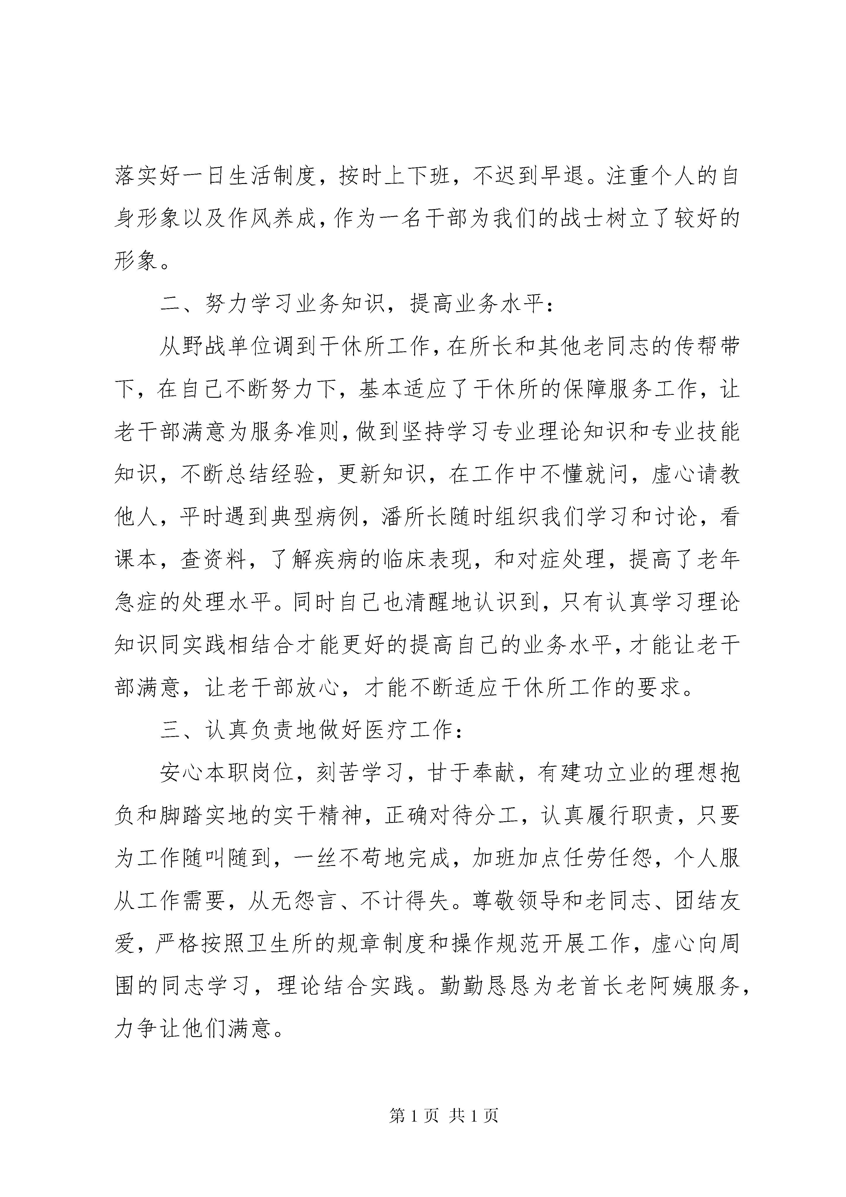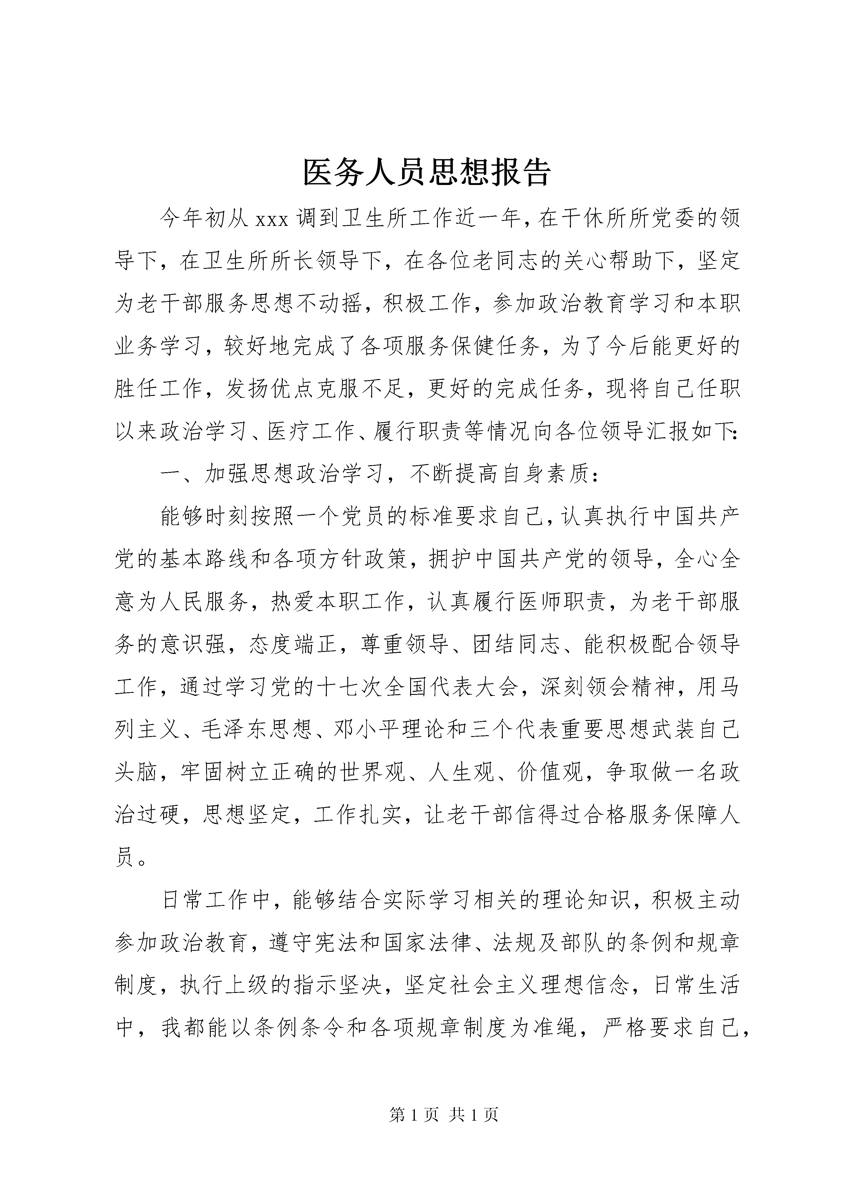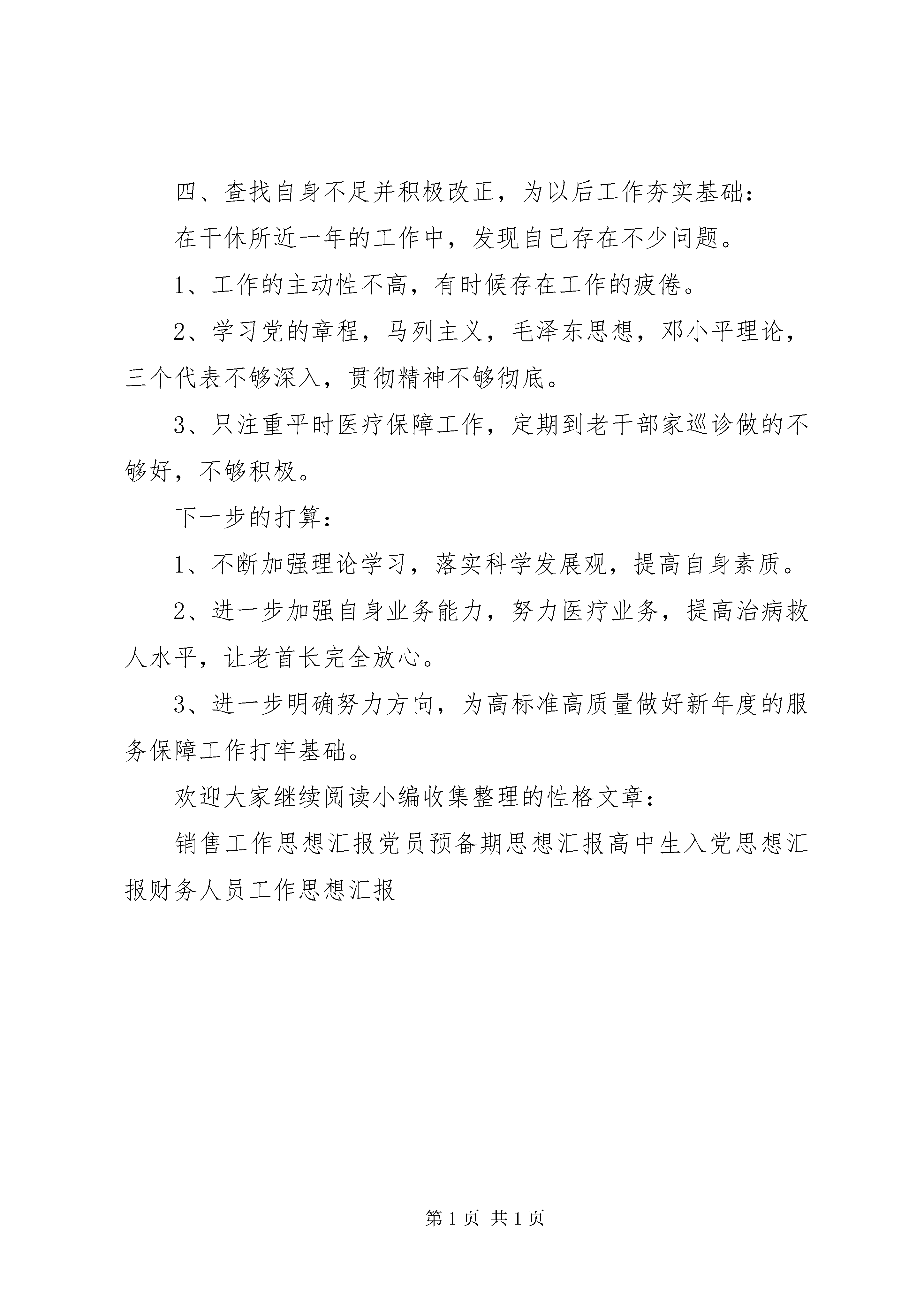 医务人员思想报告今年初从xxx调到卫生所工作近一年,在干休所所党委的领导下,在卫生所所长领导下,在各位老同志的关心帮助下,坚定为老干部服务思想不动摇,积极工作,参加政治教育学习和本职业务学习,较好地完成了各项服务保健任务,为了今后能更好的胜任工作,发扬优点克服不足,更好的完成任务,现将自己任职以来政治学习、医疗工作、履行职责等情况向各位领导汇报如下:一、加强思想政治学习,不断提高自身素质:能够时刻按照一个党员的标准要求自己,认真执行中国共产党的基本路线和各项方针政策,拥护中国共产党的领导,全心全意为人民服务,热爱本职工作,认真履行医师职责,为老干部服务的意识强,态度端正,尊重领导、团结同志、能积极配合领导工作,通过学习党的十七次全国代表大会,深刻领会精神,用马列主义、毛泽东思想、邓小平理论和三个代表重要思想武装自己头脑,牢固树立正确的世界观、人生观、价值观,争取做一名政治过硬,思想坚定,工作扎实,让老干部信得过合格服务保障人员。日常工作中,能够结合实际学习相关的理论知识,积极主动参加政治教育,遵守宪法和国家法律、法规及部队的条例和规章制度,执行上级的指示坚决,坚定社会主义理想信念,日常生活中,我都能以条例条令和各项规章制度为准绳,严格要求自己,落实好一日生活制度,按时上下班,不迟到早退。注重个人的自身形象以及作风养成,作为一名干部为我们的战士树立了较好的形象。二、努力学习业务知识,提高业务水平:从野战单位调到干休所工作,在所长和其他老同志的传帮带下,在自己不断努力下,基本适应了干休所的保障服务工作,让老干部满意为服务准则,做到坚持学习专业理论知识和专业技能知识,不断总结经验,更新知识,在工作中不懂就问,虚心请教他人,平时遇到典型病例,潘所长随时组织我们学习和讨论,看课本,查资料,了解疾病的临床表现,和对症处理,提高了老年急症的处理水平。同时自己也清醒地认识到,只有认真学习理论知识同实践相结合才能更好的提高自己的业务水平,才能让老干部满意,让老干部放心,才能不断适应干休所工作的要求。三、认真负责地做好医疗工作:安心本职岗位,刻苦学习,甘于奉献,有建功立业的理想抱负和脚踏实地的实干精神,正确对待分工,认真履行职责,只要为工作随叫随到,一丝不苟地完成,加班加点任劳任怨,个人服从工作需要,从无怨言、不计得失。尊敬领导和老同志、团结友爱,严格按照卫生所的规章制度和操作规范开展工作,虚心向周围的同志学习,理论结合实践。勤勤恳恳为老首长老阿姨服务,力争让他们满意。四、查找自身不足并积极改正,为以后工作夯实基础:在干休所近一年的工作中,发现自己存在不少问题。1、工作的主动性不高,有时候存在工作的疲倦。2、学习党的章程,马列主义,毛泽东思想,邓小平理论,三个代表不够深入,贯彻精神不够彻底。3、只注重平时医疗保障工作,定期到老干部家巡诊做的不够好,不够积极。下一步的打算:1、不断加强理论学习,落实科学发展观,提高自身素质。2、进一步加强自身业务能力,努力医疗业务,提高治病救人水平,让老首长完全放心。3、进一步明确努力方向,为高标准高质量做好新年度的服务保障工作打牢基础。欢迎大家继续阅读小编收集整理的性格文章:销售工作思想汇报党员预备期思想汇报高中生入党思想汇报财务人员工作思想汇报