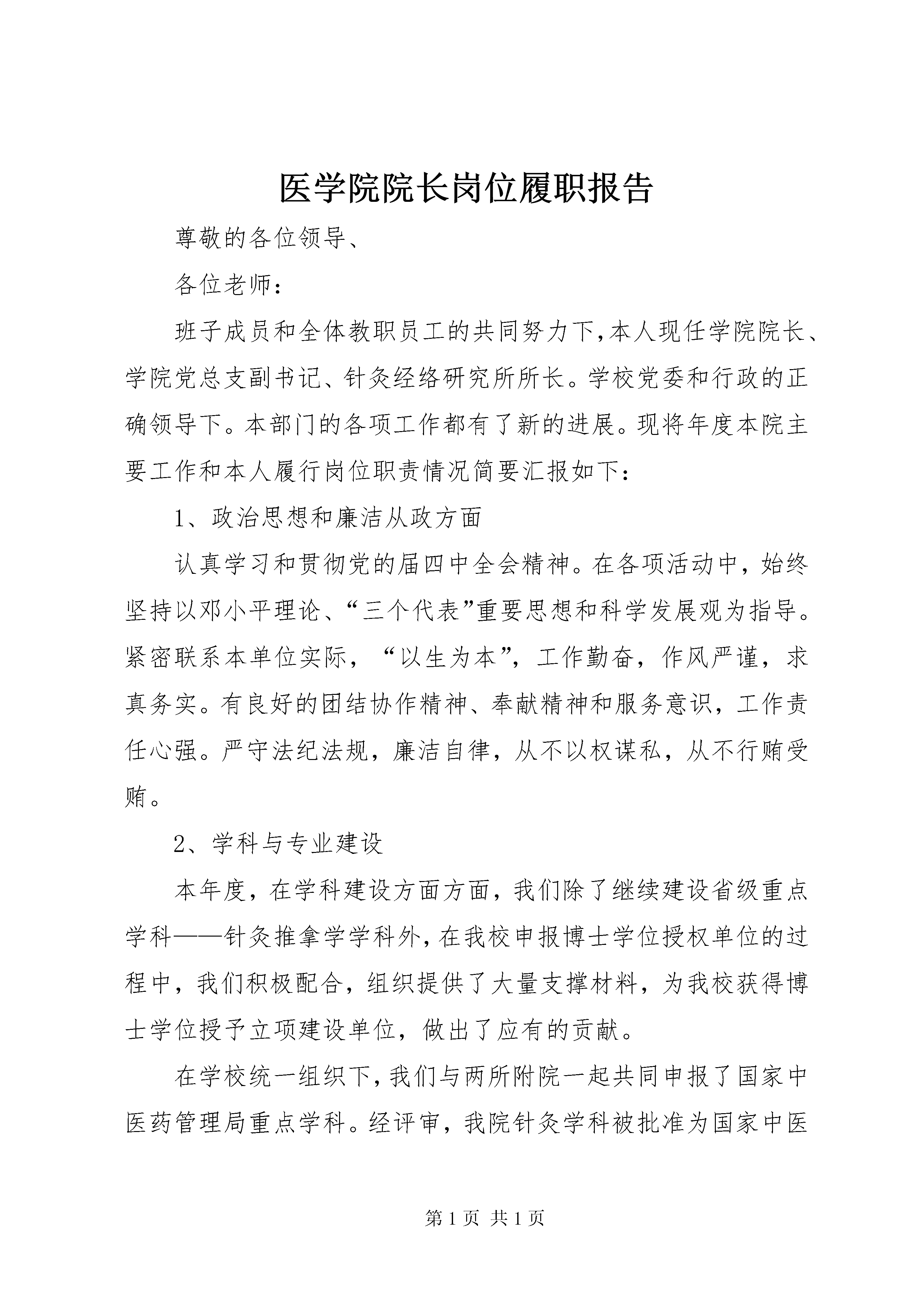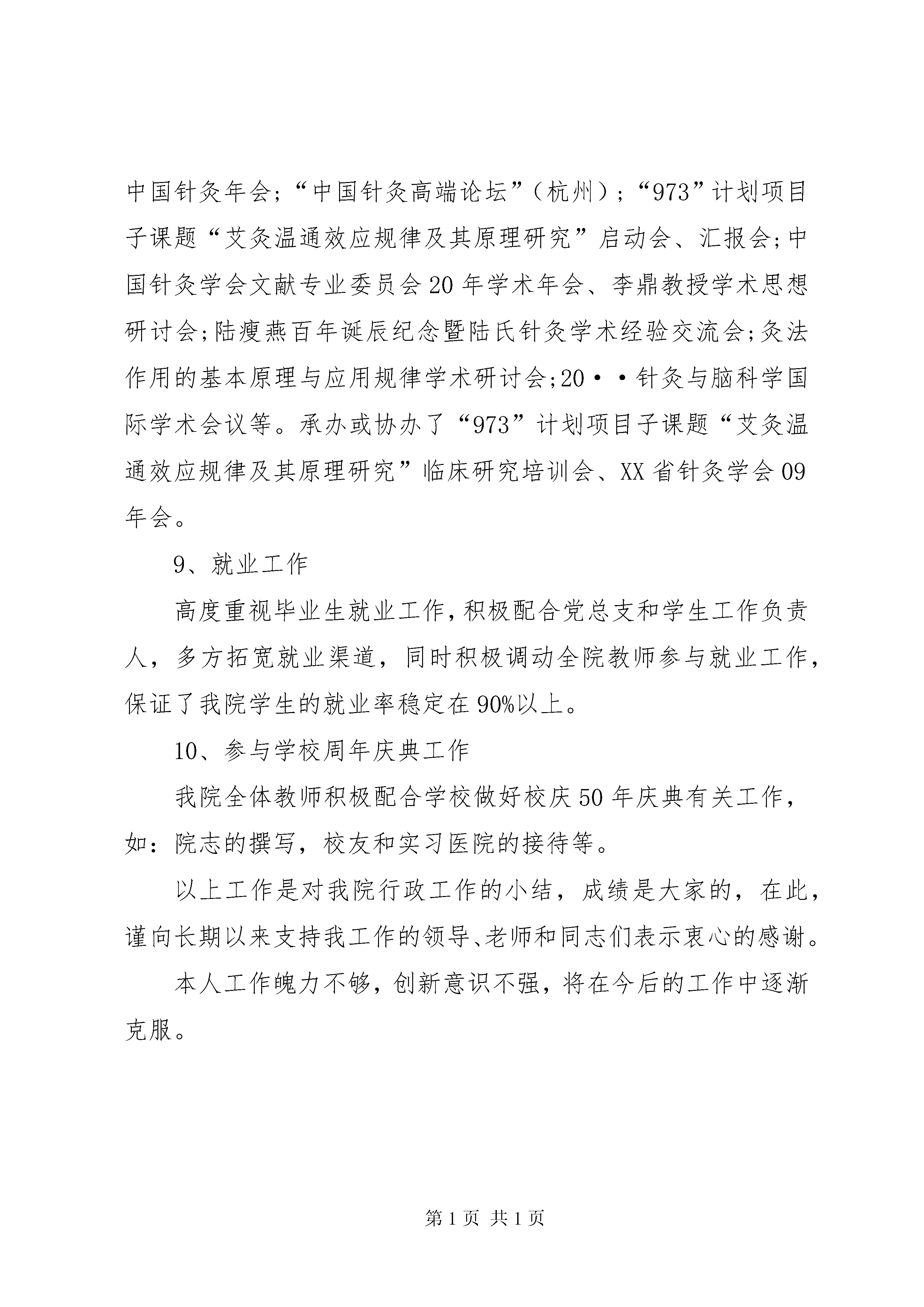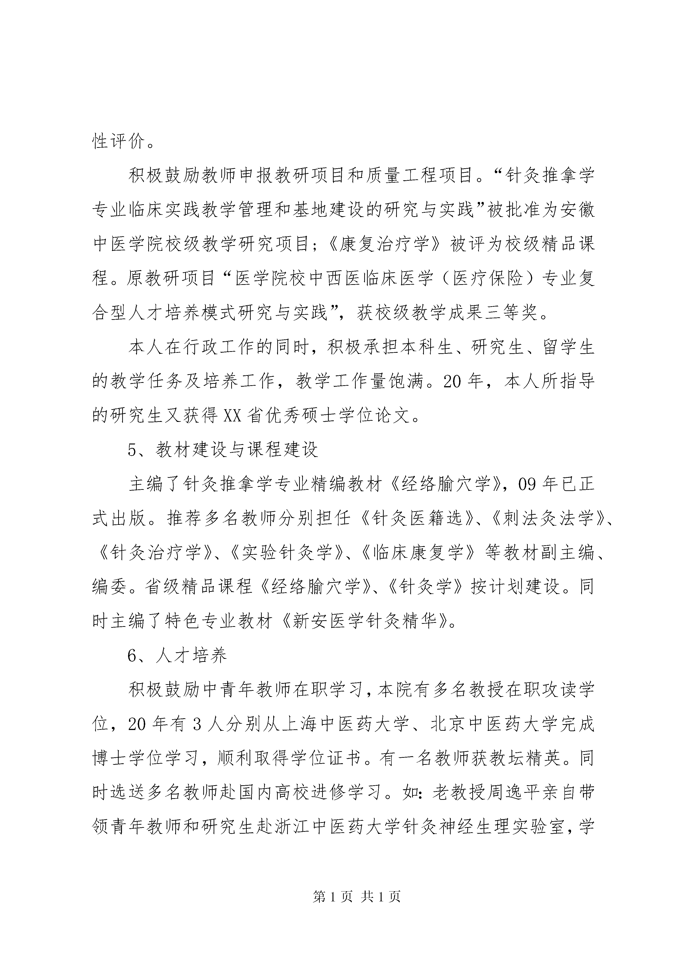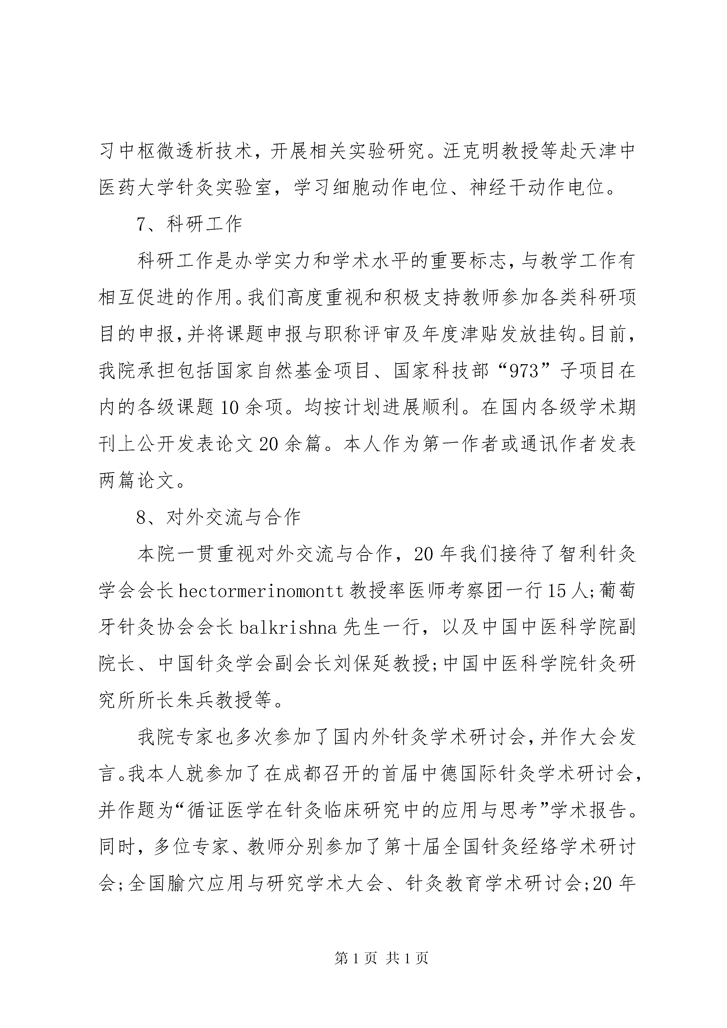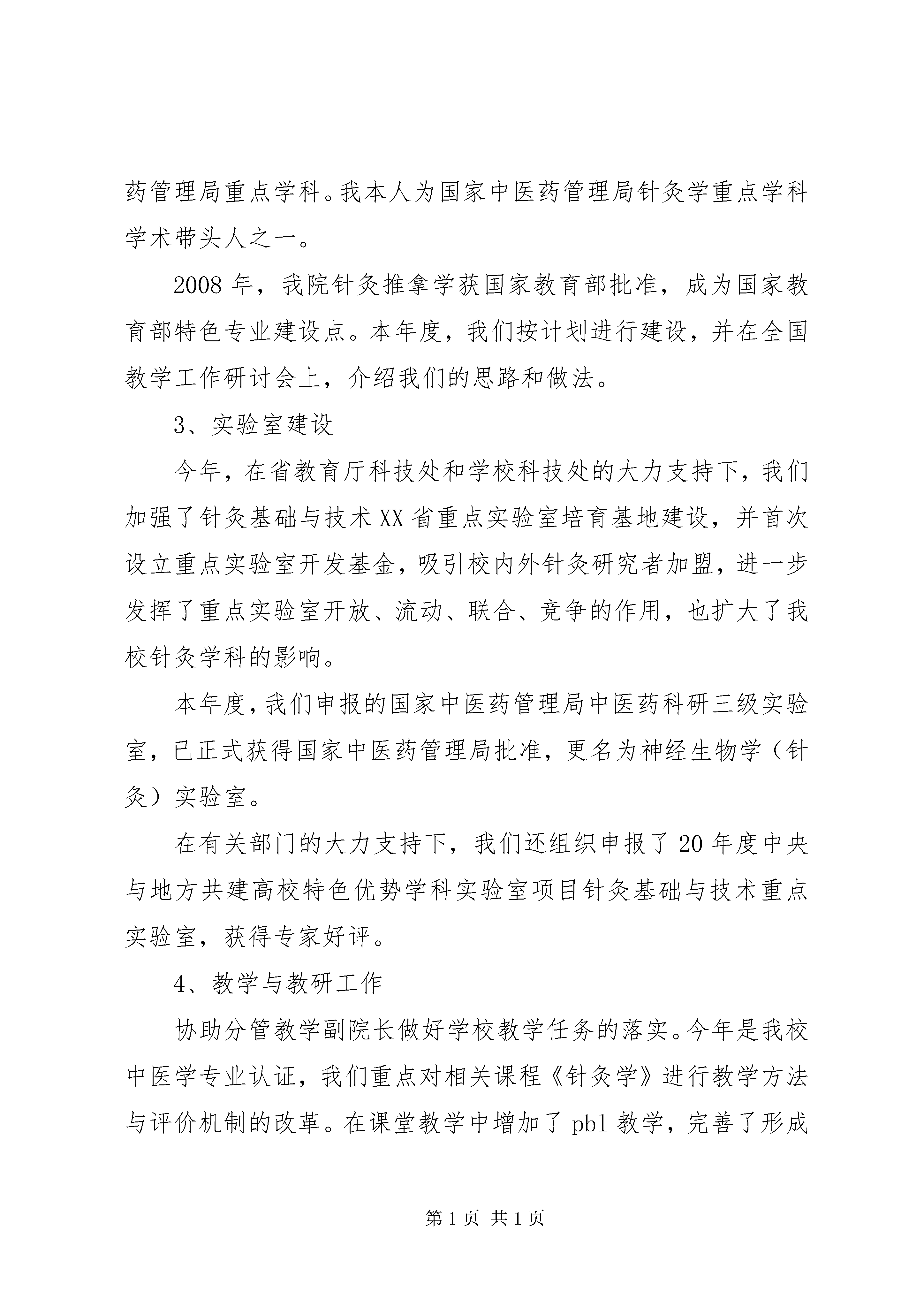 医学院院长岗位履职报告尊敬的各位领导、各位老师:班子成员和全体教职员工的共同努力下,本人现任学院院长、学院党总支副书记、针灸经络研究所所长。学校党委和行政的正确领导下。本部门的各项工作都有了新的进展。现将年度本院主要工作和本人履行岗位职责情况简要汇报如下:1、政治思想和廉洁从政方面认真学习和贯彻党的届四中全会精神。在各项活动中,始终坚持以邓小平理论、“三个代表”重要思想和科学发展观为指导。紧密联系本单位实际,“以生为本”,工作勤奋,作风严谨,求真务实。有良好的团结协作精神、奉献精神和服务意识,工作责任心强。严守法纪法规,廉洁自律,从不以权谋私,从不行贿受贿。2、学科与专业建设本年度,在学科建设方面方面,我们除了继续建设省级重点学科——针灸推拿学学科外,在我校申报博士学位授权单位的过程中,我们积极配合,组织提供了大量支撑材料,为我校获得博士学位授予立项建设单位,做出了应有的贡献。在学校统一组织下,我们与两所附院一起共同申报了国家中医药管理局重点学科。经评审,我院针灸学科被批准为国家中医药管理局重点学科。我本人为国家中医药管理局针灸学重点学科学术带头人之一。2008年,我院针灸推拿学获国家教育部批准,成为国家教育部特色专业建设点。本年度,我们按计划进行建设,并在全国教学工作研讨会上,介绍我们的思路和做法。3、实验室建设今年,在省教育厅科技处和学校科技处的大力支持下,我们加强了针灸基础与技术XX省重点实验室培育基地建设,并首次设立重点实验室开发基金,吸引校内外针灸研究者加盟,进一步发挥了重点实验室开放、流动、联合、竞争的作用,也扩大了我校针灸学科的影响。本年度,我们申报的国家中医药管理局中医药科研三级实验室,已正式获得国家中医药管理局批准,更名为神经生物学(针灸)实验室。在有关部门的大力支持下,我们还组织申报了20年度中央与地方共建高校特色优势学科实验室项目针灸基础与技术重点实验室,获得专家好评。4、教学与教研工作协助分管教学副院长做好学校教学任务的落实。今年是我校中医学专业认证,我们重点对相关课程《针灸学》进行教学方法与评价机制的改革。在课堂教学中增加了pbl教学,完善了形成性评价。积极鼓励教师申报教研项目和质量工程项目。“针灸推拿学专业临床实践教学管理和基地建设的研究与实践”被批准为安徽中医学院校级教学研究项目;《康复治疗学》被评为校级精品课程。原教研项目“医学院校中西医临床医学(医疗保险)专业复合型人才培养模式研究与实践”,获校级教学成果三等奖。本人在行政工作的同时,积极承担本科生、研究生、留学生的教学任务及培养工作,教学工作量饱满。20年,本人所指导的研究生又获得XX省优秀硕士学位论文。5、教材建设与课程建设主编了针灸推拿学专业精编教材《经络腧穴学》,09年已正式出版。推荐多名教师分别担任《针灸医籍选》、《刺法灸法学》、《针灸治疗学》、《实验针灸学》、《临床康复学》等教材副主编、编委。省级精品课程《经络腧穴学》、《针灸学》按计划建设。同时主编了特色专业教材《新安医学针灸精华》。6、人才培养积极鼓励中青年教师在职学习,本院有多名教授在职攻读学位,20年有3人分别从上海中医药大学、北京中医药大学完成博士学位学习,顺利取得学位证书。有一名教师获教坛精英。同时选送多名教师赴国内高校进修学习。如:老教授周逸平亲自带领青年教师和研究生赴浙江中医药大学针灸神经生理实验室,学习中枢微透析技术,开展相关实验研究。汪克明教授等赴天津中医药大学针灸实验室,学习细胞动作电位、神经干动作电位。7、科研工作科研工作是办学实力和学术水平的重要标志,与教学工作有相互促进的作用。我们高度重视和积极支持教师参加各类科研项目的申报,并将课题申报与职称评审及年度津贴发放挂钩。目前,我院承担包括国家自然基金项目、国家科技部“973”子项目在内的各级课题10余项。均按计划进展顺利。在国内各级学术期刊上公开发表论文20余篇。本人作为第一作者或通讯作者发表两篇论文。8、对外交流与合作本院一贯重视对外交流与合作,20年我们接待了智利针灸学会会长hectormerinomontt教授率医师考察团一行15人;葡萄牙针灸协会会长balkrishna先生一行,以及中国中医科学院副院长、中国针灸学会副会长刘保延教授;中国中医科学院针灸研究所所长朱兵教授等。我院专家也多次参加了国内外针灸学术研讨会,并作大会发言。我本人就参加了在成都召开的首届中德国际针灸学术研讨会,并作题为“循证医学在针灸临床研究中的应用与思考”学术报告。同时,多位专家、教师分别参加了第十届全国针灸经络学术研讨会;全国腧穴应用与研究学术大会、针灸教育学术研讨会;20年中国针灸年会;“中国针灸高端论坛”(杭州);“973”计划项目子课题“艾灸温通效应规律及其原理研究”启动会、汇报会;中国针灸学会