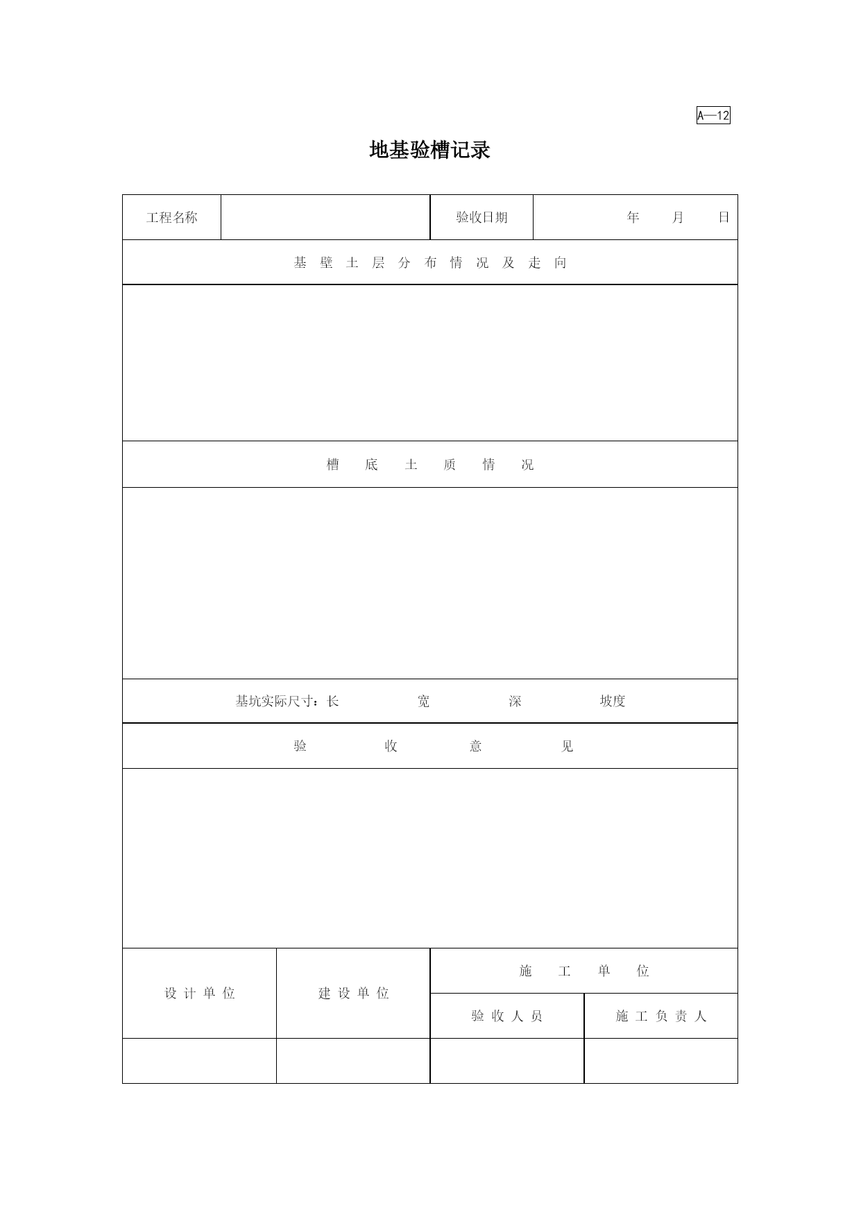 A—12 地基验槽记录 工程名称验收日期年月日基壁土层分布情况及走向槽底土质情况基坑实际尺寸:长宽深坡度验收意见设计单位建设单位施工单位验收人员施工负责人