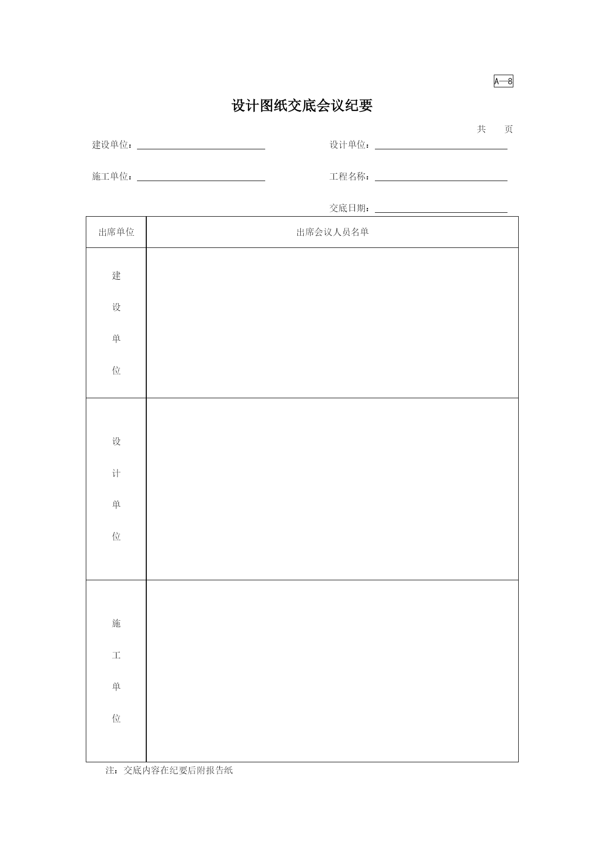 A—8 设计图纸交底会议纪要 共页 建设单位:设计单位: 施工单位:工程名称: 交底日期: 出席单位出席会议人员名单建 设 单 位设 计 单 位施 工 单 位注:交底内容在纪要后附报告纸