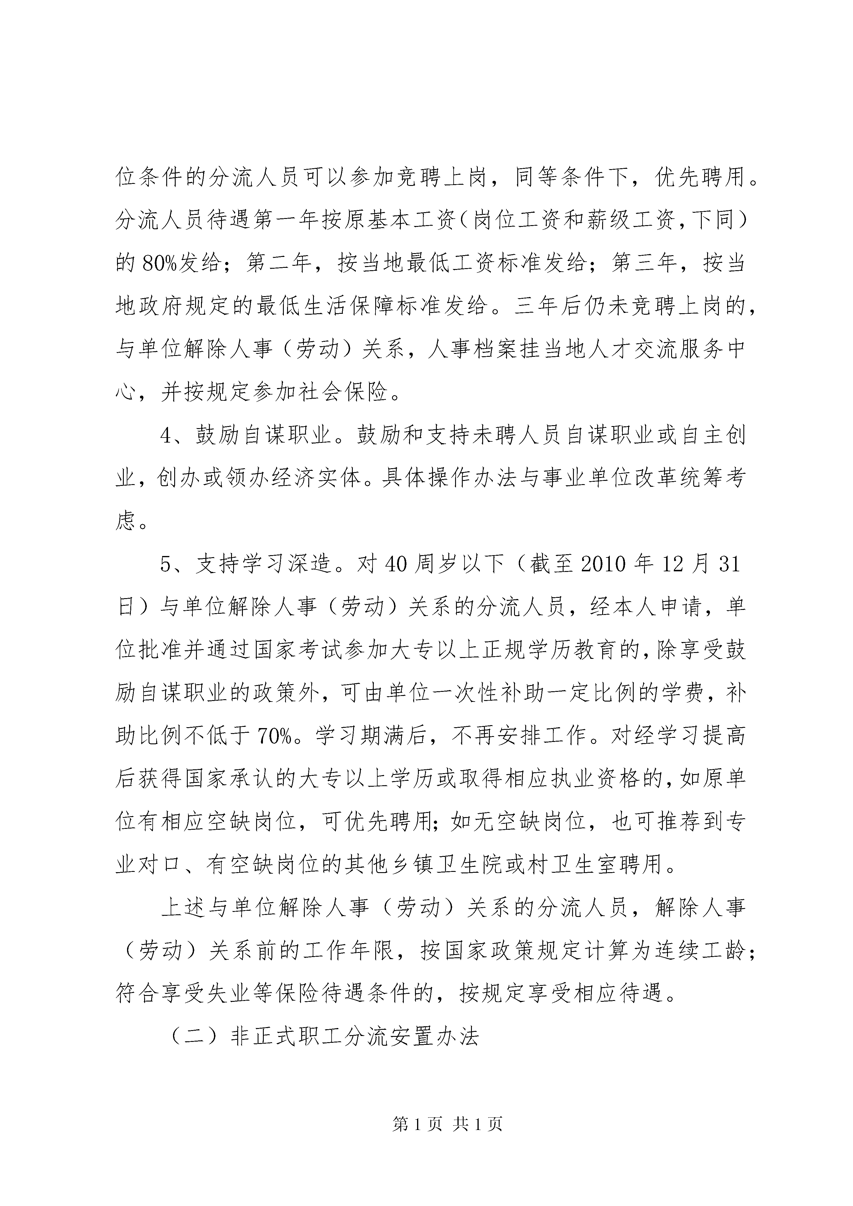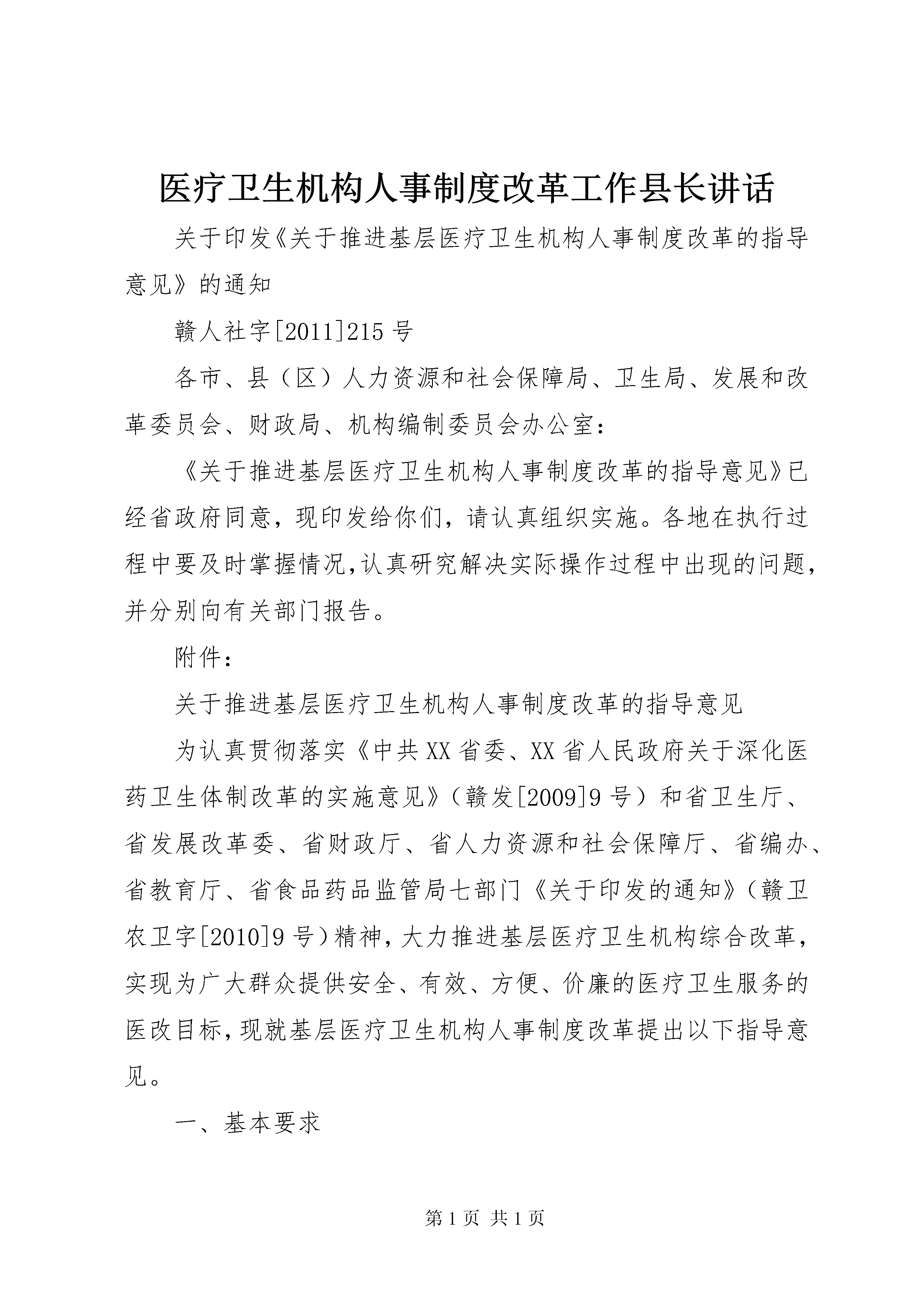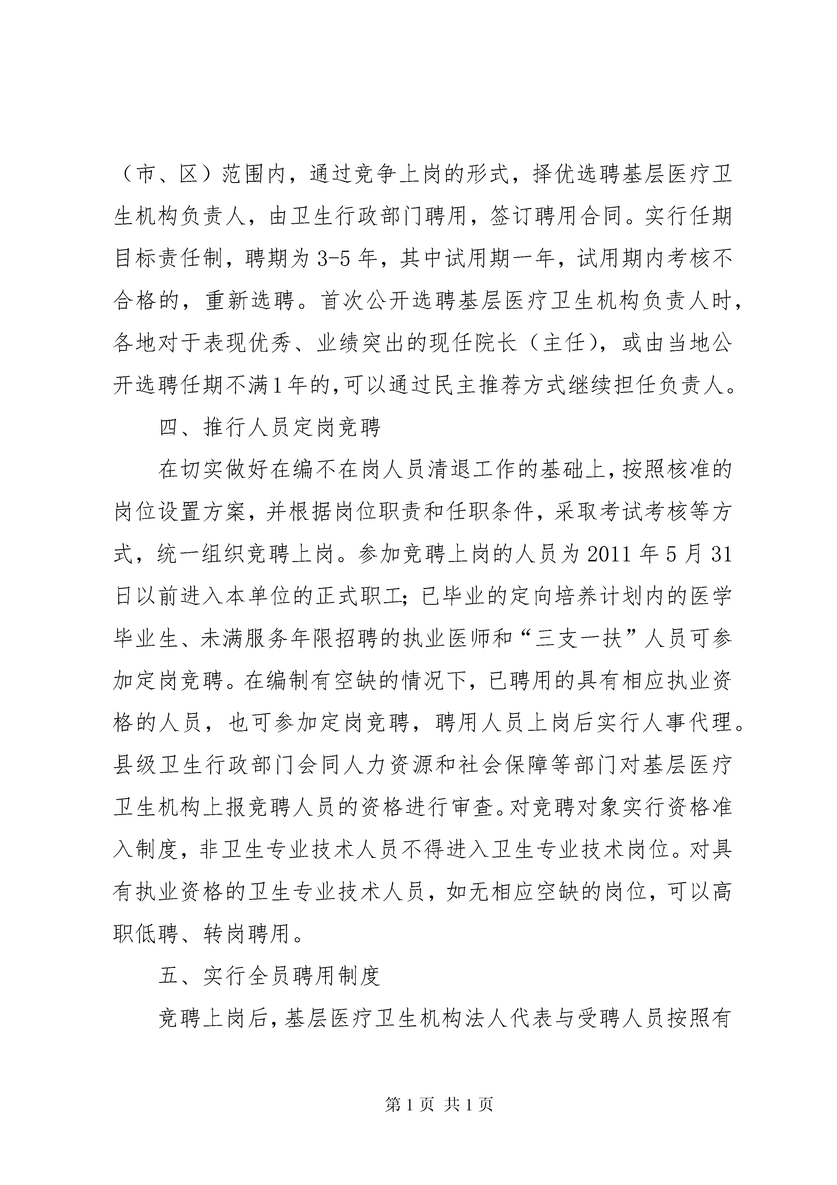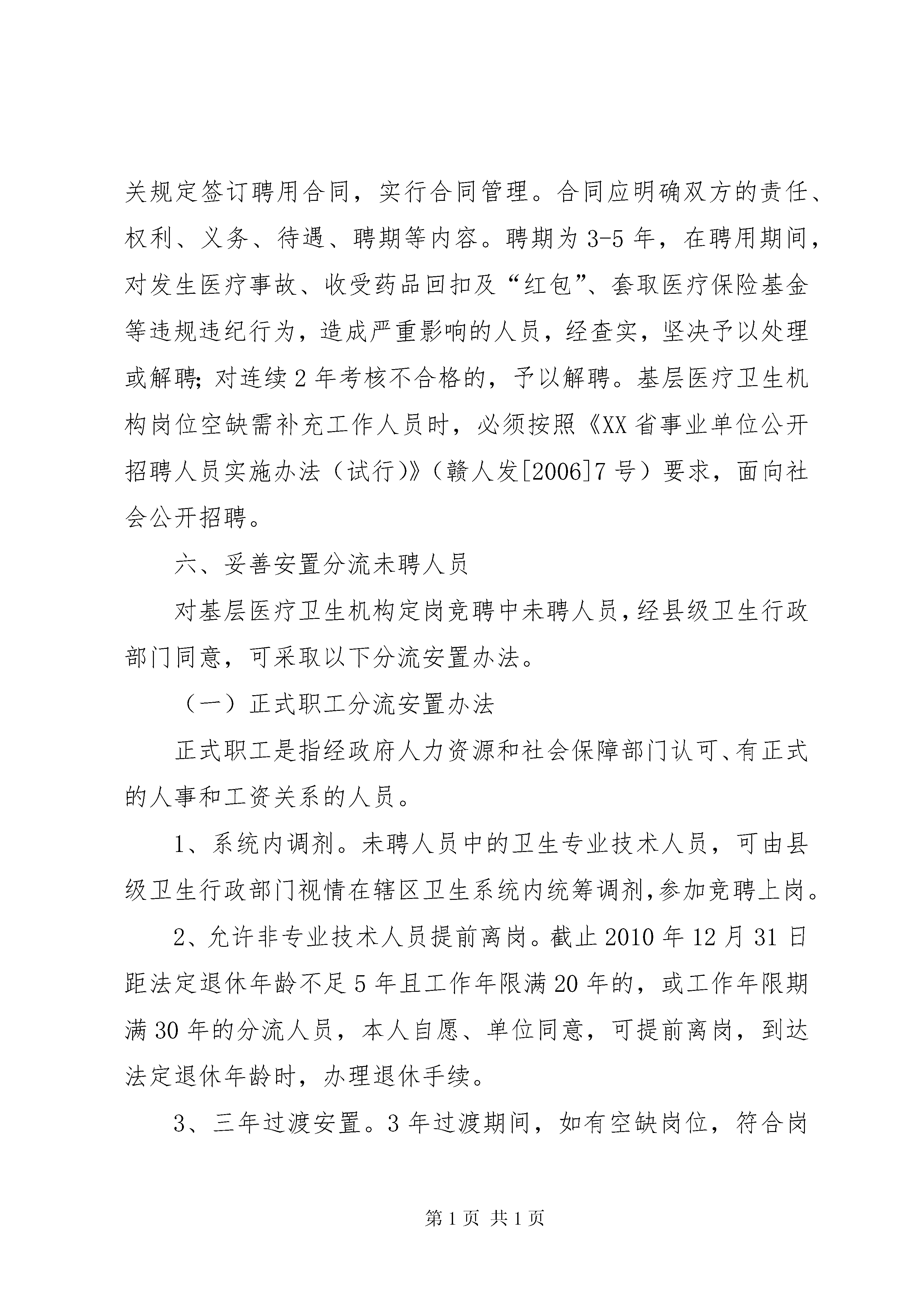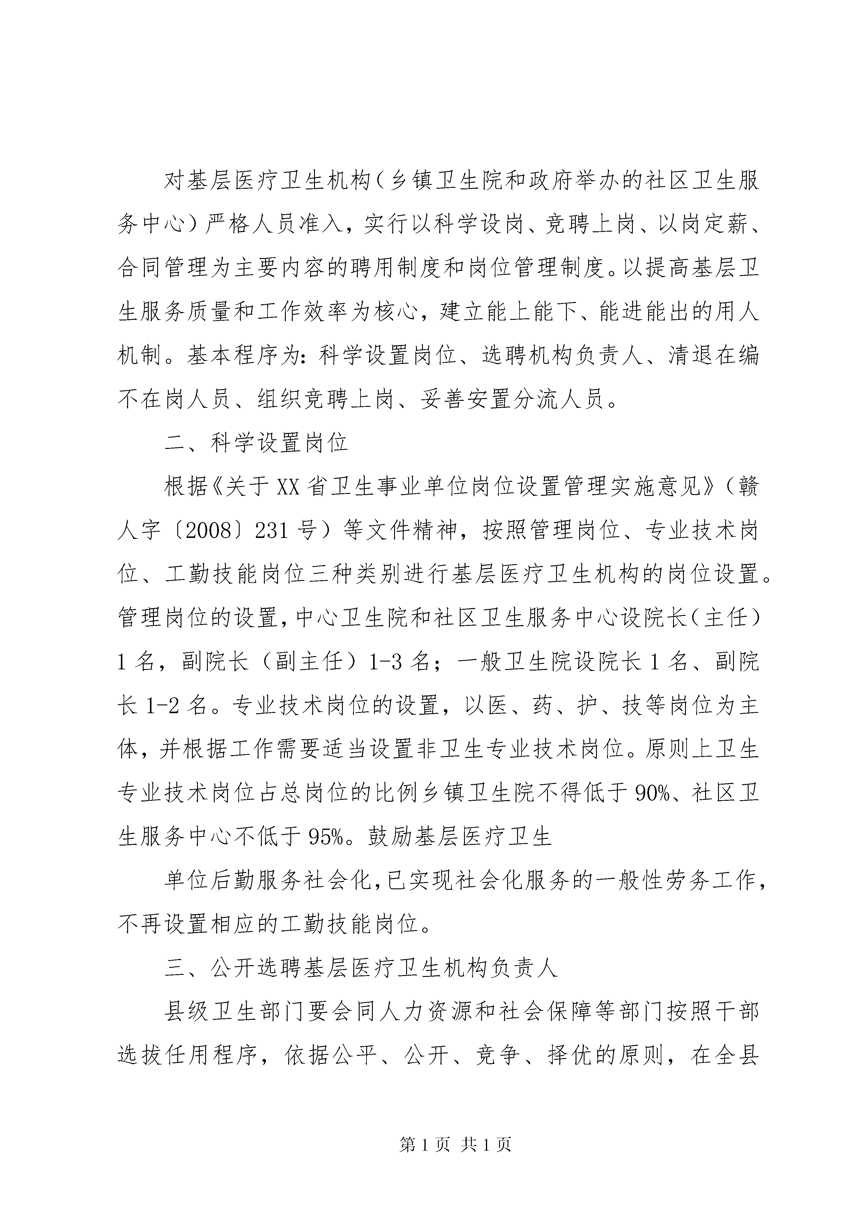 医疗卫生机构人事制度改革工作县长讲话关于印发《关于推进基层医疗卫生机构人事制度改革的指导意见》的通知赣人社字[2011]215号各市、县(区)人力资源和社会保障局、卫生局、发展和改革委员会、财政局、机构编制委员会办公室:《关于推进基层医疗卫生机构人事制度改革的指导意见》已经省政府同意,现印发给你们,请认真组织实施。各地在执行过程中要及时掌握情况,认真研究解决实际操作过程中出现的问题,并分别向有关部门报告。附件:关于推进基层医疗卫生机构人事制度改革的指导意见为认真贯彻落实《中共XX省委、XX省人民政府关于深化医药卫生体制改革的实施意见》(赣发[2009]9号)和省卫生厅、省发展改革委、省财政厅、省人力资源和社会保障厅、省编办、省教育厅、省食品药品监管局七部门《关于印发的通知》(赣卫农卫字[2010]9号)精神,大力推进基层医疗卫生机构综合改革,实现为广大群众提供安全、有效、方便、价廉的医疗卫生服务的医改目标,现就基层医疗卫生机构人事制度改革提出以下指导意见。一、基本要求对基层医疗卫生机构(乡镇卫生院和政府举办的社区卫生服务中心)严格人员准入,实行以科学设岗、竞聘上岗、以岗定薪、合同管理为主要内容的聘用制度和岗位管理制度。以提高基层卫生服务质量和工作效率为核心,建立能上能下、能进能出的用人机制。基本程序为:科学设置岗位、选聘机构负责人、清退在编不在岗人员、组织竞聘上岗、妥善安置分流人员。二、科学设置岗位根据《关于XX省卫生事业单位岗位设置管理实施意见》(赣人字〔2008〕231号)等文件精神,按照管理岗位、专业技术岗位、工勤技能岗位三种类别进行基层医疗卫生机构的岗位设置。管理岗位的设置,中心卫生院和社区卫生服务中心设院长(主任)1名,副院长(副主任)1-3名;一般卫生院设院长1名、副院长1-2名。专业技术岗位的设置,以医、药、护、技等岗位为主体,并根据工作需要适当设置非卫生专业技术岗位。原则上卫生专业技术岗位占总岗位的比例乡镇卫生院不得低于90%、社区卫生服务中心不低于95%。鼓励基层医疗卫生单位后勤服务社会化,已实现社会化服务的一般性劳务工作,不再设置相应的工勤技能岗位。三、公开选聘基层医疗卫生机构负责人县级卫生部门要会同人力资源和社会保障等部门按照干部选拔任用程序,依据公平、公开、竞争、择优的原则,在全县(市、区)范围内,通过竞争上岗的形式,择优选聘基层医疗卫生机构负责人,由卫生行政部门聘用,签订聘用合同。实行任期目标责任制,聘期为3-5年,其中试用期一年,试用期内考核不合格的,重新选聘。首次公开选聘基层医疗卫生机构负责人时,各地对于表现优秀、业绩突出的现任院长(主任),或由当地公开选聘任期不满1年的,可以通过民主推荐方式继续担任负责人。四、推行人员定岗竞聘在切实做好在编不在岗人员清退工作的基础上,按照核准的岗位设置方案,并根据岗位职责和任职条件,采取考试考核等方式,统一组织竞聘上岗。参加竞聘上岗的人员为2011年5月31日以前进入本单位的正式职工;已毕业的定向培养计划内的医学毕业生、未满服务年限招聘的执业医师和“三支一扶”人员可参加定岗竞聘。在编制有空缺的情况下,已聘用的具有相应执业资格的人员,也可参加定岗竞聘,聘用人员上岗后实行人事代理。县级卫生行政部门会同人力资源和社会保障等部门对基层医疗卫生机构上报竞聘人员的资格进行审查。对竞聘对象实行资格准入制度,非卫生专业技术人员不得进入卫生专业技术岗位。对具有执业资格的卫生专业技术人员,如无相应空缺的岗位,可以高职低聘、转岗聘用。五、实行全员聘用制度竞聘上岗后,基层医疗卫生机构法人代表与受聘人员按照有关规定签订聘用合同,实行合同管理。合同应明确双方的责任、权利、义务、待遇、聘期等内容。聘期为3-5年,在聘用期间,对发生医疗事故、收受药品回扣及“红包”、套取医疗保险基金等违规违纪行为,造成严重影响的人员,经查实,坚决予以处理或解聘;对连续2年考核不合格的,予以解聘。基层医疗卫生机构岗位空缺需补充工作人员时,必须按照《XX省事业单位公开招聘人员实施办法(试行)》(赣人发[2006]7号)要求,面向社会公开招聘。六、妥善安置分流未聘人员对基层医疗卫生机构定岗竞聘中未聘人员,经县级卫生行政部门同意,可采取以下分流安置办法。(一)正式职工分流安置办法正式职工是指经政府人力资源和社会保障部门认可、有正式的人事和工资关系的人员。1、系统内调剂。未聘人员中的卫生专业技术人员,可由县级卫生行政部门视情在辖区卫生系统内统筹调剂,参加竞聘上岗。2、允许非专业技术人员提前离岗。截止2010年12月31日距法定退休年龄不足5年且工作年限满20年的,或工作年限期满30年的分流人员,本人自愿、单位同意,可提前离岗,到达法定退休年龄时,办理退休手续。3、三年过渡安置。3年过渡期间,如有