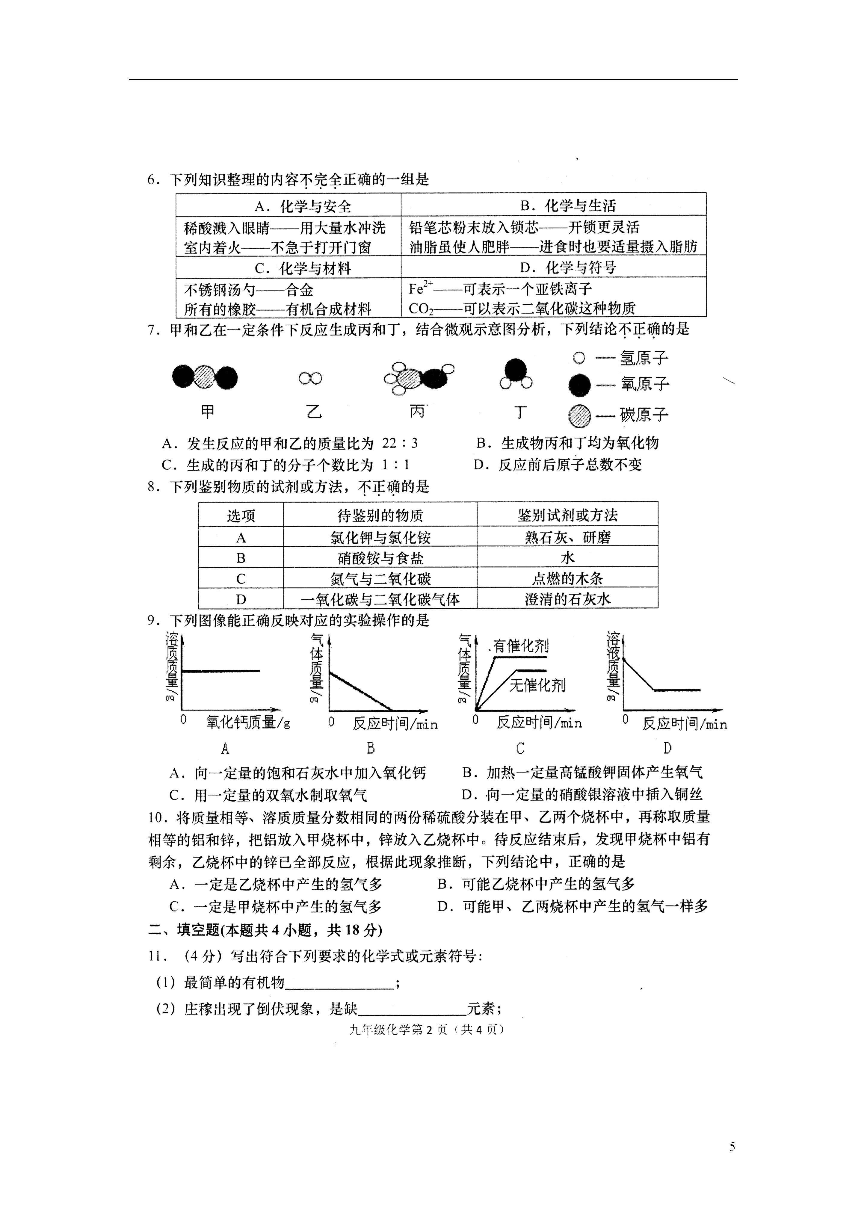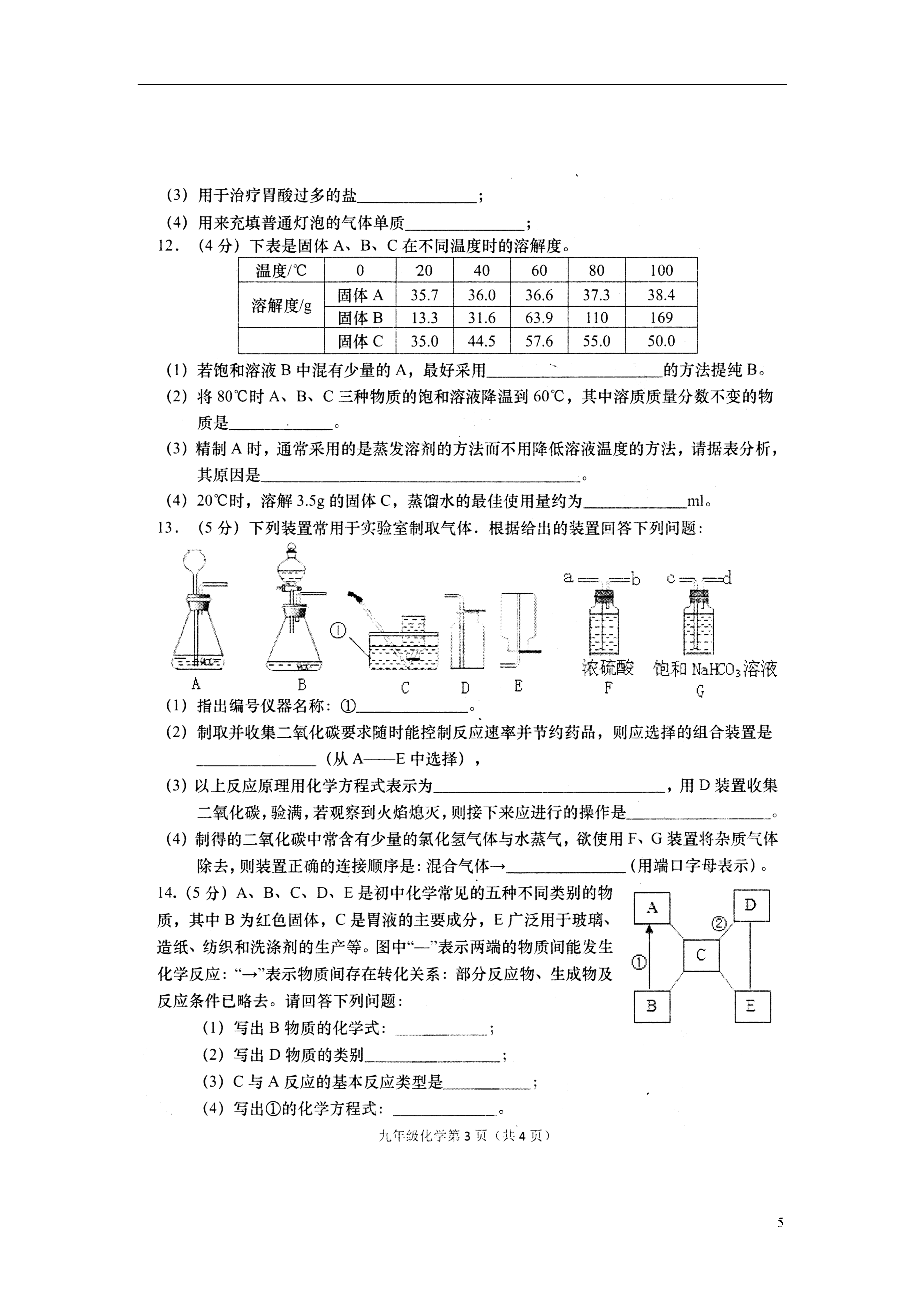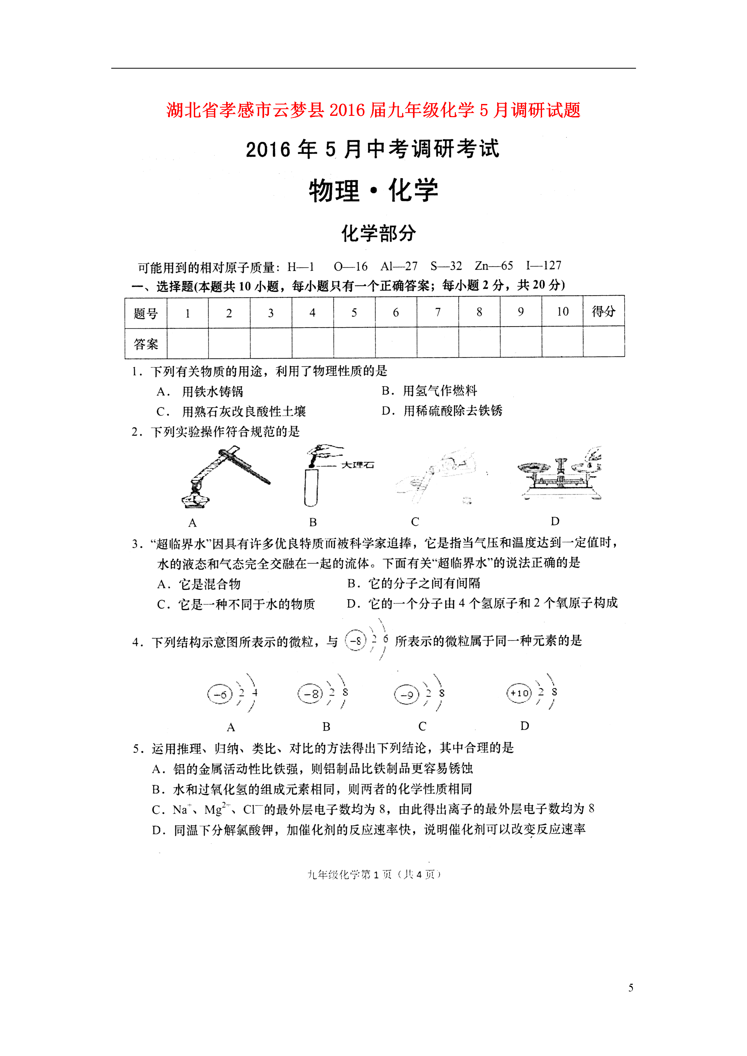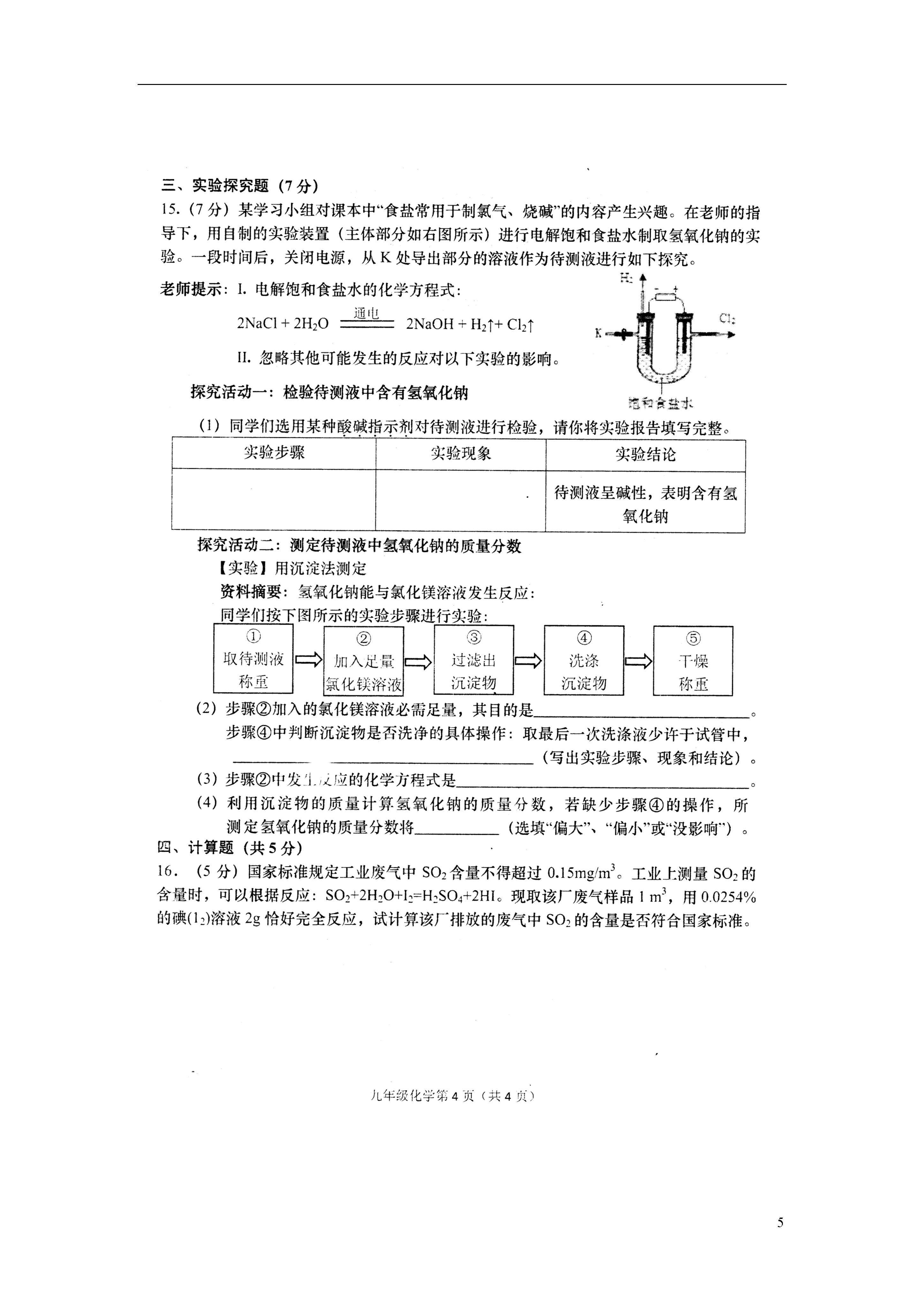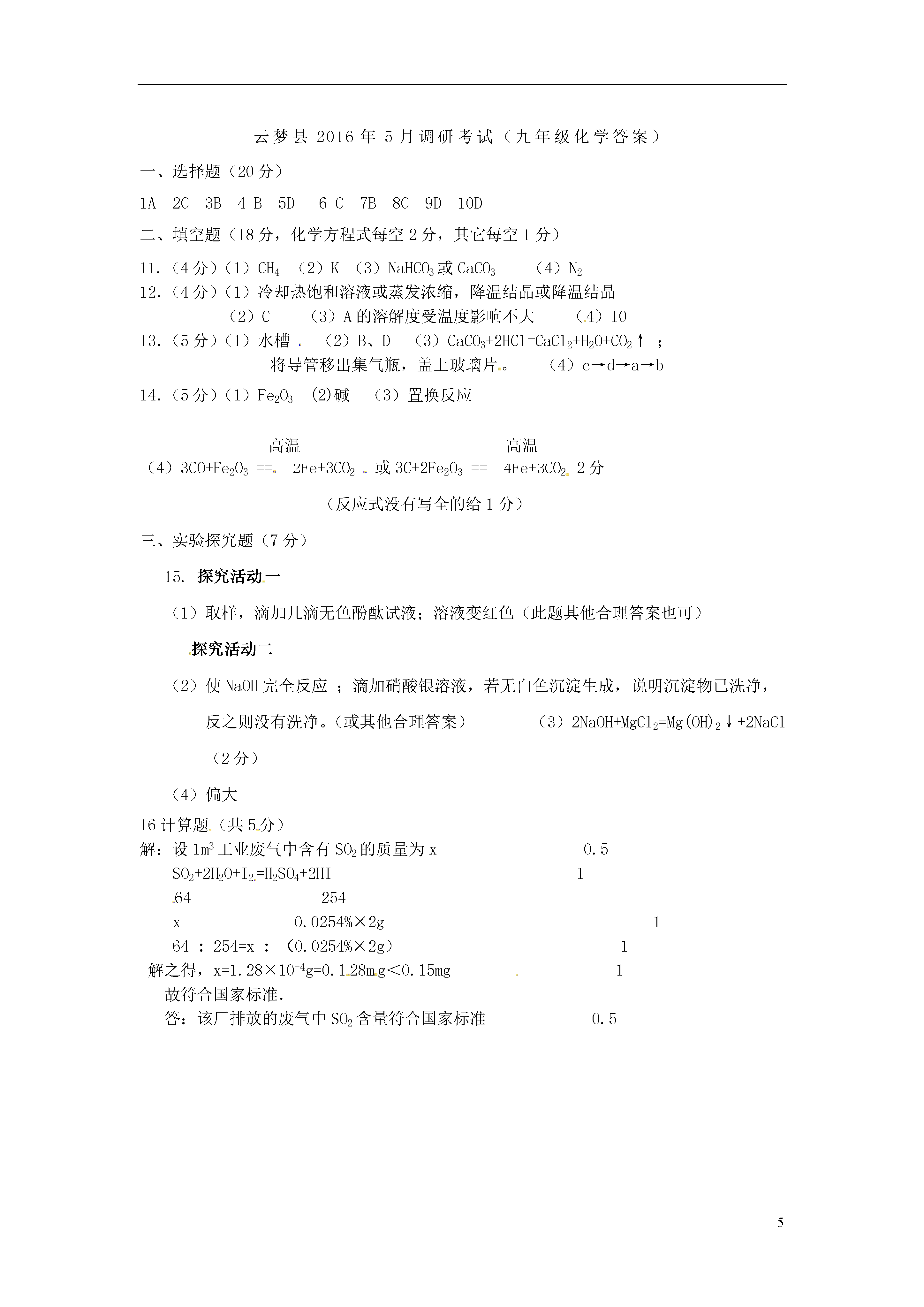 5湖北省孝感市云梦县2016届九年级化学5月调研试题云梦县2016年5月调研考试(九年级化学答案)一、选择题(20分)1A2C3B4B5D6C7B8C9D10D二、填空题(18分,化学方程式每空2分,其它每空1分)11.(4分)(1)CH4(2)K(3)NaHCO3或CaCO3(4)N212.(4分)(1)冷却热饱和溶液或蒸发浓缩,降温结晶或降温结晶(2)C(3)A的溶解度受温度影响不大(4)1013.(5分)(1)水槽(2)B、D(3)CaCO3+2HCl=CaCl2+H2O+CO2↑;将导管移出集气瓶,盖上玻璃片。(4)c→d→a→b14.(5分)(1)Fe2O3(2)碱(3)置换反应高温高温(4)3CO+Fe2O3==2Fe+3CO2或3C+2Fe2O3==4Fe+3CO22分(反应式没有写全的给1分)三、实验探究题(7分)15.探究活动一(1)取样,滴加几滴无色酚酞试液;溶液变红色(此题其他合理答案也可)探究活动二(2)使NaOH完全反应;滴加硝酸银溶液,若无白色沉淀生成,说明沉淀物已洗净,反之则没有洗净。(或其他合理答案)(3)2NaOH+MgCl2=Mg(OH)2↓+2NaCl(2分)(4)偏大16计算题(共5分)解:设1m3工业废气中含有SO2的质量为x0.5SO2+2H2O+I2=H2SO4+2HI164254x0.0254%×2g164:254=x:(0.0254%×2g)1解之得,x=1.28×10-4g=0.128mg<0.15mg1故符合国家标准.答:该厂排放的废气中SO2含量符合国家标准0.5