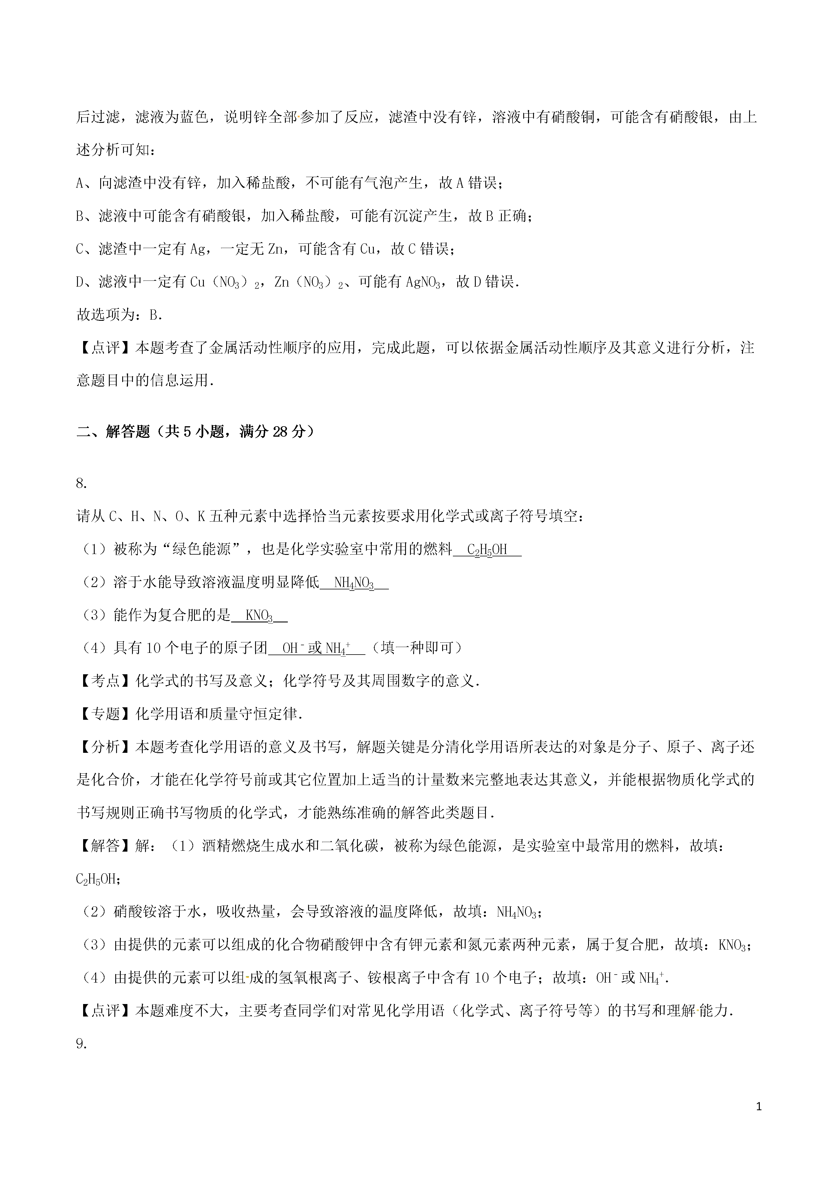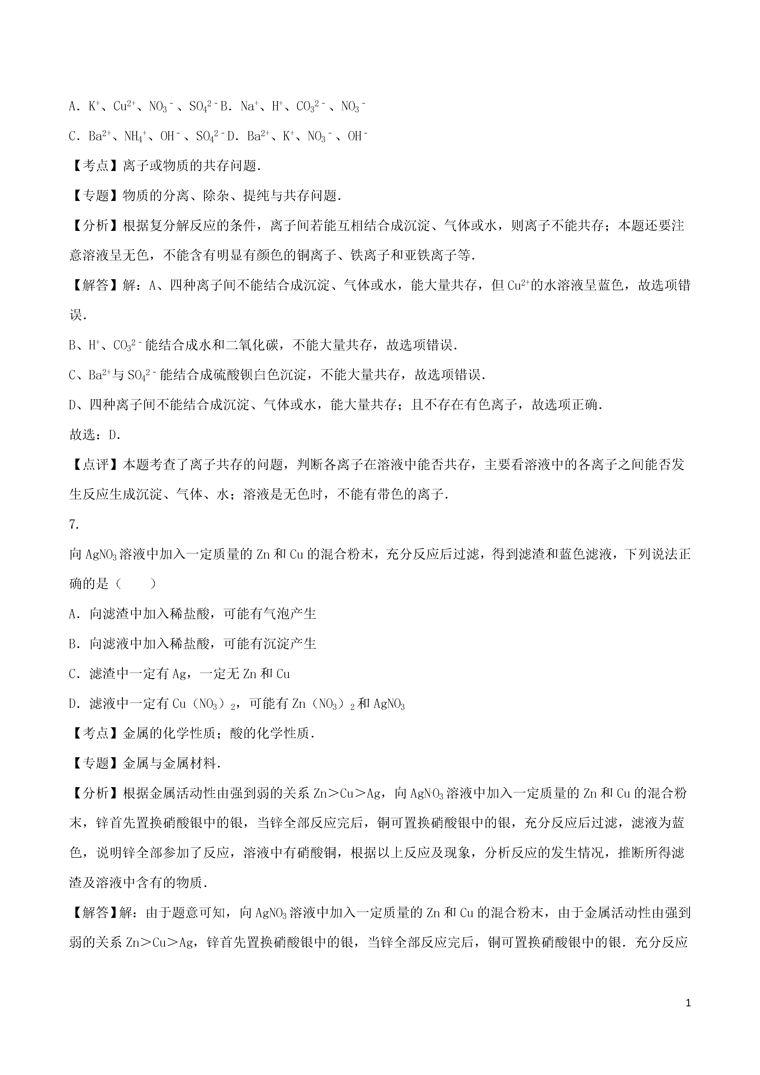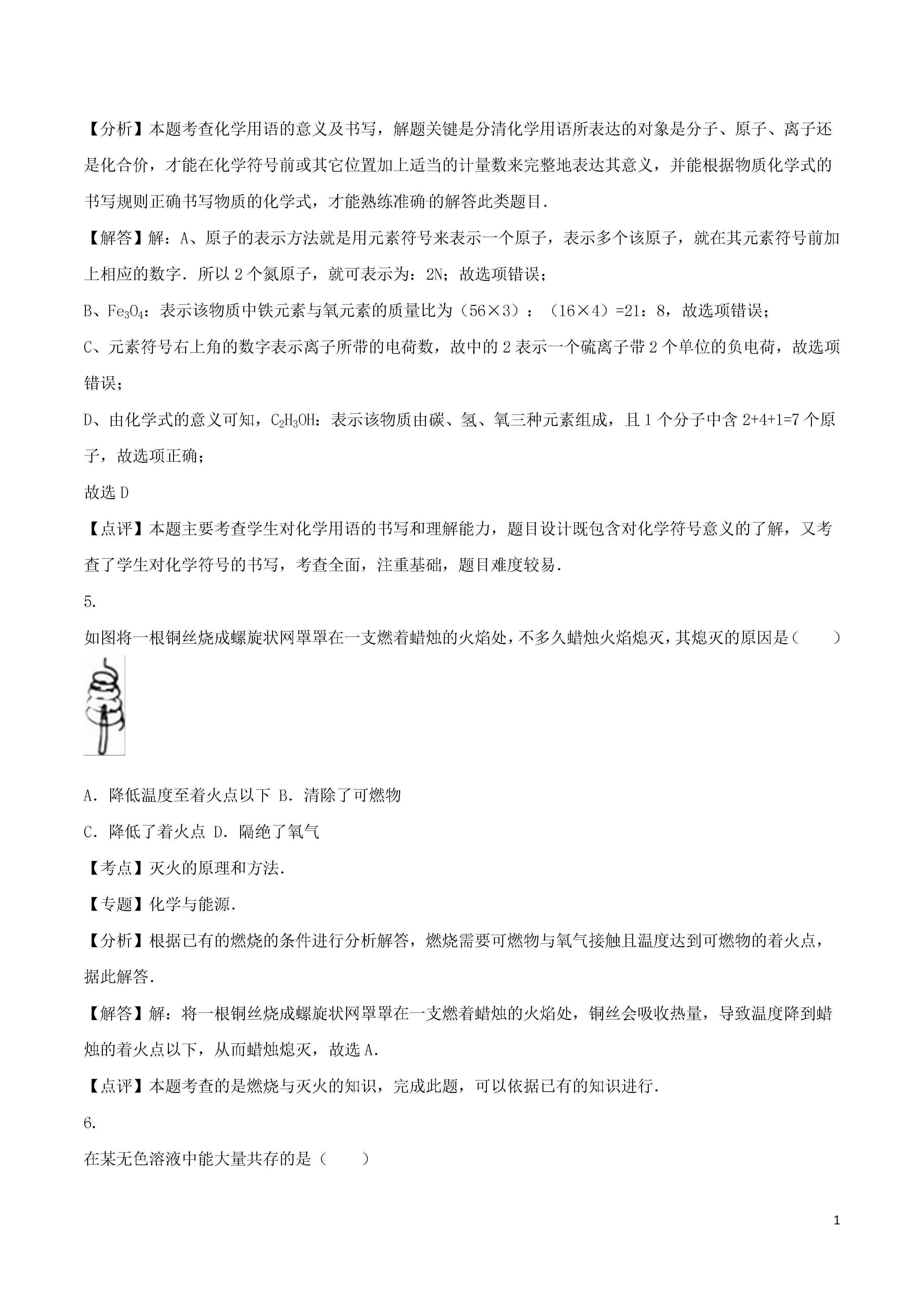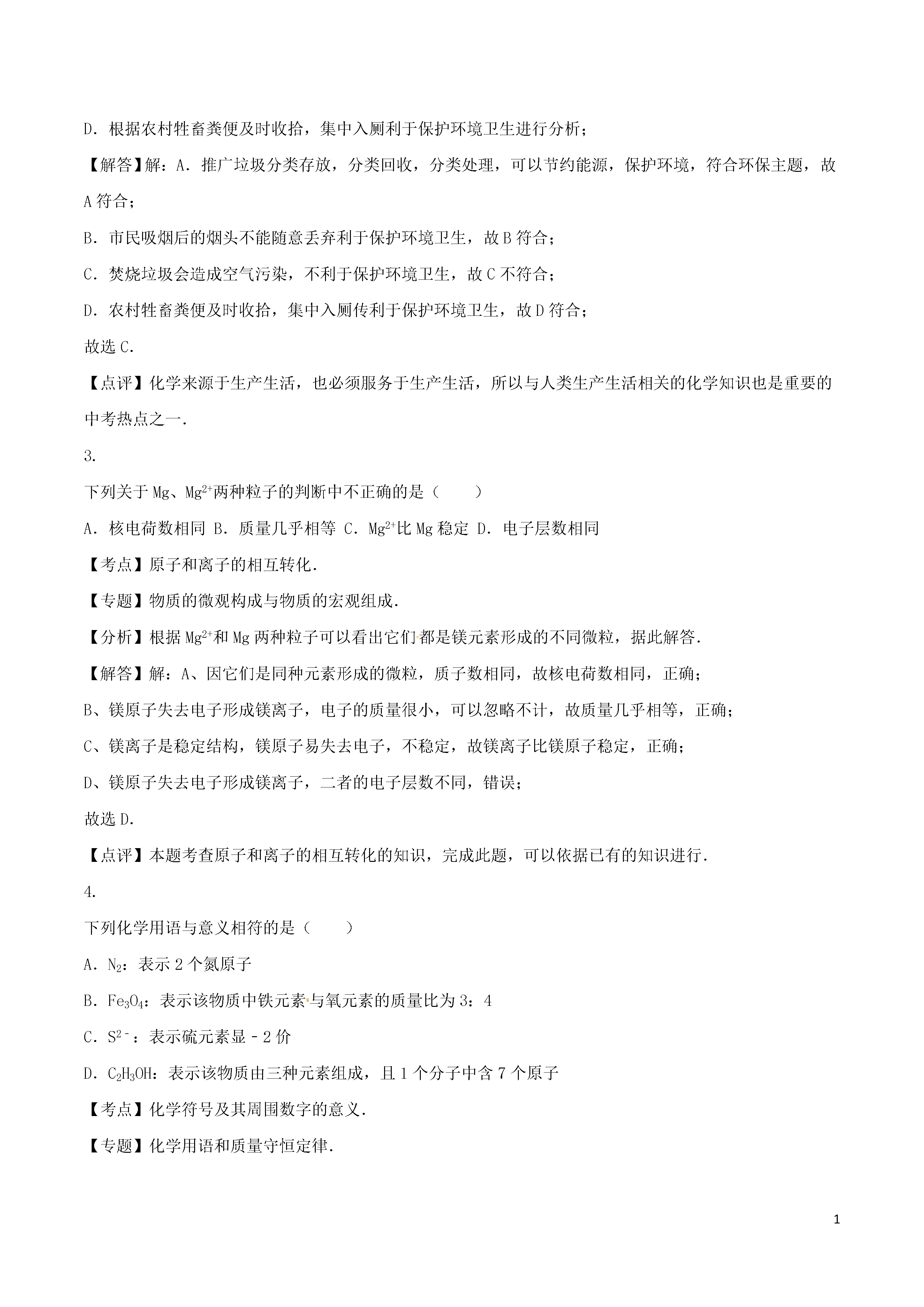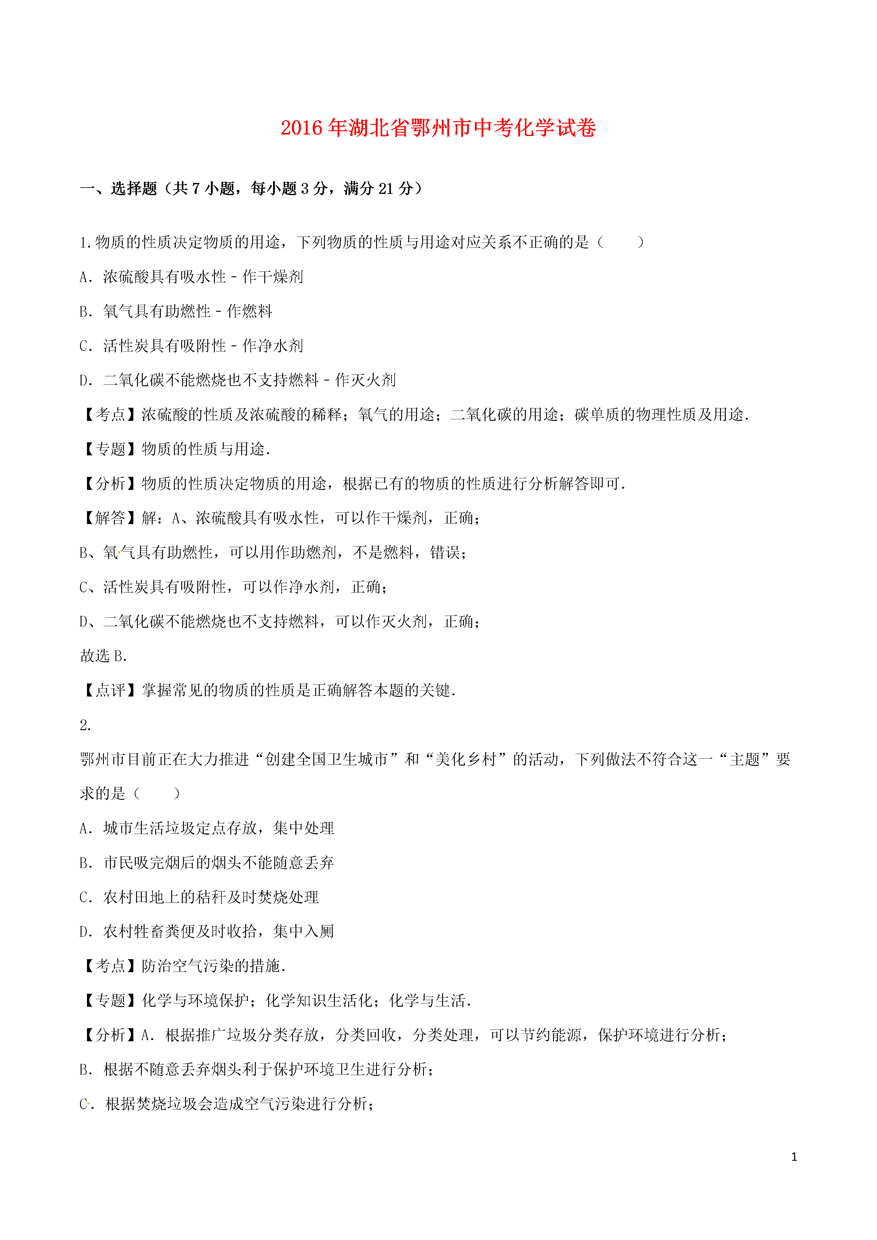 12016年湖北省鄂州市中考化学试卷一、选择题(共7小题,每小题3分,满分21分)1.物质的性质决定物质的用途,下列物质的性质与用途对应关系不正确的是()A.浓硫酸具有吸水性﹣作干燥剂B.氧气具有助燃性﹣作燃料C.活性炭具有吸附性﹣作净水剂D.二氧化碳不能燃烧也不支持燃料﹣作灭火剂【考点】浓硫酸的性质及浓硫酸的稀释;氧气的用途;二氧化碳的用途;碳单质的物理性质及用途.【专题】物质的性质与用途.【分析】物质的性质决定物质的用途,根据已有的物质的性质进行分析解答即可.【解答】解:A、浓硫酸具有吸水性,可以作干燥剂,正确;B、氧气具有助燃性,可以用作助燃剂,不是燃料,错误;C、活性炭具有吸附性,可以作净水剂,正确;D、二氧化碳不能燃烧也不支持燃料,可以作灭火剂,正确;故选B.【点评】掌握常见的物质的性质是正确解答本题的关键.2.鄂州市目前正在大力推进“创建全国卫生城市”和“美化乡村”的活动,下列做法不符合这一“主题”要求的是()A.城市生活垃圾定点存放,集中处理B.市民吸完烟后的烟头不能随意丢弃C.农村田地上的秸秆及时焚烧处理D.农村牲畜粪便及时收拾,集中入厕【考点】防治空气污染的措施.【专题】化学与环境保护;化学知识生活化;化学与生活.【分析】A.根据推广垃圾分类存放,分类回收,分类处理,可以节约能源,保护环境进行分析;B.根据不随意丢弃烟头利于保护环境卫生进行分析;C.根据焚烧垃圾会造成空气污染进行分析;D.根据农村牲畜粪便及时收拾,集中入厕利于保护环境卫生进行分析;【解答】解:A.推广垃圾分类存放,分类回收,分类处理,可以节约能源,保护环境,符合环保主题,故A符合;B.市民吸烟后的烟头不能随意丢弃利于保护环境卫生,故B符合;C.焚烧垃圾会造成空气污染,不利于保护环境卫生,故C不符合;D.农村牲畜粪便及时收拾,集中入厕传利于保护环境卫生,故D符合;故选C.【点评】化学来源于生产生活,也必须服务于生产生活,所以与人类生产生活相关的化学知识也是重要的中考热点之一.3.下列关于Mg、Mg2+两种粒子的判断中不正确的是()A.核电荷数相同B.质量几乎相等C.Mg2+比Mg稳定D.电子层数相同【考点】原子和离子的相互转化.【专题】物质的微观构成与物质的宏观组成.【分析】根据Mg2+和Mg两种粒子可以看出它们都是镁元素形成的不同微粒,据此解答.【解答】解:A、因它们是同种元素形成的微粒,质子数相同,故核电荷数相同,正确;B、镁原子失去电子形成镁离子,电子的质量很小,可以忽略不计,故质量几乎相等,正确;C、镁离子是稳定结构,镁原子易失去电子,不稳定,故镁离子比镁原子稳定,正确;D、镁原子失去电子形成镁离子,二者的电子层数不同,错误;故选D.【点评】本题考查原子和离子的相互转化的知识,完成此题,可以依据已有的知识进行.4.下列化学用语与意义相符的是()A.N2:表示2个氮原子B.Fe3O4:表示该物质中铁元素与氧元素的质量比为3:4C.S2﹣:表示硫元素显﹣2价D.C2H3OH:表示该物质由三种元素组成,且1个分子中含7个原子【考点】化学符号及其周围数字的意义.【专题】化学用语和质量守恒定律.【分析】本题考查化学用语的意义及书写,解题关键是分清化学用语所表达的对象是分子、原子、离子还是化合价,才能在化学符号前或其它位置加上适当的计量数来完整地表达其意义,并能根据物质化学式的书写规则正确书写物质的化学式,才能熟练准确的解答此类题目.【解答】解:A、原子的表示方法就是用元素符号来表示一个原子,表示多个该原子,就在其元素符号前加上相应的数字.所以2个氮原子,就可表示为:2N;故选项错误;B、Fe3O4:表示该物质中铁元素与氧元素的质量比为(56×3):(16×4)=21:8,故选项错误;C、元素符号右上角的数字表示离子所带的电荷数,故中的2表示一个硫离子带2个单位的负电荷,故选项错误;D、由化学式的意义可知,C2H3OH:表示该物质由碳、氢、氧三种元素组成,且1个分子中含2+4+1=7个原子,故选项正确;故选D【点评】本题主要考查学生对化学用语的书写和理解能力,题目设计既包含对化学符号意义的了解,又考查了学生对化学符号的书写,考查全面,注重基础,题目难度较易.5.如图将一根铜丝烧成螺旋状网罩罩在一支燃着蜡烛的火焰处,不多久蜡烛火焰熄灭,其熄灭的原因是()A.降低温度至着火点以下B.清除了可燃物C.降低了着火点D.隔绝了氧气【考点】灭火的原理和方法.【专题】化学与能源.【分析】根据已有的燃烧的条件进行分析解答,燃烧需要可燃物与氧气接触且温度达到可燃物的着火点,据此解答.【解答】解:将一根铜丝烧成螺旋状