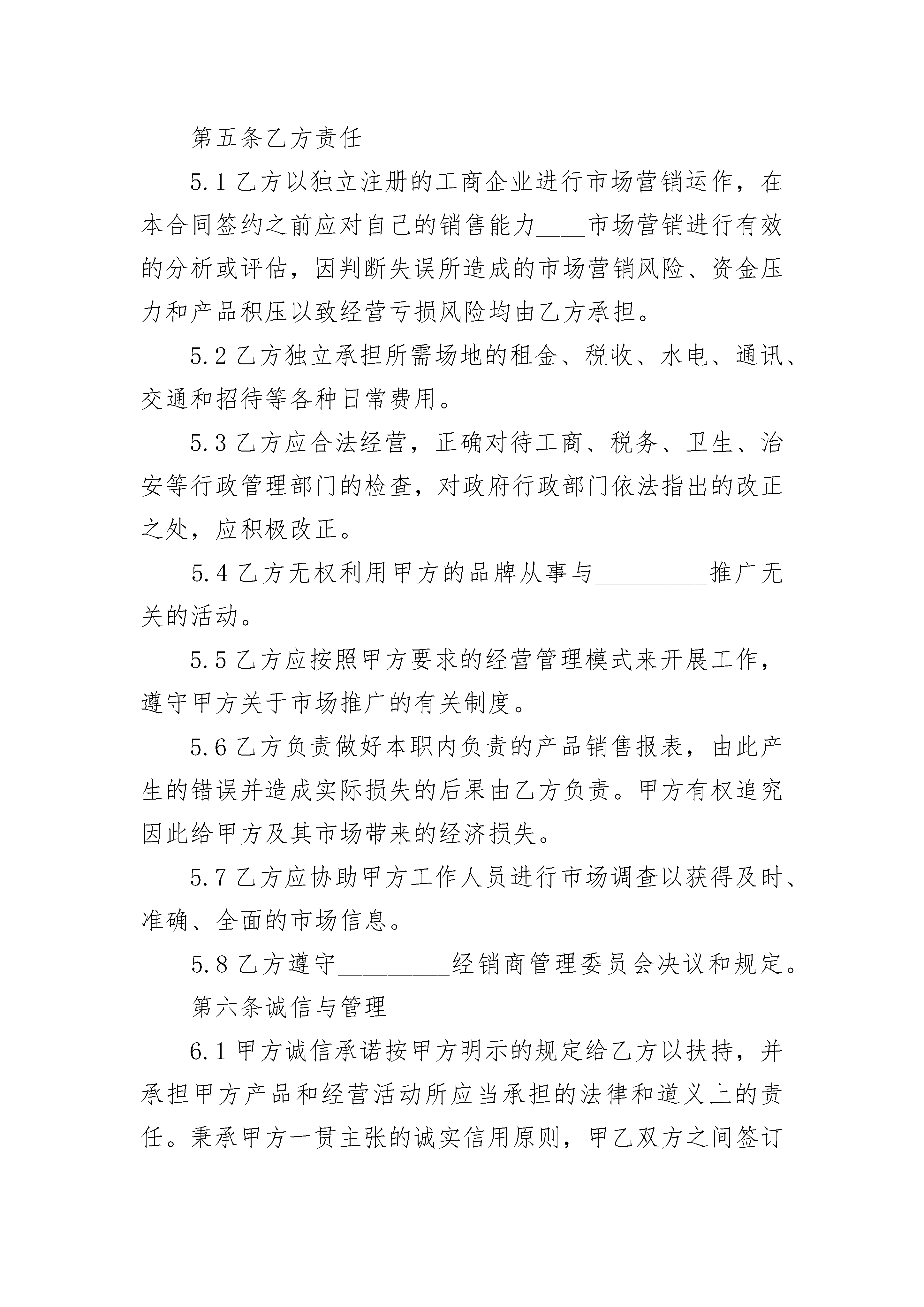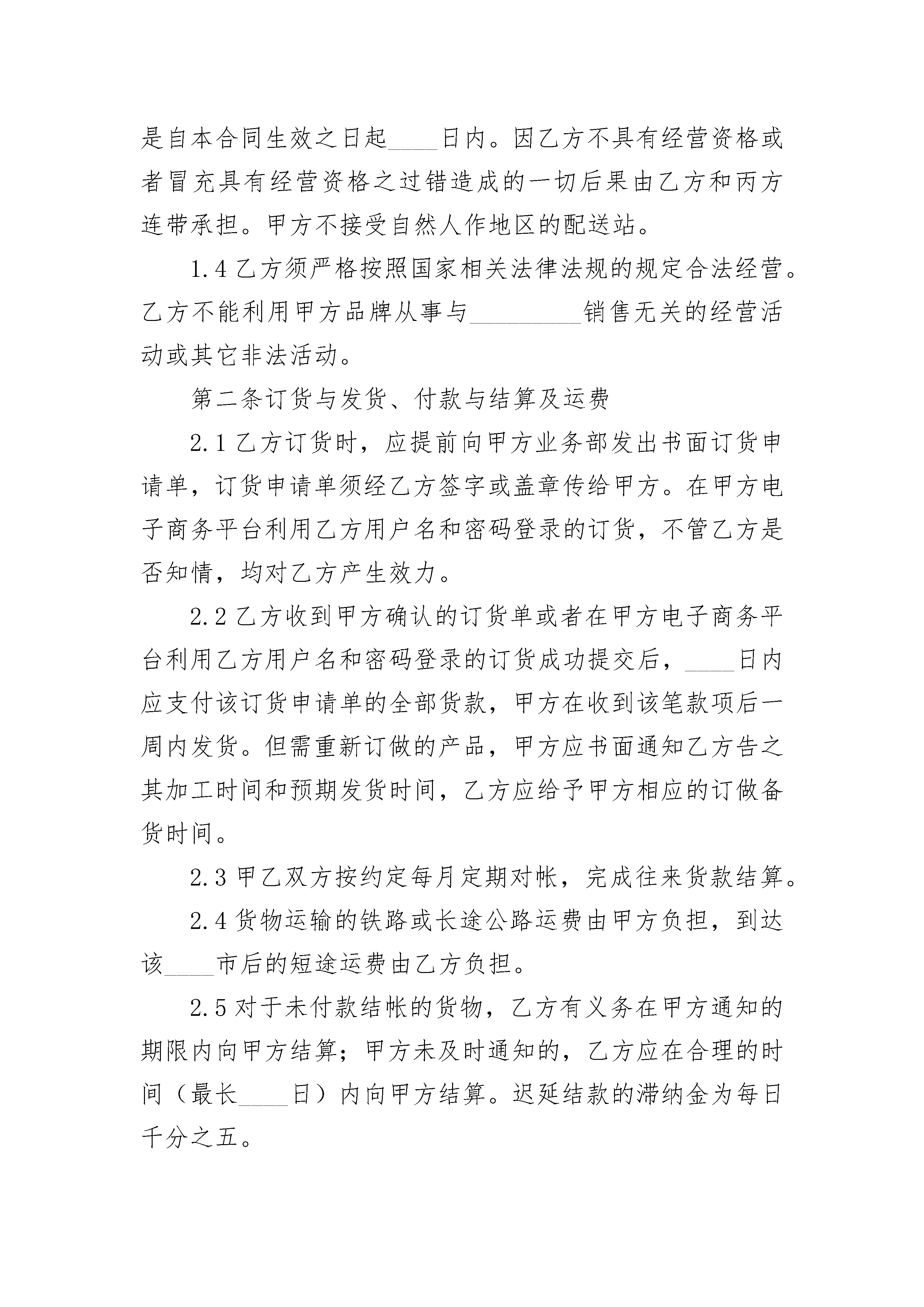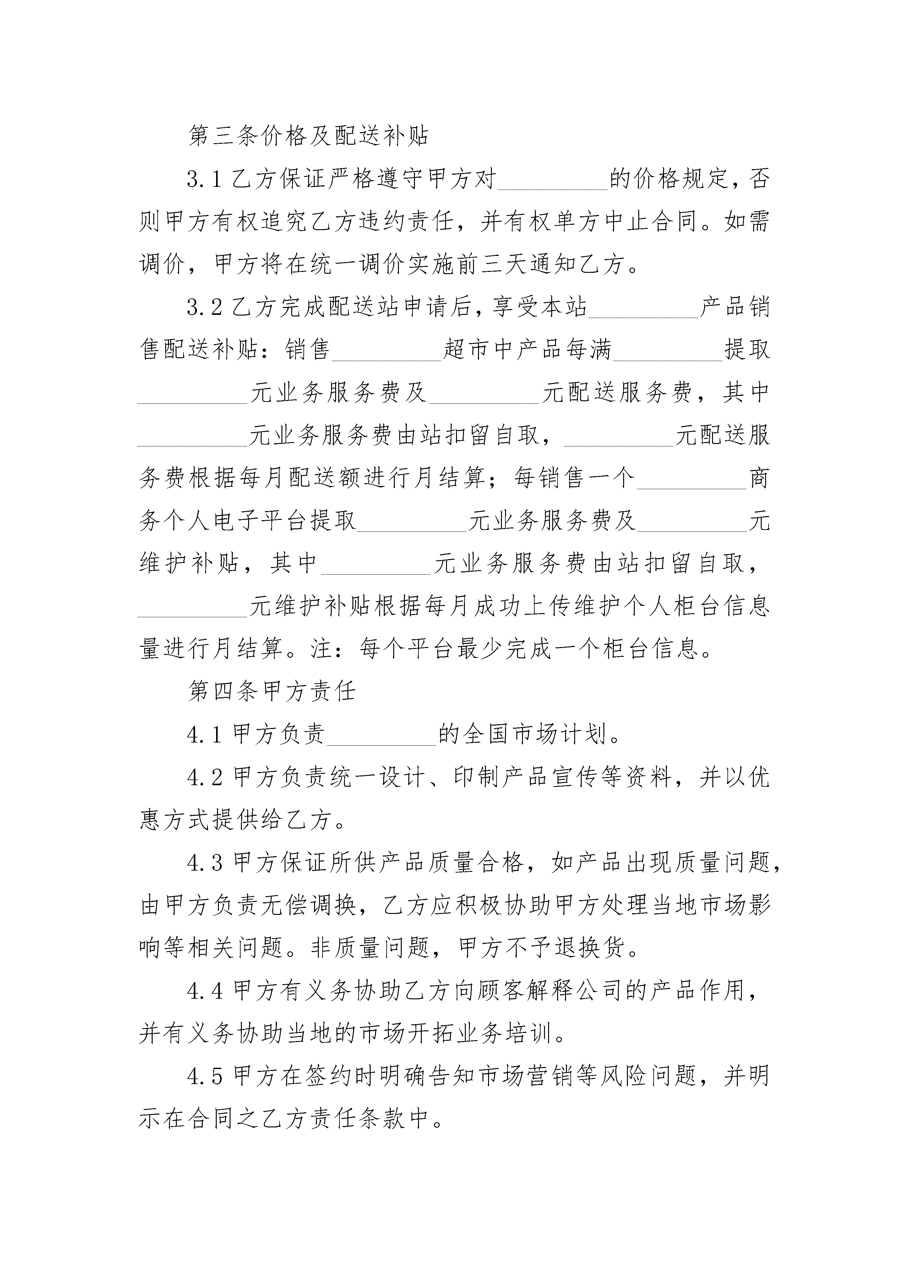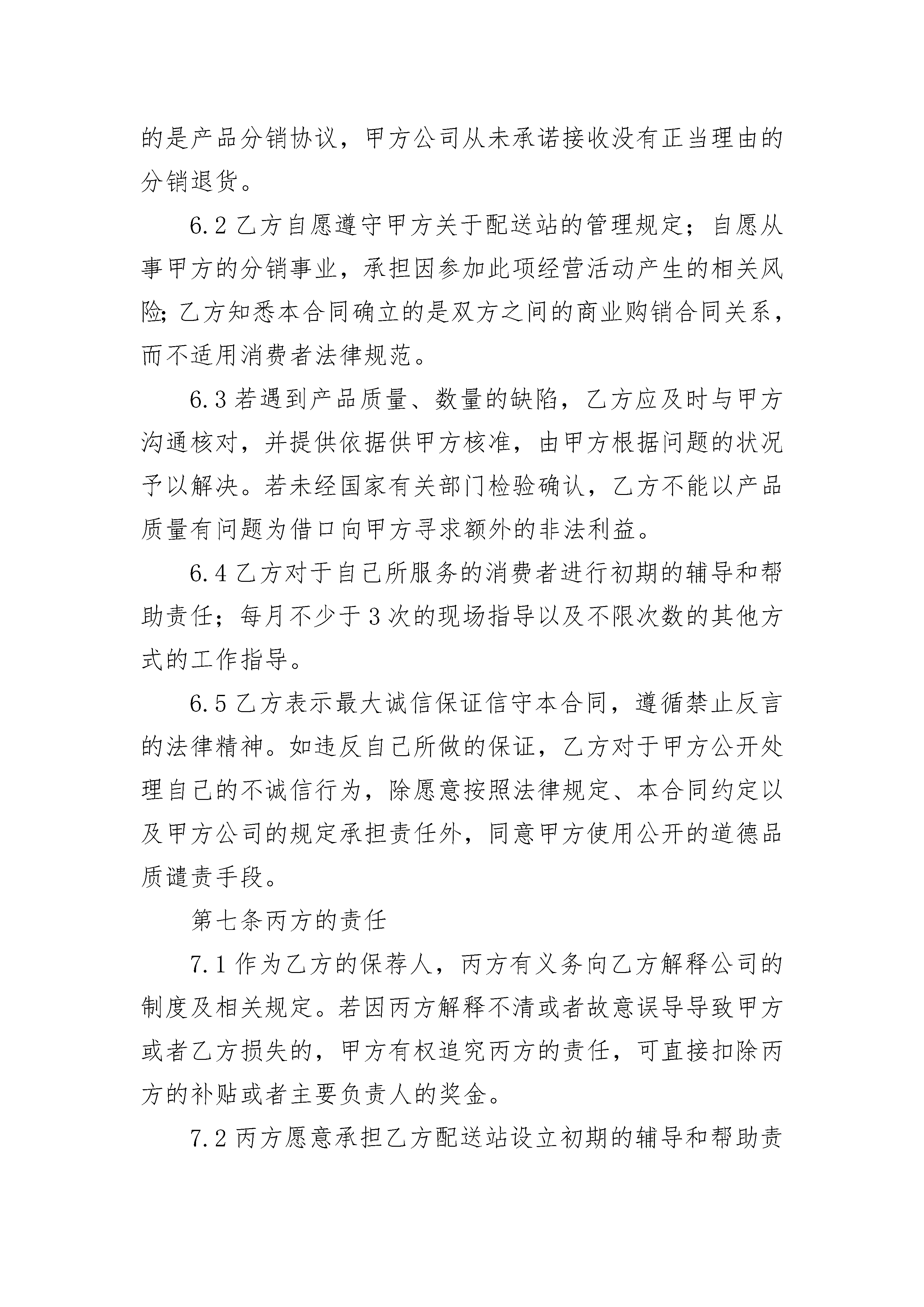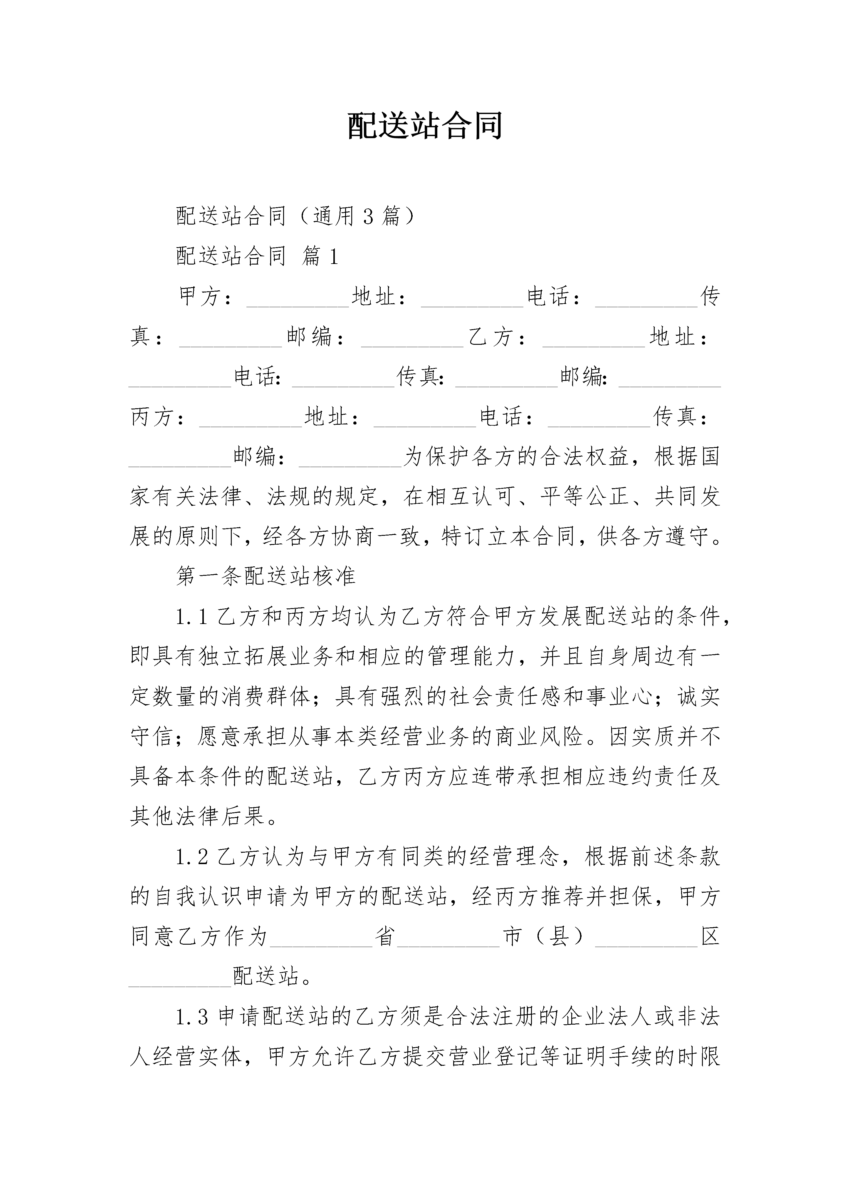 配送站合同配送站合同(通用3篇)配送站合同篇1甲方:_________地址:_________电话:_________传真:_________邮编:_________乙方:_________地址:_________电话:_________传真:_________邮编:_________丙方:_________地址:_________电话:_________传真:_________邮编:_________为保护各方的合法权益,根据国家有关法律、法规的规定,在相互认可、平等公正、共同发展的原则下,经各方协商一致,特订立本合同,供各方遵守。第一条配送站核准1.1乙方和丙方均认为乙方符合甲方发展配送站的条件,即具有独立拓展业务和相应的管理能力,并且自身周边有一定数量的消费群体;具有强烈的社会责任感和事业心;诚实守信;愿意承担从事本类经营业务的商业风险。因实质并不具备本条件的配送站,乙方丙方应连带承担相应违约责任及其他法律后果。1.2乙方认为与甲方有同类的经营理念,根据前述条款的自我认识申请为甲方的配送站,经丙方推荐并担保,甲方同意乙方作为_________省_________市(县)_________区_________配送站。1.3申请配送站的乙方须是合法注册的企业法人或非法人经营实体,甲方允许乙方提交营业登记等证明手续的时限是自本合同生效之日起____日内。因乙方不具有经营资格或者冒充具有经营资格之过错造成的一切后果由乙方和丙方连带承担。甲方不接受自然人作地区的配送站。1.4乙方须严格按照国家相关法律法规的规定合法经营。乙方不能利用甲方品牌从事与_________销售无关的经营活动或其它非法活动。第二条订货与发货、付款与结算及运费2.1乙方订货时,应提前向甲方业务部发出书面订货申请单,订货申请单须经乙方签字或盖章传给甲方。在甲方电子商务平台利用乙方用户名和密码登录的订货,不管乙方是否知情,均对乙方产生效力。2.2乙方收到甲方确认的订货单或者在甲方电子商务平台利用乙方用户名和密码登录的订货成功提交后,____日内应支付该订货申请单的全部货款,甲方在收到该笔款项后一周内发货。但需重新订做的产品,甲方应书面通知乙方告之其加工时间和预期发货时间,乙方应给予甲方相应的订做备货时间。2.3甲乙双方按约定每月定期对帐,完成往来货款结算。2.4货物运输的铁路或长途公路运费由甲方负担,到达该____市后的短途运费由乙方负担。2.5对于未付款结帐的货物,乙方有义务在甲方通知的期限内向甲方结算;甲方未及时通知的,乙方应在合理的时间(最长____日)内向甲方结算。迟延结款的滞纳金为每日千分之五。第三条价格及配送补贴3.1乙方保证严格遵守甲方对_________的价格规定,否则甲方有权追究乙方违约责任,并有权单方中止合同。如需调价,甲方将在统一调价实施前三天通知乙方。3.2乙方完成配送站申请后,享受本站_________产品销售配送补贴:销售_________超市中产品每满_________提取_________元业务服务费及_________元配送服务费,其中_________元业务服务费由站扣留自取,_________元配送服务费根据每月配送额进行月结算;每销售一个_________商务个人电子平台提取_________元业务服务费及_________元维护补贴,其中_________元业务服务费由站扣留自取,_________元维护补贴根据每月成功上传维护个人柜台信息量进行月结算。注:每个平台最少完成一个柜台信息。第四条甲方责任4.1甲方负责_________的全国市场计划。4.2甲方负责统一设计、印制产品宣传等资料,并以优惠方式提供给乙方。4.3甲方保证所供产品质量合格,如产品出现质量问题,由甲方负责无偿调换,乙方应积极协助甲方处理当地市场影响等相关问题。非质量问题,甲方不予退换货。4.4甲方有义务协助乙方向顾客解释公司的产品作用,并有义务协助当地的市场开拓业务培训。4.5甲方在签约时明确告知市场营销等风险问题,并明示在合同之乙方责任条款中。第五条乙方责任5.1乙方以独立注册的工商企业进行市场营销运作,在本合同签约之前应对自己的销售能力____市场营销进行有效的分析或评估,因判断失误所造成的市场营销风险、资金压力和产品积压以致经营亏损风险均由乙方承担。5.2乙方独立承担所需场地的租金、税收、水电、通讯、交通和招待等各种日常费用。5.3乙方应合法经营,正确对待工商、税务、卫生、治安等行政管理部门的检查,对政府行政部门依法指出的改正之处,应积极改正。5.4乙方无权利用甲方的品牌从事与_________推广无关的活动。5.5乙方应按照甲方要求的经营管理模式来开展工作,遵守甲方关于市场推广的有关制度。5.6乙方负责做好本职内负责的产品销售报表,由此产生