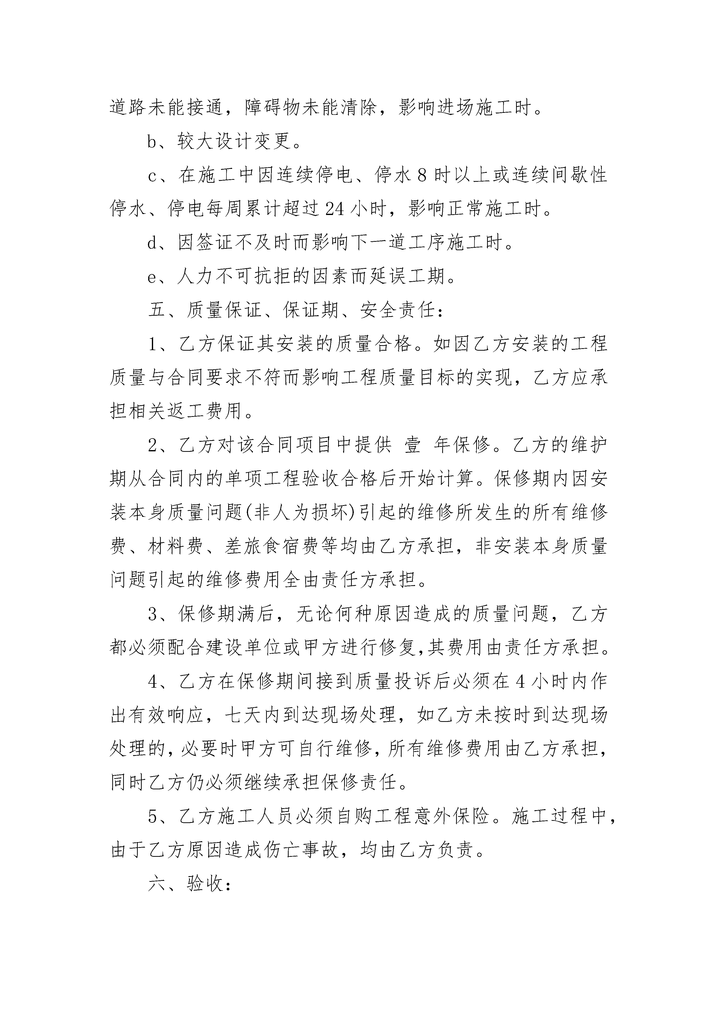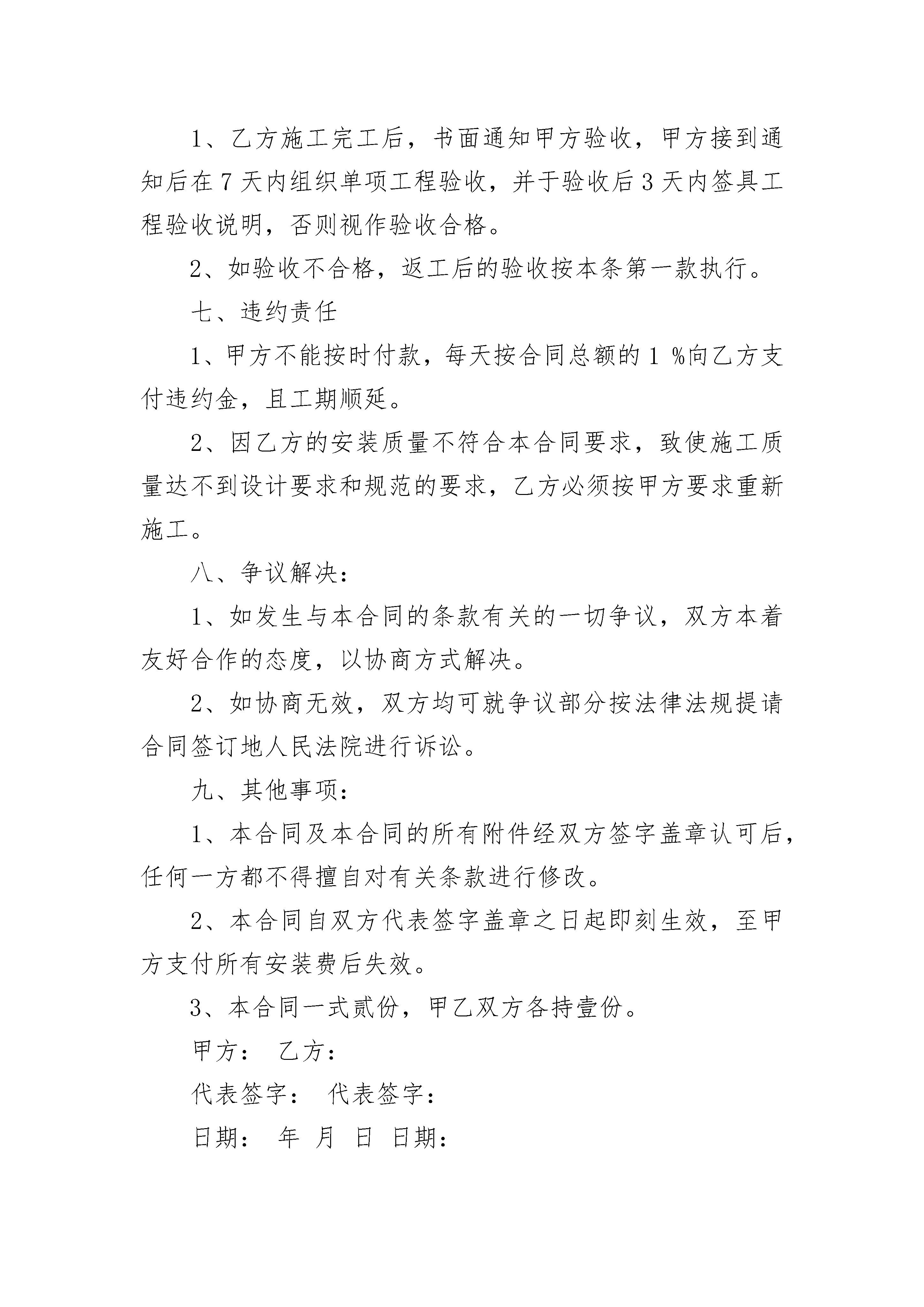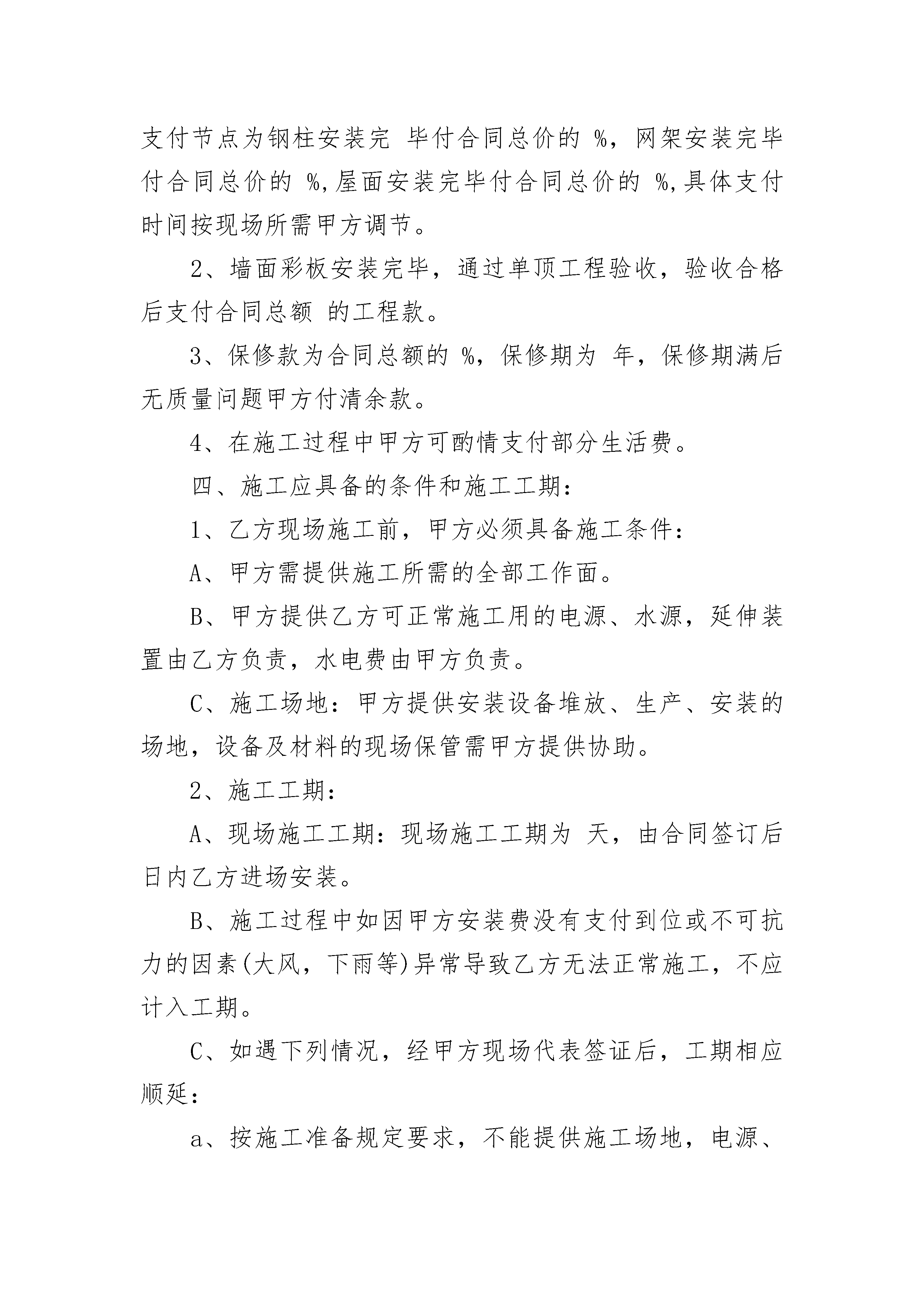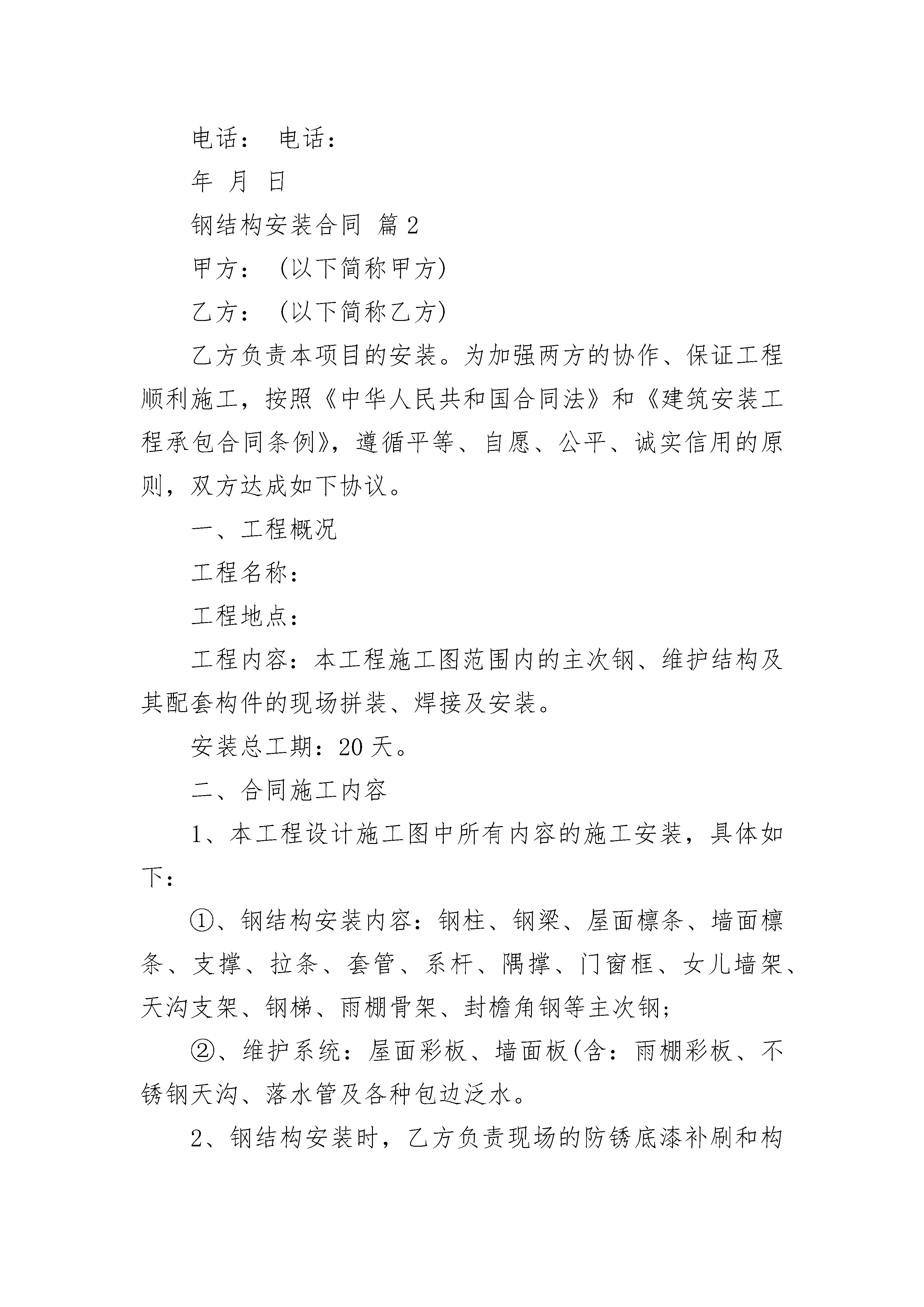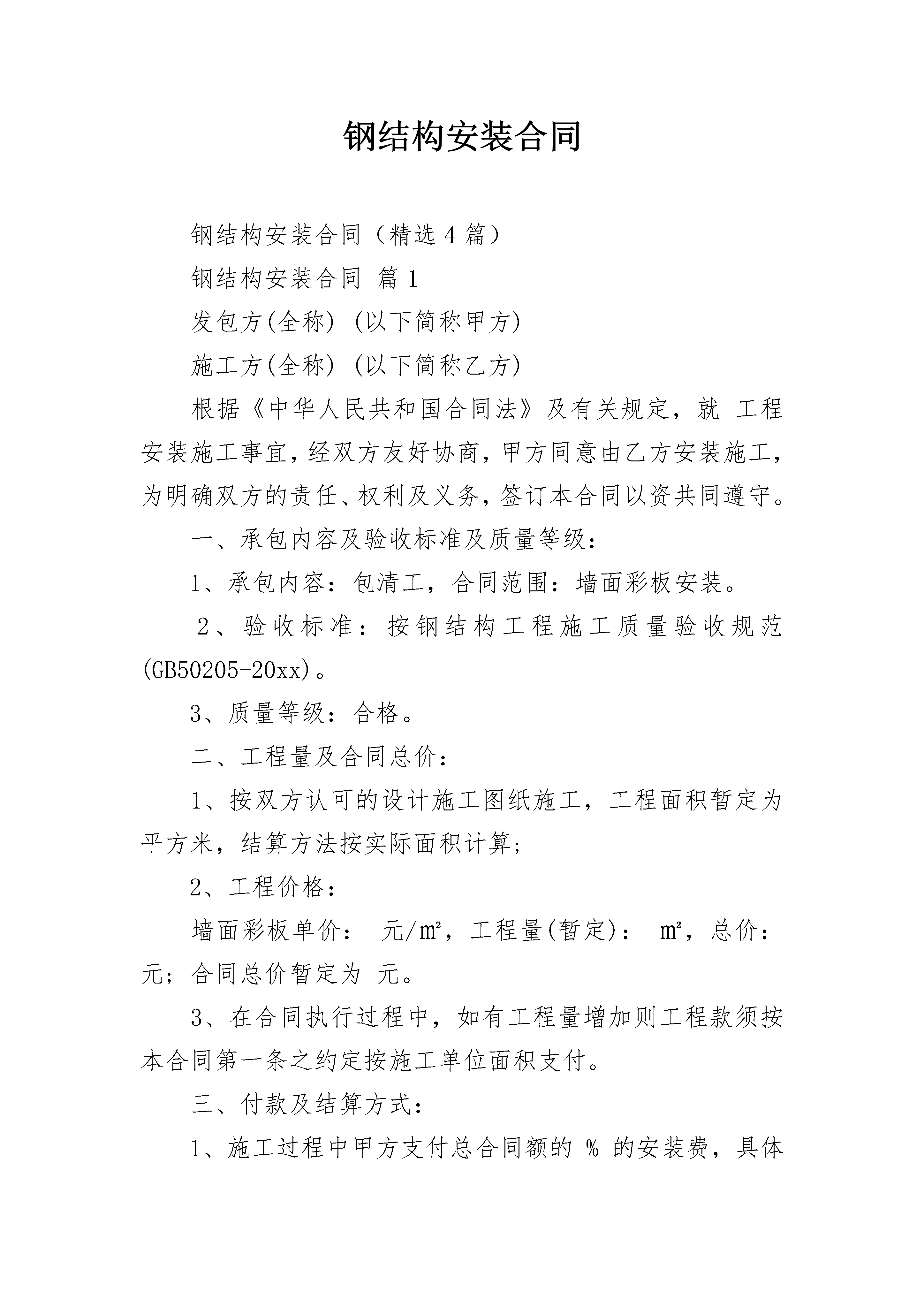 钢结构安装合同钢结构安装合同(精选4篇)钢结构安装合同篇1发包方(全称)(以下简称甲方)施工方(全称)(以下简称乙方)根据《中华人民共和国合同法》及有关规定,就工程安装施工事宜,经双方友好协商,甲方同意由乙方安装施工,为明确双方的责任、权利及义务,签订本合同以资共同遵守。一、承包内容及验收标准及质量等级:1、承包内容:包清工,合同范围:墙面彩板安装。2、验收标准:按钢结构工程施工质量验收规范(GB50205-20xx)。3、质量等级:合格。二、工程量及合同总价:1、按双方认可的设计施工图纸施工,工程面积暂定为平方米,结算方法按实际面积计算;2、工程价格:墙面彩板单价:元/㎡,工程量(暂定):㎡,总价:元;合同总价暂定为元。3、在合同执行过程中,如有工程量增加则工程款须按本合同第一条之约定按施工单位面积支付。三、付款及结算方式:1、施工过程中甲方支付总合同额的%的安装费,具体支付节点为钢柱安装完毕付合同总价的%,网架安装完毕付合同总价的%,屋面安装完毕付合同总价的%,具体支付时间按现场所需甲方调节。2、墙面彩板安装完毕,通过单顶工程验收,验收合格后支付合同总额的工程款。3、保修款为合同总额的%,保修期为年,保修期满后无质量问题甲方付清余款。4、在施工过程中甲方可酌情支付部分生活费。四、施工应具备的条件和施工工期:1、乙方现场施工前,甲方必须具备施工条件:A、甲方需提供施工所需的全部工作面。B、甲方提供乙方可正常施工用的电源、水源,延伸装置由乙方负责,水电费由甲方负责。C、施工场地:甲方提供安装设备堆放、生产、安装的场地,设备及材料的现场保管需甲方提供协助。2、施工工期:A、现场施工工期:现场施工工期为天,由合同签订后日内乙方进场安装。B、施工过程中如因甲方安装费没有支付到位或不可抗力的因素(大风,下雨等)异常导致乙方无法正常施工,不应计入工期。C、如遇下列情况,经甲方现场代表签证后,工期相应顺延:a、按施工准备规定要求,不能提供施工场地,电源、道路未能接通,障碍物未能清除,影响进场施工时。b、较大设计变更。c、在施工中因连续停电、停水8时以上或连续间歇性停水、停电每周累计超过24小时,影响正常施工时。d、因签证不及时而影响下一道工序施工时。e、人力不可抗拒的因素而延误工期。五、质量保证、保证期、安全责任:1、乙方保证其安装的质量合格。如因乙方安装的工程质量与合同要求不符而影响工程质量目标的实现,乙方应承担相关返工费用。2、乙方对该合同项目中提供壹年保修。乙方的维护期从合同内的单项工程验收合格后开始计算。保修期内因安装本身质量问题(非人为损坏)引起的维修所发生的所有维修费、材料费、差旅食宿费等均由乙方承担,非安装本身质量问题引起的维修费用全由责任方承担。3、保修期满后,无论何种原因造成的质量问题,乙方都必须配合建设单位或甲方进行修复,其费用由责任方承担。4、乙方在保修期间接到质量投诉后必须在4小时内作出有效响应,七天内到达现场处理,如乙方未按时到达现场处理的,必要时甲方可自行维修,所有维修费用由乙方承担,同时乙方仍必须继续承担保修责任。5、乙方施工人员必须自购工程意外保险。施工过程中,由于乙方原因造成伤亡事故,均由乙方负责。六、验收:1、乙方施工完工后,书面通知甲方验收,甲方接到通知后在7天内组织单项工程验收,并于验收后3天内签具工程验收说明,否则视作验收合格。2、如验收不合格,返工后的验收按本条第一款执行。七、违约责任1、甲方不能按时付款,每天按合同总额的1%向乙方支付违约金,且工期顺延。2、因乙方的安装质量不符合本合同要求,致使施工质量达不到设计要求和规范的要求,乙方必须按甲方要求重新施工。八、争议解决:1、如发生与本合同的条款有关的一切争议,双方本着友好合作的态度,以协商方式解决。2、如协商无效,双方均可就争议部分按法律法规提请合同签订地人民法院进行诉讼。九、其他事项:1、本合同及本合同的所有附件经双方签字盖章认可后,任何一方都不得擅自对有关条款进行修改。2、本合同自双方代表签字盖章之日起即刻生效,至甲方支付所有安装费后失效。3、本合同一式贰份,甲乙双方各持壹份。甲方:乙方:代表签字:代表签字:日期:年月日日期:电话:电话:年月日钢结构安装合同篇2甲方:(以下简称甲方)乙方:(以下简称乙方)乙方负责本项目的安装。为加强两方的协作、保证工程顺利施工,按照《中华人民共和国合同法》和《建筑安装工程承包合同条例》,遵循平等、自愿、公平、诚实信用的原则,双方达成如下协议。一、工程概况工程名称:工程地点:工程内容:本工程施工图范围内的主次钢、维护结构及其配套构件的现场拼装、焊接及安装。安装总工期:20天。二、合同施工内容1、本工程设计施工图中所有内容的施工安装,具体如下:①、钢结构安装内容:钢柱、钢梁、屋面檩条、墙面檩条、支撑、拉条