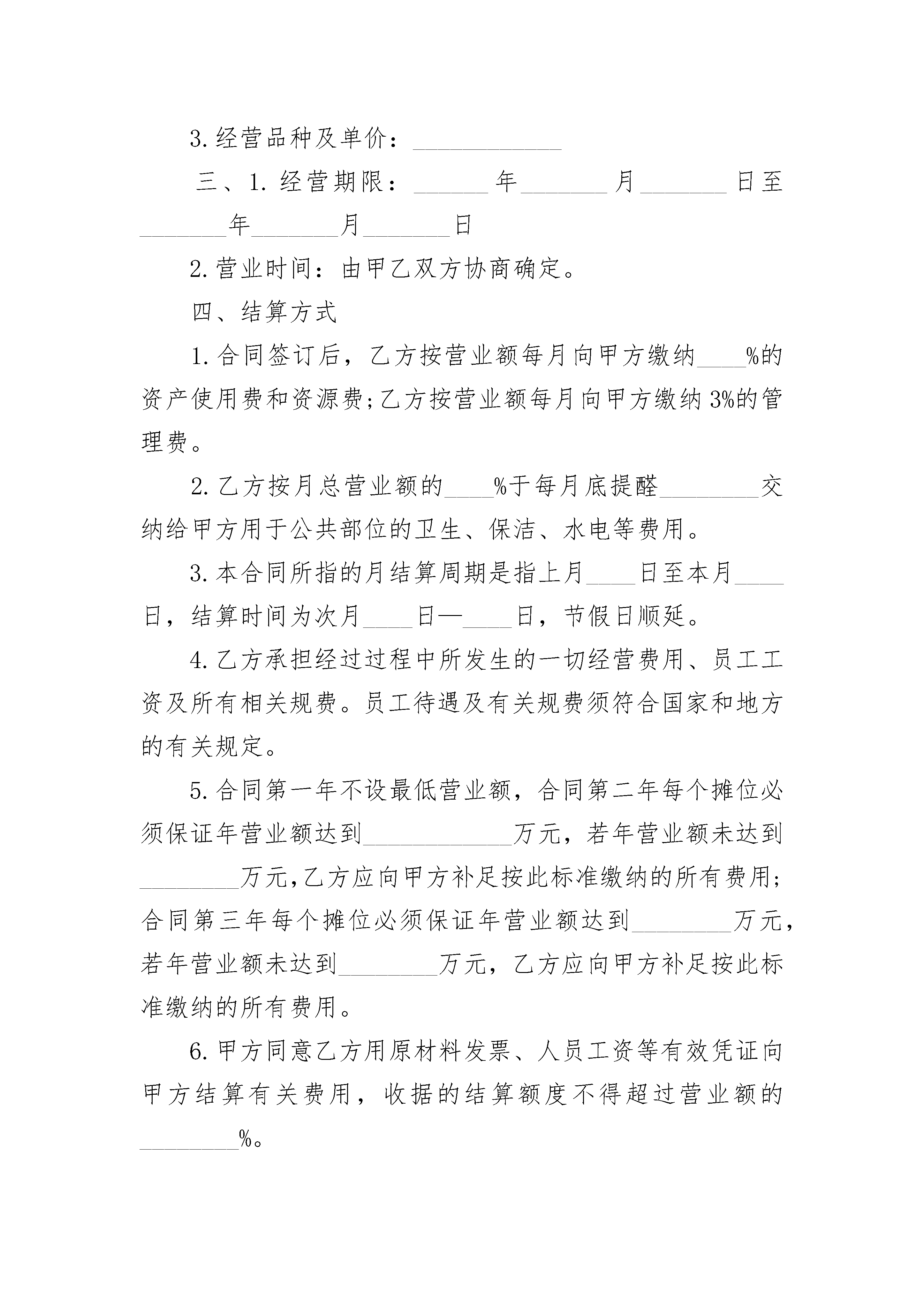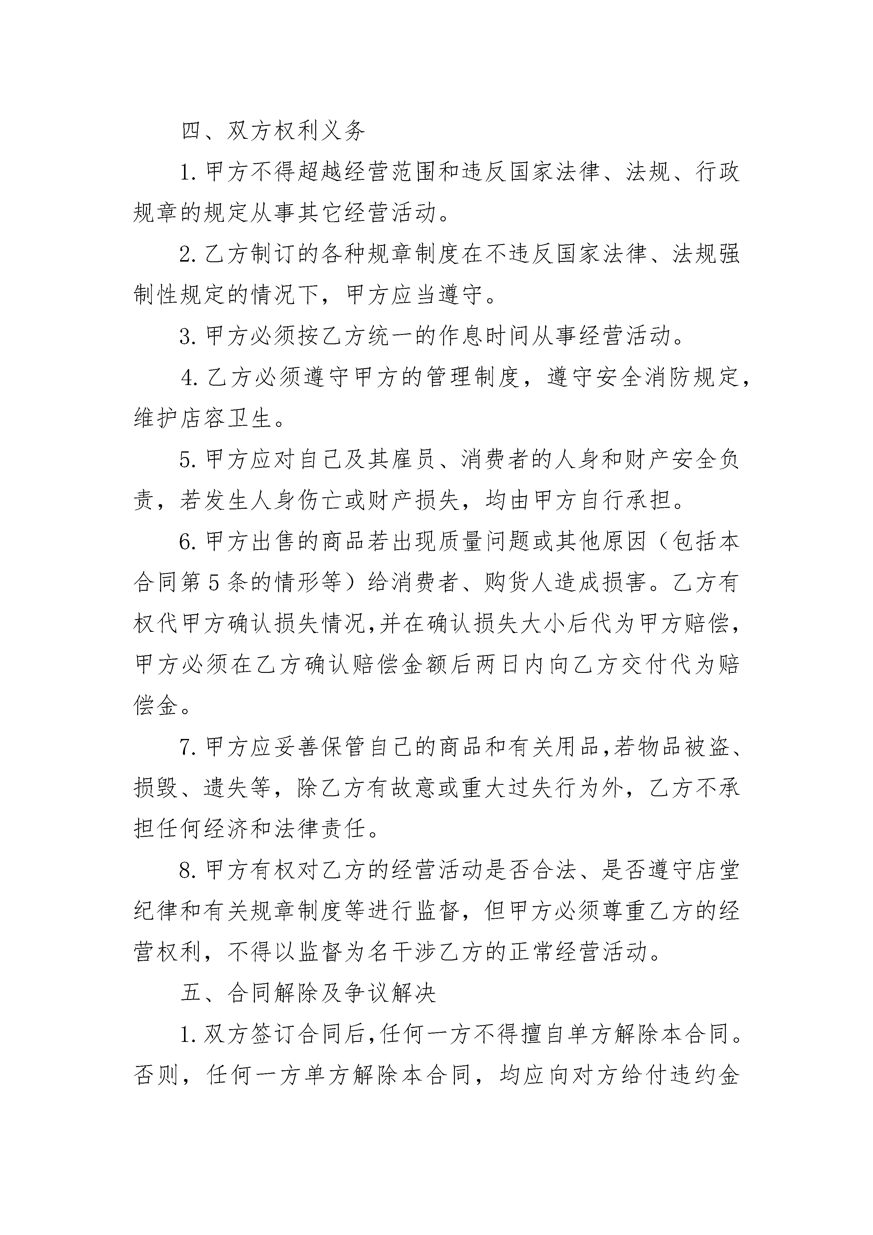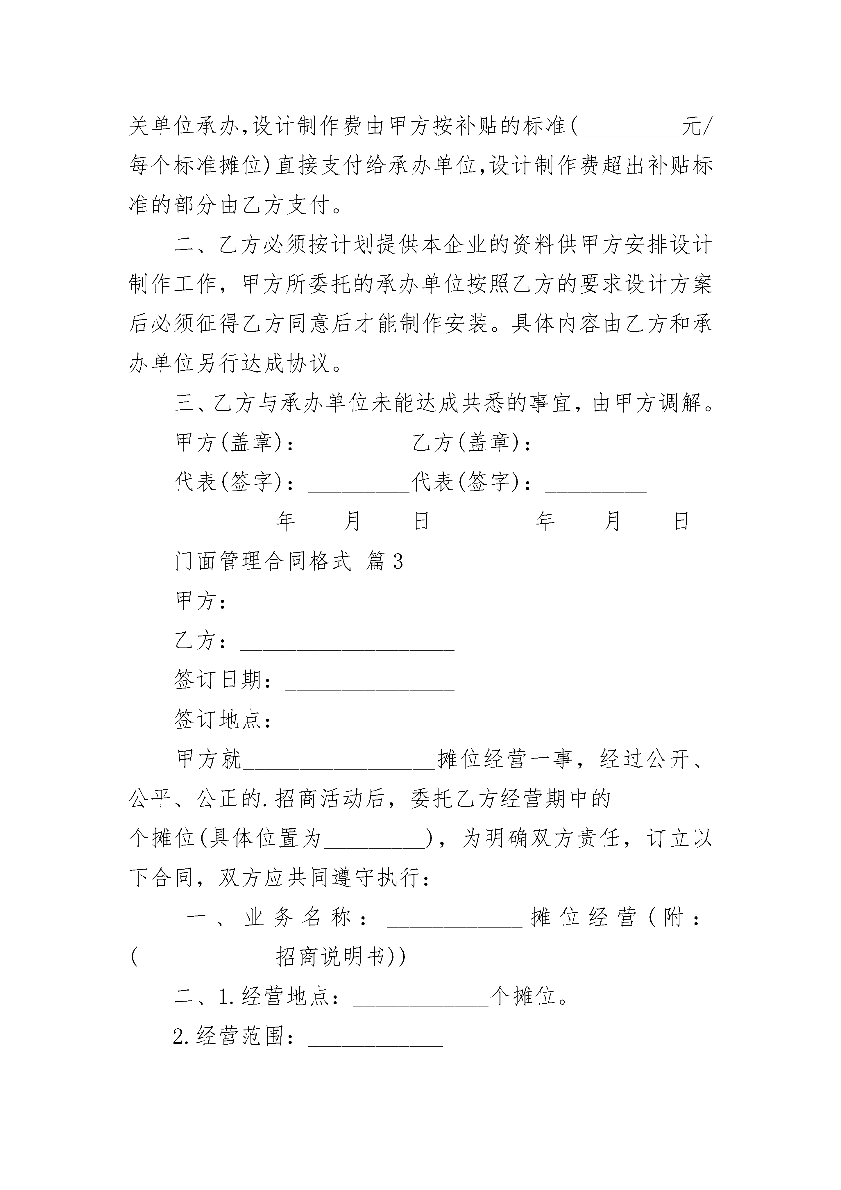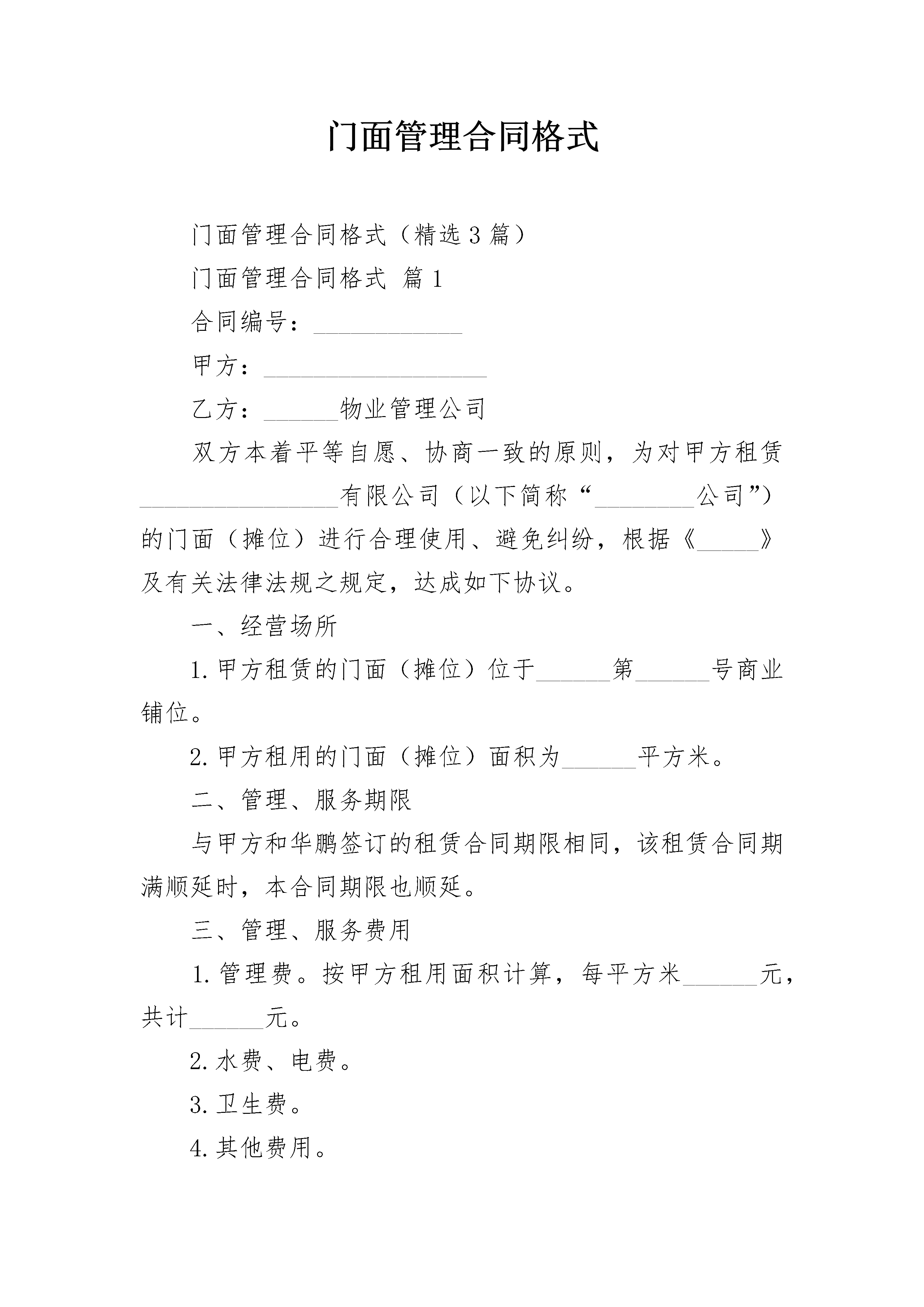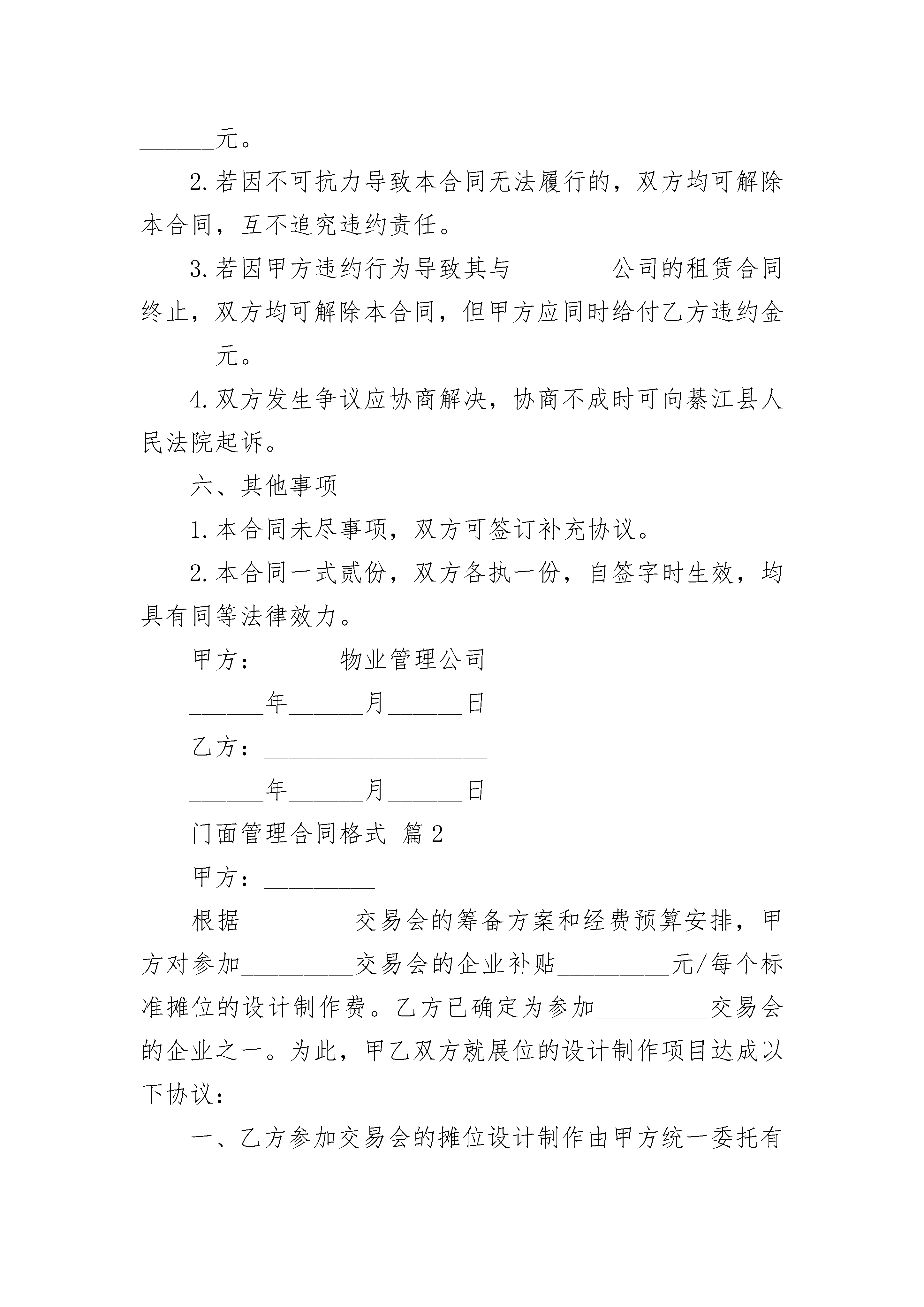 门面管理合同格式门面管理合同格式(精选3篇)门面管理合同格式篇1合同编号:____________甲方:__________________乙方:______物业管理公司双方本着平等自愿、协商一致的原则,为对甲方租赁________________有限公司(以下简称“________公司”)的门面(摊位)进行合理使用、避免纠纷,根据《_____》及有关法律法规之规定,达成如下协议。一、经营场所1.甲方租赁的门面(摊位)位于______第______号商业铺位。2.甲方租用的门面(摊位)面积为______平方米。二、管理、服务期限与甲方和华鹏签订的租赁合同期限相同,该租赁合同期满顺延时,本合同期限也顺延。三、管理、服务费用1.管理费。按甲方租用面积计算,每平方米______元,共计______元。2.水费、电费。3.卫生费。4.其他费用。四、双方权利义务1.甲方不得超越经营范围和违反国家法律、法规、行政规章的规定从事其它经营活动。2.乙方制订的各种规章制度在不违反国家法律、法规强制性规定的情况下,甲方应当遵守。3.甲方必须按乙方统一的作息时间从事经营活动。4.乙方必须遵守甲方的管理制度,遵守安全消防规定,维护店容卫生。5.甲方应对自己及其雇员、消费者的人身和财产安全负责,若发生人身伤亡或财产损失,均由甲方自行承担。6.甲方出售的商品若出现质量问题或其他原因(包括本合同第5条的情形等)给消费者、购货人造成损害。乙方有权代甲方确认损失情况,并在确认损失大小后代为甲方赔偿,甲方必须在乙方确认赔偿金额后两日内向乙方交付代为赔偿金。7.甲方应妥善保管自己的商品和有关用品,若物品被盗、损毁、遗失等,除乙方有故意或重大过失行为外,乙方不承担任何经济和法律责任。8.甲方有权对乙方的经营活动是否合法、是否遵守店堂纪律和有关规章制度等进行监督,但甲方必须尊重乙方的经营权利,不得以监督为名干涉乙方的正常经营活动。五、合同解除及争议解决1.双方签订合同后,任何一方不得擅自单方解除本合同。否则,任何一方单方解除本合同,均应向对方给付违约金______元。2.若因不可抗力导致本合同无法履行的,双方均可解除本合同,互不追究违约责任。3.若因甲方违约行为导致其与________公司的租赁合同终止,双方均可解除本合同,但甲方应同时给付乙方违约金______元。4.双方发生争议应协商解决,协商不成时可向綦江县人民法院起诉。六、其他事项1.本合同未尽事项,双方可签订补充协议。2.本合同一式贰份,双方各执一份,自签字时生效,均具有同等法律效力。甲方:______物业管理公司______年______月______日乙方:________________________年______月______日门面管理合同格式篇2甲方:_________根据_________交易会的筹备方案和经费预算安排,甲方对参加_________交易会的企业补贴_________元/每个标准摊位的设计制作费。乙方已确定为参加_________交易会的企业之一。为此,甲乙双方就展位的设计制作项目达成以下协议:一、乙方参加交易会的摊位设计制作由甲方统一委托有关单位承办,设计制作费由甲方按补贴的标准(_________元/每个标准摊位)直接支付给承办单位,设计制作费超出补贴标准的部分由乙方支付。二、乙方必须按计划提供本企业的资料供甲方安排设计制作工作,甲方所委托的承办单位按照乙方的要求设计方案后必须征得乙方同意后才能制作安装。具体内容由乙方和承办单位另行达成协议。三、乙方与承办单位未能达成共悉的事宜,由甲方调解。甲方(盖章):_________乙方(盖章):_________代表(签字):_________代表(签字):__________________年____月____日_________年____月____日门面管理合同格式篇3甲方:___________________乙方:___________________签订日期:_______________签订地点:_______________甲方就_________________摊位经营一事,经过公开、公平、公正的.招商活动后,委托乙方经营期中的_________个摊位(具体位置为_________),为明确双方责任,订立以下合同,双方应共同遵守执行:一、业务名称:____________摊位经营(附:(____________招商说明书))二、1.经营地点:____________个摊位。2.经营范围:____________3.经营品种及单价:____________三、1.经营期限:______年_______月_______日至_______年_______月_______日2.营业时间:由甲乙双方协商确定。四、结算方式1.合