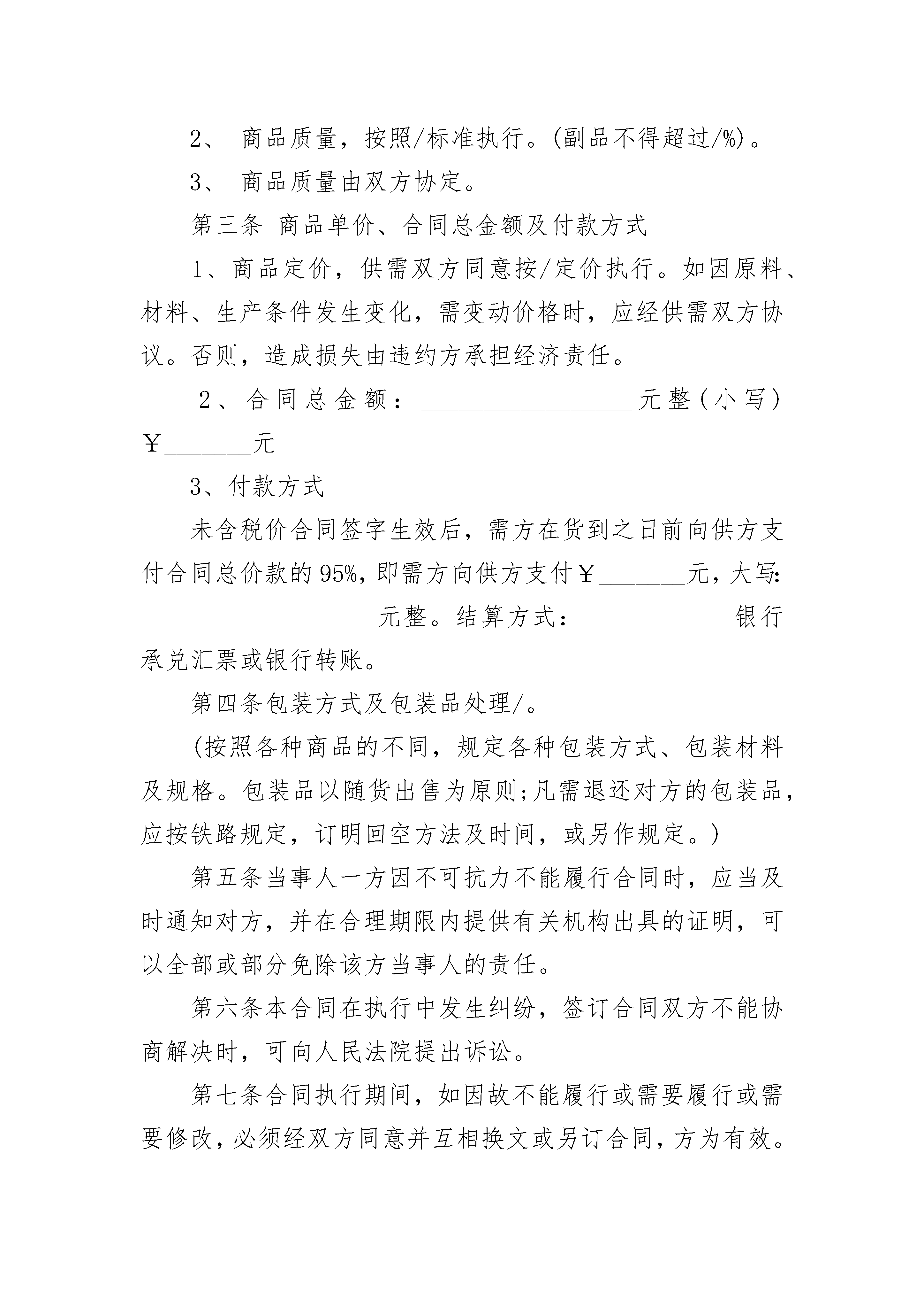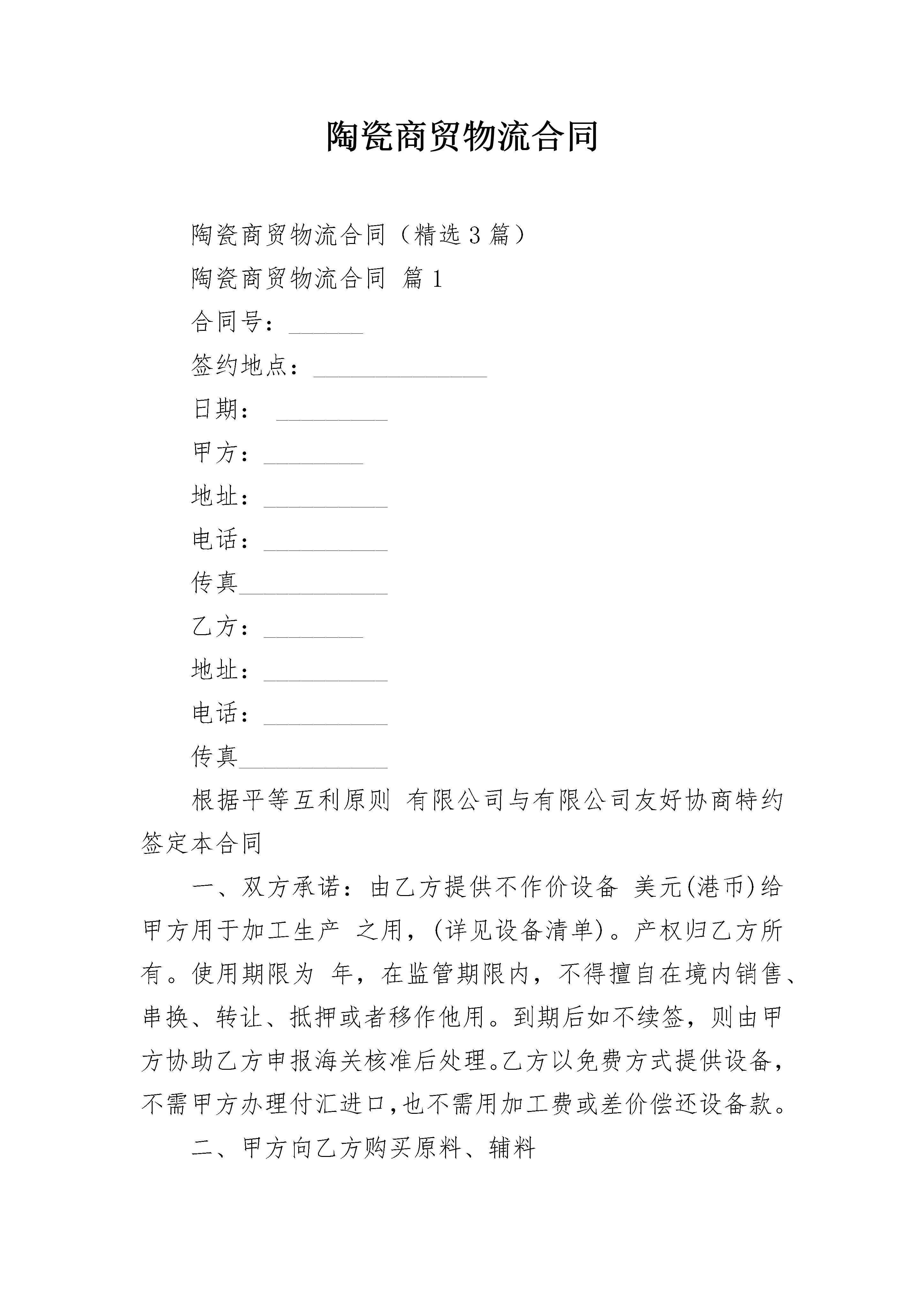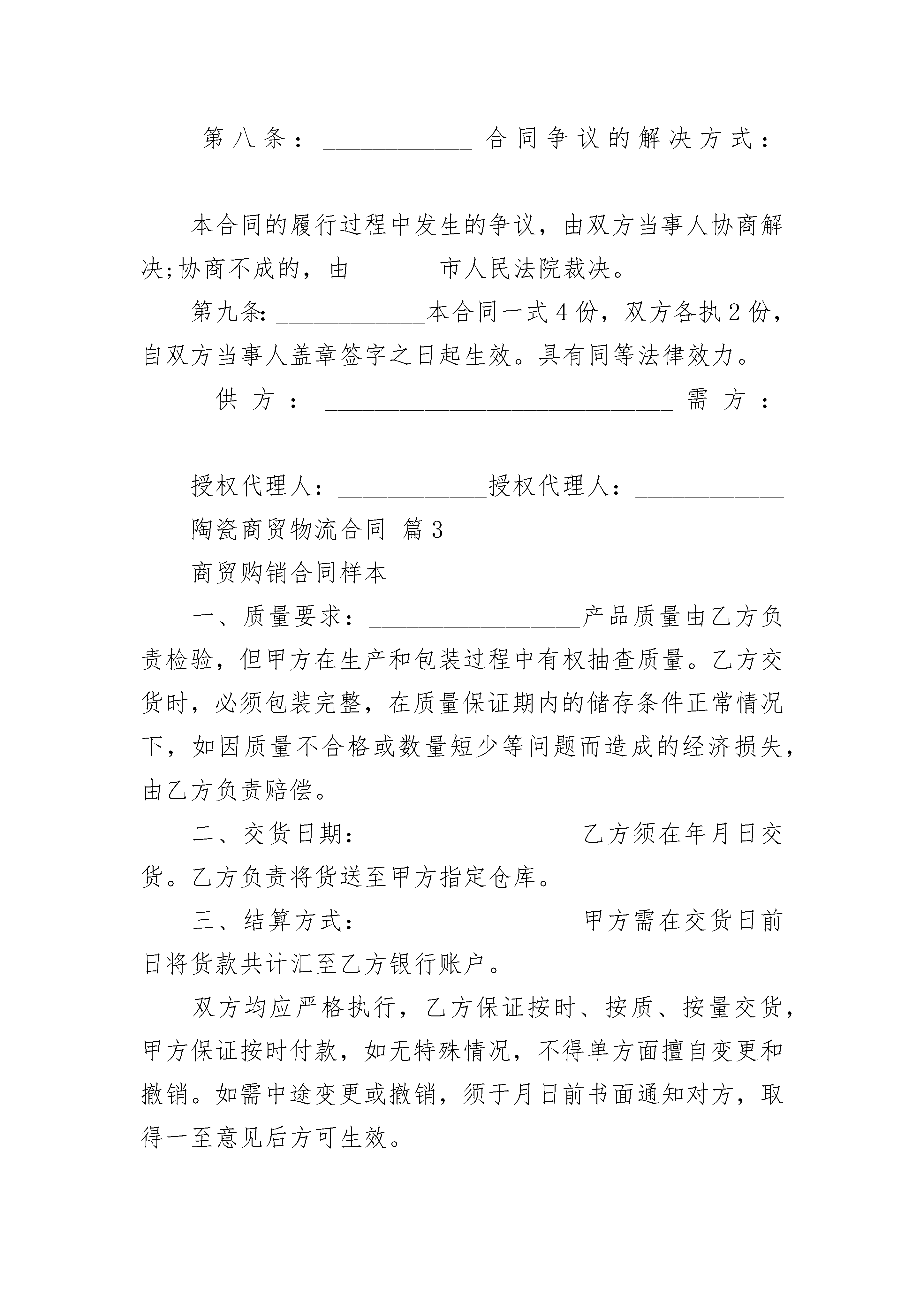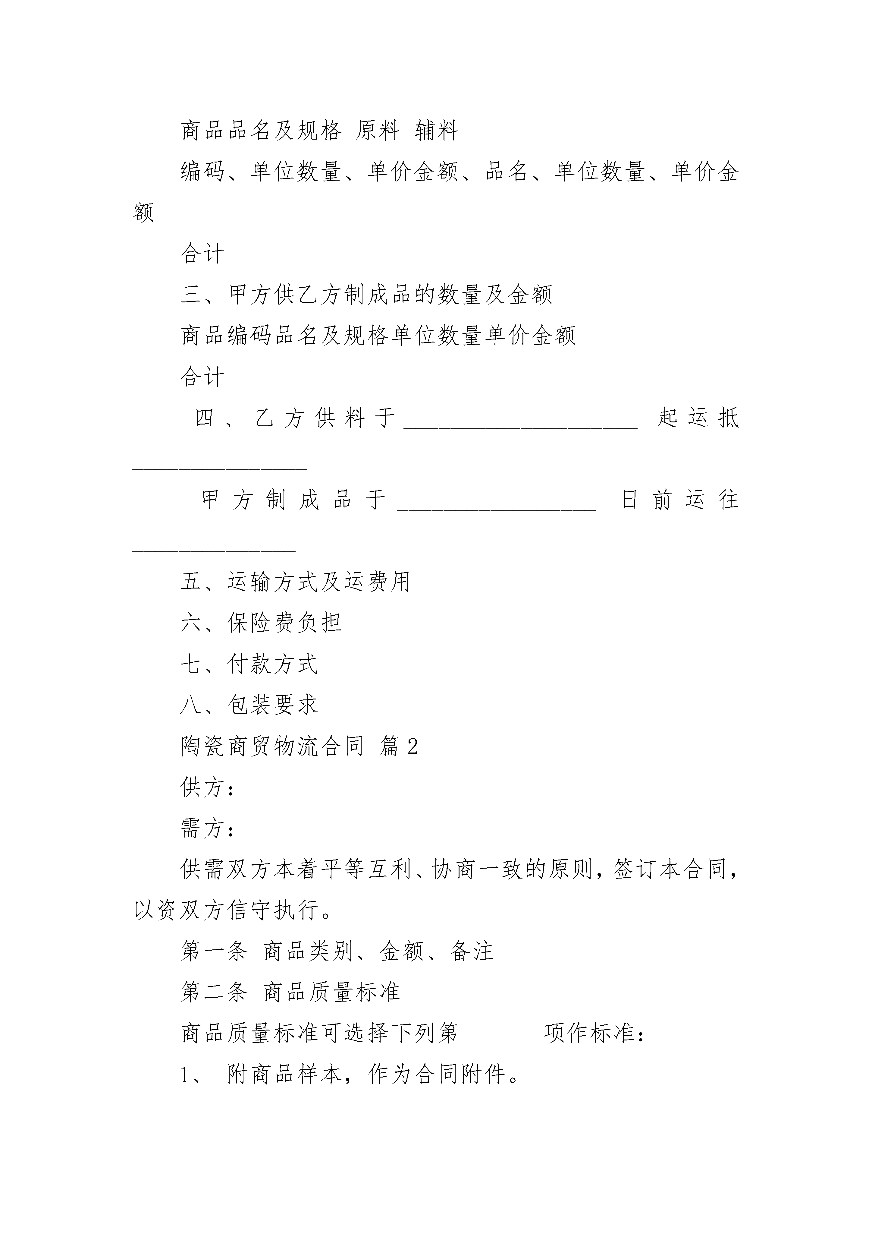陶瓷商贸物流合同陶瓷商贸物流合同(精选3篇)陶瓷商贸物流合同篇1合同号:______签约地点:______________日期:_________甲方:________地址:__________电话:__________传真____________乙方:________地址:__________电话:__________传真____________根据平等互利原则有限公司与有限公司友好协商特约签定本合同一、双方承诺:由乙方提供不作价设备美元(港币)给甲方用于加工生产之用,(详见设备清单)。产权归乙方所有。使用期限为年,在监管期限内,不得擅自在境内销售、串换、转让、抵押或者移作他用。到期后如不续签,则由甲方协助乙方申报海关核准后处理。乙方以免费方式提供设备,不需甲方办理付汇进口,也不需用加工费或差价偿还设备款。二、甲方向乙方购买原料、辅料商品品名及规格原料辅料编码、单位数量、单价金额、品名、单位数量、单价金额合计三、甲方供乙方制成品的数量及金额商品编码品名及规格单位数量单价金额合计四、乙方供料于____________________起运抵_______________甲方制成品于_________________日前运往______________五、运输方式及运费用六、保险费负担七、付款方式八、包装要求陶瓷商贸物流合同篇2供方:____________________________________需方:____________________________________供需双方本着平等互利、协商一致的原则,签订本合同,以资双方信守执行。第一条商品类别、金额、备注第二条商品质量标准商品质量标准可选择下列第_______项作标准:1、附商品样本,作为合同附件。2、商品质量,按照/标准执行。(副品不得超过/%)。3、商品质量由双方协定。第三条商品单价、合同总金额及付款方式1、商品定价,供需双方同意按/定价执行。如因原料、材料、生产条件发生变化,需变动价格时,应经供需双方协议。否则,造成损失由违约方承担经济责任。2、合同总金额:_________________元整(小写)¥_______元3、付款方式未含税价合同签字生效后,需方在货到之日前向供方支付合同总价款的95%,即需方向供方支付¥_______元,大写:___________________元整。结算方式:____________银行承兑汇票或银行转账。第四条包装方式及包装品处理/。(按照各种商品的不同,规定各种包装方式、包装材料及规格。包装品以随货出售为原则;凡需退还对方的包装品,应按铁路规定,订明回空方法及时间,或另作规定。)第五条当事人一方因不可抗力不能履行合同时,应当及时通知对方,并在合理期限内提供有关机构出具的证明,可以全部或部分免除该方当事人的责任。第六条本合同在执行中发生纠纷,签订合同双方不能协商解决时,可向人民法院提出诉讼。第七条合同执行期间,如因故不能履行或需要履行或需要修改,必须经双方同意并互相换文或另订合同,方为有效。第八条:____________合同争议的解决方式:____________本合同的履行过程中发生的争议,由双方当事人协商解决;协商不成的,由_______市人民法院裁决。第九条:____________本合同一式4份,双方各执2份,自双方当事人盖章签字之日起生效。具有同等法律效力。供方:____________________________需方:___________________________授权代理人:____________授权代理人:____________陶瓷商贸物流合同篇3商贸购销合同样本一、质量要求:_________________产品质量由乙方负责检验,但甲方在生产和包装过程中有权抽查质量。乙方交货时,必须包装完整,在质量保证期内的储存条件正常情况下,如因质量不合格或数量短少等问题而造成的经济损失,由乙方负责赔偿。二、交货日期:_________________乙方须在年月日交货。乙方负责将货送至甲方指定仓库。三、结算方式:_________________甲方需在交货日前日将货款共计汇至乙方银行账户。双方均应严格执行,乙方保证按时、按质、按量交货,甲方保证按时付款,如无特殊情况,不得单方面擅自变更和撤销。如需中途变更或撤销,须于月日前书面通知对方,取得一至意见后方可生效。四、解决合同争议的方式:_________________合同执行过程中如发生纠纷,双方应首先协商解决;协商不成时,由仲裁委员会仲裁。