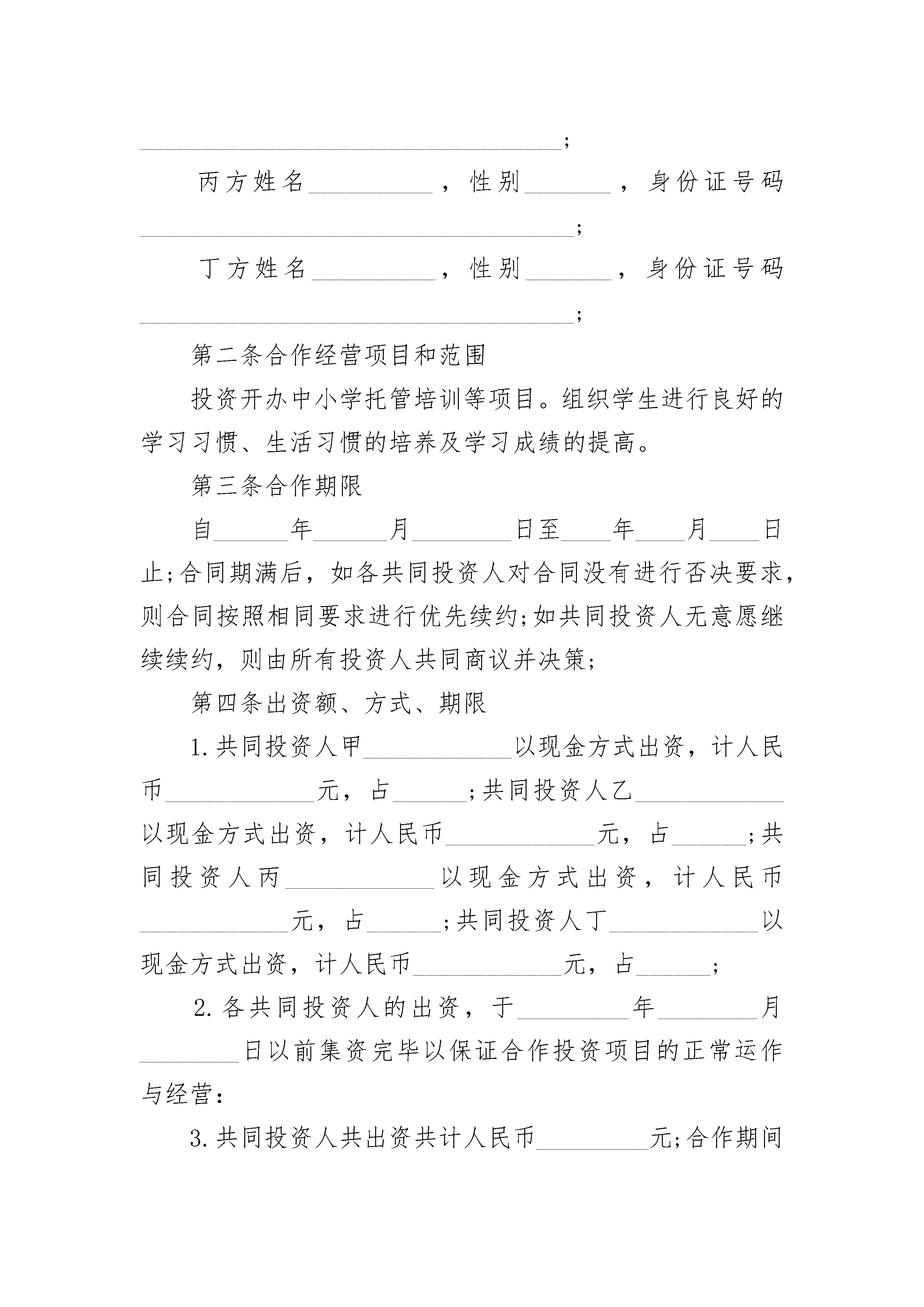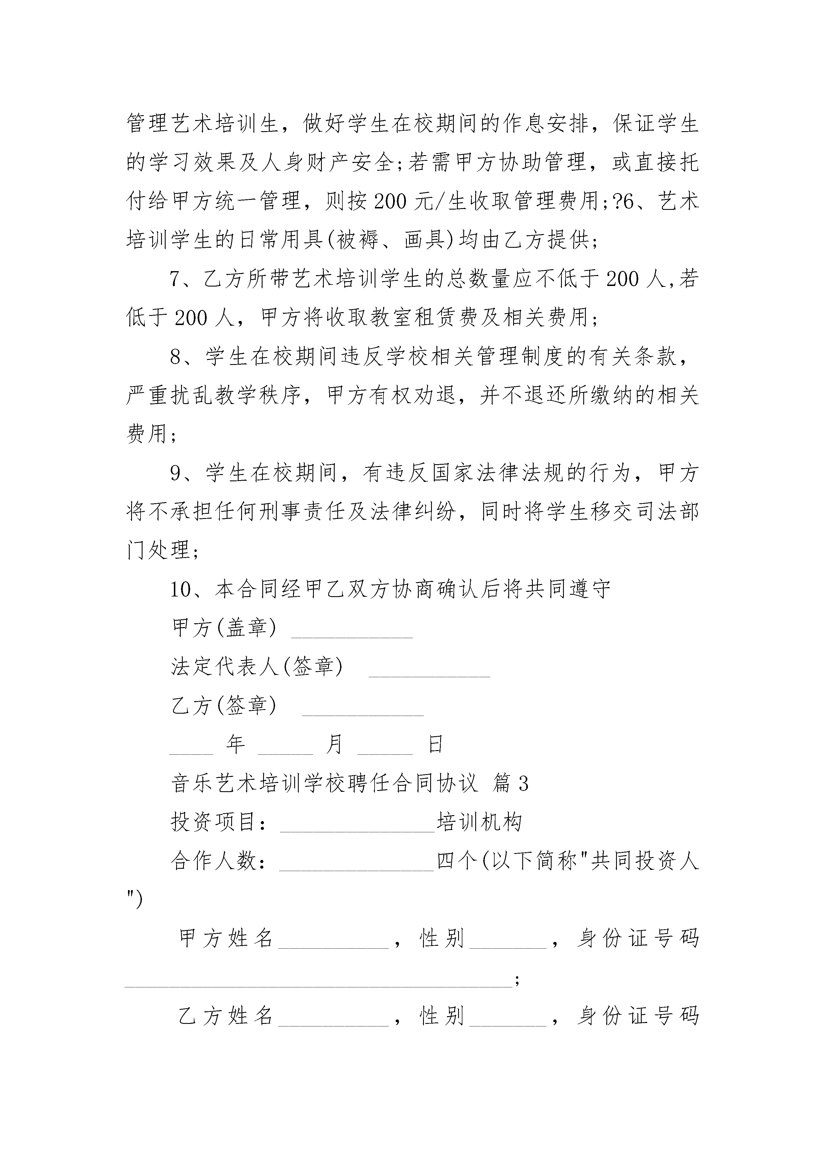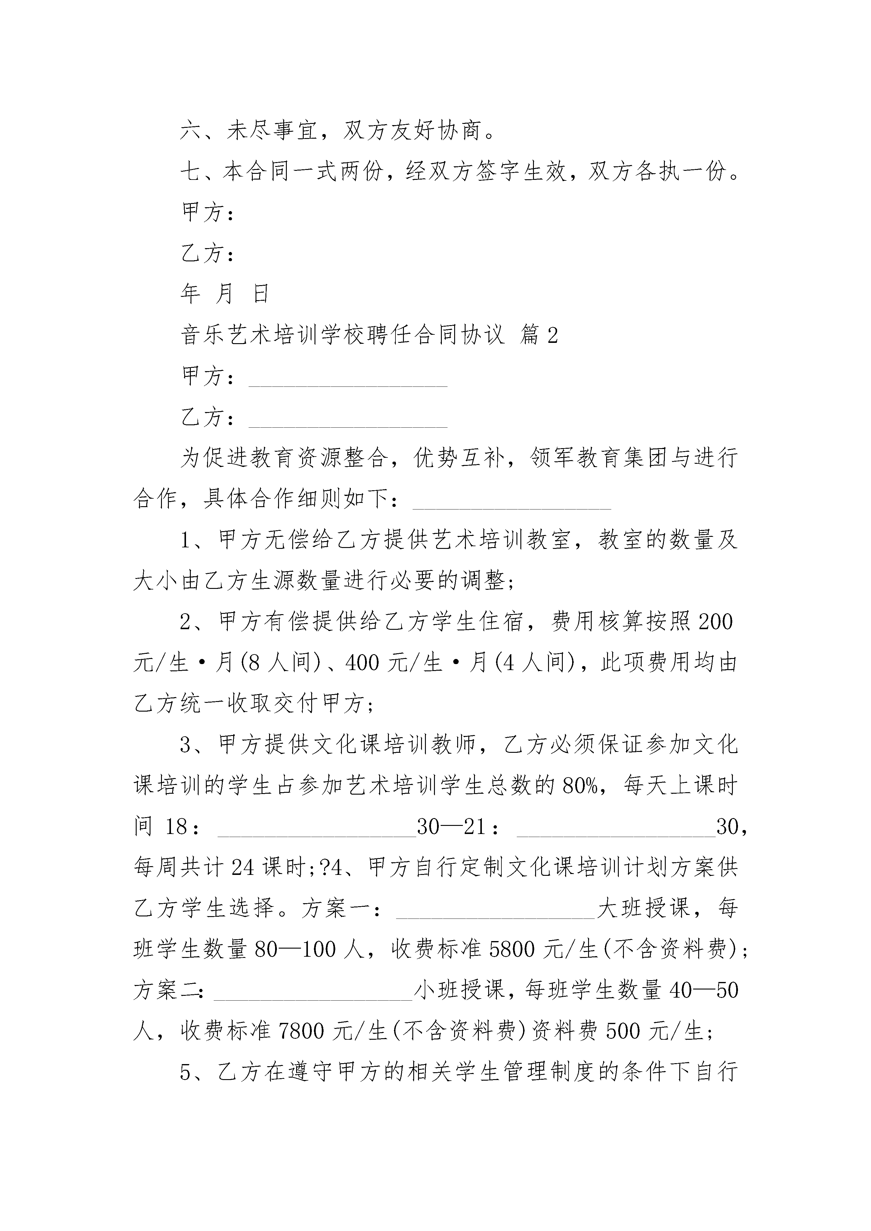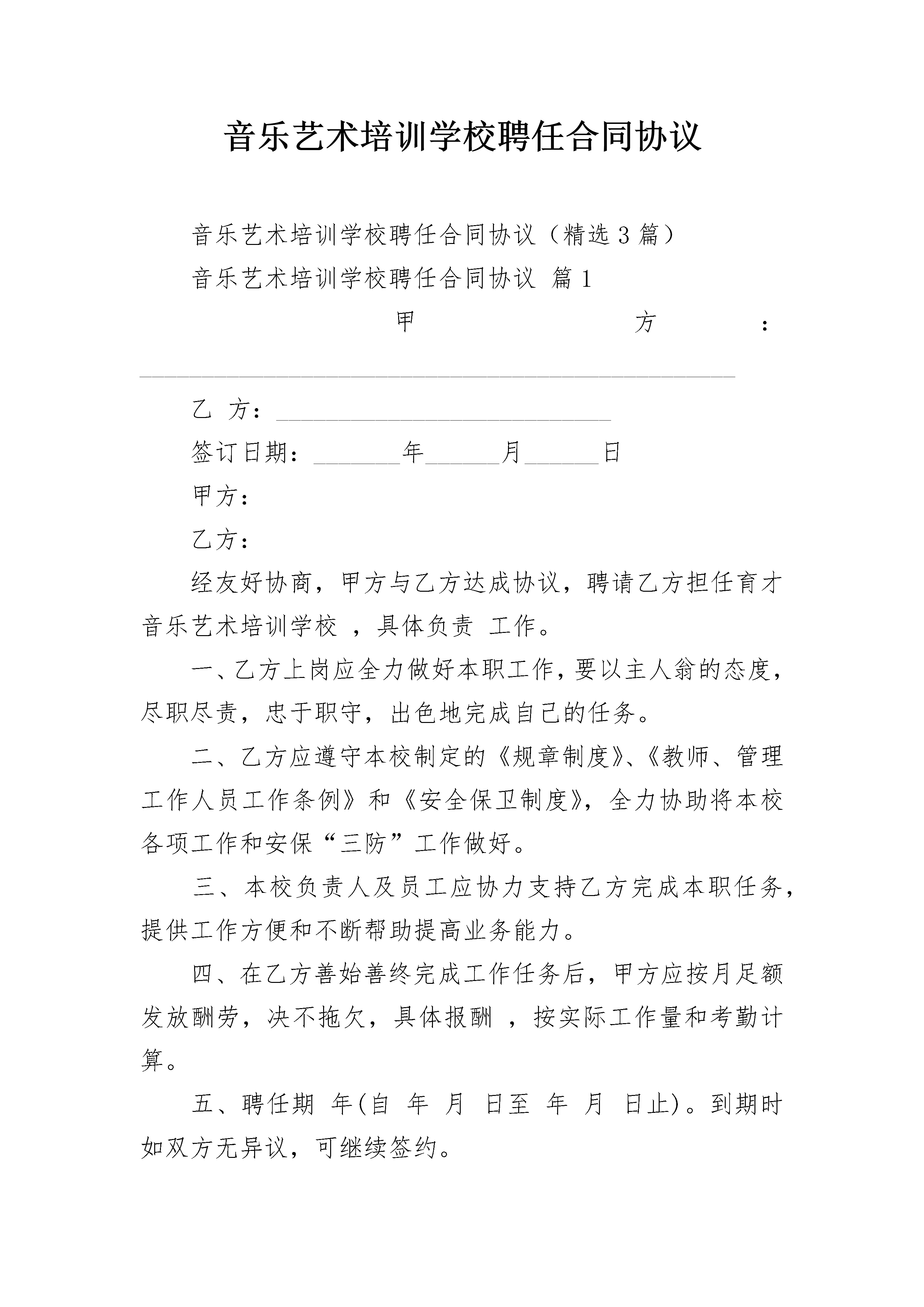 音乐艺术培训学校聘任合同协议音乐艺术培训学校聘任合同协议(精选3篇)音乐艺术培训学校聘任合同协议篇1甲方:________________________________________________乙方:___________________________签订日期:_______年______月______日甲方:乙方:经友好协商,甲方与乙方达成协议,聘请乙方担任育才音乐艺术培训学校,具体负责工作。一、乙方上岗应全力做好本职工作,要以主人翁的态度,尽职尽责,忠于职守,出色地完成自己的任务。二、乙方应遵守本校制定的《规章制度》、《教师、管理工作人员工作条例》和《安全保卫制度》,全力协助将本校各项工作和安保“三防”工作做好。三、本校负责人及员工应协力支持乙方完成本职任务,提供工作方便和不断帮助提高业务能力。四、在乙方善始善终完成工作任务后,甲方应按月足额发放酬劳,决不拖欠,具体报酬,按实际工作量和考勤计算。五、聘任期年(自年月日至年月日止)。到期时如双方无异议,可继续签约。六、未尽事宜,双方友好协商。七、本合同一式两份,经双方签字生效,双方各执一份。甲方:乙方:年月日音乐艺术培训学校聘任合同协议篇2甲方:_________________乙方:_________________为促进教育资源整合,优势互补,领军教育集团与进行合作,具体合作细则如下:_________________1、甲方无偿给乙方提供艺术培训教室,教室的数量及大小由乙方生源数量进行必要的调整;2、甲方有偿提供给乙方学生住宿,费用核算按照200元/生·月(8人间)、400元/生·月(4人间),此项费用均由乙方统一收取交付甲方;3、甲方提供文化课培训教师,乙方必须保证参加文化课培训的学生占参加艺术培训学生总数的80%,每天上课时间18:_________________30—21:_________________30,每周共计24课时;?4、甲方自行定制文化课培训计划方案供乙方学生选择。方案一:_________________大班授课,每班学生数量80—100人,收费标准5800元/生(不含资料费);方案二:_________________小班授课,每班学生数量40—50人,收费标准7800元/生(不含资料费)资料费500元/生;5、乙方在遵守甲方的相关学生管理制度的条件下自行管理艺术培训生,做好学生在校期间的作息安排,保证学生的学习效果及人身财产安全;若需甲方协助管理,或直接托付给甲方统一管理,则按200元/生收取管理费用;?6、艺术培训学生的日常用具(被褥、画具)均由乙方提供;7、乙方所带艺术培训学生的总数量应不低于200人,若低于200人,甲方将收取教室租赁费及相关费用;8、学生在校期间违反学校相关管理制度的有关条款,严重扰乱教学秩序,甲方有权劝退,并不退还所缴纳的相关费用;9、学生在校期间,有违反国家法律法规的行为,甲方将不承担任何刑事责任及法律纠纷,同时将学生移交司法部门处理;10、本合同经甲乙双方协商确认后将共同遵守甲方(盖章)___________法定代表人(签章)___________乙方(签章)_______________年_____月_____日音乐艺术培训学校聘任合同协议篇3投资项目:______________培训机构合作人数:______________四个(以下简称"共同投资人")甲方姓名__________,性别_______,身份证号码___________________________________;乙方姓名__________,性别_______,身份证号码__________________________________;丙方姓名__________,性别_______,身份证号码___________________________________;丁方姓名__________,性别_______,身份证号码___________________________________;第二条合作经营项目和范围投资开办中小学托管培训等项目。组织学生进行良好的学习习惯、生活习惯的培养及学习成绩的提高。第三条合作期限自______年______月________日至____年____月____日止;合同期满后,如各共同投资人对合同没有进行否决要求,则合同按照相同要求进行优先续约;如共同投资人无意愿继续续约,则由所有投资人共同商议并决策;第四条出资额、方式、期限1.共同投资人甲____________以现金方式出资,计人民币____________元,占______;共同投资人乙____________以现金方式出资,计人民币____________元,占______;共同投资人丙____________以现金方式出