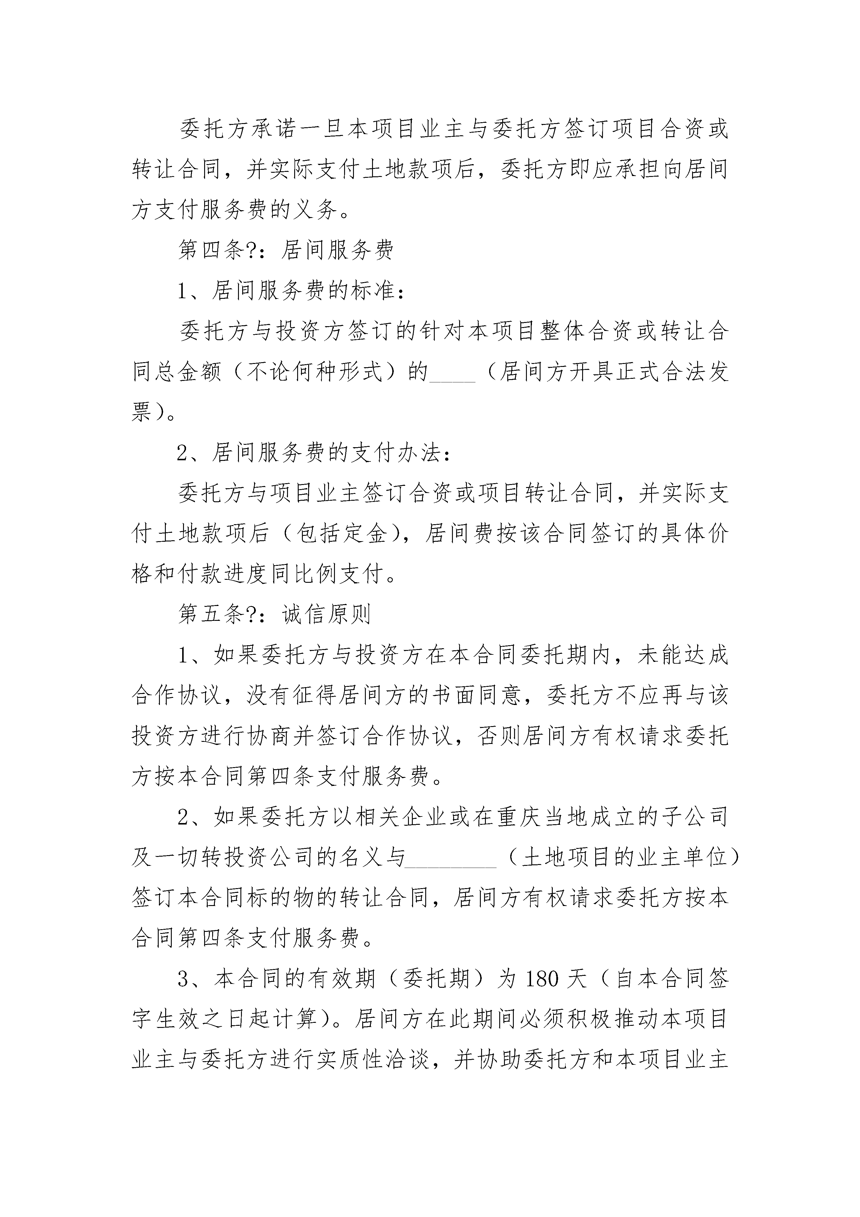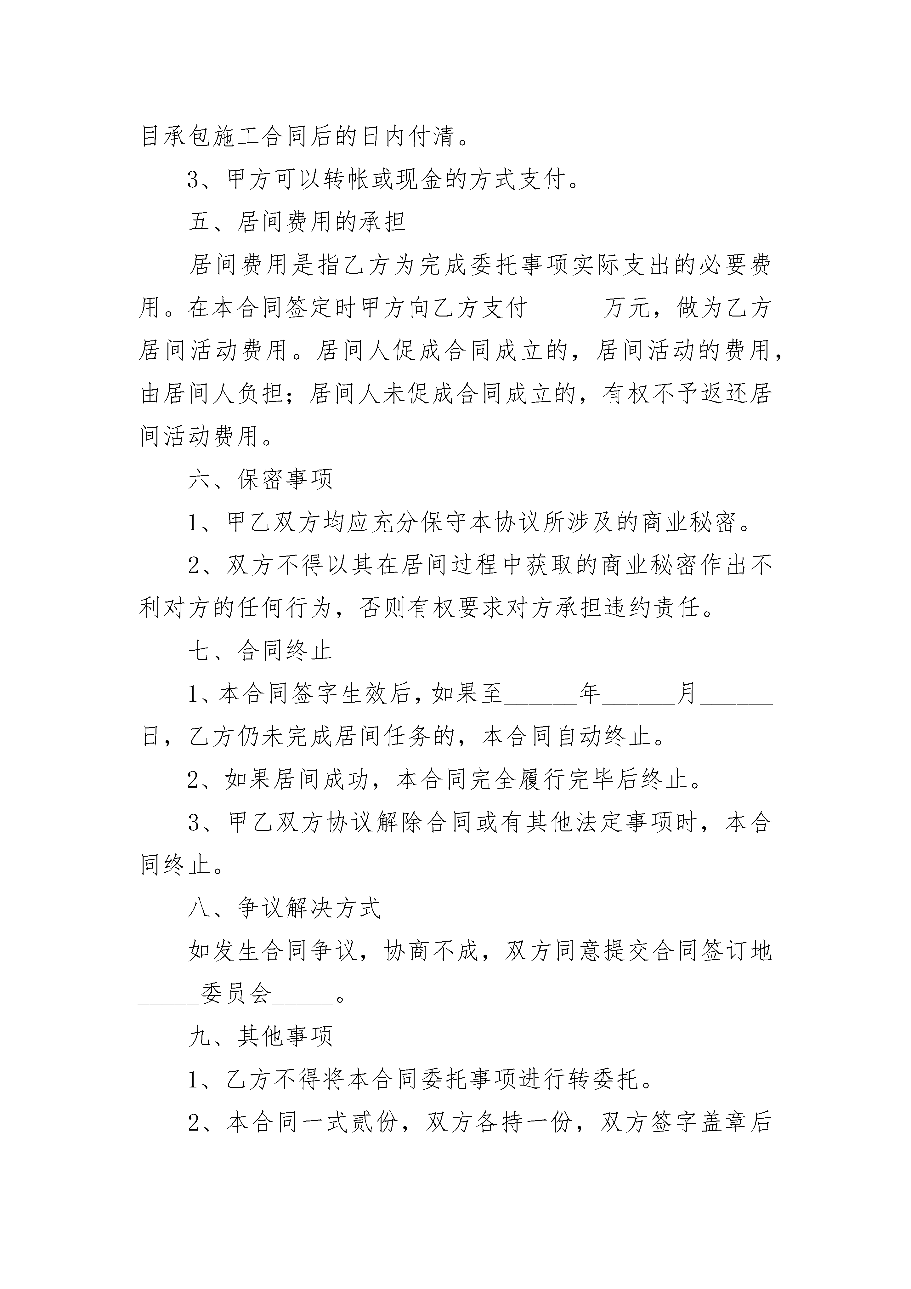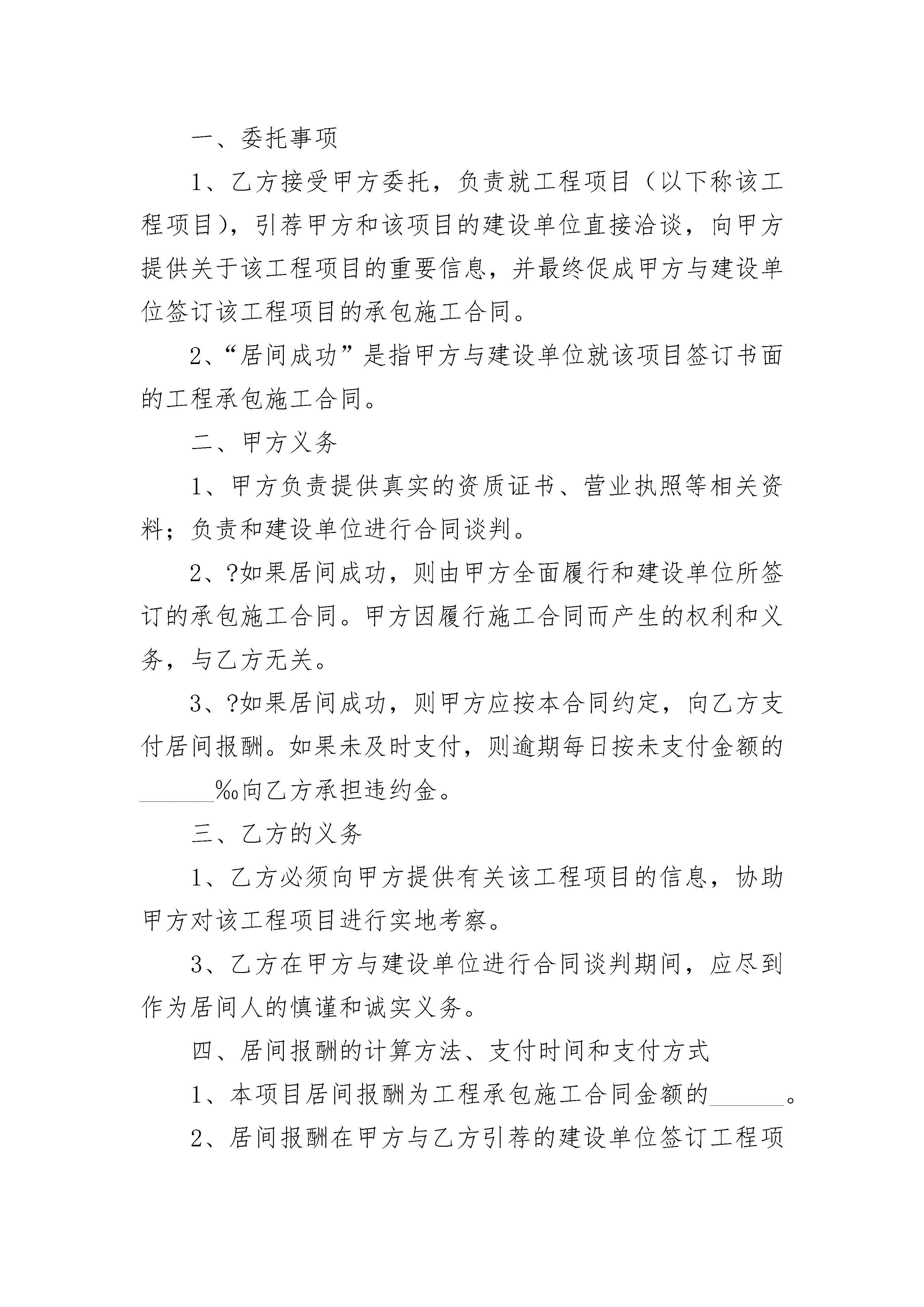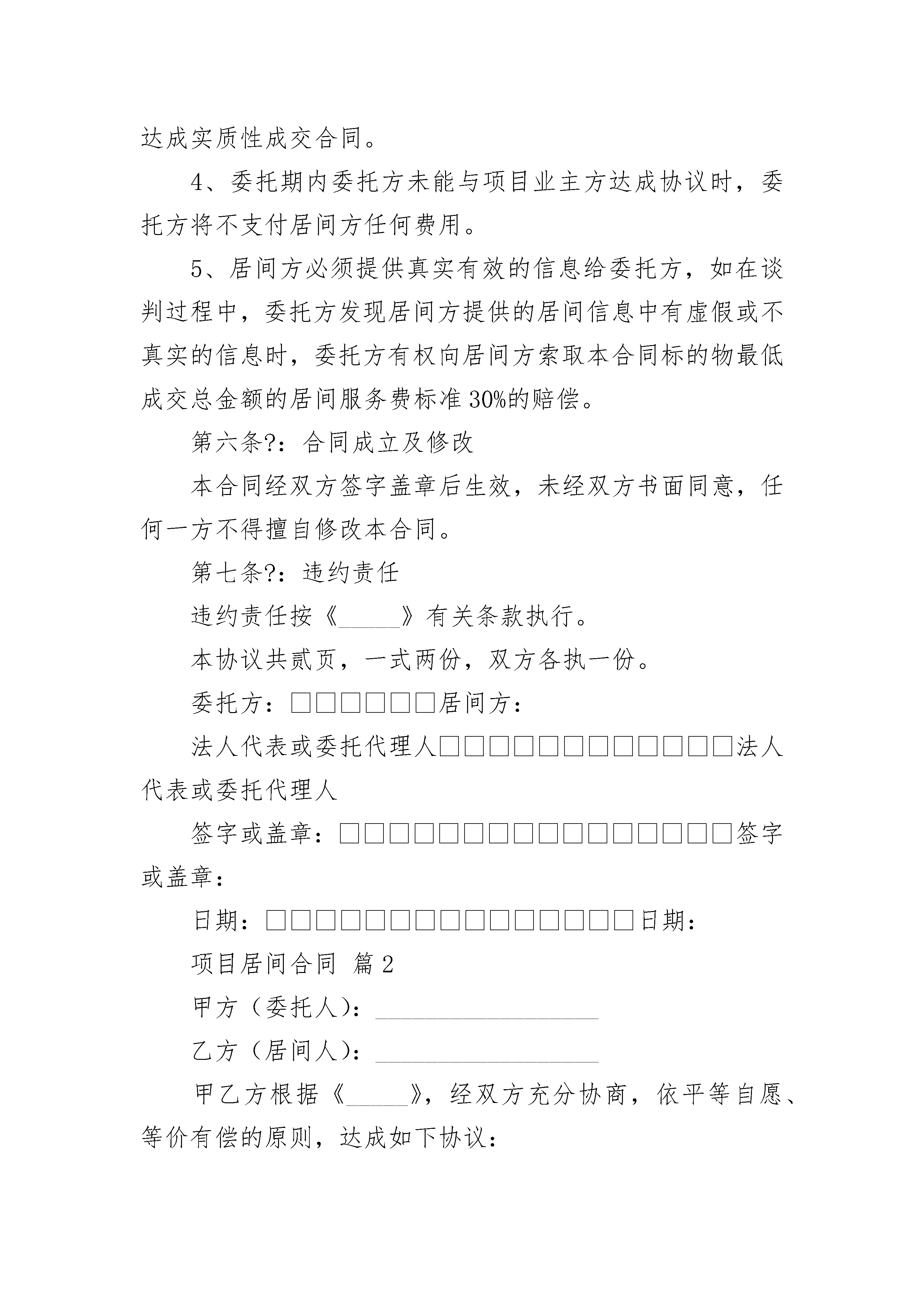 项目居间合同项目居间合同(精选23篇)项目居间合同篇1项目居间合同委托方:地址:居间方:地址:居间方受委托方委托,双方就居间方向委托方提供有关居间服务、顾问服务等事项,经协商一致,签订本合同。第一条?:合同标的物居间方向委托方提供______________土地的转让。第二条?:居间方义务1、居间方应积极认真地把委托方介绍给项目业主,并及时沟通情况。2、居间方协助委托方做好该宗土地项目的前期投资策划及沟通工作。3、居间方应积极努力做好居间介绍,协调有关矛盾,促成委托方与项目业主方签订合资或转让合同。4、居间方应协助项目当事人做好有关部门对项目的技术指标的审批工作,促成项目成功签约。第三条?:委托方义务委托方承诺一旦本项目业主与委托方签订项目合资或转让合同,并实际支付土地款项后,委托方即应承担向居间方支付服务费的义务。第四条?:居间服务费1、居间服务费的标准:委托方与投资方签订的针对本项目整体合资或转让合同总金额(不论何种形式)的____(居间方开具正式合法发票)。2、居间服务费的支付办法:委托方与项目业主签订合资或项目转让合同,并实际支付土地款项后(包括定金),居间费按该合同签订的具体价格和付款进度同比例支付。第五条?:诚信原则1、如果委托方与投资方在本合同委托期内,未能达成合作协议,没有征得居间方的书面同意,委托方不应再与该投资方进行协商并签订合作协议,否则居间方有权请求委托方按本合同第四条支付服务费。2、如果委托方以相关企业或在重庆当地成立的子公司及一切转投资公司的名义与________(土地项目的业主单位)签订本合同标的物的转让合同,居间方有权请求委托方按本合同第四条支付服务费。3、本合同的有效期(委托期)为180天(自本合同签字生效之日起计算)。居间方在此期间必须积极推动本项目业主与委托方进行实质性洽谈,并协助委托方和本项目业主达成实质性成交合同。4、委托期内委托方未能与项目业主方达成协议时,委托方将不支付居间方任何费用。5、居间方必须提供真实有效的信息给委托方,如在谈判过程中,委托方发现居间方提供的居间信息中有虚假或不真实的信息时,委托方有权向居间方索取本合同标的物最低成交总金额的居间服务费标准30%的赔偿。第六条?:合同成立及修改本合同经双方签字盖章后生效,未经双方书面同意,任何一方不得擅自修改本合同。第七条?:违约责任违约责任按《_____》有关条款执行。本协议共贰页,一式两份,双方各执一份。委托方:居间方:法人代表或委托代理人法人代表或委托代理人签字或盖章:签字或盖章:日期:日期:项目居间合同篇2甲方(委托人):__________________乙方(居间人):__________________甲乙方根据《_____》,经双方充分协商,依平等自愿、等价有偿的原则,达成如下协议:一、委托事项1、乙方接受甲方委托,负责就工程项目(以下称该工程项目),引荐甲方和该项目的建设单位直接洽谈,向甲方提供关于该工程项目的重要信息,并最终促成甲方与建设单位签订该工程项目的承包施工合同。2、“居间成功”是指甲方与建设单位就该项目签订书面的工程承包施工合同。二、甲方义务1、甲方负责提供真实的资质证书、营业执照等相关资料;负责和建设单位进行合同谈判。2、?如果居间成功,则由甲方全面履行和建设单位所签订的承包施工合同。甲方因履行施工合同而产生的权利和义务,与乙方无关。3、?如果居间成功,则甲方应按本合同约定,向乙方支付居间报酬。如果未及时支付,则逾期每日按未支付金额的______‰向乙方承担违约金。三、乙方的义务1、乙方必须向甲方提供有关该工程项目的信息,协助甲方对该工程项目进行实地考察。3、乙方在甲方与建设单位进行合同谈判期间,应尽到作为居间人的慎谨和诚实义务。四、居间报酬的计算方法、支付时间和支付方式1、本项目居间报酬为工程承包施工合同金额的______。2、居间报酬在甲方与乙方引荐的建设单位签订工程项目承包施工合同后的日内付清。3、甲方可以转帐或现金的方式支付。五、居间费用的承担居间费用是指乙方为完成委托事项实际支出的必要费用。在本合同签定时甲方向乙方支付______万元,做为乙方居间活动费用。居间人促成合同成立的,居间活动的费用,由居间人负担;居间人未促成合同成立的,有权不予返还居间活动费用。六、保密事项1、甲乙双方均应充分保守本协议所涉及的商业秘密。2、双方不得以其在居间过程中获取的商业秘密作出不利对方的任何行为,否则有权要求对方承担违约责任。七、合同终止1、本合同签字生效后,如果至______年______月______日,乙方仍未完成居间任务的,本合同自动终止。2、如果居间成功,本合同完全履行完毕后终止。3