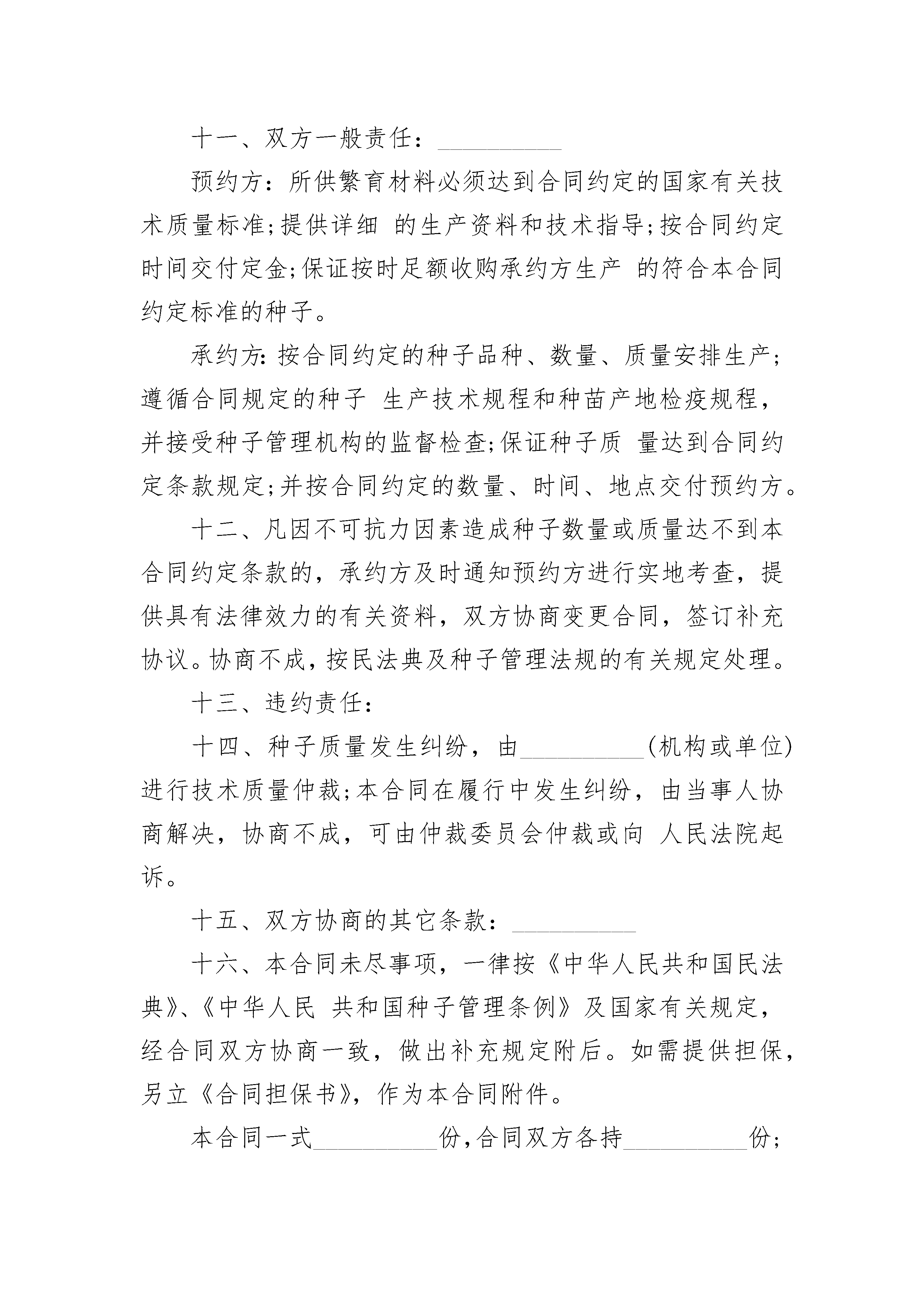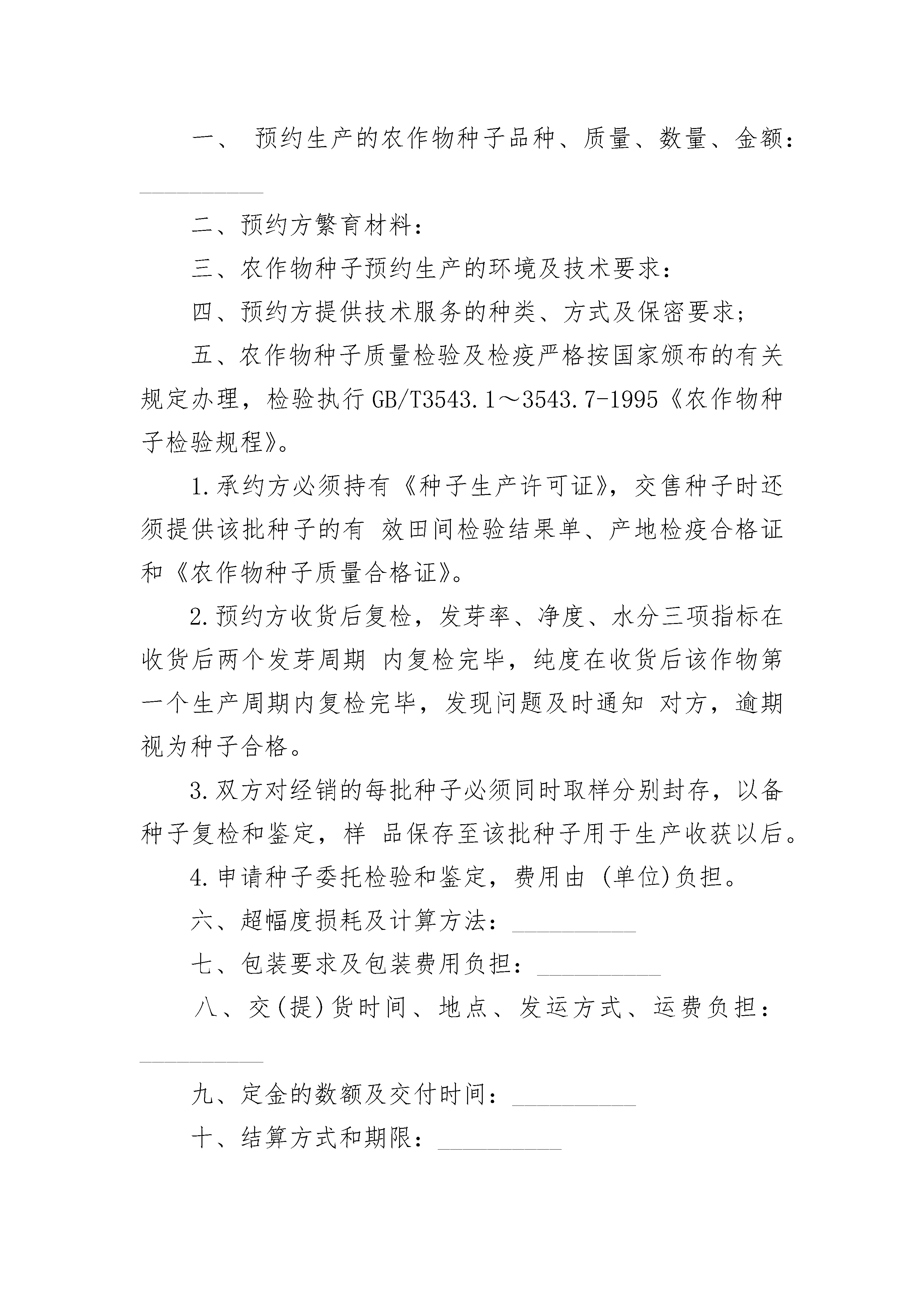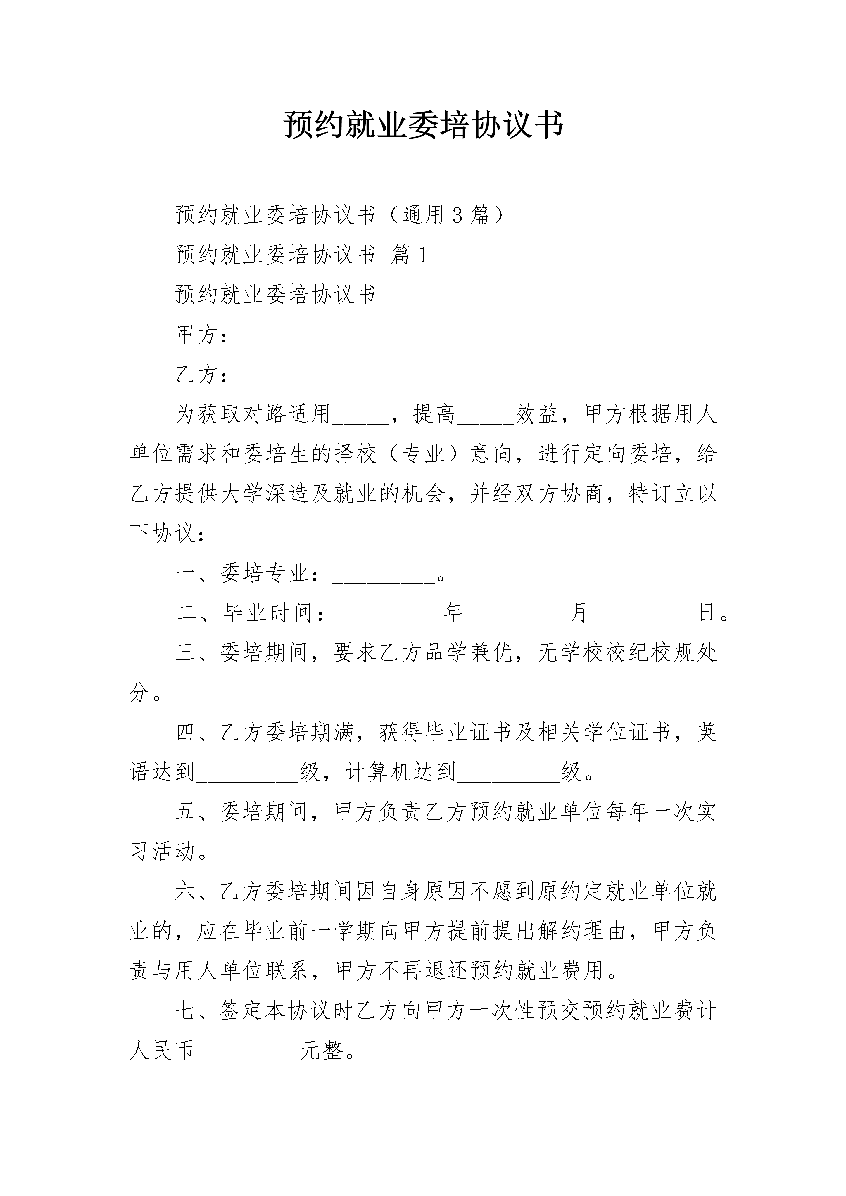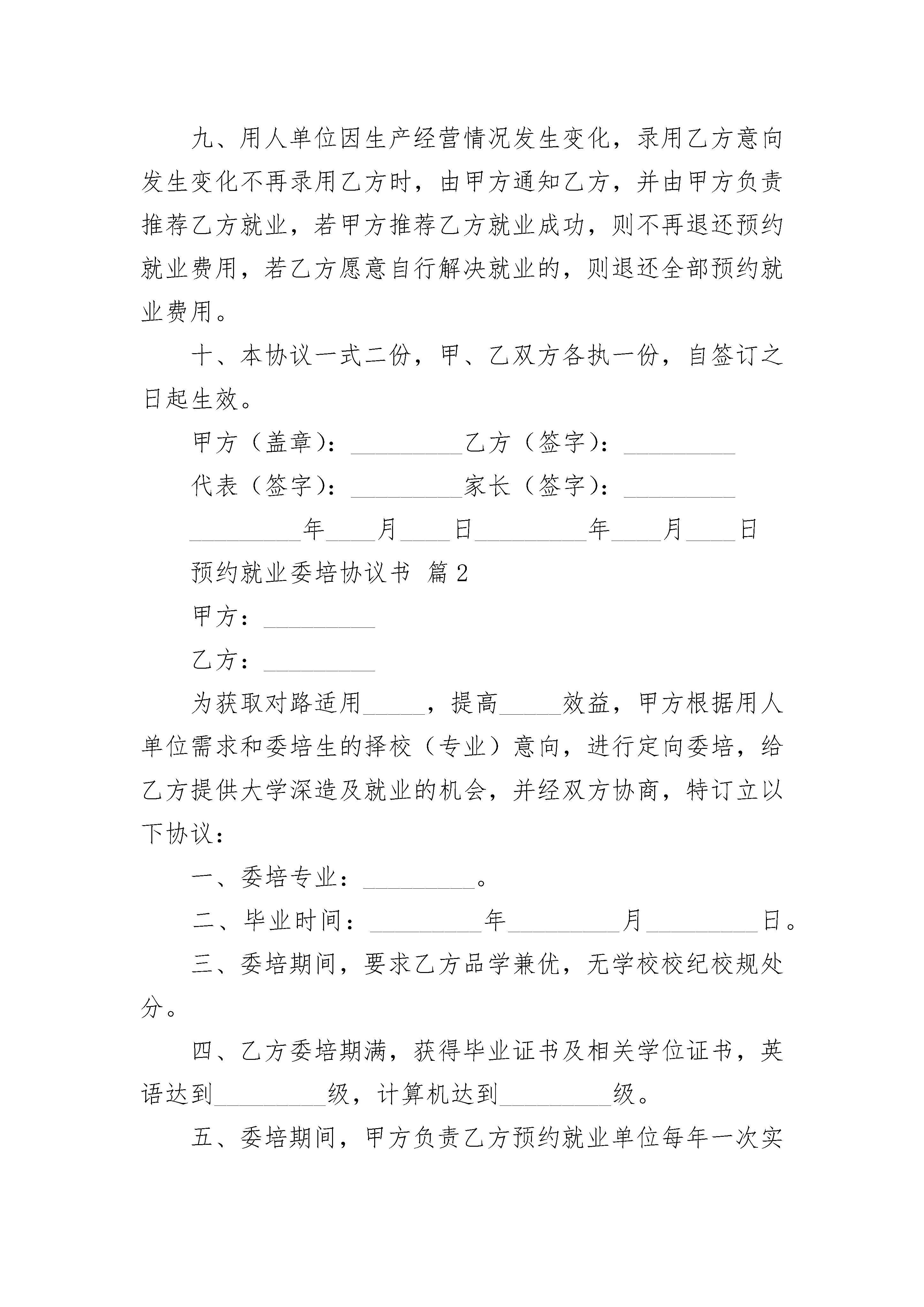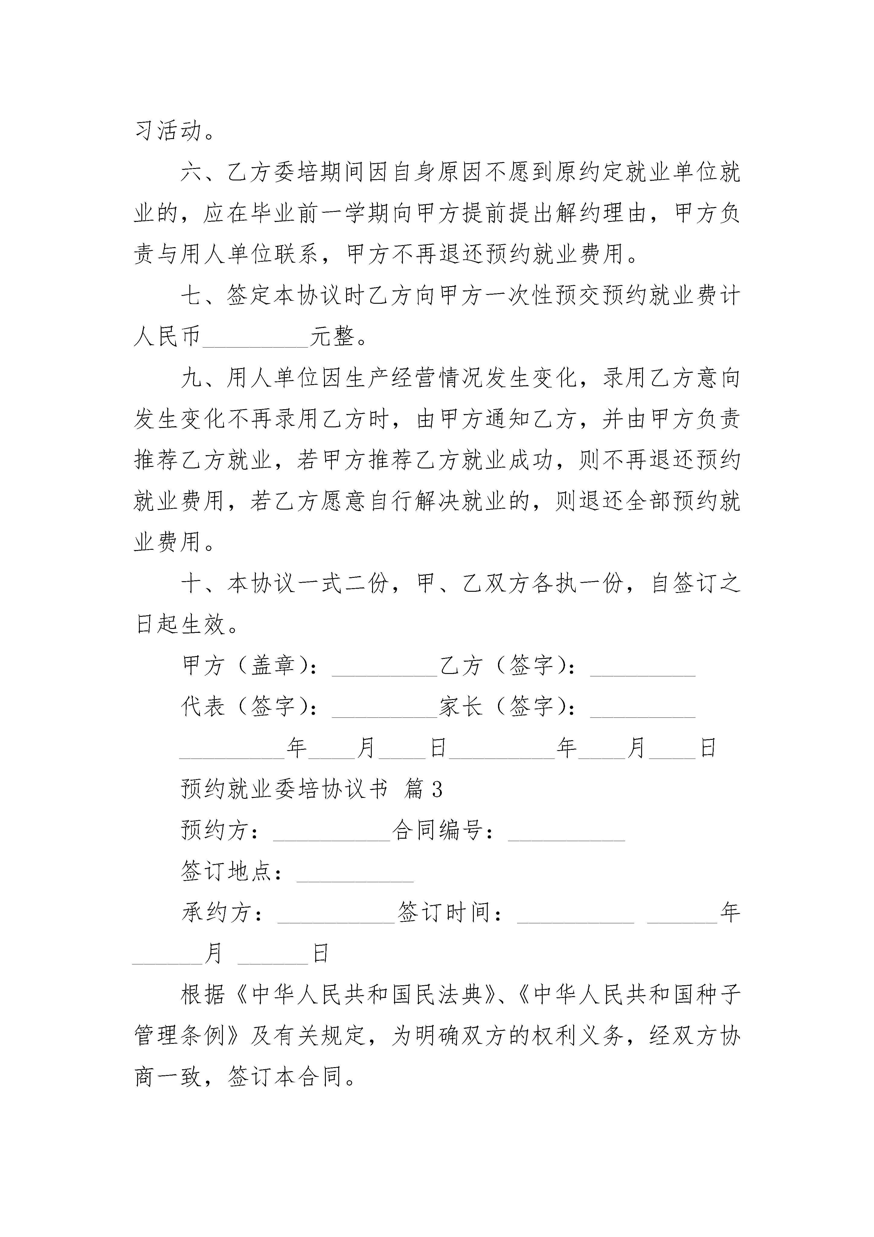 预约就业委培协议书预约就业委培协议书(通用3篇)预约就业委培协议书篇1预约就业委培协议书甲方:_________乙方:_________为获取对路适用_____,提高_____效益,甲方根据用人单位需求和委培生的择校(专业)意向,进行定向委培,给乙方提供大学深造及就业的机会,并经双方协商,特订立以下协议:一、委培专业:_________。二、毕业时间:_________年_________月_________日。三、委培期间,要求乙方品学兼优,无学校校纪校规处分。四、乙方委培期满,获得毕业证书及相关学位证书,英语达到_________级,计算机达到_________级。五、委培期间,甲方负责乙方预约就业单位每年一次实习活动。六、乙方委培期间因自身原因不愿到原约定就业单位就业的,应在毕业前一学期向甲方提前提出解约理由,甲方负责与用人单位联系,甲方不再退还预约就业费用。七、签定本协议时乙方向甲方一次性预交预约就业费计人民币_________元整。九、用人单位因生产经营情况发生变化,录用乙方意向发生变化不再录用乙方时,由甲方通知乙方,并由甲方负责推荐乙方就业,若甲方推荐乙方就业成功,则不再退还预约就业费用,若乙方愿意自行解决就业的,则退还全部预约就业费用。十、本协议一式二份,甲、乙双方各执一份,自签订之日起生效。甲方(盖章):_________乙方(签字):_________代表(签字):_________家长(签字):__________________年____月____日_________年____月____日预约就业委培协议书篇2甲方:_________乙方:_________为获取对路适用_____,提高_____效益,甲方根据用人单位需求和委培生的择校(专业)意向,进行定向委培,给乙方提供大学深造及就业的机会,并经双方协商,特订立以下协议:一、委培专业:_________。二、毕业时间:_________年_________月_________日。三、委培期间,要求乙方品学兼优,无学校校纪校规处分。四、乙方委培期满,获得毕业证书及相关学位证书,英语达到_________级,计算机达到_________级。五、委培期间,甲方负责乙方预约就业单位每年一次实习活动。六、乙方委培期间因自身原因不愿到原约定就业单位就业的,应在毕业前一学期向甲方提前提出解约理由,甲方负责与用人单位联系,甲方不再退还预约就业费用。七、签定本协议时乙方向甲方一次性预交预约就业费计人民币_________元整。九、用人单位因生产经营情况发生变化,录用乙方意向发生变化不再录用乙方时,由甲方通知乙方,并由甲方负责推荐乙方就业,若甲方推荐乙方就业成功,则不再退还预约就业费用,若乙方愿意自行解决就业的,则退还全部预约就业费用。十、本协议一式二份,甲、乙双方各执一份,自签订之日起生效。甲方(盖章):_________乙方(签字):_________代表(签字):_________家长(签字):__________________年____月____日_________年____月____日预约就业委培协议书篇3预约方:__________合同编号:__________签订地点:__________承约方:__________签订时间:________________年______月______日根据《中华人民共和国民法典》、《中华人民共和国种子管理条例》及有关规定,为明确双方的权利义务,经双方协商一致,签订本合同。一、预约生产的农作物种子品种、质量、数量、金额:__________二、预约方繁育材料:三、农作物种子预约生产的环境及技术要求:四、预约方提供技术服务的种类、方式及保密要求;五、农作物种子质量检验及检疫严格按国家颁布的有关规定办理,检验执行GB/T3543.1~3543.7-1995《农作物种子检验规程》。1.承约方必须持有《种子生产许可证》,交售种子时还须提供该批种子的有效田间检验结果单、产地检疫合格证和《农作物种子质量合格证》。2.预约方收货后复检,发芽率、净度、水分三项指标在收货后两个发芽周期内复检完毕,纯度在收货后该作物第一个生产周期内复检完毕,发现问题及时通知对方,逾期视为种子合格。3.双方对经销的每批种子必须同时取样分别封存,以备种子复检和鉴定,样品保存至该批种子用于生产收获以后。4.申请种子委托检验和鉴定,费用由(单位)负担。六、超幅度损耗及计算方法:__________七、包装要求及包装费用负担:__________八、交(提)货时间、地点、发运方式、运费负担:__________九、定金的数额及交付时间:__________十、结算方式和期限:__________十一、双方一般责任:__________预约方:所供繁育材料必须达到合