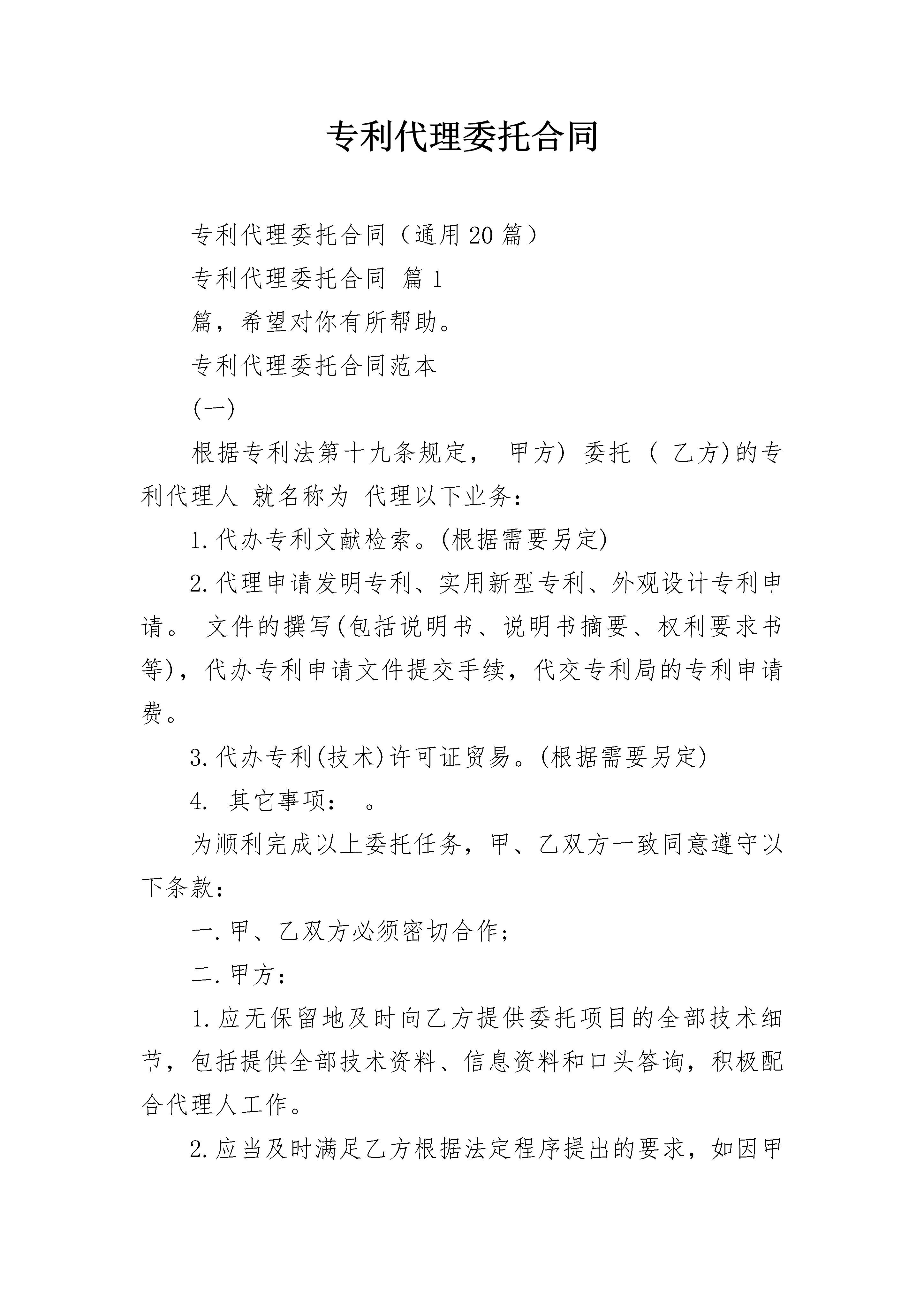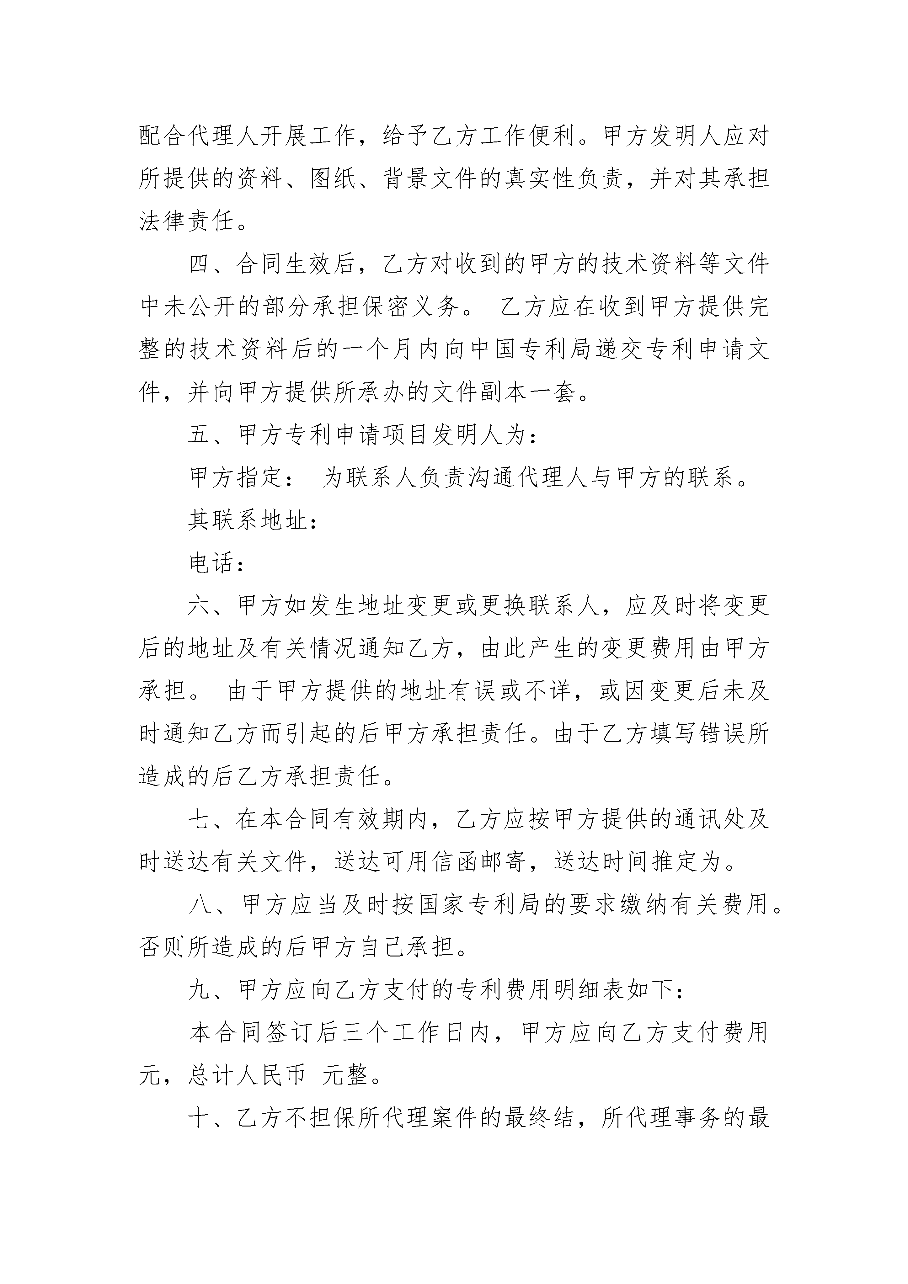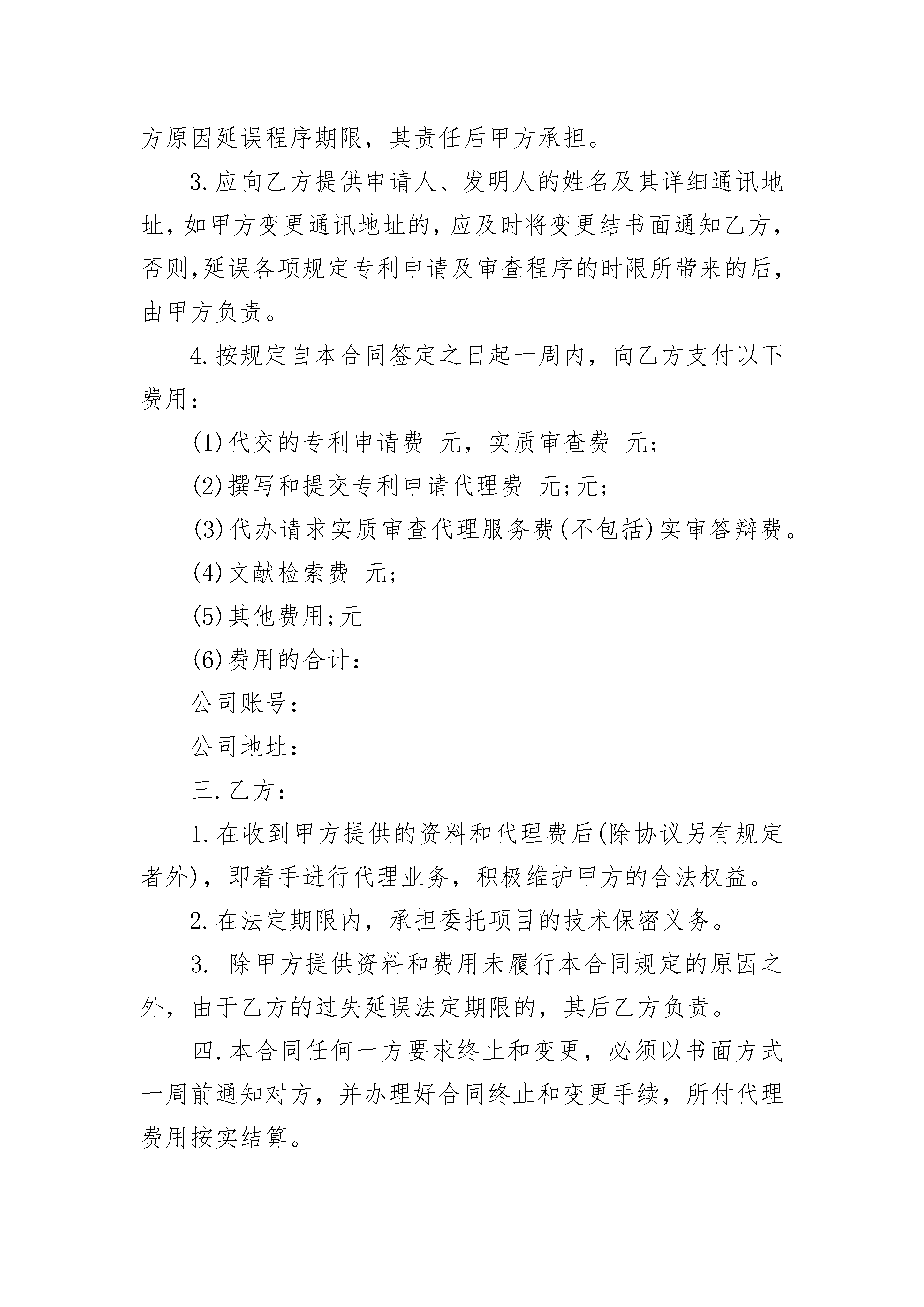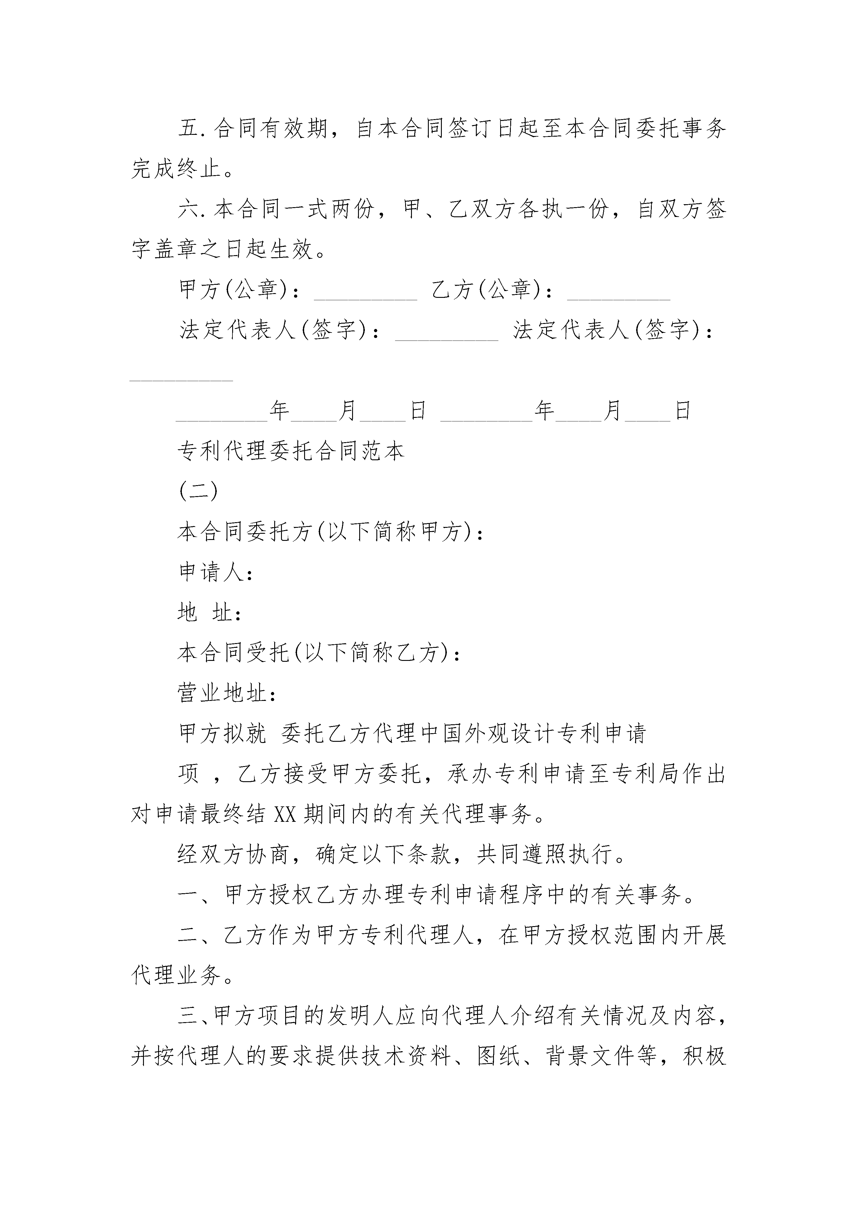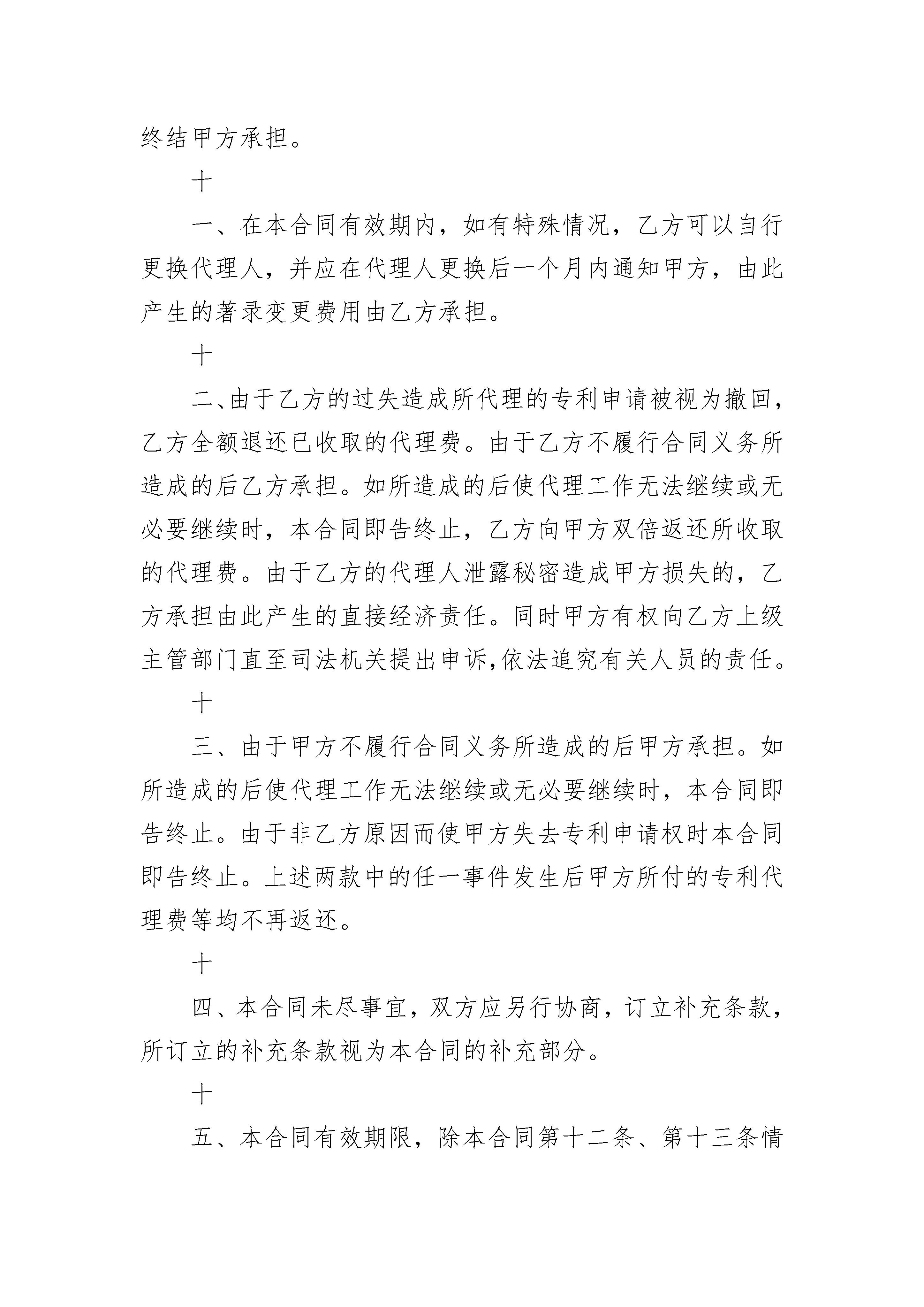专利代理委托合同专利代理委托合同(通用20篇)专利代理委托合同篇1篇,希望对你有所帮助。专利代理委托合同范本(一)根据专利法第十九条规定,甲方)委托(乙方)的专利代理人就名称为代理以下业务:1.代办专利文献检索。(根据需要另定)2.代理申请发明专利、实用新型专利、外观设计专利申请。文件的撰写(包括说明书、说明书摘要、权利要求书等),代办专利申请文件提交手续,代交专利局的专利申请费。3.代办专利(技术)许可证贸易。(根据需要另定)4.其它事项:。为顺利完成以上委托任务,甲、乙双方一致同意遵守以下条款:一.甲、乙双方必须密切合作;二.甲方:1.应无保留地及时向乙方提供委托项目的全部技术细节,包括提供全部技术资料、信息资料和口头答询,积极配合代理人工作。2.应当及时满足乙方根据法定程序提出的要求,如因甲方原因延误程序期限,其责任后甲方承担。3.应向乙方提供申请人、发明人的姓名及其详细通讯地址,如甲方变更通讯地址的,应及时将变更结书面通知乙方,否则,延误各项规定专利申请及审查程序的时限所带来的后,由甲方负责。4.按规定自本合同签定之日起一周内,向乙方支付以下费用:(1)代交的专利申请费元,实质审查费元;(2)撰写和提交专利申请代理费元;元;(3)代办请求实质审查代理服务费(不包括)实审答辩费。(4)文献检索费元;(5)其他费用;元(6)费用的合计:公司账号:公司地址:三.乙方:1.在收到甲方提供的资料和代理费后(除协议另有规定者外),即着手进行代理业务,积极维护甲方的合法权益。2.在法定期限内,承担委托项目的技术保密义务。3.除甲方提供资料和费用未履行本合同规定的原因之外,由于乙方的过失延误法定期限的,其后乙方负责。四.本合同任何一方要求终止和变更,必须以书面方式一周前通知对方,并办理好合同终止和变更手续,所付代理费用按实结算。五.合同有效期,自本合同签订日起至本合同委托事务完成终止。六.本合同一式两份,甲、乙双方各执一份,自双方签字盖章之日起生效。甲方(公章):_________乙方(公章):_________法定代表人(签字):_________法定代表人(签字):_________________年____月____日________年____月____日专利代理委托合同范本(二)本合同委托方(以下简称甲方):申请人:地址:本合同受托(以下简称乙方):营业地址:甲方拟就委托乙方代理中国外观设计专利申请项,乙方接受甲方委托,承办专利申请至专利局作出对申请最终结XX期间内的有关代理事务。经双方协商,确定以下条款,共同遵照执行。一、甲方授权乙方办理专利申请程序中的有关事务。二、乙方作为甲方专利代理人,在甲方授权范围内开展代理业务。三、甲方项目的发明人应向代理人介绍有关情况及内容,并按代理人的要求提供技术资料、图纸、背景文件等,积极配合代理人开展工作,给予乙方工作便利。甲方发明人应对所提供的资料、图纸、背景文件的真实性负责,并对其承担法律责任。四、合同生效后,乙方对收到的甲方的技术资料等文件中未公开的部分承担保密义务。乙方应在收到甲方提供完整的技术资料后的一个月内向中国专利局递交专利申请文件,并向甲方提供所承办的文件副本一套。五、甲方专利申请项目发明人为:甲方指定:为联系人负责沟通代理人与甲方的联系。其联系地址:电话:六、甲方如发生地址变更或更换联系人,应及时将变更后的地址及有关情况通知乙方,由此产生的变更费用由甲方承担。由于甲方提供的地址有误或不详,或因变更后未及时通知乙方而引起的后甲方承担责任。由于乙方填写错误所造成的后乙方承担责任。七、在本合同有效期内,乙方应按甲方提供的通讯处及时送达有关文件,送达可用信函邮寄,送达时间推定为。八、甲方应当及时按国家专利局的要求缴纳有关费用。否则所造成的后甲方自己承担。九、甲方应向乙方支付的专利费用明细表如下:本合同签订后三个工作日内,甲方应向乙方支付费用元,总计人民币元整。十、乙方不担保所代理案件的最终结,所代理事务的最终结甲方承担。十一、在本合同有效期内,如有特殊情况,乙方可以自行更换代理人,并应在代理人更换后一个月内通知甲方,由此产生的著录变更费用由乙方承担。十二、由于乙方的过失造成所代理的专利申请被视为撤回,乙方全额退还已收取的代理费。由于乙方不履行合同义务所造成的后乙方承担。如所造成的后使代理工作无法继续或无必要继续时,本合同即告终止,乙方向甲方双倍返还所收取的代理费。由于乙方的代理人泄露秘密造成甲方损失的,乙方承担由此产生的直接经济责任。同时甲方有权向乙方上级主管部门直至司法机关提出申诉,依法追究有关人员的责任。十三、由于甲方不履行合同义务所造成的后甲方承担。如所造成的后使代理工作无法继续或无必要继续时,本合同即告终止。由于非乙方原因而使甲方失去专利申请权时本合同即告终止。上述两款
