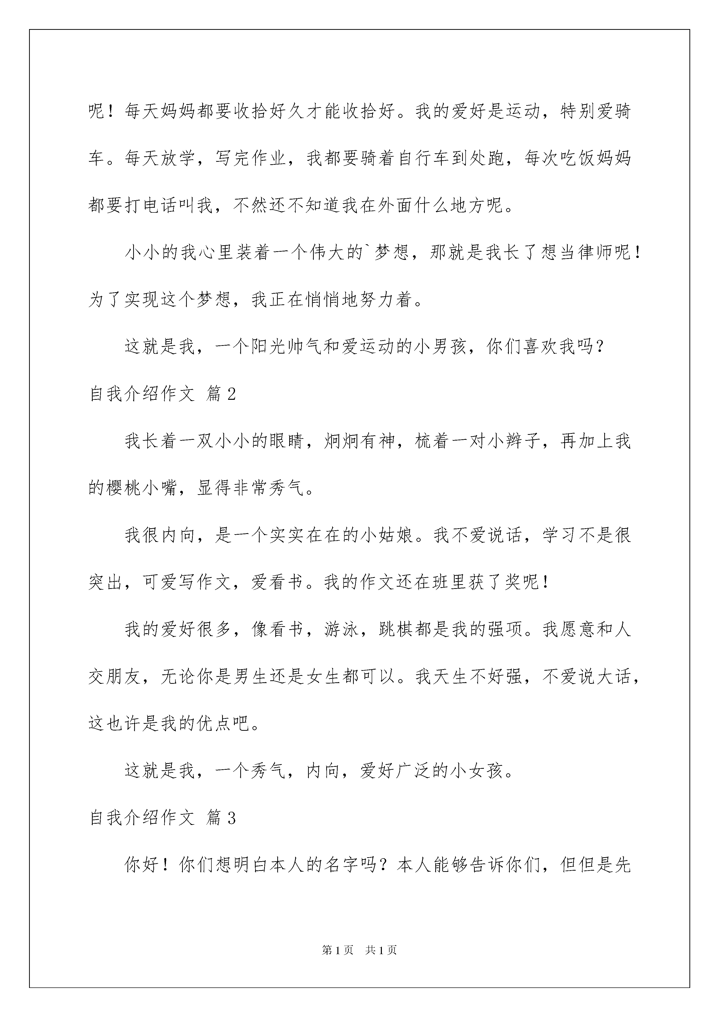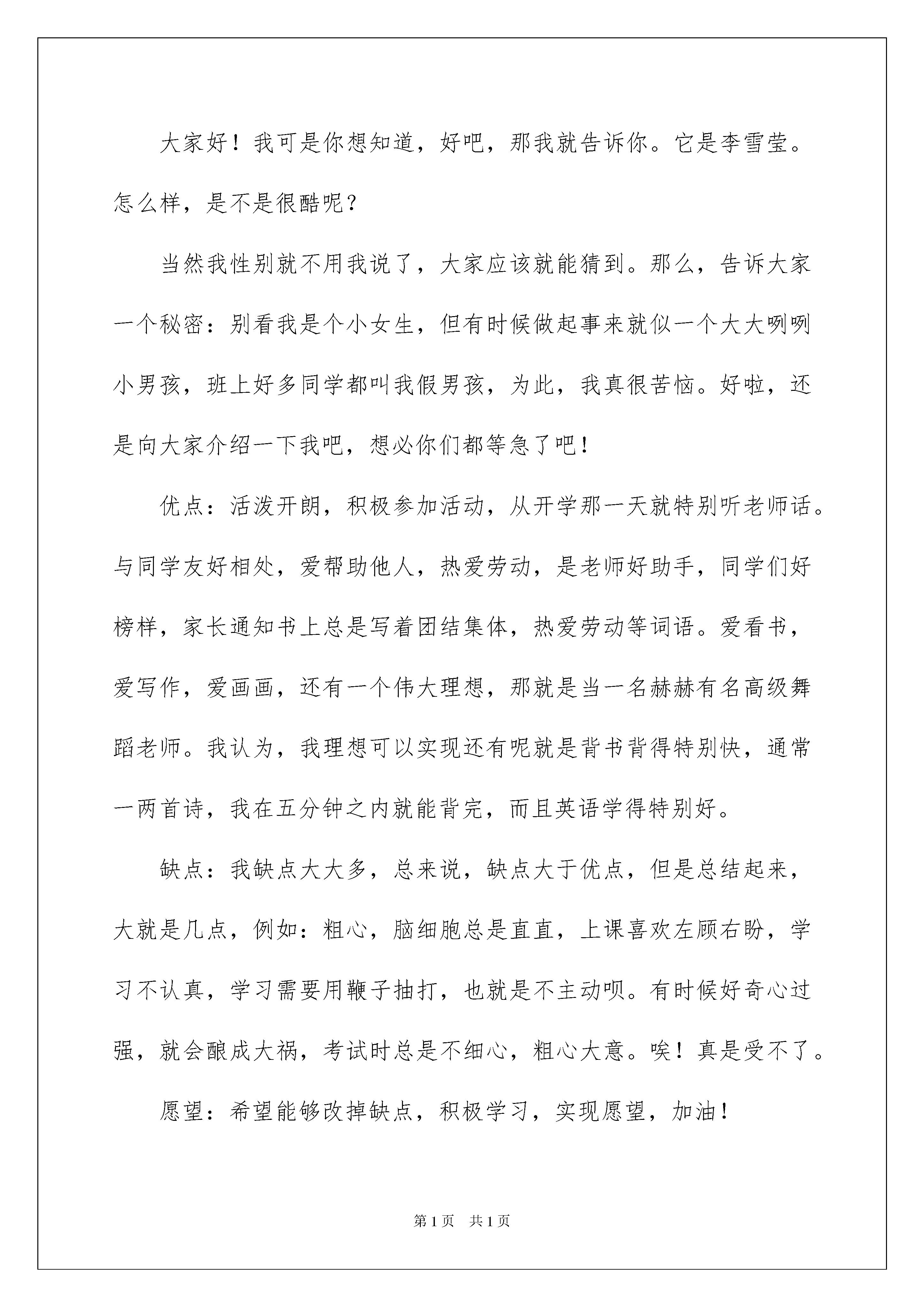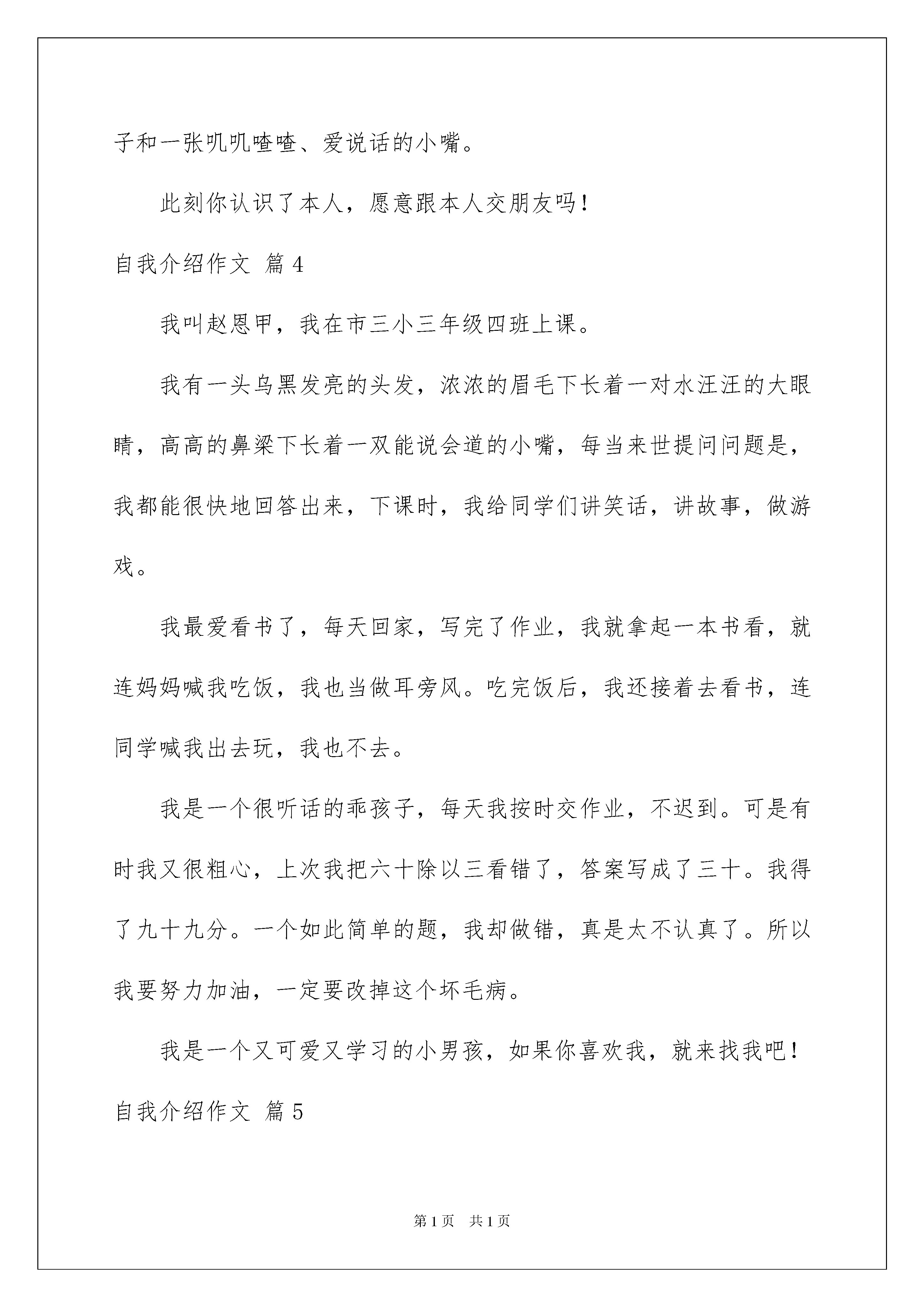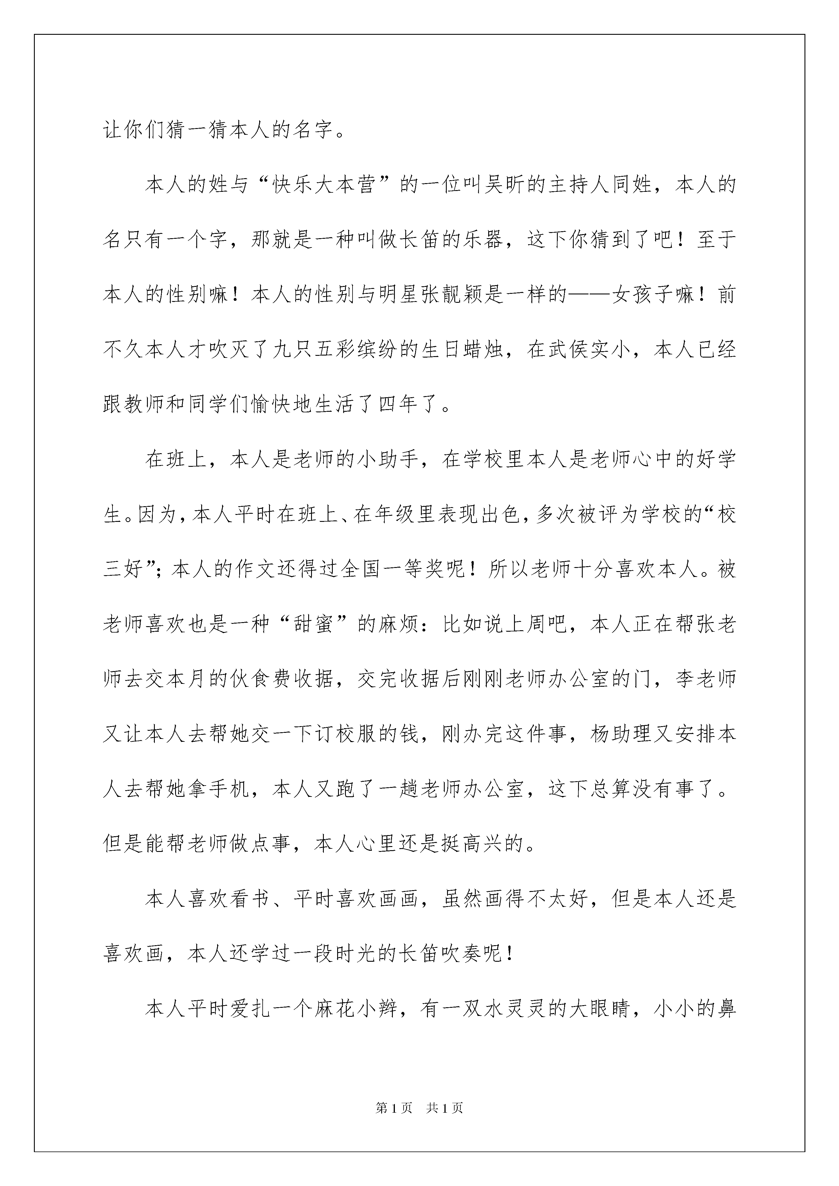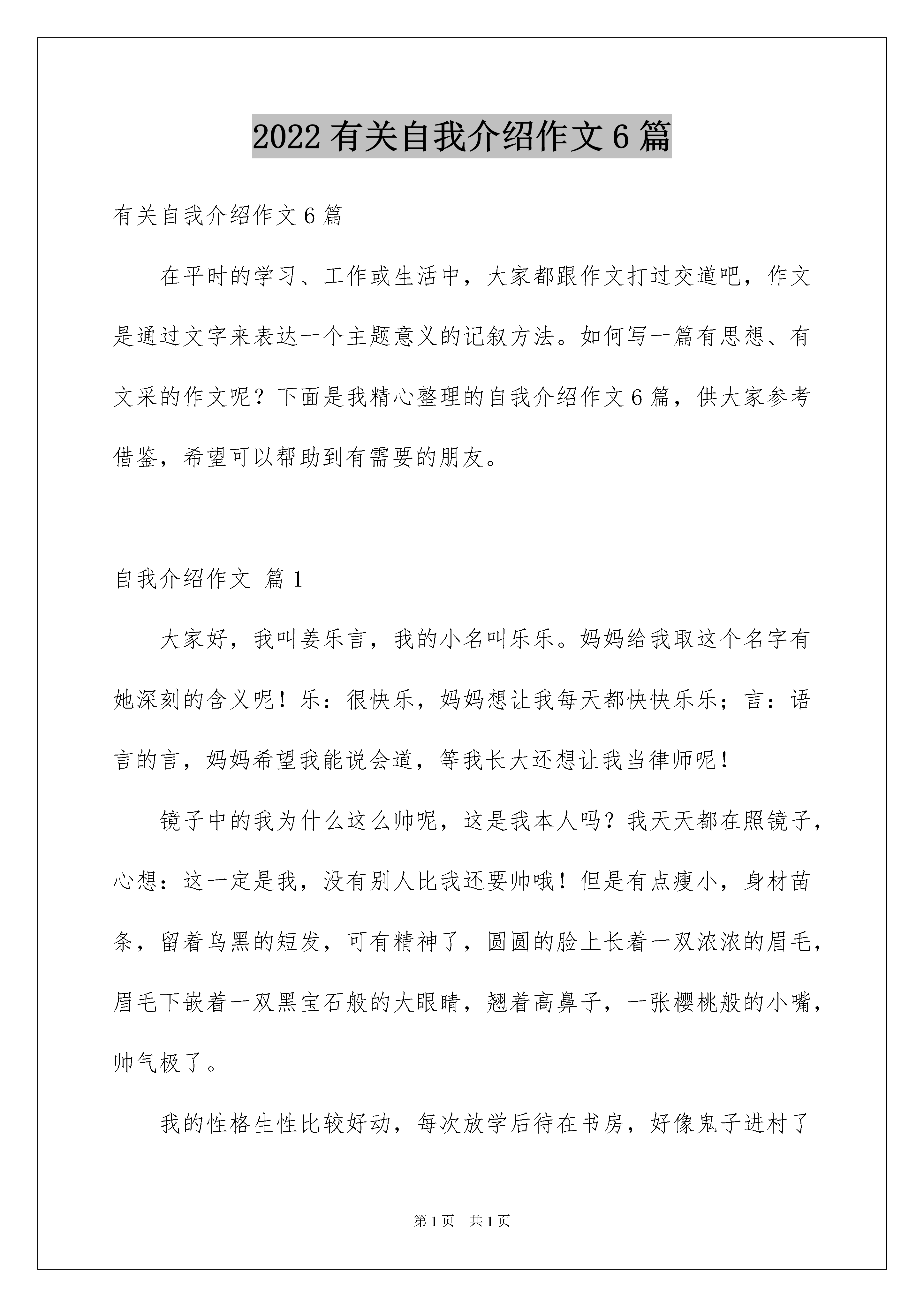 2022有关自我介绍作文6篇有关自我介绍作文6篇在平时的学习、工作或生活中,大家都跟作文打过交道吧,作文是通过文字来表达一个主题意义的记叙方法。如何写一篇有思想、有文采的作文呢?下面是我精心整理的自我介绍作文6篇,供大家参考借鉴,希望可以帮助到有需要的朋友。自我介绍作文篇1大家好,我叫姜乐言,我的小名叫乐乐。妈妈给我取这个名字有她深刻的含义呢!乐:很快乐,妈妈想让我每天都快快乐乐;言:语言的言,妈妈希望我能说会道,等我长大还想让我当律师呢!镜子中的我为什么这么帅呢,这是我本人吗?我天天都在照镜子,心想:这一定是我,没有别人比我还要帅哦!但是有点瘦小,身材苗条,留着乌黑的短发,可有精神了,圆圆的脸上长着一双浓浓的眉毛,眉毛下嵌着一双黑宝石般的大眼睛,翘着高鼻子,一张樱桃般的小嘴,帅气极了。我的性格生性比较好动,每次放学后待在书房,好像鬼子进村了呢!每天妈妈都要收拾好久才能收拾好。我的爱好是运动,特别爱骑车。每天放学,写完作业,我都要骑着自行车到处跑,每次吃饭妈妈都要打电话叫我,不然还不知道我在外面什么地方呢。小小的我心里装着一个伟大的`梦想,那就是我长了想当律师呢!为了实现这个梦想,我正在悄悄地努力着。这就是我,一个阳光帅气和爱运动的小男孩,你们喜欢我吗?自我介绍作文篇2我长着一双小小的眼睛,炯炯有神,梳着一对小辫子,再加上我的樱桃小嘴,显得非常秀气。我很内向,是一个实实在在的小姑娘。我不爱说话,学习不是很突出,可爱写作文,爱看书。我的作文还在班里获了奖呢!我的爱好很多,像看书,游泳,跳棋都是我的强项。我愿意和人交朋友,无论你是男生还是女生都可以。我天生不好强,不爱说大话,这也许是我的优点吧。这就是我,一个秀气,内向,爱好广泛的小女孩。自我介绍作文篇3你好!你们想明白本人的名字吗?本人能够告诉你们,但但是先让你们猜一猜本人的名字。本人的姓与“快乐大本营”的一位叫吴昕的主持人同姓,本人的名只有一个字,那就是一种叫做长笛的乐器,这下你猜到了吧!至于本人的性别嘛!本人的性别与明星张靓颖是一样的——女孩子嘛!前不久本人才吹灭了九只五彩缤纷的生日蜡烛,在武侯实小,本人已经跟教师和同学们愉快地生活了四年了。在班上,本人是老师的小助手,在学校里本人是老师心中的好学生。因为,本人平时在班上、在年级里表现出色,多次被评为学校的“校三好”;本人的作文还得过全国一等奖呢!所以老师十分喜欢本人。被老师喜欢也是一种“甜蜜”的麻烦:比如说上周吧,本人正在帮张老师去交本月的伙食费收据,交完收据后刚刚老师办公室的门,李老师又让本人去帮她交一下订校服的钱,刚办完这件事,杨助理又安排本人去帮她拿手机,本人又跑了一趟老师办公室,这下总算没有事了。但是能帮老师做点事,本人心里还是挺高兴的。本人喜欢看书、平时喜欢画画,虽然画得不太好,但是本人还是喜欢画,本人还学过一段时光的长笛吹奏呢!本人平时爱扎一个麻花小辫,有一双水灵灵的大眼睛,小小的鼻子和一张叽叽喳喳、爱说话的小嘴。此刻你认识了本人,愿意跟本人交朋友吗!自我介绍作文篇4我叫赵恩甲,我在市三小三年级四班上课。我有一头乌黑发亮的头发,浓浓的眉毛下长着一对水汪汪的大眼睛,高高的鼻梁下长着一双能说会道的小嘴,每当来世提问问题是,我都能很快地回答出来,下课时,我给同学们讲笑话,讲故事,做游戏。我最爱看书了,每天回家,写完了作业,我就拿起一本书看,就连妈妈喊我吃饭,我也当做耳旁风。吃完饭后,我还接着去看书,连同学喊我出去玩,我也不去。我是一个很听话的乖孩子,每天我按时交作业,不迟到。可是有时我又很粗心,上次我把六十除以三看错了,答案写成了三十。我得了九十九分。一个如此简单的题,我却做错,真是太不认真了。所以我要努力加油,一定要改掉这个坏毛病。我是一个又可爱又学习的小男孩,如果你喜欢我,就来找我吧!自我介绍作文篇5大家好!我可是你想知道,好吧,那我就告诉你。它是李雪莹。怎么样,是不是很酷呢?当然我性别就不用我说了,大家应该就能猜到。那么,告诉大家一个秘密:别看我是个小女生,但有时候做起事来就似一个大大咧咧小男孩,班上好多同学都叫我假男孩,为此,我真很苦恼。好啦,还是向大家介绍一下我吧,想必你们都等急了吧!优点:活泼开朗,积极参加活动,从开学那一天就特别听老师话。与同学友好相处,爱帮助他人,热爱劳动,是老师好助手,同学们好榜样,家长通知书上总是写着团结集体,热爱劳动等词语。爱看书,爱写作,爱画画,还有一个伟大理想,那就是当一名赫赫有名高级舞蹈老师。我认为,我理想可以实现还有呢就是背书背得特别快,通常一两首诗,我在五分钟之内就能背完,而且英语学得特别好。缺点:我缺点大大多,总来
