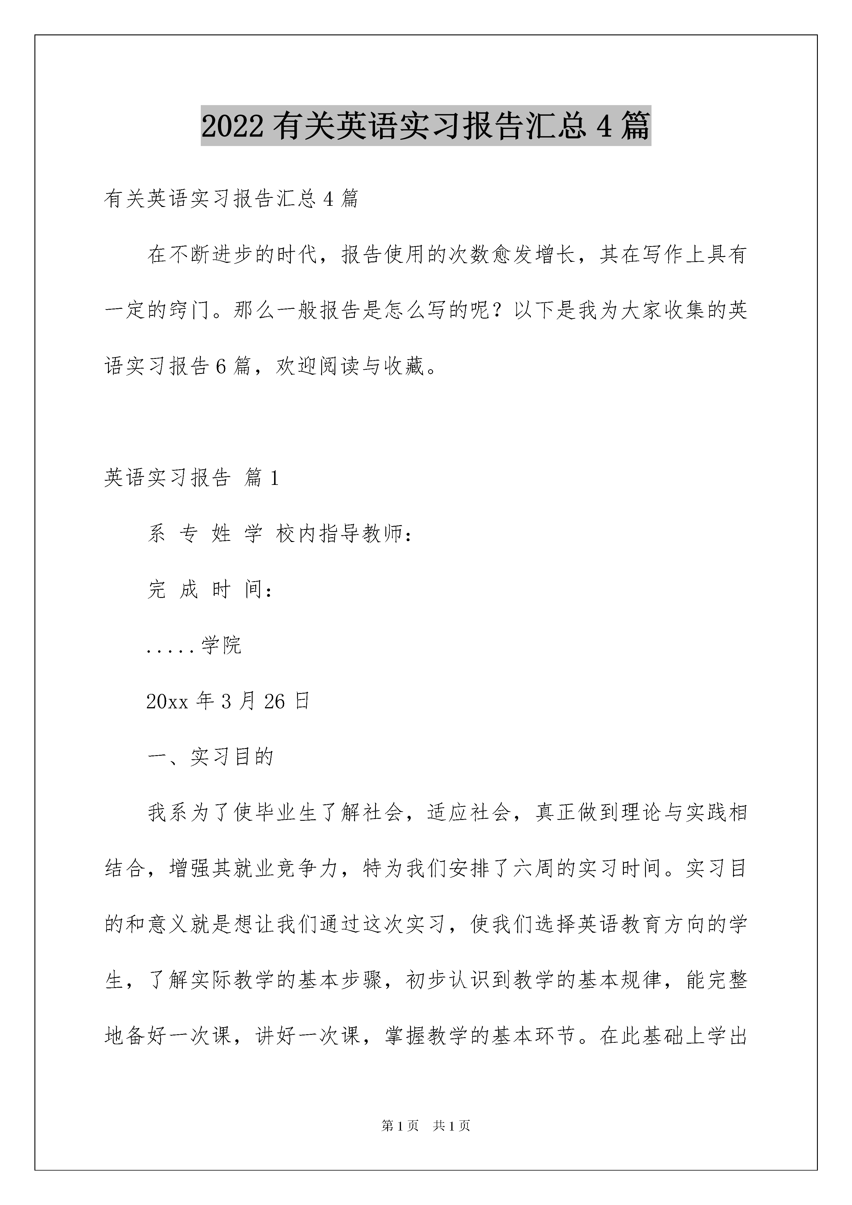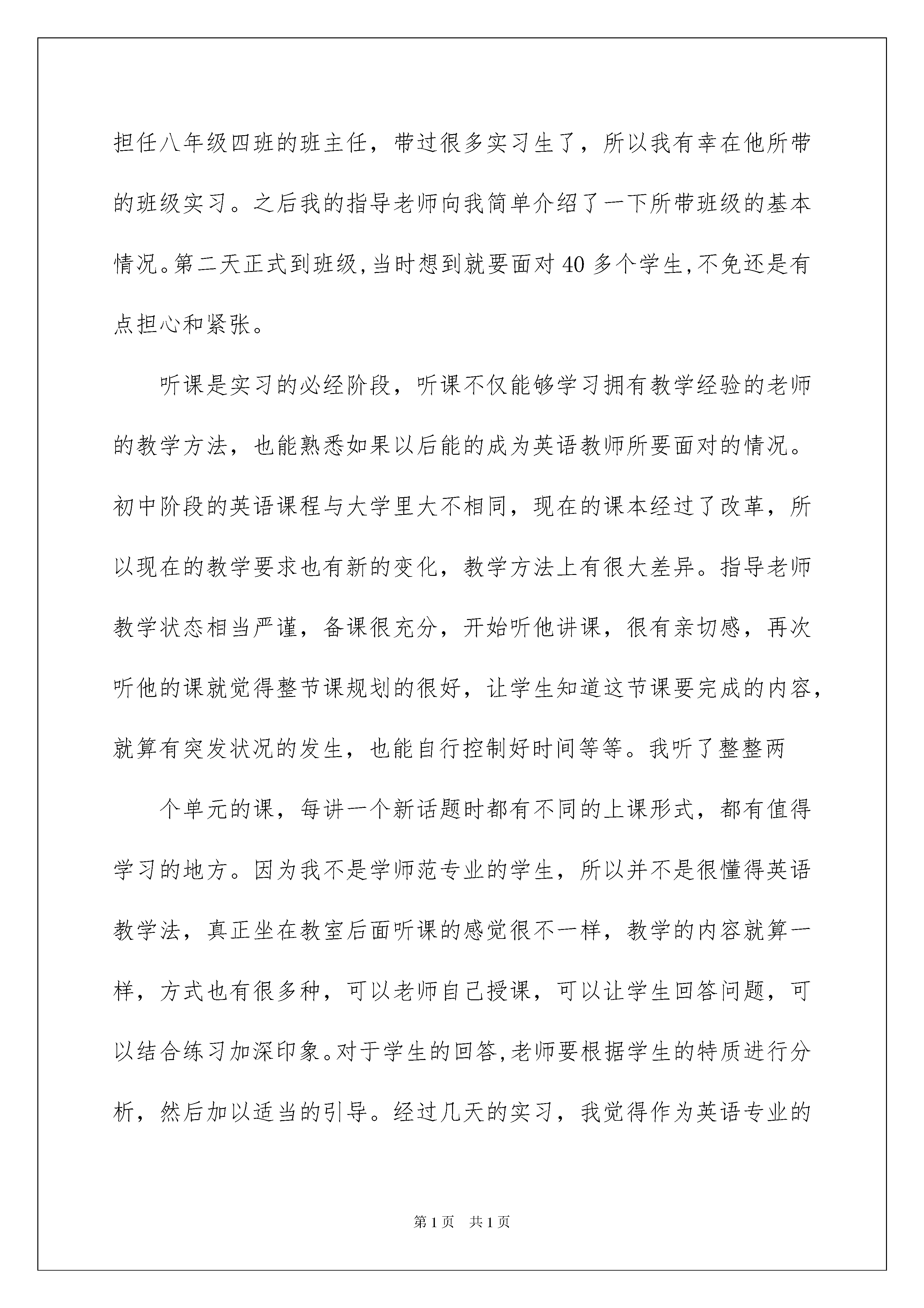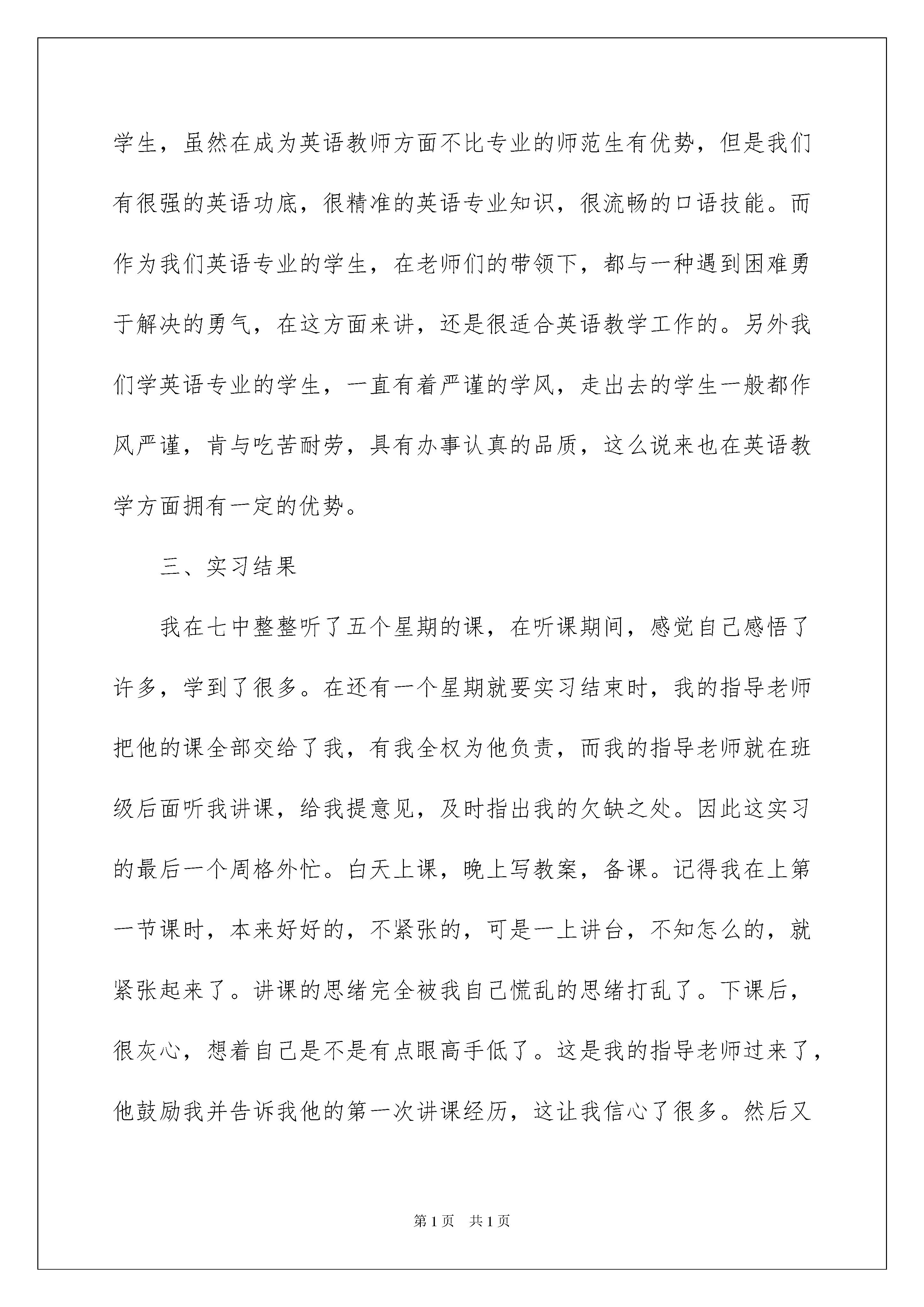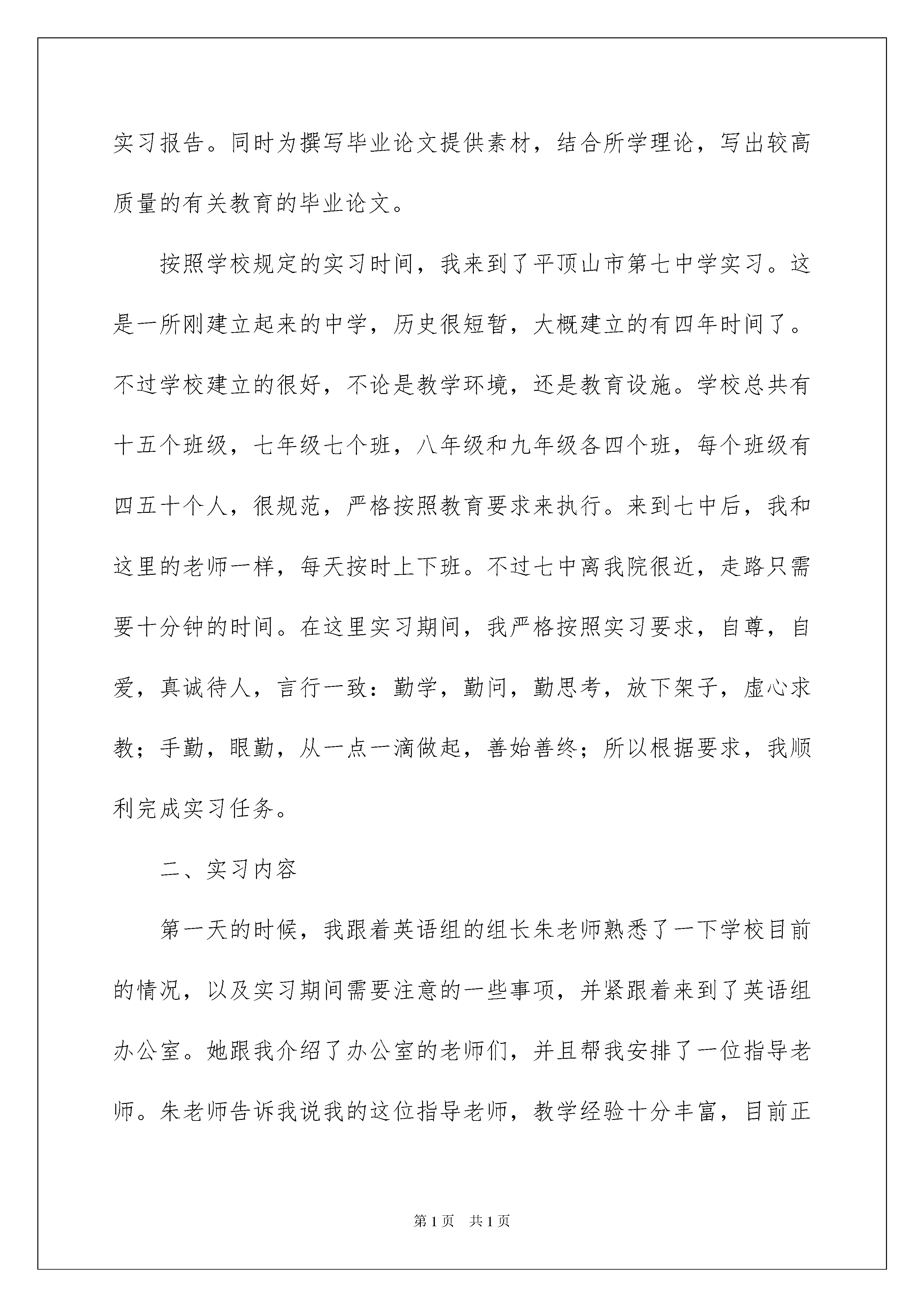 2022有关英语实习报告汇总4篇有关英语实习报告汇总4篇在不断进步的时代,报告使用的次数愈发增长,其在写作上具有一定的窍门。那么一般报告是怎么写的呢?以下是我为大家收集的英语实习报告6篇,欢迎阅读与收藏。英语实习报告篇1系专姓学校内指导教师:完成时间:.....学院20xx年3月26日一、实习目的我系为了使毕业生了解社会,适应社会,真正做到理论与实践相结合,增强其就业竞争力,特为我们安排了六周的实习时间。实习目的和意义就是想让我们通过这次实习,使我们选择英语教育方向的学生,了解实际教学的基本步骤,初步认识到教学的基本规律,能完整地备好一次课,讲好一次课,掌握教学的基本环节。在此基础上学出实习报告。同时为撰写毕业论文提供素材,结合所学理论,写出较高质量的有关教育的毕业论文。按照学校规定的实习时间,我来到了平顶山市第七中学实习。这是一所刚建立起来的中学,历史很短暂,大概建立的有四年时间了。不过学校建立的很好,不论是教学环境,还是教育设施。学校总共有十五个班级,七年级七个班,八年级和九年级各四个班,每个班级有四五十个人,很规范,严格按照教育要求来执行。来到七中后,我和这里的老师一样,每天按时上下班。不过七中离我院很近,走路只需要十分钟的时间。在这里实习期间,我严格按照实习要求,自尊,自爱,真诚待人,言行一致:勤学,勤问,勤思考,放下架子,虚心求教;手勤,眼勤,从一点一滴做起,善始善终;所以根据要求,我顺利完成实习任务。二、实习内容第一天的时候,我跟着英语组的组长朱老师熟悉了一下学校目前的情况,以及实习期间需要注意的一些事项,并紧跟着来到了英语组办公室。她跟我介绍了办公室的老师们,并且帮我安排了一位指导老师。朱老师告诉我说我的这位指导老师,教学经验十分丰富,目前正担任八年级四班的班主任,带过很多实习生了,所以我有幸在他所带的班级实习。之后我的指导老师向我简单介绍了一下所带班级的基本情况。第二天正式到班级,当时想到就要面对40多个学生,不免还是有点担心和紧张。听课是实习的必经阶段,听课不仅能够学习拥有教学经验的老师的教学方法,也能熟悉如果以后能的成为英语教师所要面对的情况。初中阶段的英语课程与大学里大不相同,现在的课本经过了改革,所以现在的教学要求也有新的变化,教学方法上有很大差异。指导老师教学状态相当严谨,备课很充分,开始听他讲课,很有亲切感,再次听他的课就觉得整节课规划的很好,让学生知道这节课要完成的内容,就算有突发状况的发生,也能自行控制好时间等等。我听了整整两个单元的课,每讲一个新话题时都有不同的上课形式,都有值得学习的地方。因为我不是学师范专业的学生,所以并不是很懂得英语教学法,真正坐在教室后面听课的感觉很不一样,教学的内容就算一样,方式也有很多种,可以老师自己授课,可以让学生回答问题,可以结合练习加深印象。对于学生的回答,老师要根据学生的特质进行分析,然后加以适当的引导。经过几天的实习,我觉得作为英语专业的学生,虽然在成为英语教师方面不比专业的师范生有优势,但是我们有很强的英语功底,很精准的英语专业知识,很流畅的口语技能。而作为我们英语专业的学生,在老师们的带领下,都与一种遇到困难勇于解决的勇气,在这方面来讲,还是很适合英语教学工作的。另外我们学英语专业的学生,一直有着严谨的学风,走出去的学生一般都作风严谨,肯与吃苦耐劳,具有办事认真的品质,这么说来也在英语教学方面拥有一定的优势。三、实习结果我在七中整整听了五个星期的课,在听课期间,感觉自己感悟了许多,学到了很多。在还有一个星期就要实习结束时,我的指导老师把他的课全部交给了我,有我全权为他负责,而我的指导老师就在班级后面听我讲课,给我提意见,及时指出我的欠缺之处。因此这实习的最后一个周格外忙。白天上课,晚上写教案,备课。记得我在上第一节课时,本来好好的,不紧张的,可是一上讲台,不知怎么的,就紧张起来了。讲课的思绪完全被我自己慌乱的思绪打乱了。下课后,很灰心,想着自己是不是有点眼高手低了。这是我的指导老师过来了,他鼓励我并告诉我他的第一次讲课经历,这让我信心了很多。然后又及时的给我列出了我上课时的缺点,告诉我应该怎样改正。虽然第一节课不是很成功,但我依然坚持下来了。在上第二节课时,我并没有上次那么紧张,一节课讲下来,感觉比昨天好了很多。这时我让我的指导老师给我评课,他给了我极大地肯定,说我比上次进步很大,这让我很是欣喜。再接下来的三天中,我讲的越老越顺了,最后两天的讲课指导老师没在给我提什么意见,这是对我的一种肯定。四、实习总结以上是我的实习报告,通过在平顶山市这六周的实习生活,让我得到了很多感触。首先让我实践了教师这个