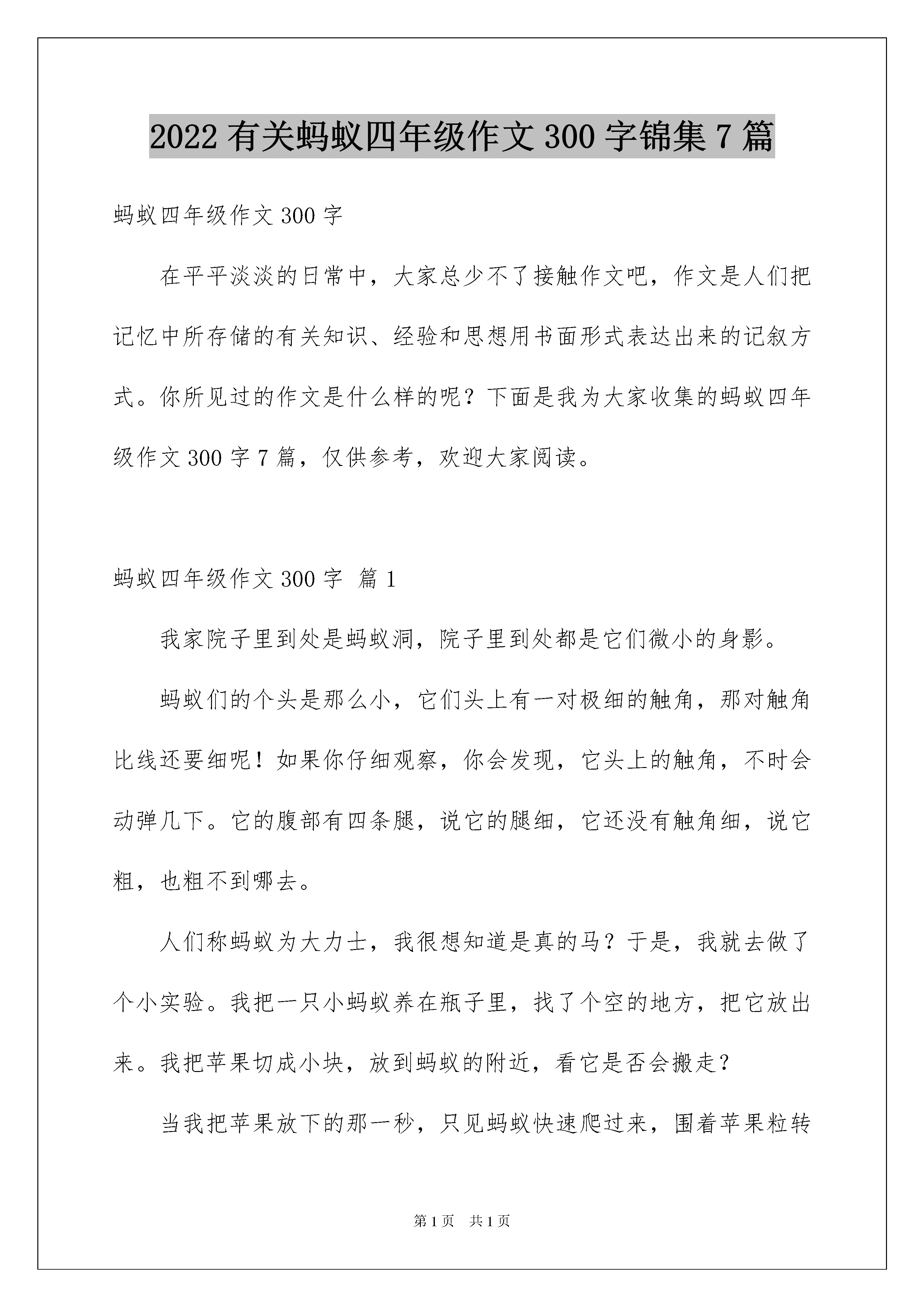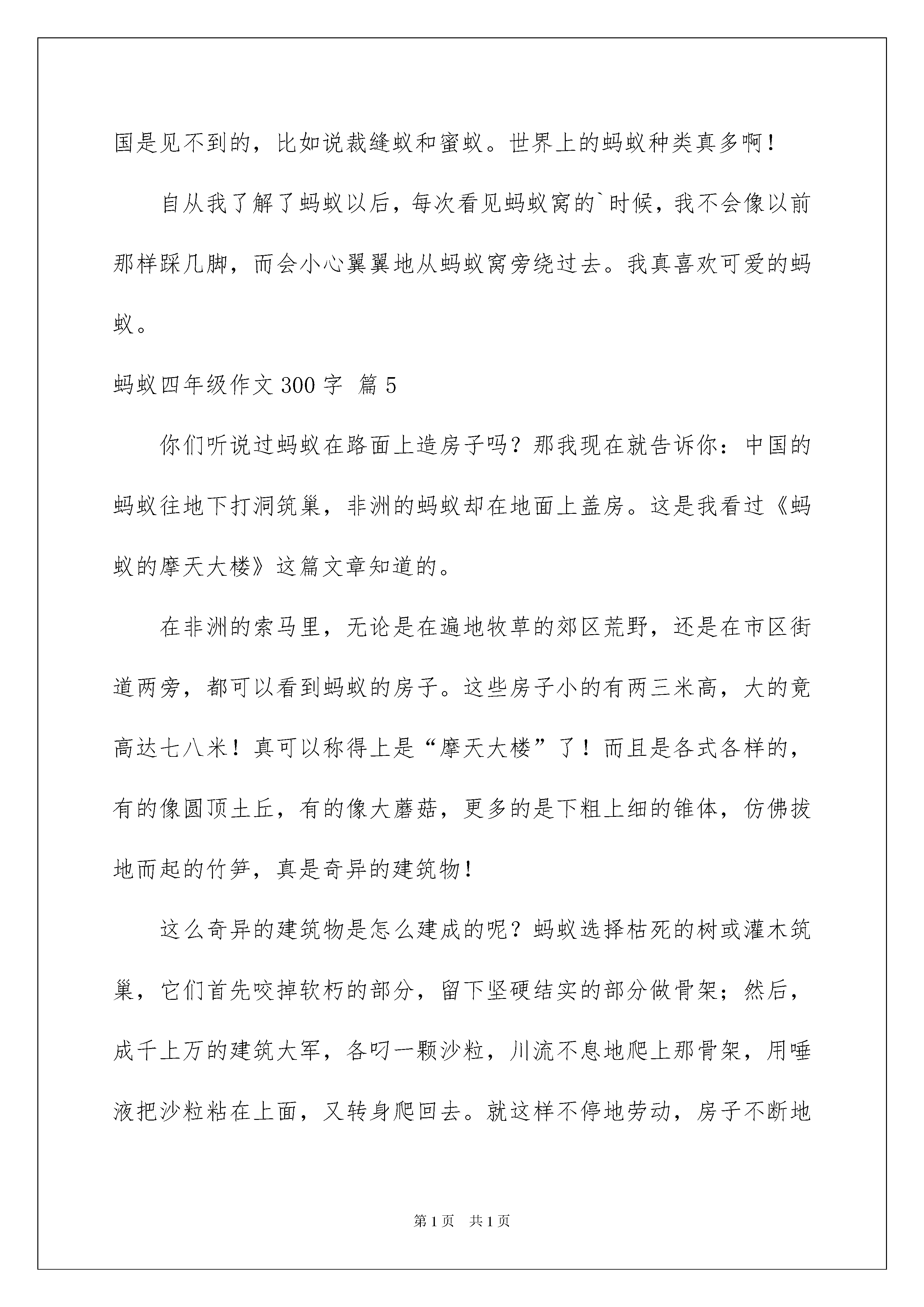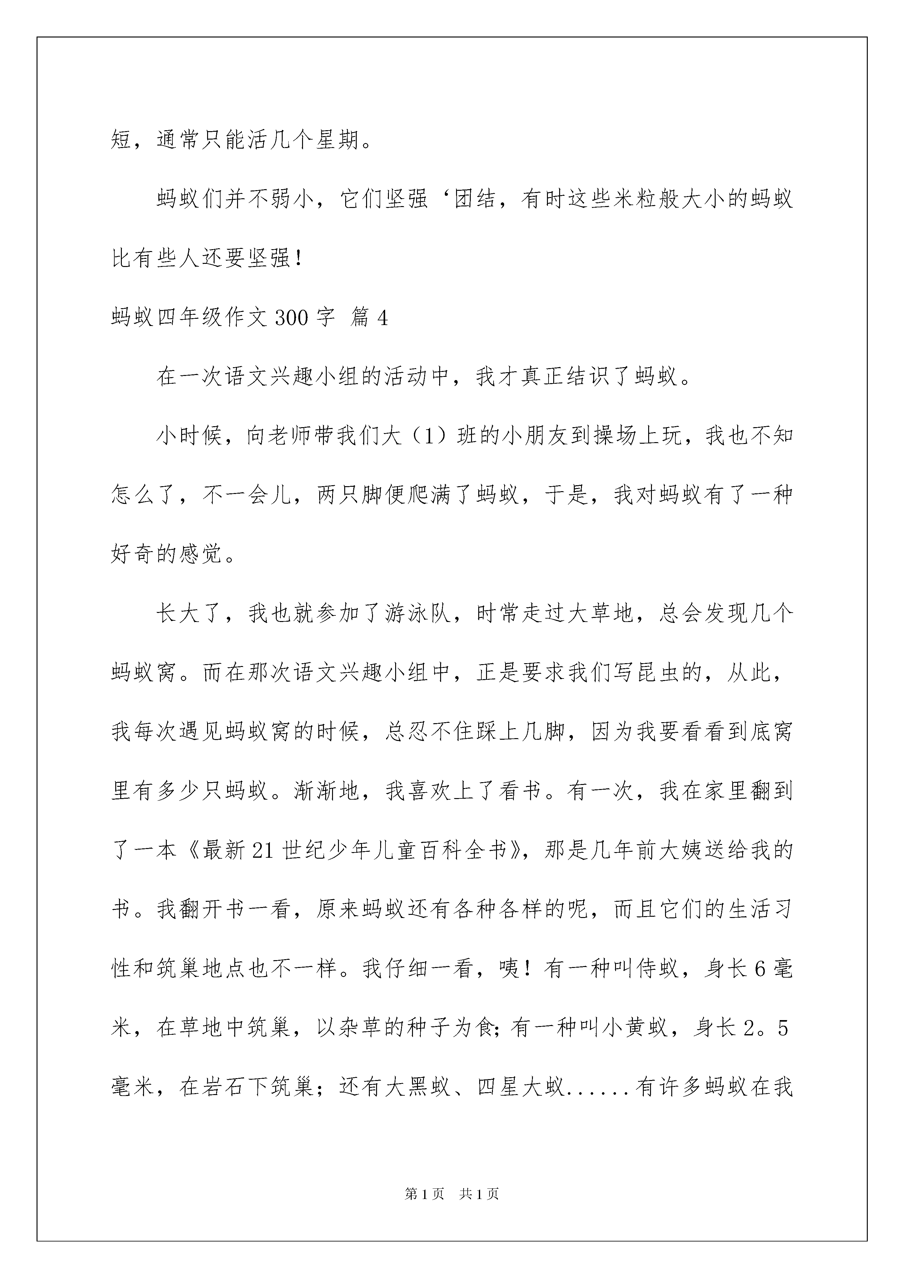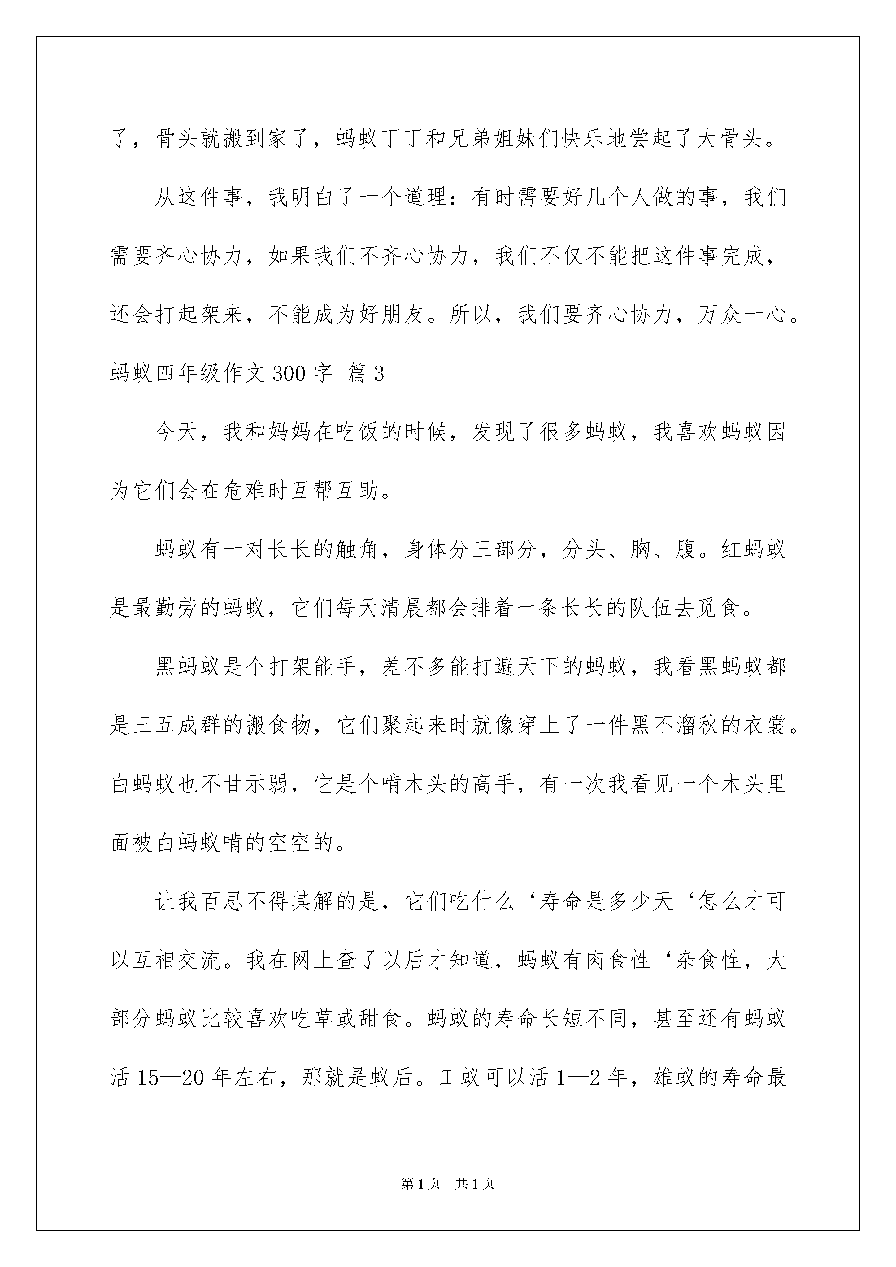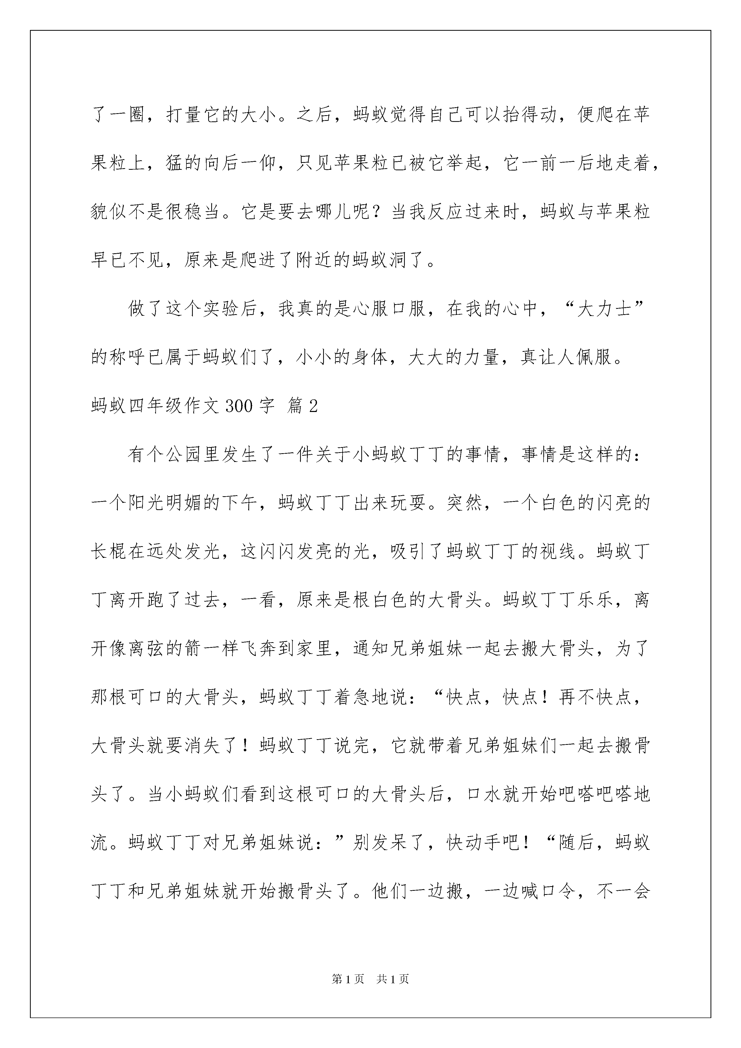 2022有关蚂蚁四年级作文300字锦集7篇蚂蚁四年级作文300字在平平淡淡的日常中,大家总少不了接触作文吧,作文是人们把记忆中所存储的有关知识、经验和思想用书面形式表达出来的记叙方式。你所见过的作文是什么样的呢?下面是我为大家收集的蚂蚁四年级作文300字7篇,仅供参考,欢迎大家阅读。蚂蚁四年级作文300字篇1我家院子里到处是蚂蚁洞,院子里到处都是它们微小的身影。蚂蚁们的个头是那么小,它们头上有一对极细的触角,那对触角比线还要细呢!如果你仔细观察,你会发现,它头上的触角,不时会动弹几下。它的腹部有四条腿,说它的腿细,它还没有触角细,说它粗,也粗不到哪去。人们称蚂蚁为大力士,我很想知道是真的马?于是,我就去做了个小实验。我把一只小蚂蚁养在瓶子里,找了个空的地方,把它放出来。我把苹果切成小块,放到蚂蚁的附近,看它是否会搬走?当我把苹果放下的那一秒,只见蚂蚁快速爬过来,围着苹果粒转了一圈,打量它的大小。之后,蚂蚁觉得自己可以抬得动,便爬在苹果粒上,猛的向后一仰,只见苹果粒已被它举起,它一前一后地走着,貌似不是很稳当。它是要去哪儿呢?当我反应过来时,蚂蚁与苹果粒早已不见,原来是爬进了附近的蚂蚁洞了。做了这个实验后,我真的是心服口服,在我的心中,“大力士”的称呼已属于蚂蚁们了,小小的身体,大大的力量,真让人佩服。蚂蚁四年级作文300字篇2有个公园里发生了一件关于小蚂蚁丁丁的事情,事情是这样的:一个阳光明媚的下午,蚂蚁丁丁出来玩耍。突然,一个白色的闪亮的长棍在远处发光,这闪闪发亮的光,吸引了蚂蚁丁丁的视线。蚂蚁丁丁离开跑了过去,一看,原来是根白色的大骨头。蚂蚁丁丁乐乐,离开像离弦的箭一样飞奔到家里,通知兄弟姐妹一起去搬大骨头,为了那根可口的大骨头,蚂蚁丁丁着急地说:“快点,快点!再不快点,大骨头就要消失了!蚂蚁丁丁说完,它就带着兄弟姐妹们一起去搬骨头了。当小蚂蚁们看到这根可口的大骨头后,口水就开始吧嗒吧嗒地流。蚂蚁丁丁对兄弟姐妹说:”别发呆了,快动手吧!“随后,蚂蚁丁丁和兄弟姐妹就开始搬骨头了。他们一边搬,一边喊口令,不一会了,骨头就搬到家了,蚂蚁丁丁和兄弟姐妹们快乐地尝起了大骨头。从这件事,我明白了一个道理:有时需要好几个人做的事,我们需要齐心协力,如果我们不齐心协力,我们不仅不能把这件事完成,还会打起架来,不能成为好朋友。所以,我们要齐心协力,万众一心。蚂蚁四年级作文300字篇3今天,我和妈妈在吃饭的时候,发现了很多蚂蚁,我喜欢蚂蚁因为它们会在危难时互帮互助。蚂蚁有一对长长的触角,身体分三部分,分头、胸、腹。红蚂蚁是最勤劳的蚂蚁,它们每天清晨都会排着一条长长的队伍去觅食。黑蚂蚁是个打架能手,差不多能打遍天下的蚂蚁,我看黑蚂蚁都是三五成群的搬食物,它们聚起来时就像穿上了一件黑不溜秋的衣裳。白蚂蚁也不甘示弱,它是个啃木头的高手,有一次我看见一个木头里面被白蚂蚁啃的空空的。让我百思不得其解的是,它们吃什么‘寿命是多少天‘怎么才可以互相交流。我在网上查了以后才知道,蚂蚁有肉食性‘杂食性,大部分蚂蚁比较喜欢吃草或甜食。蚂蚁的寿命长短不同,甚至还有蚂蚁活15—20年左右,那就是蚁后。工蚁可以活1—2年,雄蚁的寿命最短,通常只能活几个星期。蚂蚁们并不弱小,它们坚强‘团结,有时这些米粒般大小的蚂蚁比有些人还要坚强!蚂蚁四年级作文300字篇4在一次语文兴趣小组的活动中,我才真正结识了蚂蚁。小时候,向老师带我们大(1)班的小朋友到操场上玩,我也不知怎么了,不一会儿,两只脚便爬满了蚂蚁,于是,我对蚂蚁有了一种好奇的感觉。长大了,我也就参加了游泳队,时常走过大草地,总会发现几个蚂蚁窝。而在那次语文兴趣小组中,正是要求我们写昆虫的,从此,我每次遇见蚂蚁窝的时候,总忍不住踩上几脚,因为我要看看到底窝里有多少只蚂蚁。渐渐地,我喜欢上了看书。有一次,我在家里翻到了一本《最新21世纪少年儿童百科全书》,那是几年前大姨送给我的书。我翻开书一看,原来蚂蚁还有各种各样的呢,而且它们的生活习性和筑巢地点也不一样。我仔细一看,咦!有一种叫侍蚁,身长6毫米,在草地中筑巢,以杂草的种子为食;有一种叫小黄蚁,身长2。5毫米,在岩石下筑巢;还有大黑蚁、四星大蚁......有许多蚂蚁在我国是见不到的,比如说裁缝蚁和蜜蚁。世界上的蚂蚁种类真多啊!自从我了解了蚂蚁以后,每次看见蚂蚁窝的`时候,我不会像以前那样踩几脚,而会小心翼翼地从蚂蚁窝旁绕过去。我真喜欢可爱的蚂蚁。蚂蚁四年级作文300字篇5你们听说过蚂蚁在路面上造房子吗?那我现在就告诉你:中国的蚂蚁往地下打洞筑巢,非洲的蚂蚁却在地面上盖房。这是我看过《蚂蚁的摩天大楼》这篇文章知道的。在