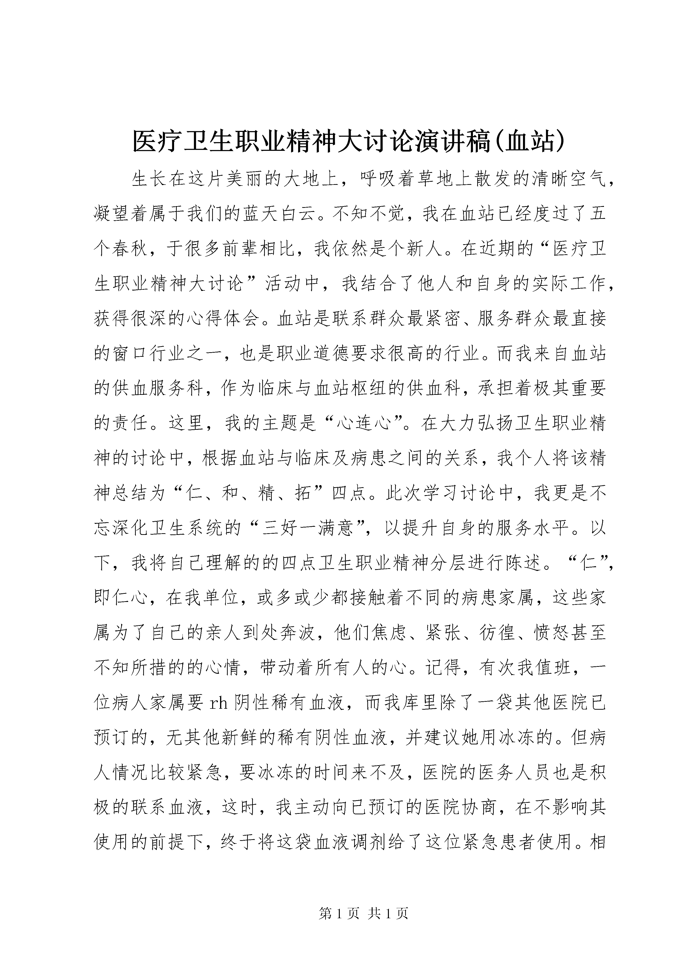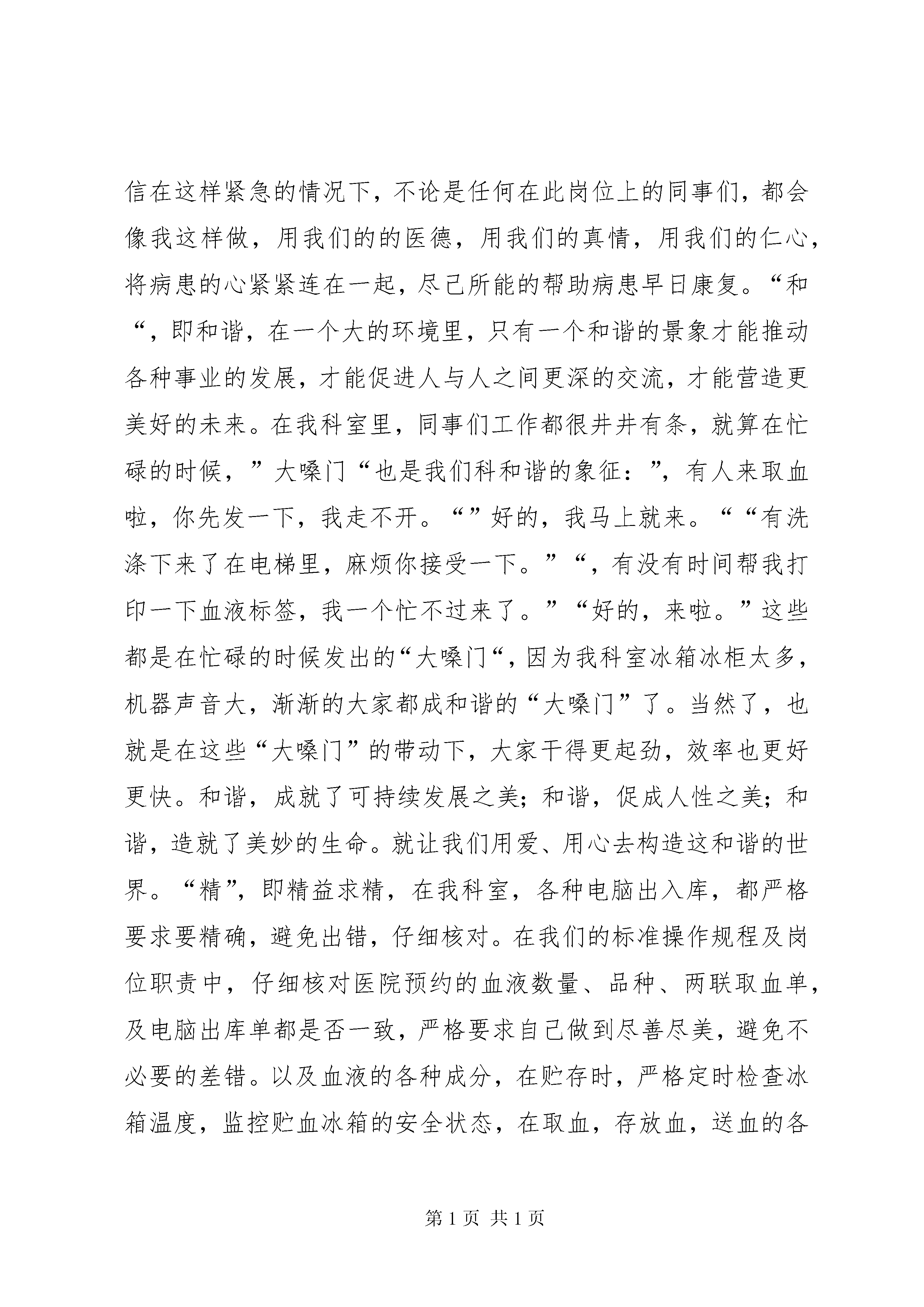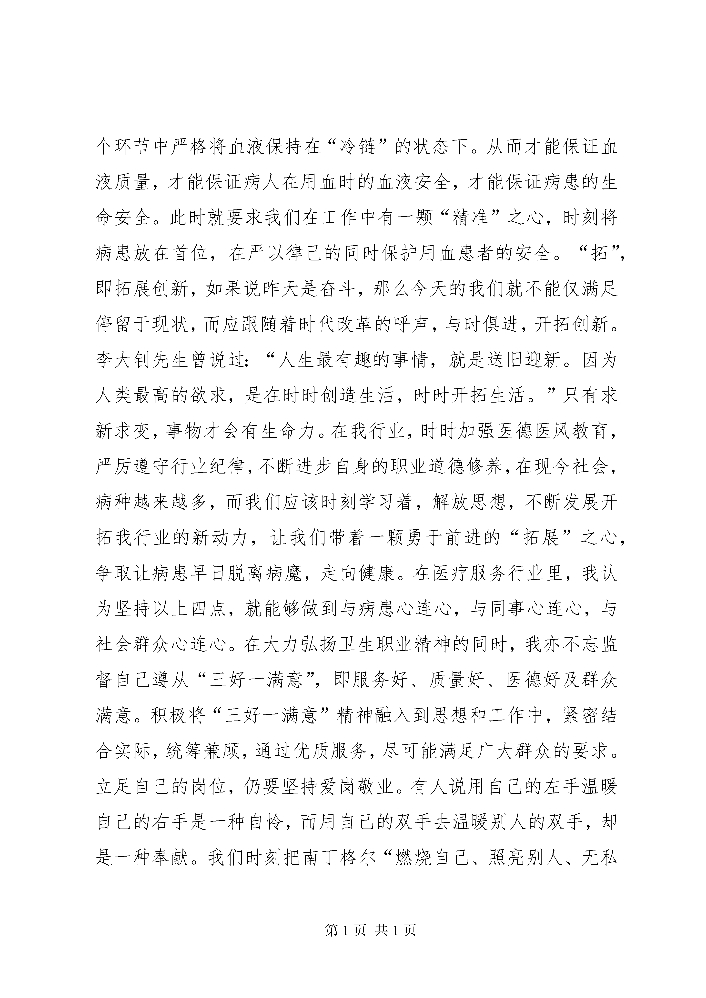 医疗卫生职业精神大讨论演讲稿(血站)生长在这片美丽的大地上,呼吸着草地上散发的清晰空气,凝望着属于我们的蓝天白云。不知不觉,我在血站已经度过了五个春秋,于很多前辈相比,我依然是个新人。在近期的“医疗卫生职业精神大讨论”活动中,我结合了他人和自身的实际工作,获得很深的心得体会。血站是联系群众最紧密、服务群众最直接的窗口行业之一,也是职业道德要求很高的行业。而我来自血站的供血服务科,作为临床与血站枢纽的供血科,承担着极其重要的责任。这里,我的主题是“心连心”。在大力弘扬卫生职业精神的讨论中,根据血站与临床及病患之间的关系,我个人将该精神总结为“仁、和、精、拓”四点。此次学习讨论中,我更是不忘深化卫生系统的“三好一满意”,以提升自身的服务水平。以下,我将自己理解的的四点卫生职业精神分层进行陈述。“仁”,即仁心,在我单位,或多或少都接触着不同的病患家属,这些家属为了自己的亲人到处奔波,他们焦虑、紧张、彷徨、愤怒甚至不知所措的的心情,带动着所有人的心。记得,有次我值班,一位病人家属要rh阴性稀有血液,而我库里除了一袋其他医院已预订的,无其他新鲜的稀有阴性血液,并建议她用冰冻的。但病人情况比较紧急,要冰冻的时间来不及,医院的医务人员也是积极的联系血液,这时,我主动向已预订的医院协商,在不影响其使用的前提下,终于将这袋血液调剂给了这位紧急患者使用。相信在这样紧急的情况下,不论是任何在此岗位上的同事们,都会像我这样做,用我们的的医德,用我们的真情,用我们的仁心,将病患的心紧紧连在一起,尽己所能的帮助病患早日康复。“和“,即和谐,在一个大的环境里,只有一个和谐的景象才能推动各种事业的发展,才能促进人与人之间更深的交流,才能营造更美好的未来。在我科室里,同事们工作都很井井有条,就算在忙碌的时候,”大嗓门“也是我们科和谐的象征:”,有人来取血啦,你先发一下,我走不开。“”好的,我马上就来。““有洗涤下来了在电梯里,麻烦你接受一下。”“,有没有时间帮我打印一下血液标签,我一个忙不过来了。”“好的,来啦。”这些都是在忙碌的时候发出的“大嗓门“,因为我科室冰箱冰柜太多,机器声音大,渐渐的大家都成和谐的“大嗓门”了。当然了,也就是在这些“大嗓门”的带动下,大家干得更起劲,效率也更好更快。和谐,成就了可持续发展之美;和谐,促成人性之美;和谐,造就了美妙的生命。就让我们用爱、用心去构造这和谐的世界。“精”,即精益求精,在我科室,各种电脑出入库,都严格要求要精确,避免出错,仔细核对。在我们的标准操作规程及岗位职责中,仔细核对医院预约的血液数量、品种、两联取血单,及电脑出库单都是否一致,严格要求自己做到尽善尽美,避免不必要的差错。以及血液的各种成分,在贮存时,严格定时检查冰箱温度,监控贮血冰箱的安全状态,在取血,存放血,送血的各个环节中严格将血液保持在“冷链”的状态下。从而才能保证血液质量,才能保证病人在用血时的血液安全,才能保证病患的生命安全。此时就要求我们在工作中有一颗“精准”之心,时刻将病患放在首位,在严以律己的同时保护用血患者的安全。“拓”,即拓展创新,如果说昨天是奋斗,那么今天的我们就不能仅满足停留于现状,而应跟随着时代改革的呼声,与时俱进,开拓创新。李大钊先生曾说过:“人生最有趣的事情,就是送旧迎新。因为人类最高的欲求,是在时时创造生活,时时开拓生活。”只有求新求变,事物才会有生命力。在我行业,时时加强医德医风教育,严厉遵守行业纪律,不断进步自身的职业道德修养,在现今社会,病种越来越多,而我们应该时刻学习着,解放思想,不断发展开拓我行业的新动力,让我们带着一颗勇于前进的“拓展”之心,争取让病患早日脱离病魔,走向健康。在医疗服务行业里,我认为坚持以上四点,就能够做到与病患心连心,与同事心连心,与社会群众心连心。在大力弘扬卫生职业精神的同时,我亦不忘监督自己遵从“三好一满意”,即服务好、质量好、医德好及群众满意。积极将“三好一满意”精神融入到思想和工作中,紧密结合实际,统筹兼顾,通过优质服务,尽可能满足广大群众的要求。立足自己的岗位,仍要坚持爱岗敬业。有人说用自己的左手温暖自己的右手是一种自怜,而用自己的双手去温暖别人的双手,却是一种奉献。我们时刻把南丁格尔“燃烧自己、照亮别人、无私奉献”的精神牢记在心,把爱心、温暖更多地献给人民群众。我会努力坚持“仁、和、精、拓”之心,从患者角度出发,尽己所能与同事们一起营造一片爱的天空,让我们心连心帮助患者绽放出灿烂的笑容。
