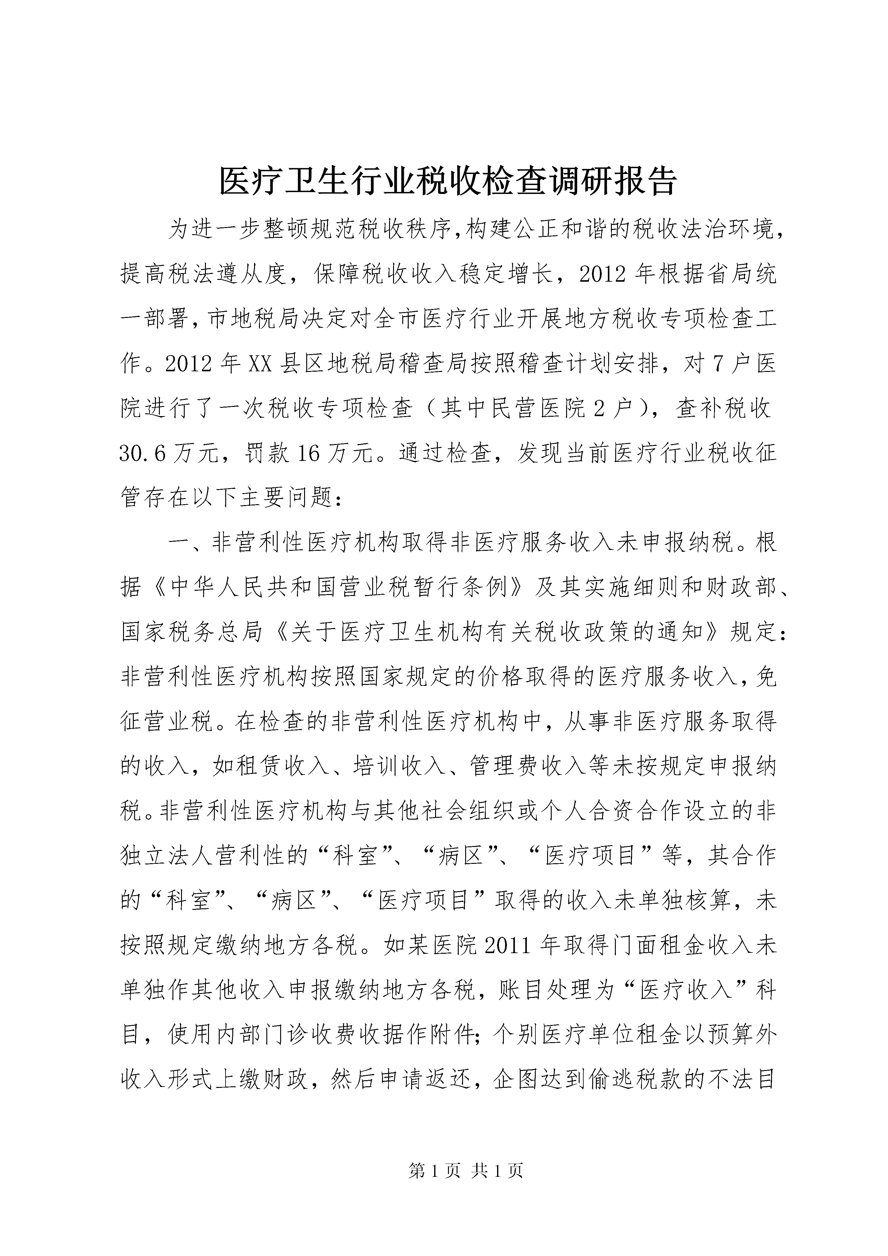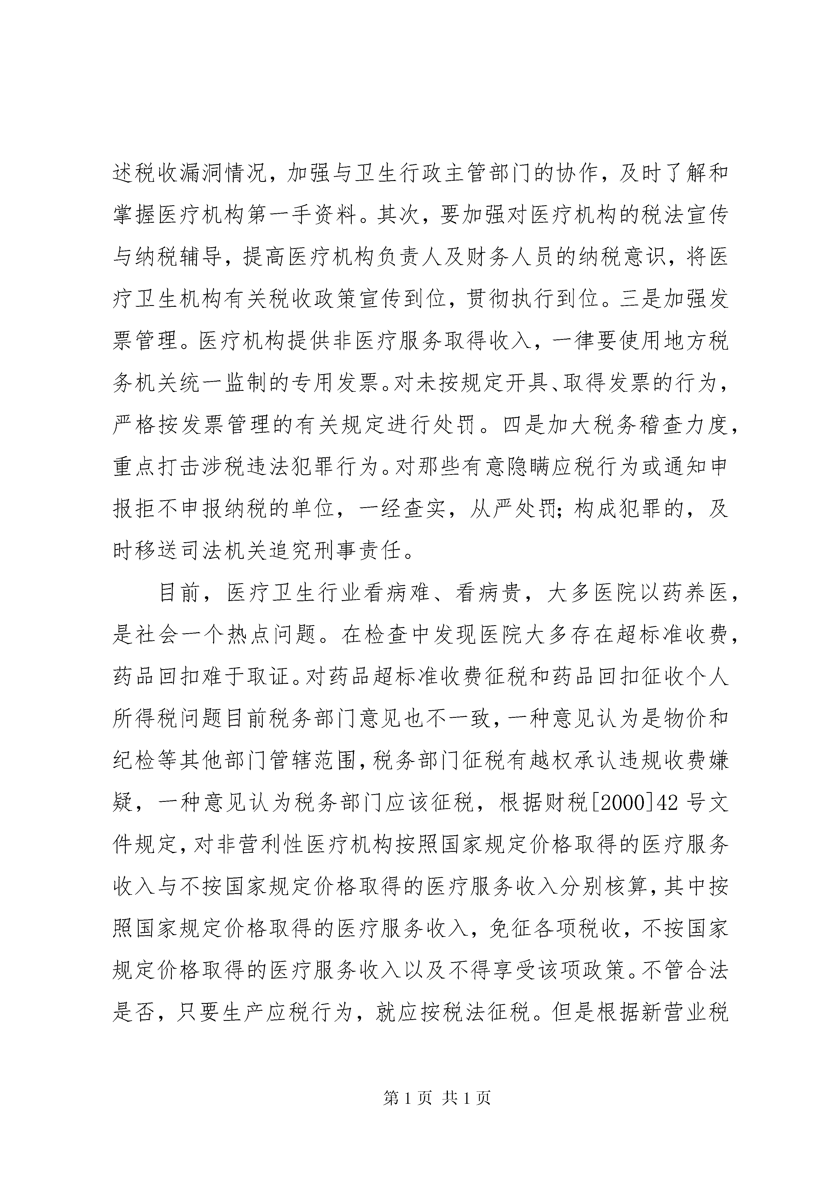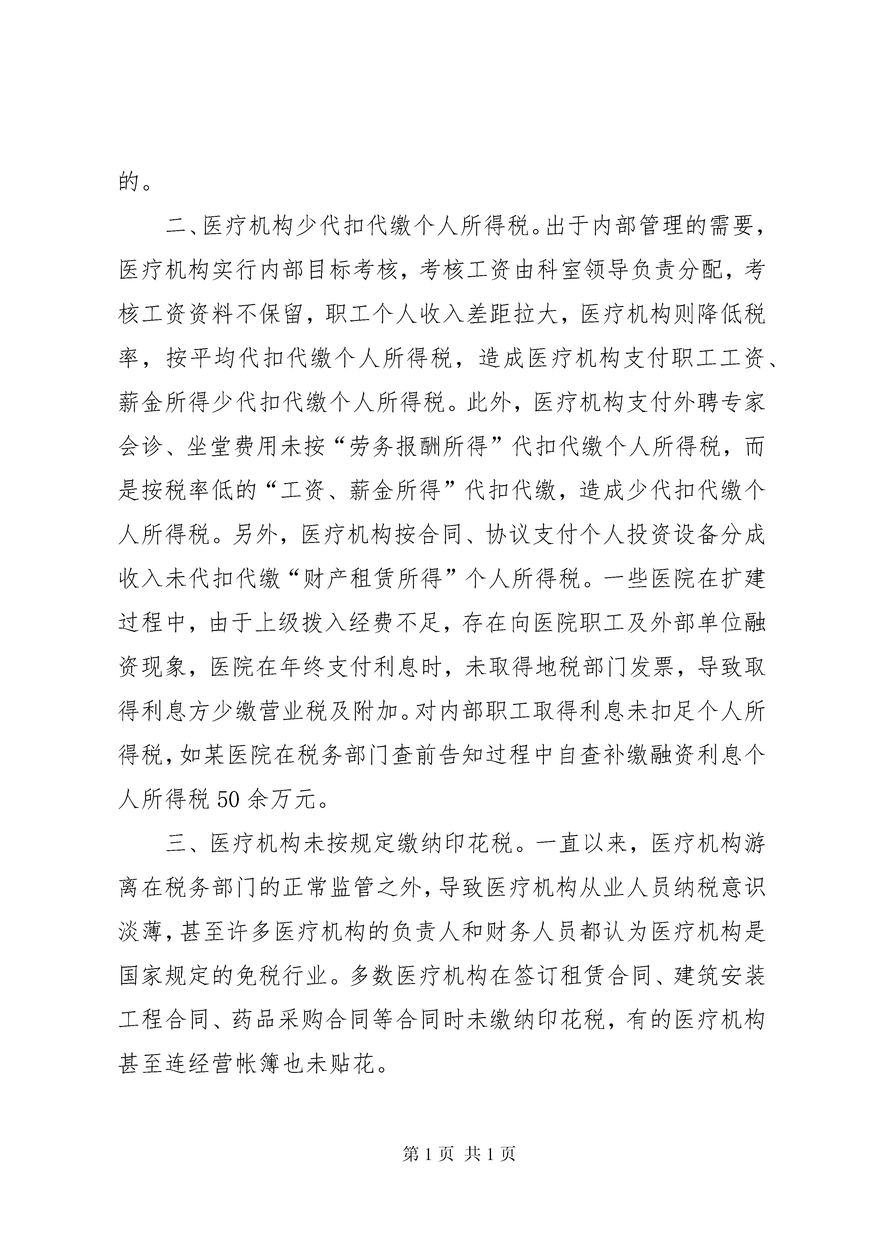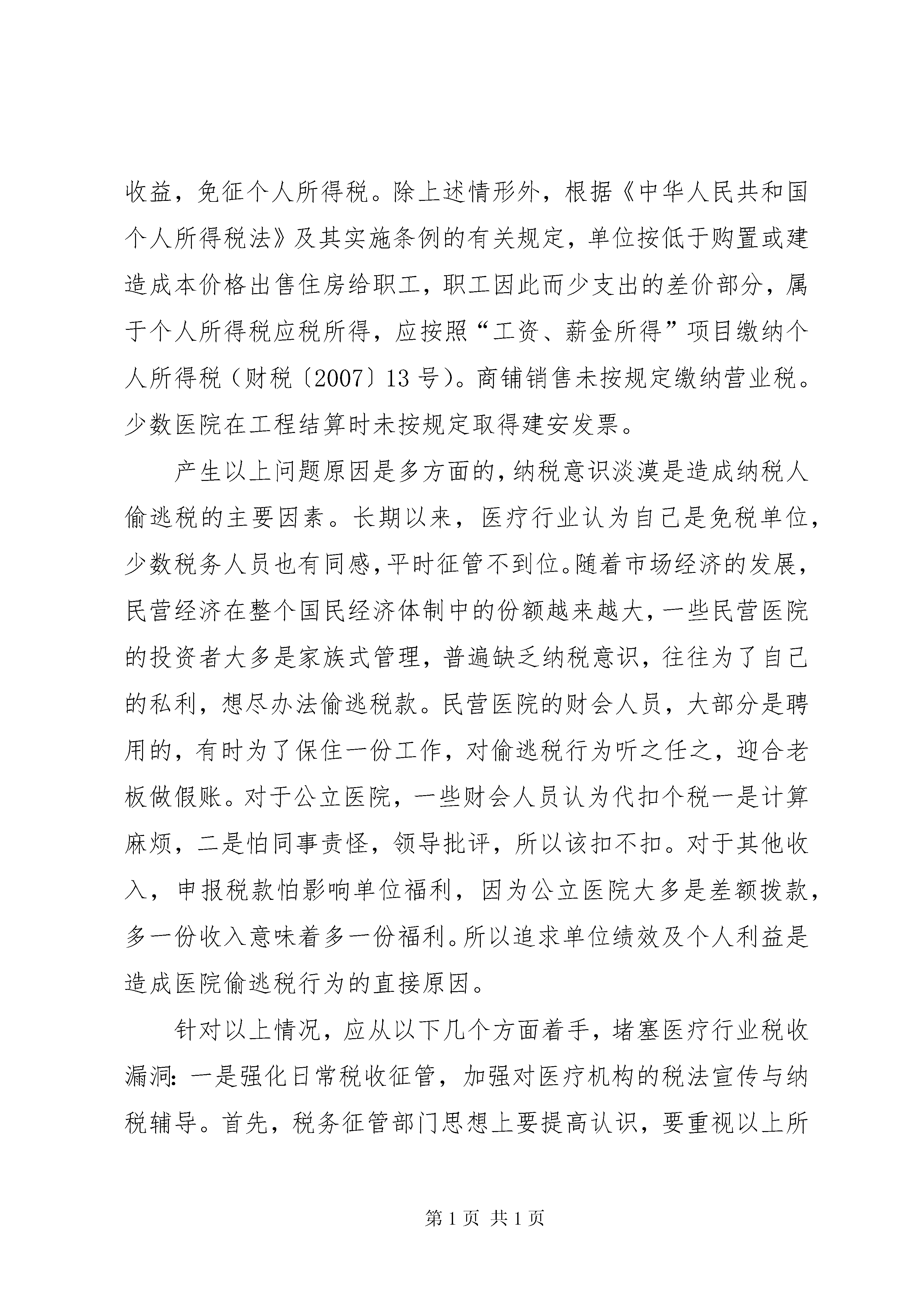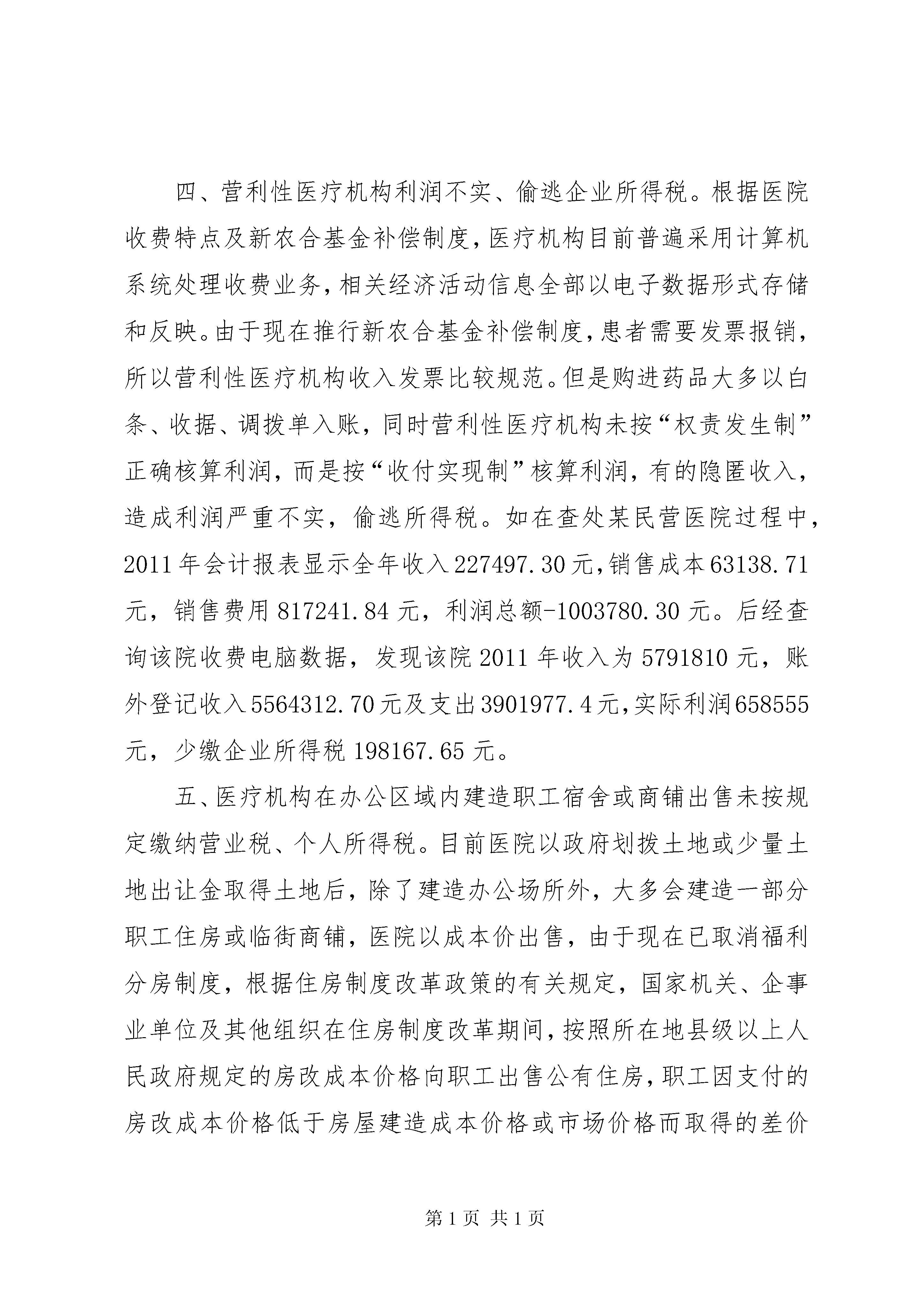 医疗卫生行业税收检查调研报告为进一步整顿规范税收秩序,构建公正和谐的税收法治环境,提高税法遵从度,保障税收收入稳定增长,2012年根据省局统一部署,市地税局决定对全市医疗行业开展地方税收专项检查工作。2012年XX县区地税局稽查局按照稽查计划安排,对7户医院进行了一次税收专项检查(其中民营医院2户),查补税收30.6万元,罚款16万元。通过检查,发现当前医疗行业税收征管存在以下主要问题:一、非营利性医疗机构取得非医疗服务收入未申报纳税。根据《中华人民共和国营业税暂行条例》及其实施细则和财政部、国家税务总局《关于医疗卫生机构有关税收政策的通知》规定:非营利性医疗机构按照国家规定的价格取得的医疗服务收入,免征营业税。在检查的非营利性医疗机构中,从事非医疗服务取得的收入,如租赁收入、培训收入、管理费收入等未按规定申报纳税。非营利性医疗机构与其他社会组织或个人合资合作设立的非独立法人营利性的“科室”、“病区”、“医疗项目”等,其合作的“科室”、“病区”、“医疗项目”取得的收入未单独核算,未按照规定缴纳地方各税。如某医院2011年取得门面租金收入未单独作其他收入申报缴纳地方各税,账目处理为“医疗收入”科目,使用内部门诊收费收据作附件;个别医疗单位租金以预算外收入形式上缴财政,然后申请返还,企图达到偷逃税款的不法目的。二、医疗机构少代扣代缴个人所得税。出于内部管理的需要,医疗机构实行内部目标考核,考核工资由科室领导负责分配,考核工资资料不保留,职工个人收入差距拉大,医疗机构则降低税率,按平均代扣代缴个人所得税,造成医疗机构支付职工工资、薪金所得少代扣代缴个人所得税。此外,医疗机构支付外聘专家会诊、坐堂费用未按“劳务报酬所得”代扣代缴个人所得税,而是按税率低的“工资、薪金所得”代扣代缴,造成少代扣代缴个人所得税。另外,医疗机构按合同、协议支付个人投资设备分成收入未代扣代缴“财产租赁所得”个人所得税。一些医院在扩建过程中,由于上级拨入经费不足,存在向医院职工及外部单位融资现象,医院在年终支付利息时,未取得地税部门发票,导致取得利息方少缴营业税及附加。对内部职工取得利息未扣足个人所得税,如某医院在税务部门查前告知过程中自查补缴融资利息个人所得税50余万元。三、医疗机构未按规定缴纳印花税。一直以来,医疗机构游离在税务部门的正常监管之外,导致医疗机构从业人员纳税意识淡薄,甚至许多医疗机构的负责人和财务人员都认为医疗机构是国家规定的免税行业。多数医疗机构在签订租赁合同、建筑安装工程合同、药品采购合同等合同时未缴纳印花税,有的医疗机构甚至连经营帐簿也未贴花。四、营利性医疗机构利润不实、偷逃企业所得税。根据医院收费特点及新农合基金补偿制度,医疗机构目前普遍采用计算机系统处理收费业务,相关经济活动信息全部以电子数据形式存储和反映。由于现在推行新农合基金补偿制度,患者需要发票报销,所以营利性医疗机构收入发票比较规范。但是购进药品大多以白条、收据、调拨单入账,同时营利性医疗机构未按“权责发生制”正确核算利润,而是按“收付实现制”核算利润,有的隐匿收入,造成利润严重不实,偷逃所得税。如在查处某民营医院过程中,2011年会计报表显示全年收入227497.30元,销售成本63138.71元,销售费用817241.84元,利润总额-1003780.30元。后经查询该院收费电脑数据,发现该院2011年收入为5791810元,账外登记收入5564312.70元及支出3901977.4元,实际利润658555元,少缴企业所得税198167.65元。五、医疗机构在办公区域内建造职工宿舍或商铺出售未按规定缴纳营业税、个人所得税。目前医院以政府划拨土地或少量土地出让金取得土地后,除了建造办公场所外,大多会建造一部分职工住房或临街商铺,医院以成本价出售,由于现在已取消福利分房制度,根据住房制度改革政策的有关规定,国家机关、企事业单位及其他组织在住房制度改革期间,按照所在地县级以上人民政府规定的房改成本价格向职工出售公有住房,职工因支付的房改成本价格低于房屋建造成本价格或市场价格而取得的差价收益,免征个人所得税。除上述情形外,根据《中华人民共和国个人所得税法》及其实施条例的有关规定,单位按低于购置或建造成本价格出售住房给职工,职工因此而少支出的差价部分,属于个人所得税应税所得,应按照“工资、薪金所得”项目缴纳个人所得税(财税〔2007〕13号)。商铺销售未按规定缴纳营业税。少数医院在工程结算时未按规定取得建安发票。产生以上问题原因是多方面的,纳税意识淡漠是造成纳税人偷逃税的主要因素。长期以来,医疗行业认为自己是免税单位,少数税务人员也有同感,平时征管不到位。随着市场经济的发展,民营经济在整个国民经济体制中的份额越来越大,一些民营医院的投资者大多是家族式管理,