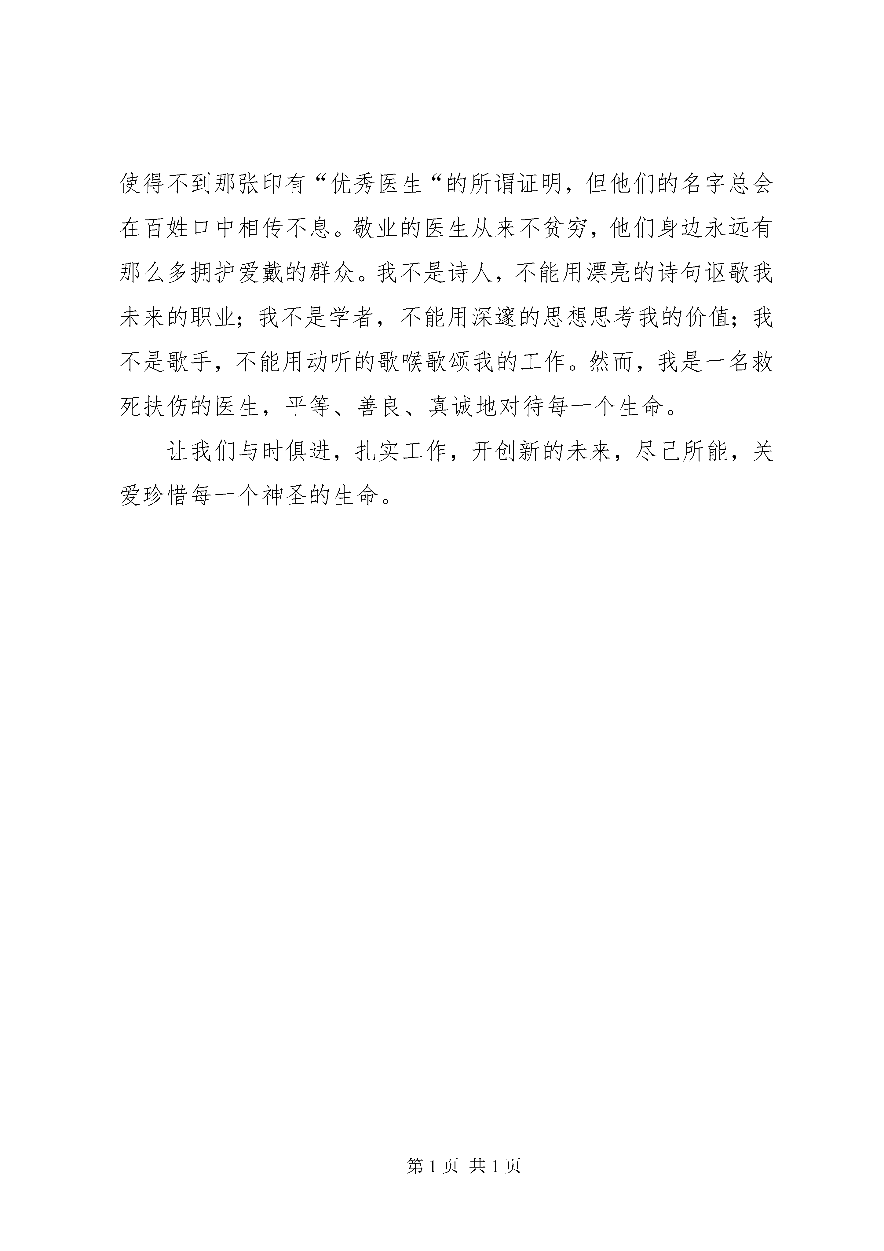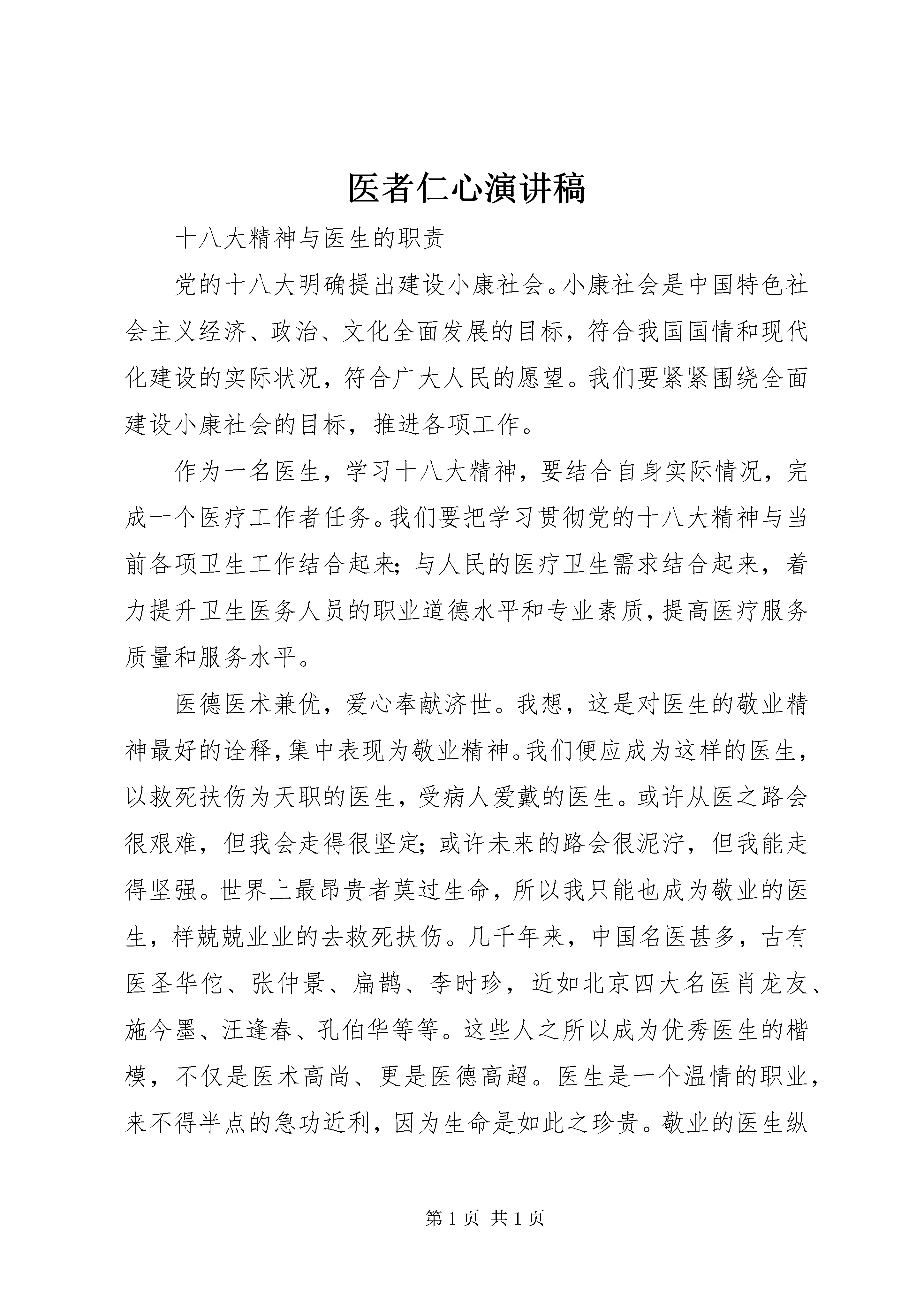 医者仁心演讲稿十八大精神与医生的职责党的十八大明确提出建设小康社会。小康社会是中国特色社会主义经济、政治、文化全面发展的目标,符合我国国情和现代化建设的实际状况,符合广大人民的愿望。我们要紧紧围绕全面建设小康社会的目标,推进各项工作。作为一名医生,学习十八大精神,要结合自身实际情况,完成一个医疗工作者任务。我们要把学习贯彻党的十八大精神与当前各项卫生工作结合起来;与人民的医疗卫生需求结合起来,着力提升卫生医务人员的职业道德水平和专业素质,提高医疗服务质量和服务水平。医德医术兼优,爱心奉献济世。我想,这是对医生的敬业精神最好的诠释,集中表现为敬业精神。我们便应成为这样的医生,以救死扶伤为天职的医生,受病人爱戴的医生。或许从医之路会很艰难,但我会走得很坚定;或许未来的路会很泥泞,但我能走得坚强。世界上最昂贵者莫过生命,所以我只能也成为敬业的医生,样兢兢业业的去救死扶伤。几千年来,中国名医甚多,古有医圣华佗、张仲景、扁鹊、李时珍,近如北京四大名医肖龙友、施今墨、汪逢春、孔伯华等等。这些人之所以成为优秀医生的楷模,不仅是医术高尚、更是医德高超。医生是一个温情的职业,来不得半点的急功近利,因为生命是如此之珍贵。敬业的医生纵使得不到那张印有“优秀医生“的所谓证明,但他们的名字总会在百姓口中相传不息。敬业的医生从来不贫穷,他们身边永远有那么多拥护爱戴的群众。我不是诗人,不能用漂亮的诗句讴歌我未来的职业;我不是学者,不能用深邃的思想思考我的价值;我不是歌手,不能用动听的歌喉歌颂我的工作。然而,我是一名救死扶伤的医生,平等、善良、真诚地对待每一个生命。让我们与时俱进,扎实工作,开创新的未来,尽己所能,关爱珍惜每一个神圣的生命。
