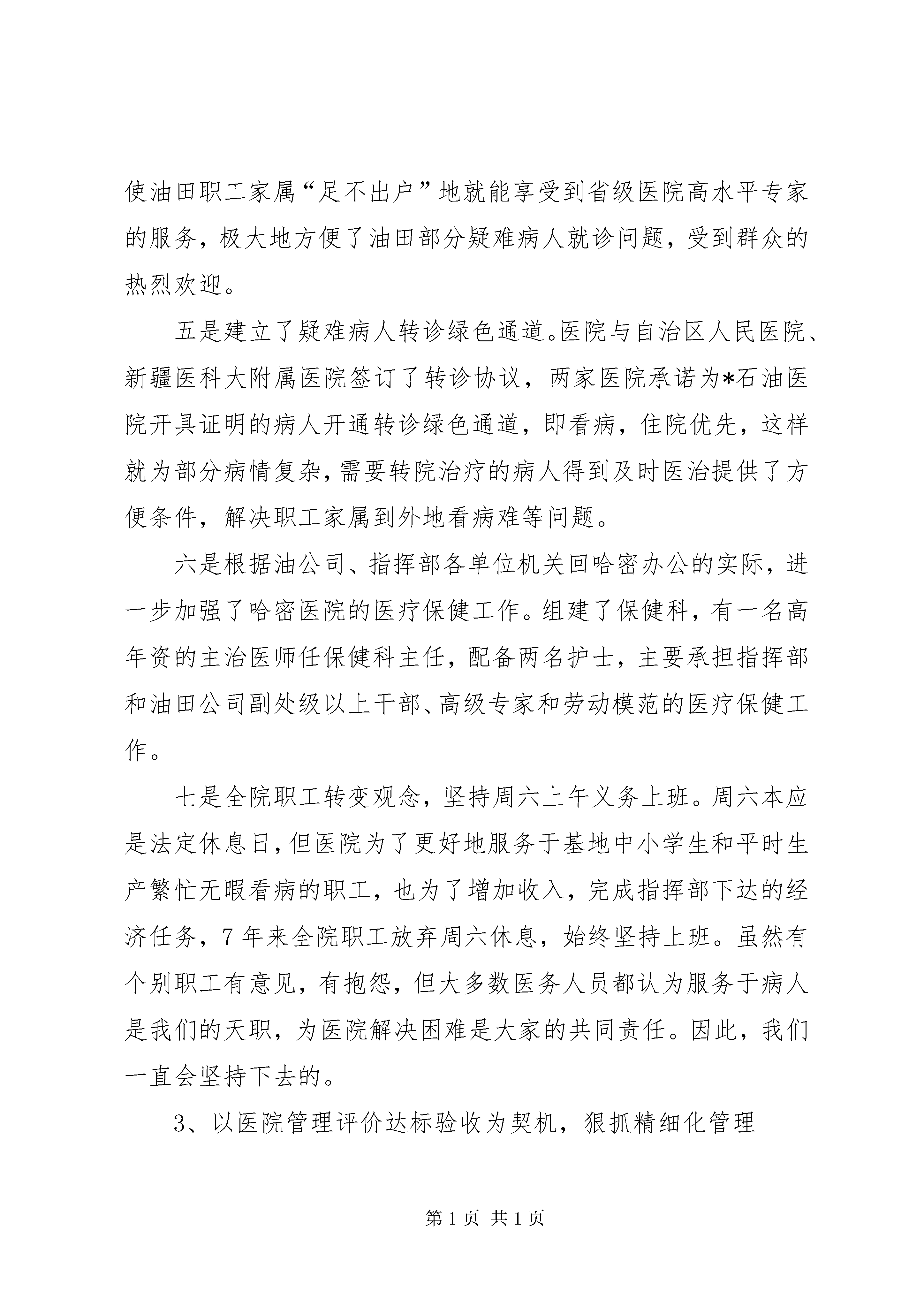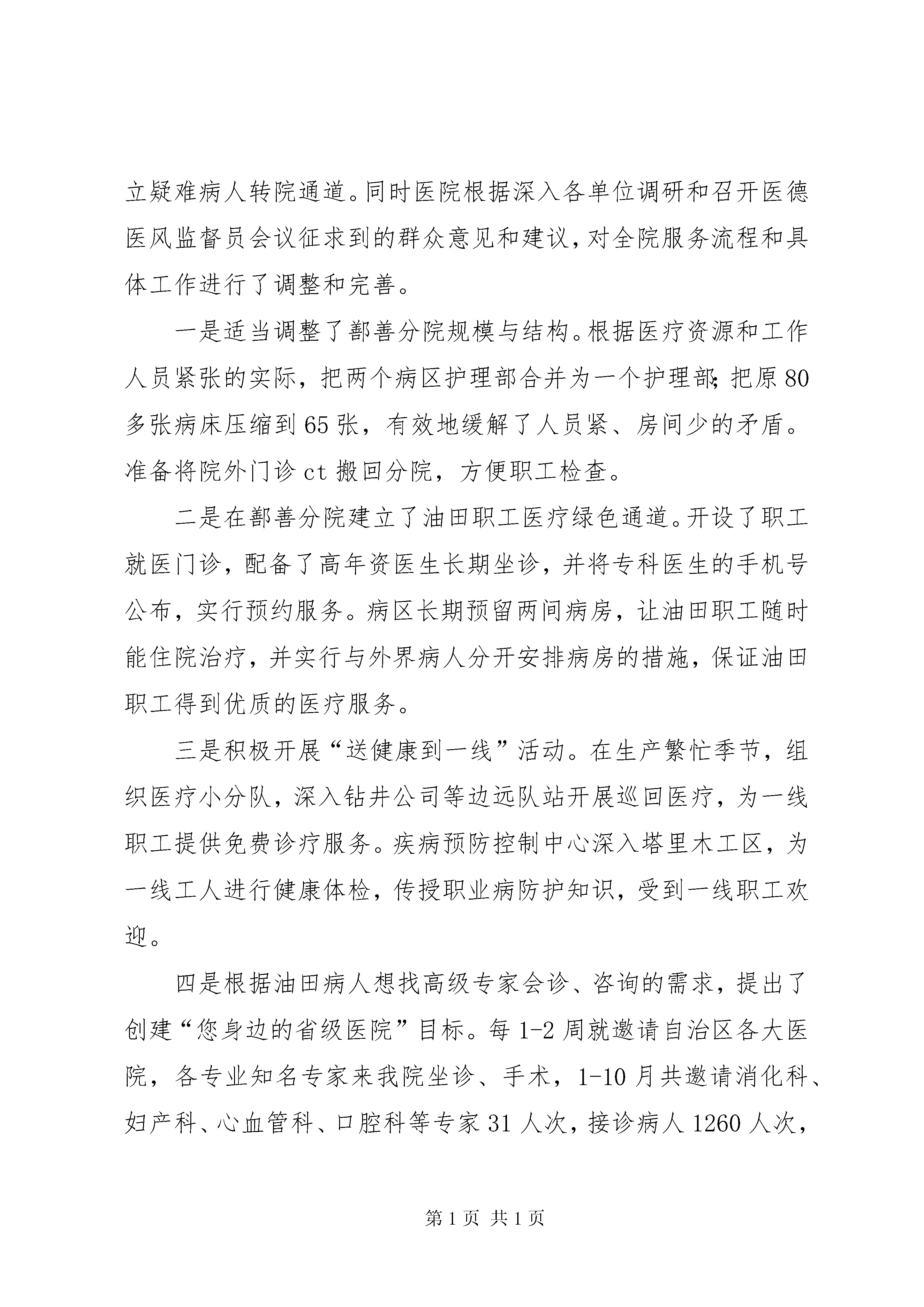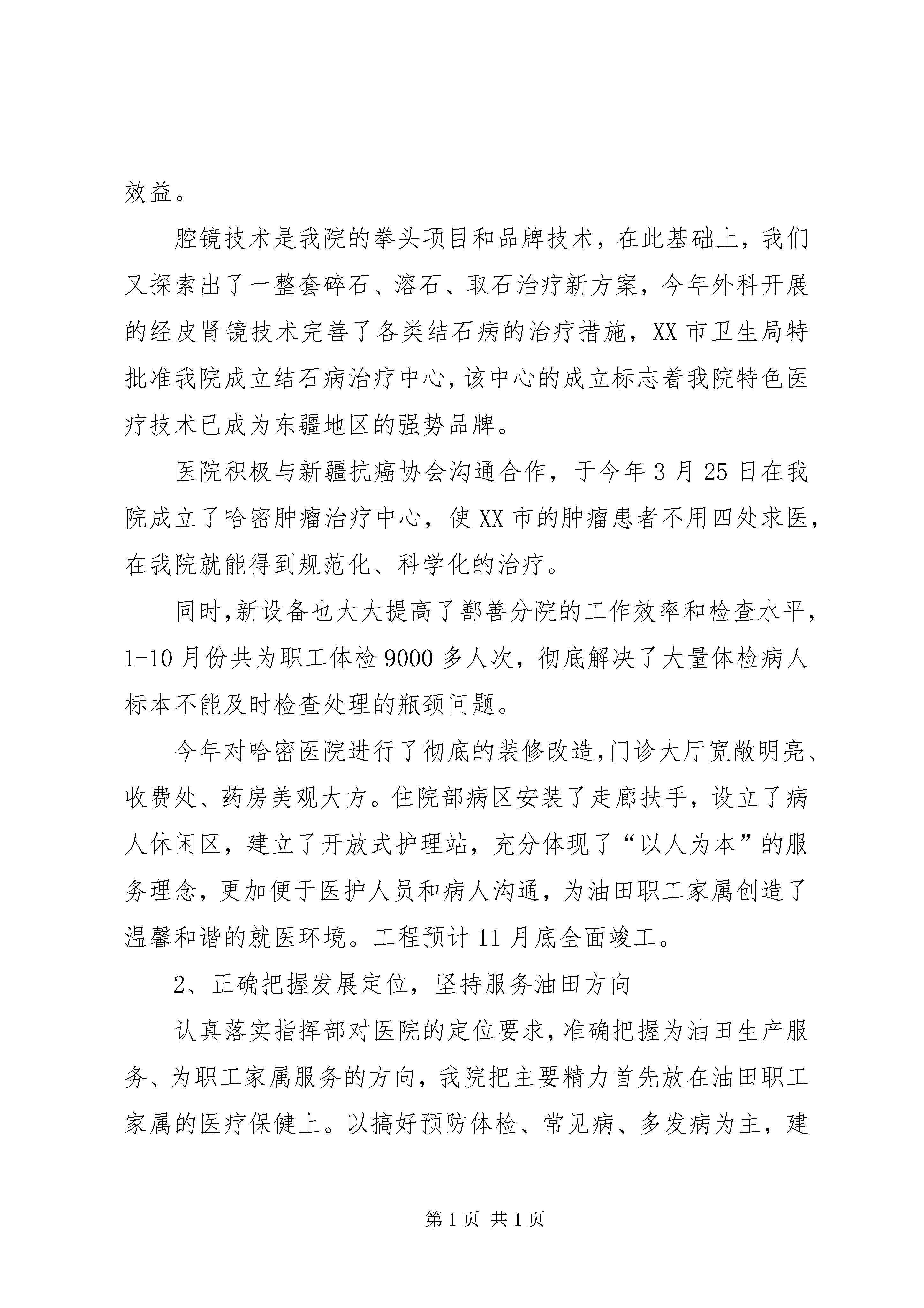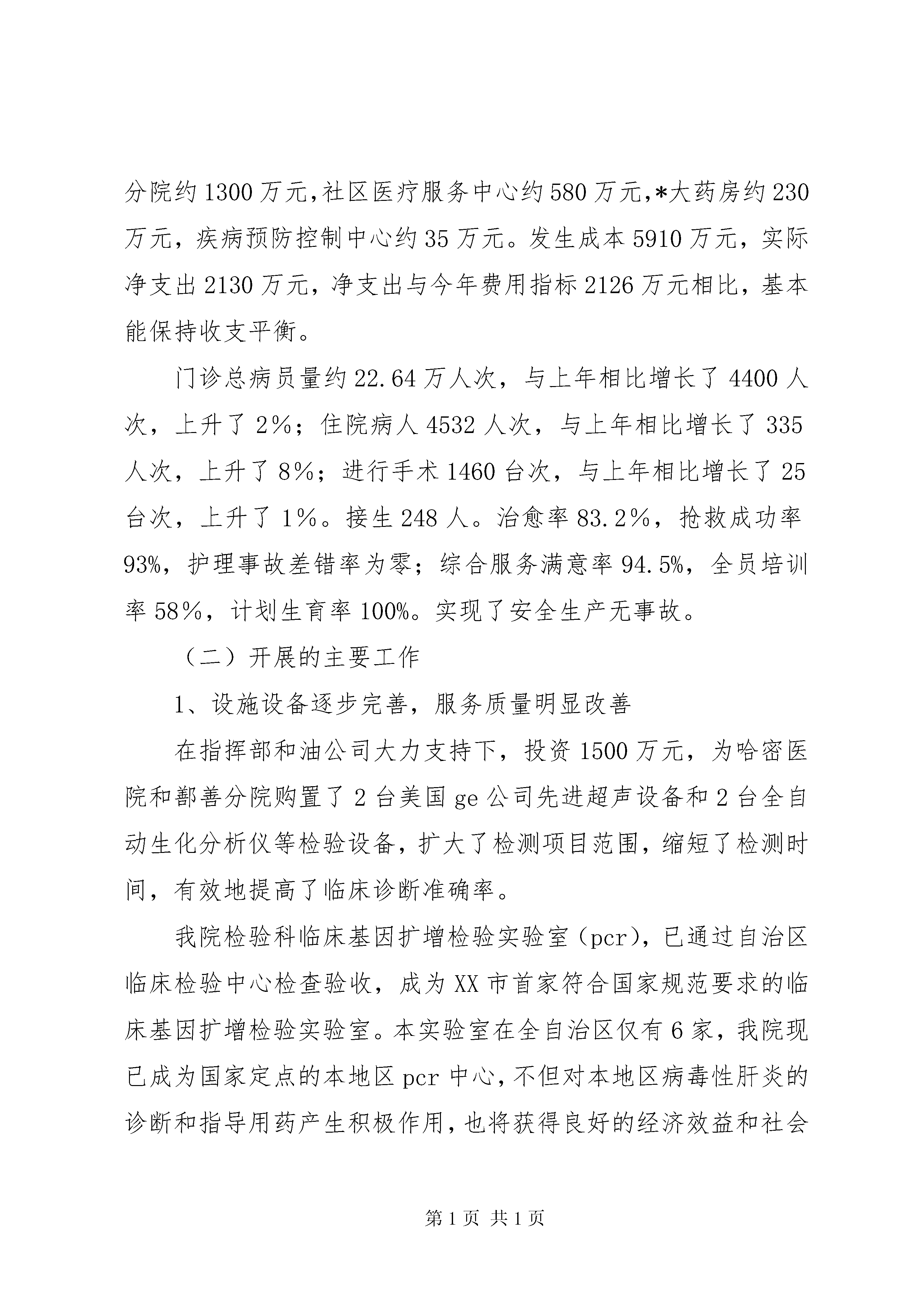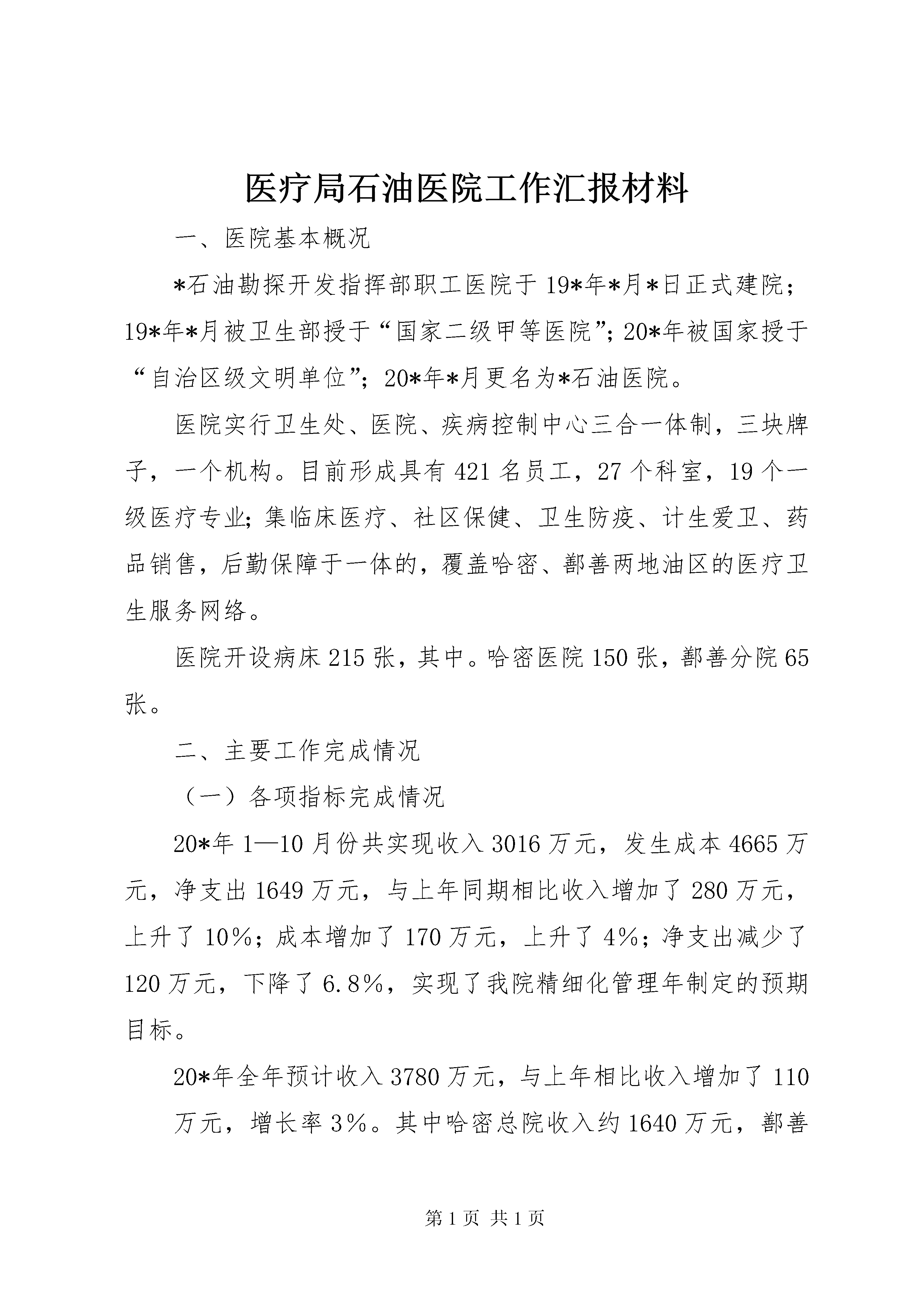 医疗局石油医院工作汇报材料一、医院基本概况*石油勘探开发指挥部职工医院于19*年*月*日正式建院;19*年*月被卫生部授于“国家二级甲等医院”;20*年被国家授于“自治区级文明单位”;20*年*月更名为*石油医院。医院实行卫生处、医院、疾病控制中心三合一体制,三块牌子,一个机构。目前形成具有421名员工,27个科室,19个一级医疗专业;集临床医疗、社区保健、卫生防疫、计生爱卫、药品销售,后勤保障于一体的,覆盖哈密、鄯善两地油区的医疗卫生服务网络。医院开设病床215张,其中。哈密医院150张,鄯善分院65张。二、主要工作完成情况(一)各项指标完成情况20*年1—10月份共实现收入3016万元,发生成本4665万元,净支出1649万元,与上年同期相比收入增加了280万元,上升了10%;成本增加了170万元,上升了4%;净支出减少了120万元,下降了6.8%,实现了我院精细化管理年制定的预期目标。20*年全年预计收入3780万元,与上年相比收入增加了110万元,增长率3%。其中哈密总院收入约1640万元,鄯善分院约1300万元,社区医疗服务中心约580万元,*大药房约230万元,疾病预防控制中心约35万元。发生成本5910万元,实际净支出2130万元,净支出与今年费用指标2126万元相比,基本能保持收支平衡。门诊总病员量约22.64万人次,与上年相比增长了4400人次,上升了2%;住院病人4532人次,与上年相比增长了335人次,上升了8%;进行手术1460台次,与上年相比增长了25台次,上升了1%。接生248人。治愈率83.2%,抢救成功率93%,护理事故差错率为零;综合服务满意率94.5%,全员培训率58%,计划生育率100%。实现了安全生产无事故。(二)开展的主要工作1、设施设备逐步完善,服务质量明显改善在指挥部和油公司大力支持下,投资1500万元,为哈密医院和鄯善分院购置了2台美国ge公司先进超声设备和2台全自动生化分析仪等检验设备,扩大了检测项目范围,缩短了检测时间,有效地提高了临床诊断准确率。我院检验科临床基因扩增检验实验室(pcr),已通过自治区临床检验中心检查验收,成为XX市首家符合国家规范要求的临床基因扩增检验实验室。本实验室在全自治区仅有6家,我院现已成为国家定点的本地区pcr中心,不但对本地区病毒性肝炎的诊断和指导用药产生积极作用,也将获得良好的经济效益和社会效益。腔镜技术是我院的拳头项目和品牌技术,在此基础上,我们又探索出了一整套碎石、溶石、取石治疗新方案,今年外科开展的经皮肾镜技术完善了各类结石病的治疗措施,XX市卫生局特批准我院成立结石病治疗中心,该中心的成立标志着我院特色医疗技术已成为东疆地区的强势品牌。医院积极与新疆抗癌协会沟通合作,于今年3月25日在我院成立了哈密肿瘤治疗中心,使XX市的肿瘤患者不用四处求医,在我院就能得到规范化、科学化的治疗。同时,新设备也大大提高了鄯善分院的工作效率和检查水平,1-10月份共为职工体检9000多人次,彻底解决了大量体检病人标本不能及时检查处理的瓶颈问题。今年对哈密医院进行了彻底的装修改造,门诊大厅宽敞明亮、收费处、药房美观大方。住院部病区安装了走廊扶手,设立了病人休闲区,建立了开放式护理站,充分体现了“以人为本”的服务理念,更加便于医护人员和病人沟通,为油田职工家属创造了温馨和谐的就医环境。工程预计11月底全面竣工。2、正确把握发展定位,坚持服务油田方向认真落实指挥部对医院的定位要求,准确把握为油田生产服务、为职工家属服务的方向,我院把主要精力首先放在油田职工家属的医疗保健上。以搞好预防体检、常见病、多发病为主,建立疑难病人转院通道。同时医院根据深入各单位调研和召开医德医风监督员会议征求到的群众意见和建议,对全院服务流程和具体工作进行了调整和完善。一是适当调整了鄯善分院规模与结构。根据医疗资源和工作人员紧张的实际,把两个病区护理部合并为一个护理部;把原80多张病床压缩到65张,有效地缓解了人员紧、房间少的矛盾。准备将院外门诊ct搬回分院,方便职工检查。二是在鄯善分院建立了油田职工医疗绿色通道。开设了职工就医门诊,配备了高年资医生长期坐诊,并将专科医生的手机号公布,实行预约服务。病区长期预留两间病房,让油田职工随时能住院治疗,并实行与外界病人分开安排病房的措施,保证油田职工得到优质的医疗服务。三是积极开展“送健康到一线”活动。在生产繁忙季节,组织医疗小分队,深入钻井公司等边远队站开展巡回医疗,为一线职工提供免费诊疗服务。疾病预防控制中心深入塔里木工区,为一线工人进行健康体检,传授职业病防护知识,受到一线职工欢迎。四是根据油田病人想找高级专家会诊、咨询的需求,提出了创建“您身边的省级医院”目标。每1-2周就邀请自治区各大医院,各专业知名专家来