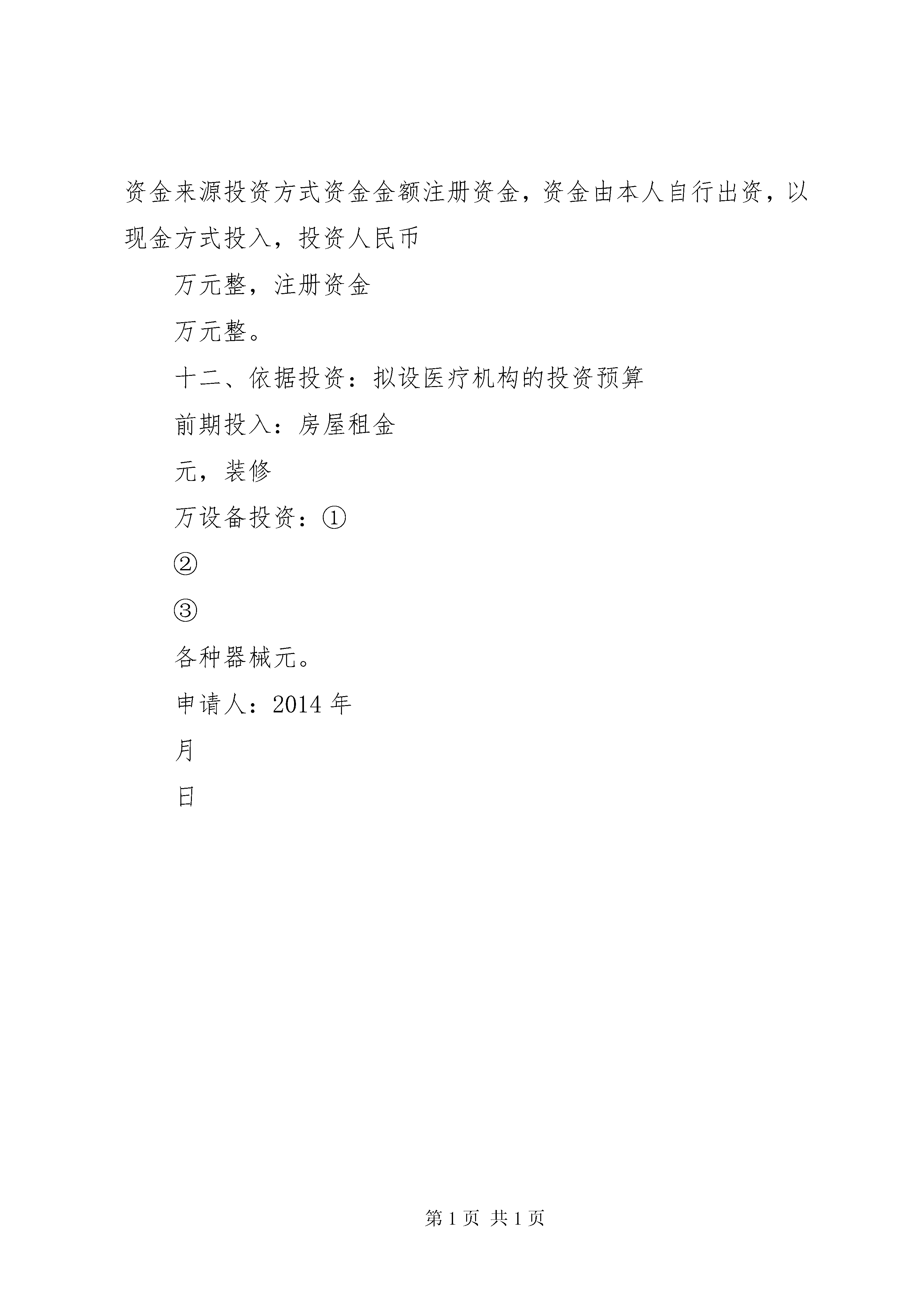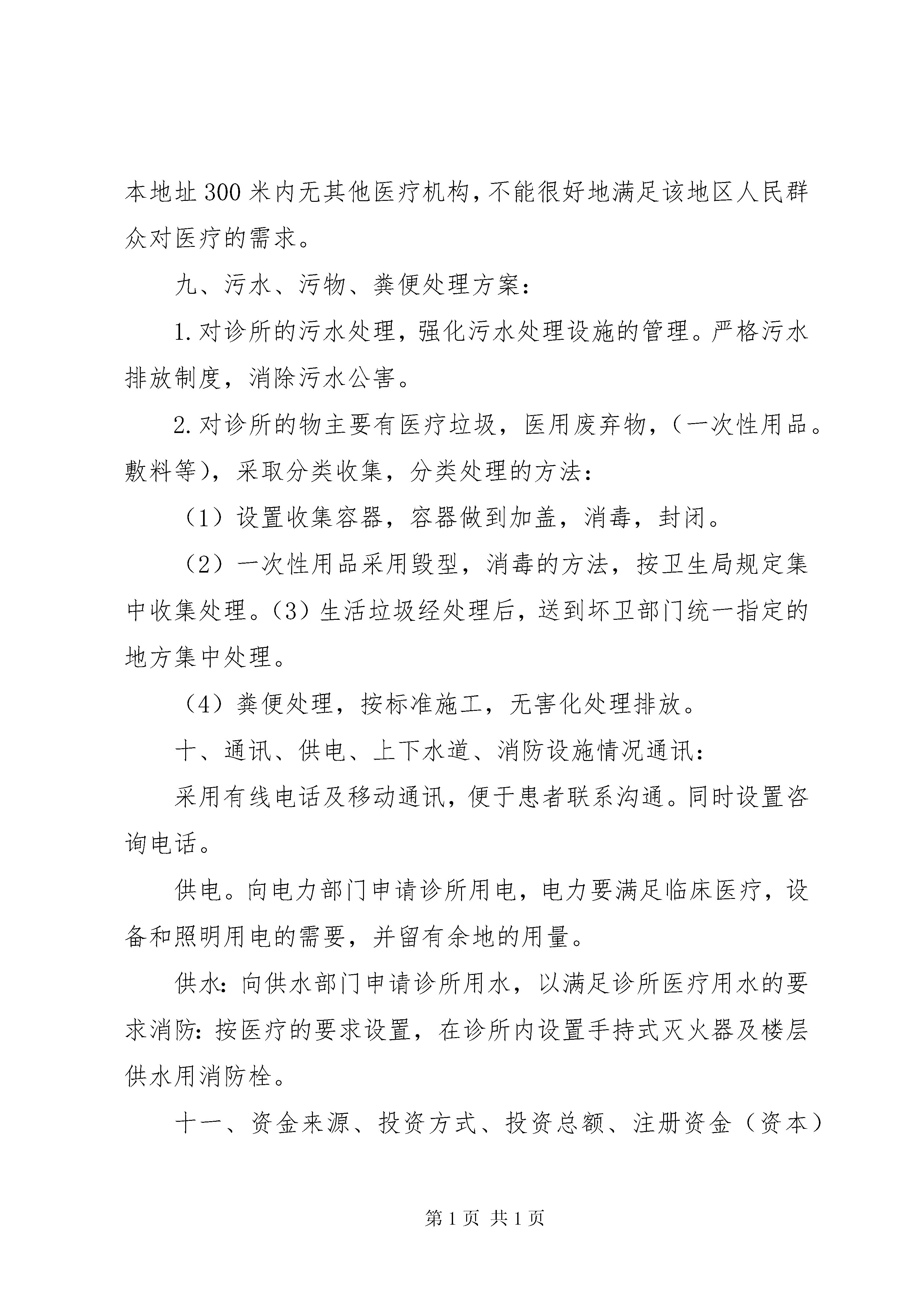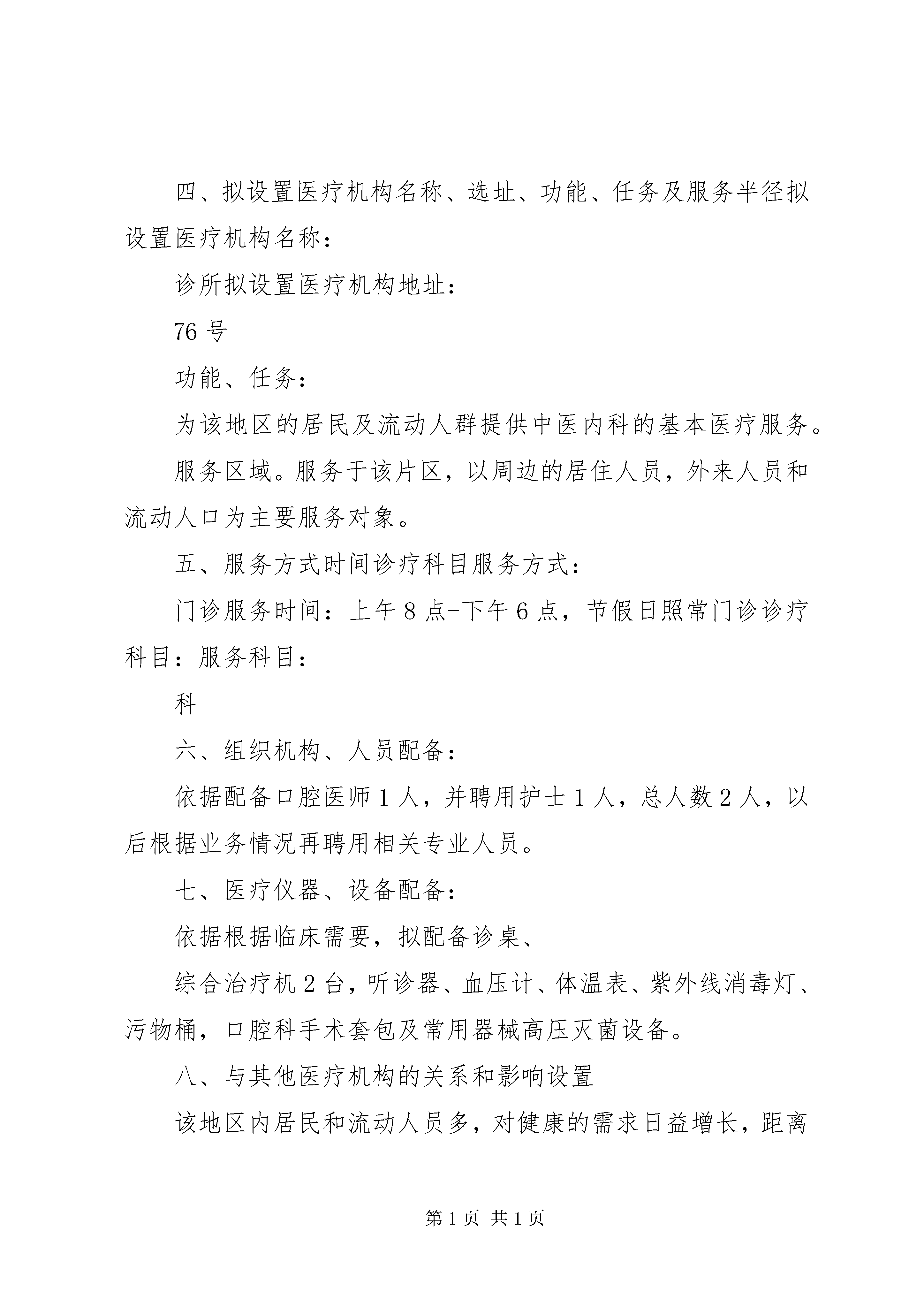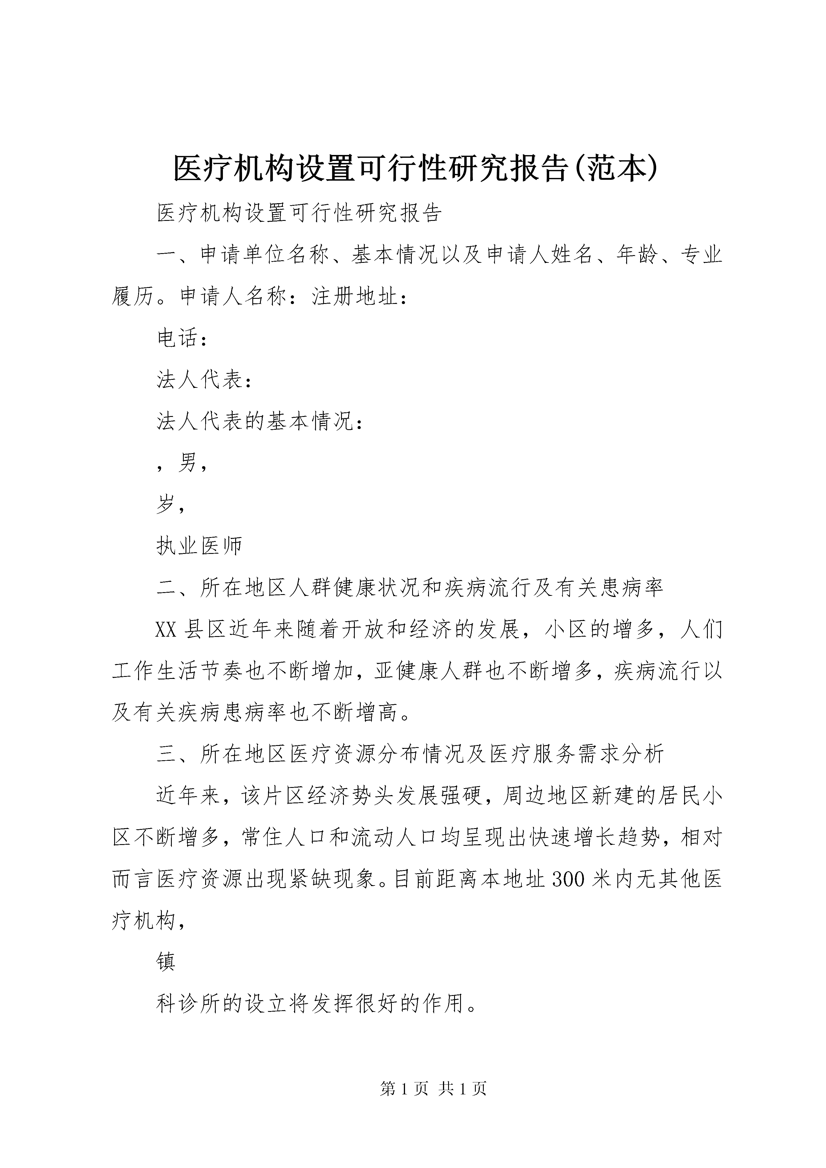 医疗机构设置可行性研究报告(范本)医疗机构设置可行性研究报告一、申请单位名称、基本情况以及申请人姓名、年龄、专业履历。申请人名称:注册地址:电话:法人代表:法人代表的基本情况:,男,岁,执业医师二、所在地区人群健康状况和疾病流行及有关患病率XX县区近年来随着开放和经济的发展,小区的增多,人们工作生活节奏也不断增加,亚健康人群也不断增多,疾病流行以及有关疾病患病率也不断增高。三、所在地区医疗资源分布情况及医疗服务需求分析近年来,该片区经济势头发展强硬,周边地区新建的居民小区不断增多,常住人口和流动人口均呈现出快速增长趋势,相对而言医疗资源出现紧缺现象。目前距离本地址300米内无其他医疗机构,镇科诊所的设立将发挥很好的作用。四、拟设置医疗机构名称、选址、功能、任务及服务半径拟设置医疗机构名称:诊所拟设置医疗机构地址:76号功能、任务:为该地区的居民及流动人群提供中医内科的基本医疗服务。服务区域。服务于该片区,以周边的居住人员,外来人员和流动人口为主要服务对象。五、服务方式时间诊疗科目服务方式:门诊服务时间:上午8点-下午6点,节假日照常门诊诊疗科目:服务科目:科六、组织机构、人员配备:依据配备口腔医师1人,并聘用护士1人,总人数2人,以后根据业务情况再聘用相关专业人员。七、医疗仪器、设备配备:依据根据临床需要,拟配备诊桌、综合治疗机2台,听诊器、血压计、体温表、紫外线消毒灯、污物桶,口腔科手术套包及常用器械高压灭菌设备。八、与其他医疗机构的关系和影响设置该地区内居民和流动人员多,对健康的需求日益增长,距离本地址300米内无其他医疗机构,不能很好地满足该地区人民群众对医疗的需求。九、污水、污物、粪便处理方案:1.对诊所的污水处理,强化污水处理设施的管理。严格污水排放制度,消除污水公害。2.对诊所的物主要有医疗垃圾,医用废弃物,(一次性用品。敷料等),采取分类收集,分类处理的方法:(1)设置收集容器,容器做到加盖,消毒,封闭。(2)一次性用品采用毁型,消毒的方法,按卫生局规定集中收集处理。(3)生活垃圾经处理后,送到坏卫部门统一指定的地方集中处理。(4)粪便处理,按标准施工,无害化处理排放。十、通讯、供电、上下水道、消防设施情况通讯:采用有线电话及移动通讯,便于患者联系沟通。同时设置咨询电话。供电。向电力部门申请诊所用电,电力要满足临床医疗,设备和照明用电的需要,并留有余地的用量。供水:向供水部门申请诊所用水,以满足诊所医疗用水的要求消防:按医疗的要求设置,在诊所内设置手持式灭火器及楼层供水用消防栓。十一、资金来源、投资方式、投资总额、注册资金(资本)资金来源投资方式资金金额注册资金,资金由本人自行出资,以现金方式投入,投资人民币万元整,注册资金万元整。十二、依据投资:拟设医疗机构的投资预算前期投入:房屋租金元,装修万设备投资:①②③各种器械元。申请人:2014年月日