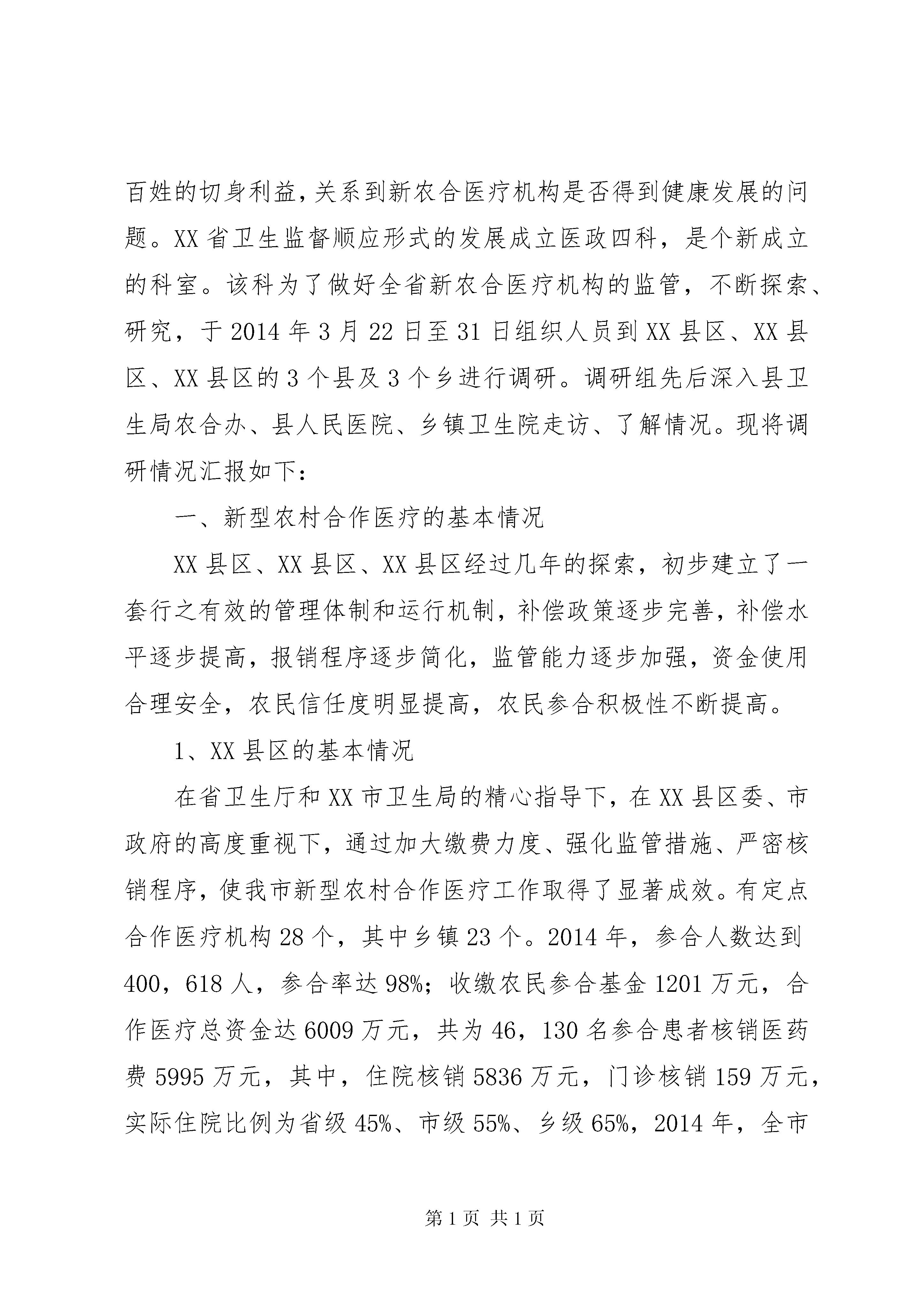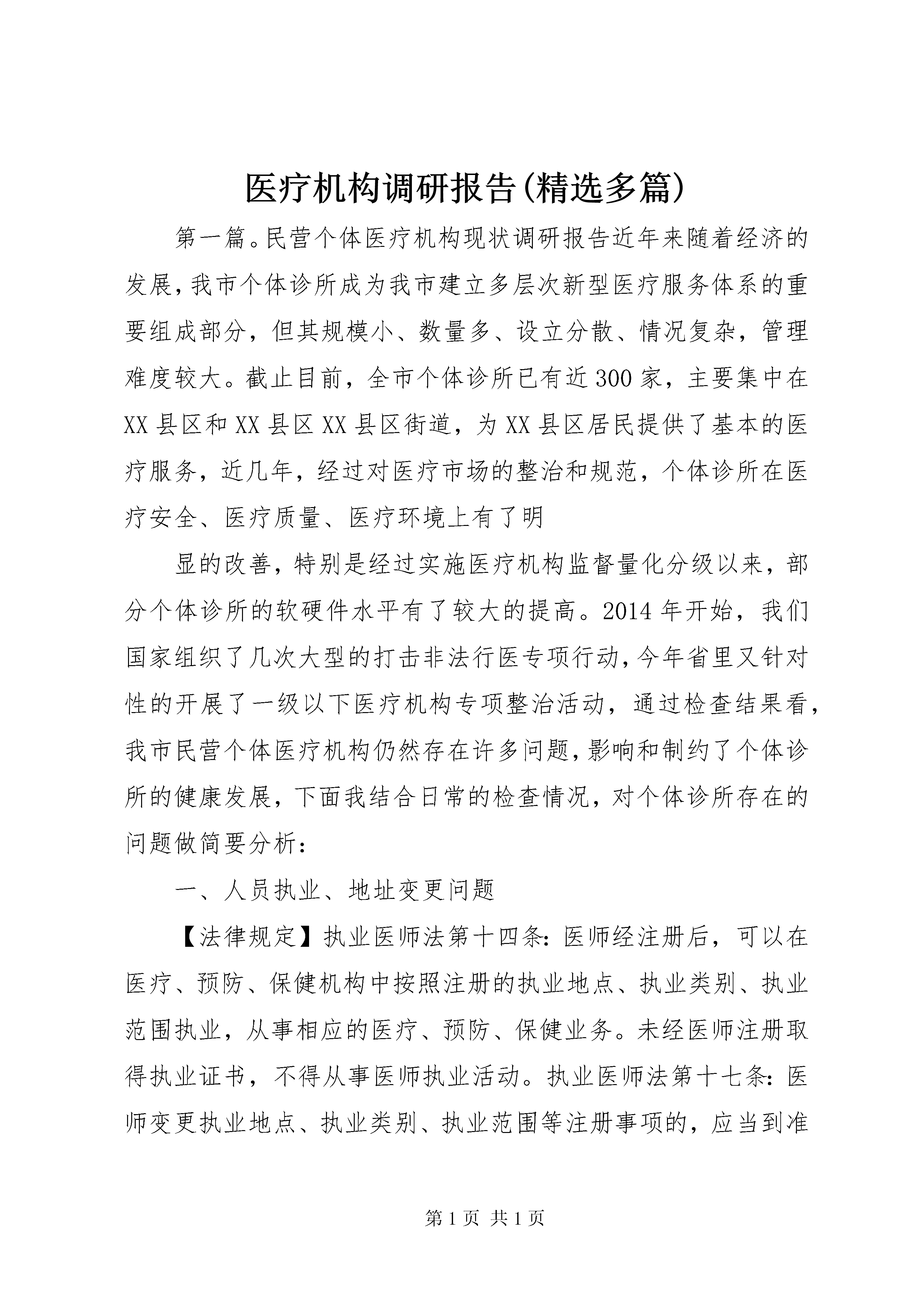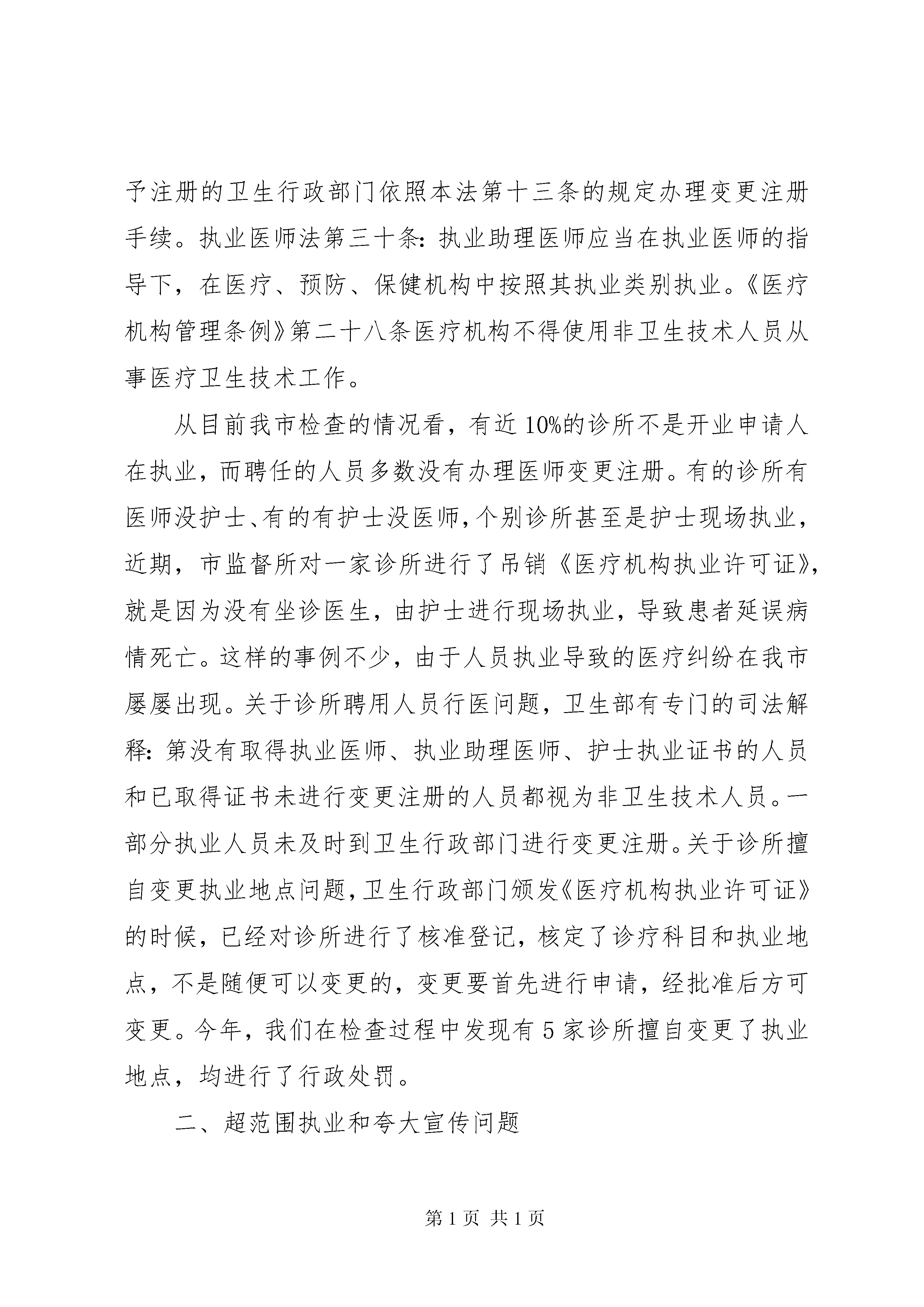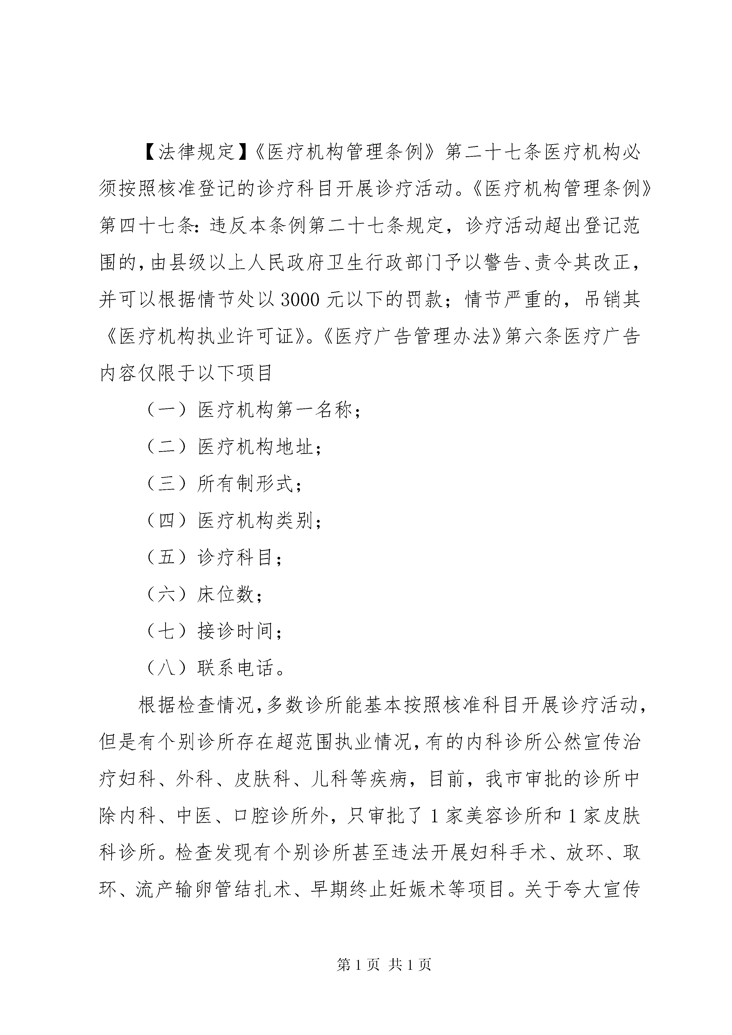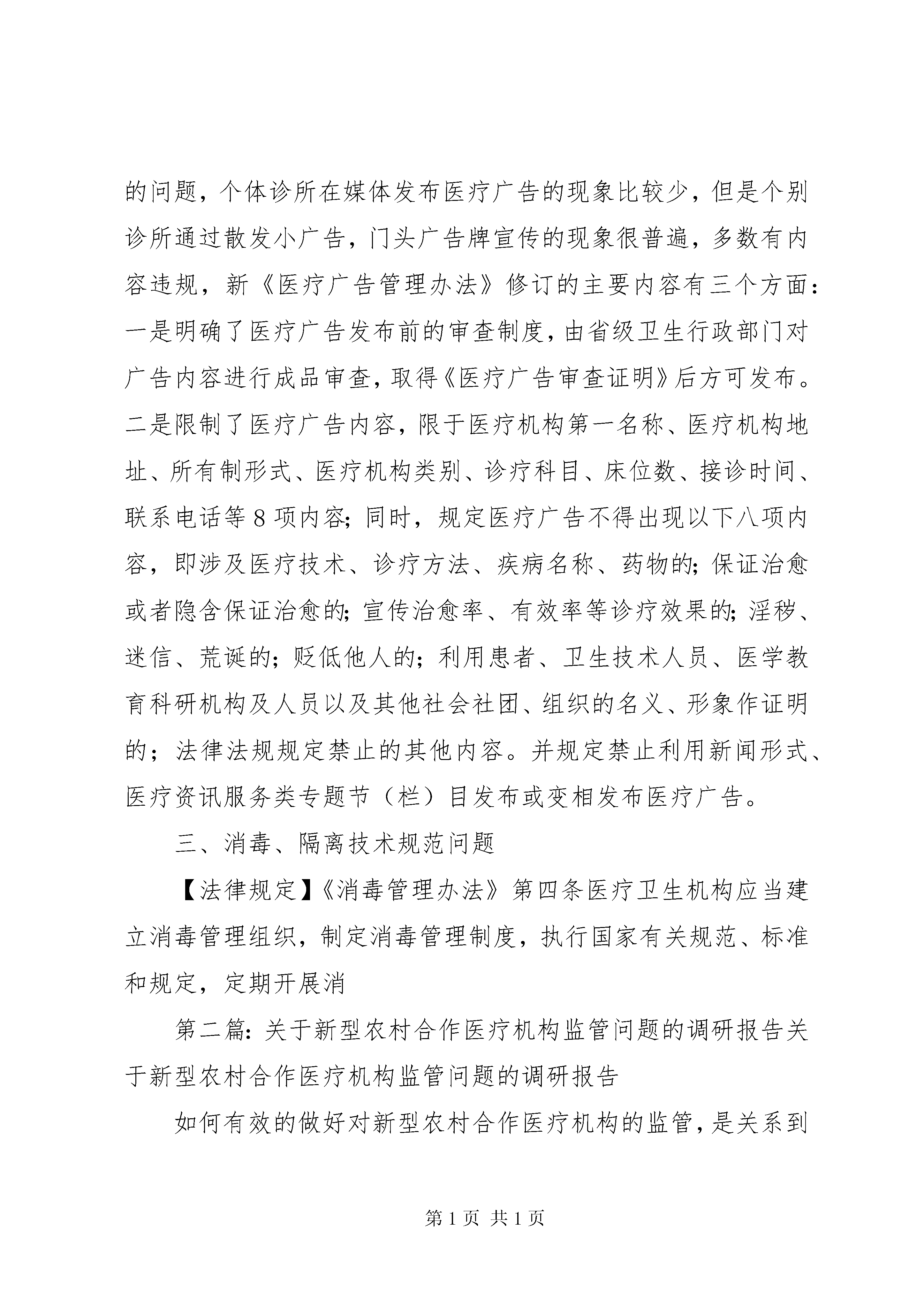 医疗机构调研报告(精选多篇)第一篇。民营个体医疗机构现状调研报告近年来随着经济的发展,我市个体诊所成为我市建立多层次新型医疗服务体系的重要组成部分,但其规模小、数量多、设立分散、情况复杂,管理难度较大。截止目前,全市个体诊所已有近300家,主要集中在XX县区和XX县区XX县区街道,为XX县区居民提供了基本的医疗服务,近几年,经过对医疗市场的整治和规范,个体诊所在医疗安全、医疗质量、医疗环境上有了明显的改善,特别是经过实施医疗机构监督量化分级以来,部分个体诊所的软硬件水平有了较大的提高。2014年开始,我们国家组织了几次大型的打击非法行医专项行动,今年省里又针对性的开展了一级以下医疗机构专项整治活动,通过检查结果看,我市民营个体医疗机构仍然存在许多问题,影响和制约了个体诊所的健康发展,下面我结合日常的检查情况,对个体诊所存在的问题做简要分析:一、人员执业、地址变更问题【法律规定】执业医师法第十四条:医师经注册后,可以在医疗、预防、保健机构中按照注册的执业地点、执业类别、执业范围执业,从事相应的医疗、预防、保健业务。未经医师注册取得执业证书,不得从事医师执业活动。执业医师法第十七条:医师变更执业地点、执业类别、执业范围等注册事项的,应当到准予注册的卫生行政部门依照本法第十三条的规定办理变更注册手续。执业医师法第三十条:执业助理医师应当在执业医师的指导下,在医疗、预防、保健机构中按照其执业类别执业。《医疗机构管理条例》第二十八条医疗机构不得使用非卫生技术人员从事医疗卫生技术工作。从目前我市检查的情况看,有近10%的诊所不是开业申请人在执业,而聘任的人员多数没有办理医师变更注册。有的诊所有医师没护士、有的有护士没医师,个别诊所甚至是护士现场执业,近期,市监督所对一家诊所进行了吊销《医疗机构执业许可证》,就是因为没有坐诊医生,由护士进行现场执业,导致患者延误病情死亡。这样的事例不少,由于人员执业导致的医疗纠纷在我市屡屡出现。关于诊所聘用人员行医问题,卫生部有专门的司法解释:第没有取得执业医师、执业助理医师、护士执业证书的人员和已取得证书未进行变更注册的人员都视为非卫生技术人员。一部分执业人员未及时到卫生行政部门进行变更注册。关于诊所擅自变更执业地点问题,卫生行政部门颁发《医疗机构执业许可证》的时候,已经对诊所进行了核准登记,核定了诊疗科目和执业地点,不是随便可以变更的,变更要首先进行申请,经批准后方可变更。今年,我们在检查过程中发现有5家诊所擅自变更了执业地点,均进行了行政处罚。二、超范围执业和夸大宣传问题【法律规定】《医疗机构管理条例》第二十七条医疗机构必须按照核准登记的诊疗科目开展诊疗活动。《医疗机构管理条例》第四十七条:违反本条例第二十七条规定,诊疗活动超出登记范围的,由县级以上人民政府卫生行政部门予以警告、责令其改正,并可以根据情节处以3000元以下的罚款;情节严重的,吊销其《医疗机构执业许可证》。《医疗广告管理办法》第六条医疗广告内容仅限于以下项目(一)医疗机构第一名称;(二)医疗机构地址;(三)所有制形式;(四)医疗机构类别;(五)诊疗科目;(六)床位数;(七)接诊时间;(八)联系电话。根据检查情况,多数诊所能基本按照核准科目开展诊疗活动,但是有个别诊所存在超范围执业情况,有的内科诊所公然宣传治疗妇科、外科、皮肤科、儿科等疾病,目前,我市审批的诊所中除内科、中医、口腔诊所外,只审批了1家美容诊所和1家皮肤科诊所。检查发现有个别诊所甚至违法开展妇科手术、放环、取环、流产输卵管结扎术、早期终止妊娠术等项目。关于夸大宣传的问题,个体诊所在媒体发布医疗广告的现象比较少,但是个别诊所通过散发小广告,门头广告牌宣传的现象很普遍,多数有内容违规,新《医疗广告管理办法》修订的主要内容有三个方面:一是明确了医疗广告发布前的审查制度,由省级卫生行政部门对广告内容进行成品审查,取得《医疗广告审查证明》后方可发布。二是限制了医疗广告内容,限于医疗机构第一名称、医疗机构地址、所有制形式、医疗机构类别、诊疗科目、床位数、接诊时间、联系电话等8项内容;同时,规定医疗广告不得出现以下八项内容,即涉及医疗技术、诊疗方法、疾病名称、药物的;保证治愈或者隐含保证治愈的;宣传治愈率、有效率等诊疗效果的;淫秽、迷信、荒诞的;贬低他人的;利用患者、卫生技术人员、医学教育科研机构及人员以及其他社会社团、组织的名义、形象作证明的;法律法规规定禁止的其他内容。并规定禁止利用新闻形式、医疗资讯服务类专题节(栏)目发布或变相发布医疗广告。三、消毒、隔离技术规范问题【法律规定】《消毒管理办法》第四条医疗卫生机构应当建立消毒管理组织,制定消毒管理制度,执行国家有关规范、标准和规定,定期开展消第二篇:关于新型农村合作医疗机构监管问题的调研报告关于新型农村合作