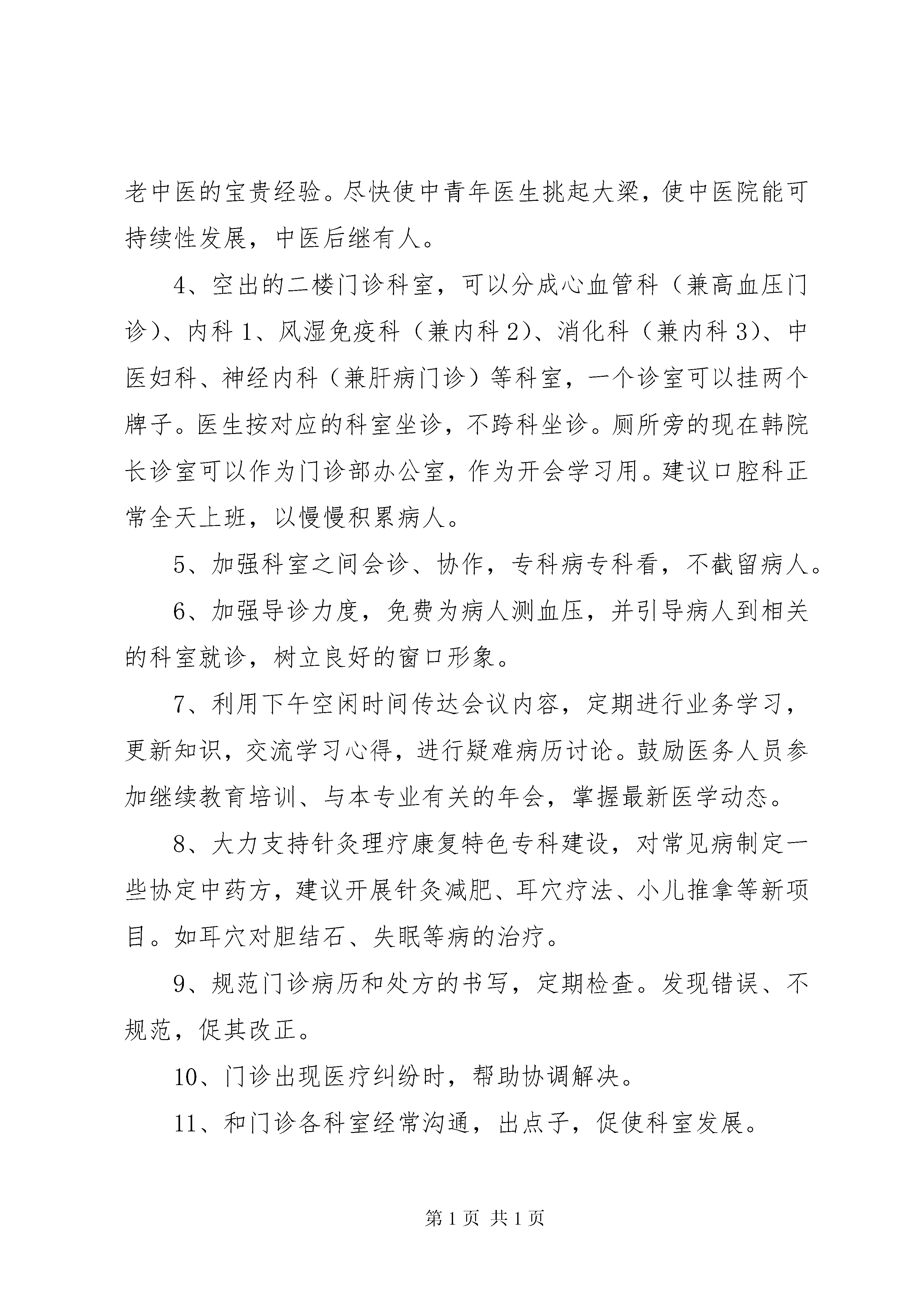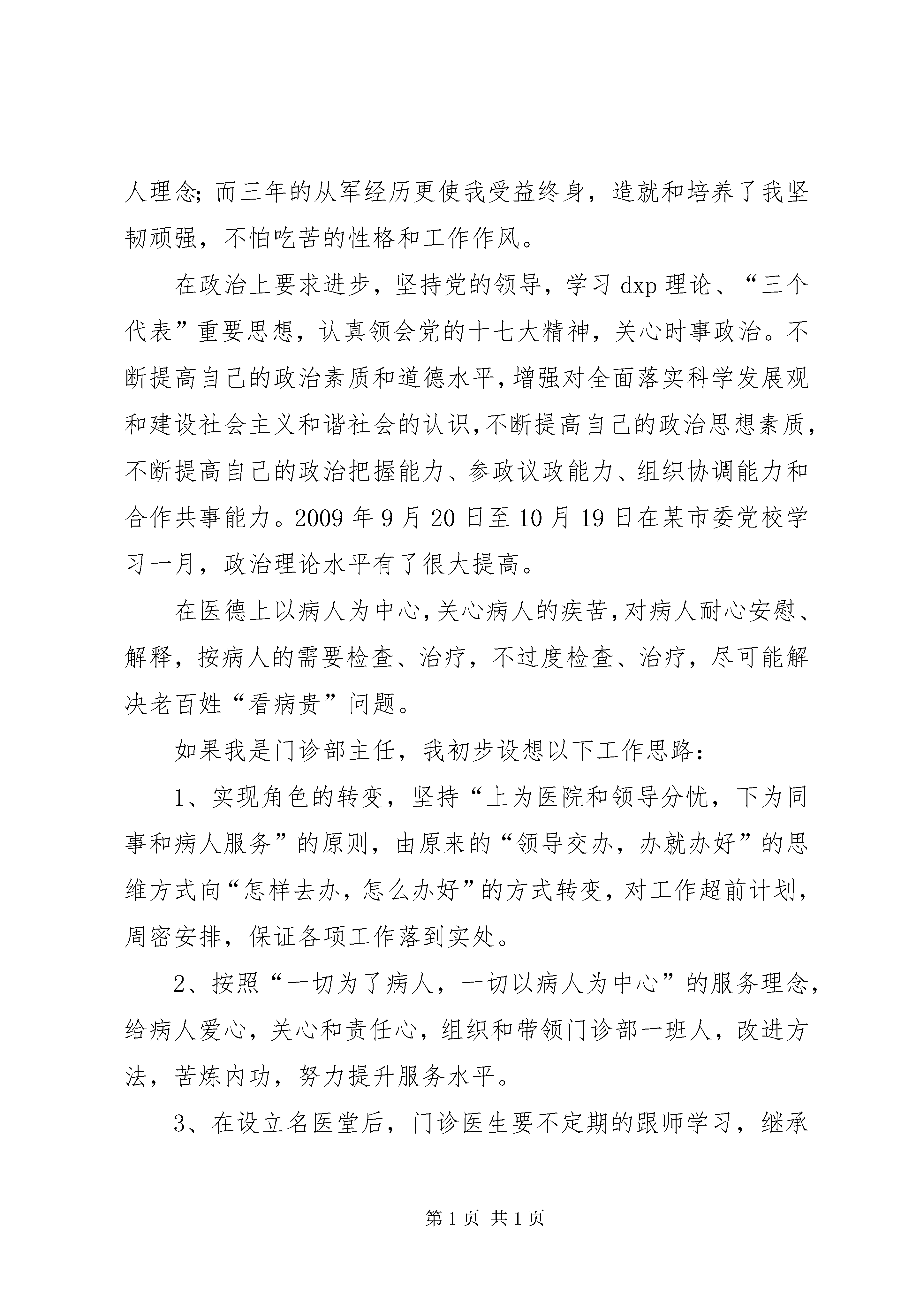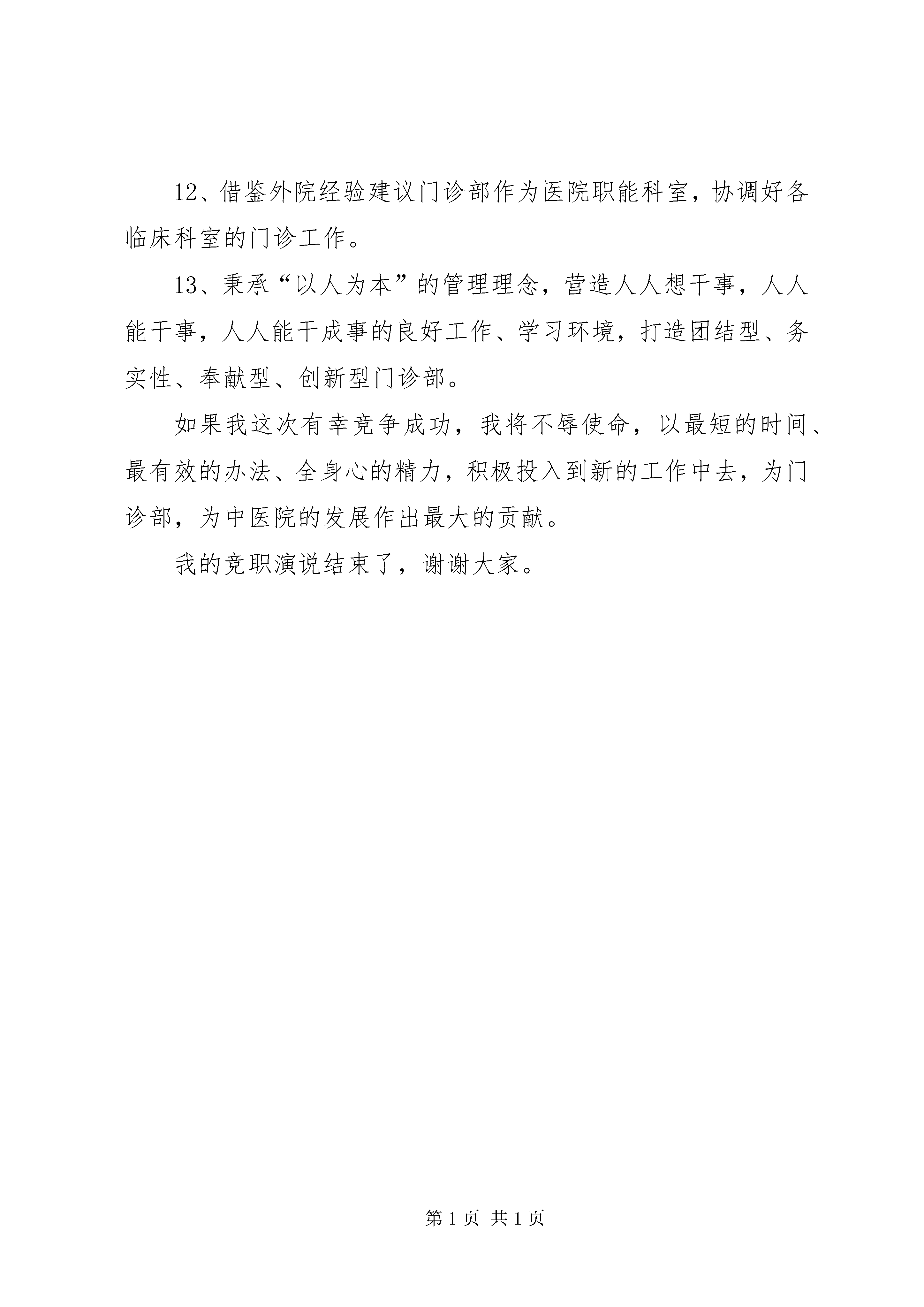 医院主任竞职演讲稿尊敬的各位领导、专家、评委:大家晚上好。我叫xxx,xx岁,主治医师,本科学历,我竞争的岗位是门诊部主任。我之所以竞争这个职位,主要是因为我具备以下几方面的优势和能力:首先,我认为自己具备担任该职务所必须的政治素质和个人品质。一是我的敬业精神比较强,工作认真负责,勤勤恳恳,任劳任怨,干一行,爱一行,专一行。这是干好工作的基础。二是我的思想比较解放,接受新事物比较快,爱学习,勤思考,工作中注意发挥主观能动性,超前意识强。这有利于开拓工作新局面。三是我办事稳妥,处世严谨,原则性较强,能够严格要求自己。这是做好工作的保证。四是我信奉诚实、正派的做人宗旨,能够与人团结共事,具有较强的协调能力。第二,我认为自己具备担任此职务所必须的知识和能力。一是我专业知识全面扎实,对常见病、多发病、疑难病能进行中西医诊治,能对急危重症进行有效抢救。二是有担任急诊科负责人的经历,有一定的管理经验。我的成长离不开领导和同志们的辛勤和汗水,是他们的帮助和支持,使我从一个不谙世事的实习医生成长为中心的一名中层领导;是他们的谆谆教导,使我逐步树立起“以德为先,以诚待人,尊重领导,团结同志,以工作为重,不计较个人得失”的做人理念;而三年的从军经历更使我受益终身,造就和培养了我坚韧顽强,不怕吃苦的性格和工作作风。在政治上要求进步,坚持党的领导,学习dxp理论、“三个代表”重要思想,认真领会党的十七大精神,关心时事政治。不断提高自己的政治素质和道德水平,增强对全面落实科学发展观和建设社会主义和谐社会的认识,不断提高自己的政治思想素质,不断提高自己的政治把握能力、参政议政能力、组织协调能力和合作共事能力。2009年9月20日至10月19日在某市委党校学习一月,政治理论水平有了很大提高。在医德上以病人为中心,关心病人的疾苦,对病人耐心安慰、解释,按病人的需要检查、治疗,不过度检查、治疗,尽可能解决老百姓“看病贵”问题。如果我是门诊部主任,我初步设想以下工作思路:1、实现角色的转变,坚持“上为医院和领导分忧,下为同事和病人服务”的原则,由原来的“领导交办,办就办好”的思维方式向“怎样去办,怎么办好”的方式转变,对工作超前计划,周密安排,保证各项工作落到实处。2、按照“一切为了病人,一切以病人为中心”的服务理念,给病人爱心,关心和责任心,组织和带领门诊部一班人,改进方法,苦炼内功,努力提升服务水平。3、在设立名医堂后,门诊医生要不定期的跟师学习,继承老中医的宝贵经验。尽快使中青年医生挑起大梁,使中医院能可持续性发展,中医后继有人。4、空出的二楼门诊科室,可以分成心血管科(兼高血压门诊)、内科1、风湿免疫科(兼内科2)、消化科(兼内科3)、中医妇科、神经内科(兼肝病门诊)等科室,一个诊室可以挂两个牌子。医生按对应的科室坐诊,不跨科坐诊。厕所旁的现在韩院长诊室可以作为门诊部办公室,作为开会学习用。建议口腔科正常全天上班,以慢慢积累病人。5、加强科室之间会诊、协作,专科病专科看,不截留病人。6、加强导诊力度,免费为病人测血压,并引导病人到相关的科室就诊,树立良好的窗口形象。7、利用下午空闲时间传达会议内容,定期进行业务学习,更新知识,交流学习心得,进行疑难病历讨论。鼓励医务人员参加继续教育培训、与本专业有关的年会,掌握最新医学动态。8、大力支持针灸理疗康复特色专科建设,对常见病制定一些协定中药方,建议开展针灸减肥、耳穴疗法、小儿推拿等新项目。如耳穴对胆结石、失眠等病的治疗。9、规范门诊病历和处方的书写,定期检查。发现错误、不规范,促其改正。10、门诊出现医疗纠纷时,帮助协调解决。11、和门诊各科室经常沟通,出点子,促使科室发展。12、借鉴外院经验建议门诊部作为医院职能科室,协调好各临床科室的门诊工作。13、秉承“以人为本”的管理理念,营造人人想干事,人人能干事,人人能干成事的良好工作、学习环境,打造团结型、务实性、奉献型、创新型门诊部。如果我这次有幸竞争成功,我将不辱使命,以最短的时间、最有效的办法、全身心的精力,积极投入到新的工作中去,为门诊部,为中医院的发展作出最大的贡献。我的竞职演说结束了,谢谢大家。