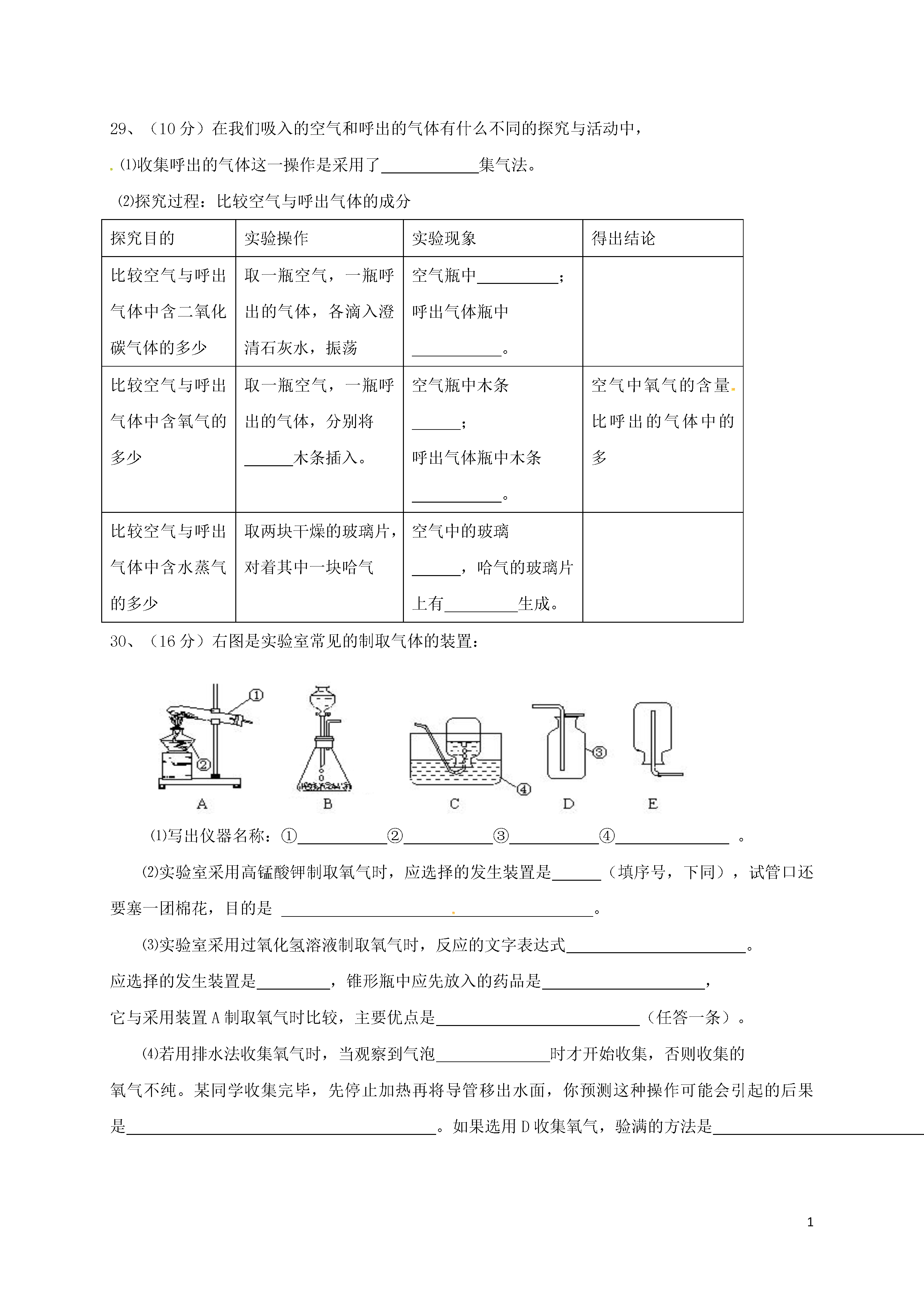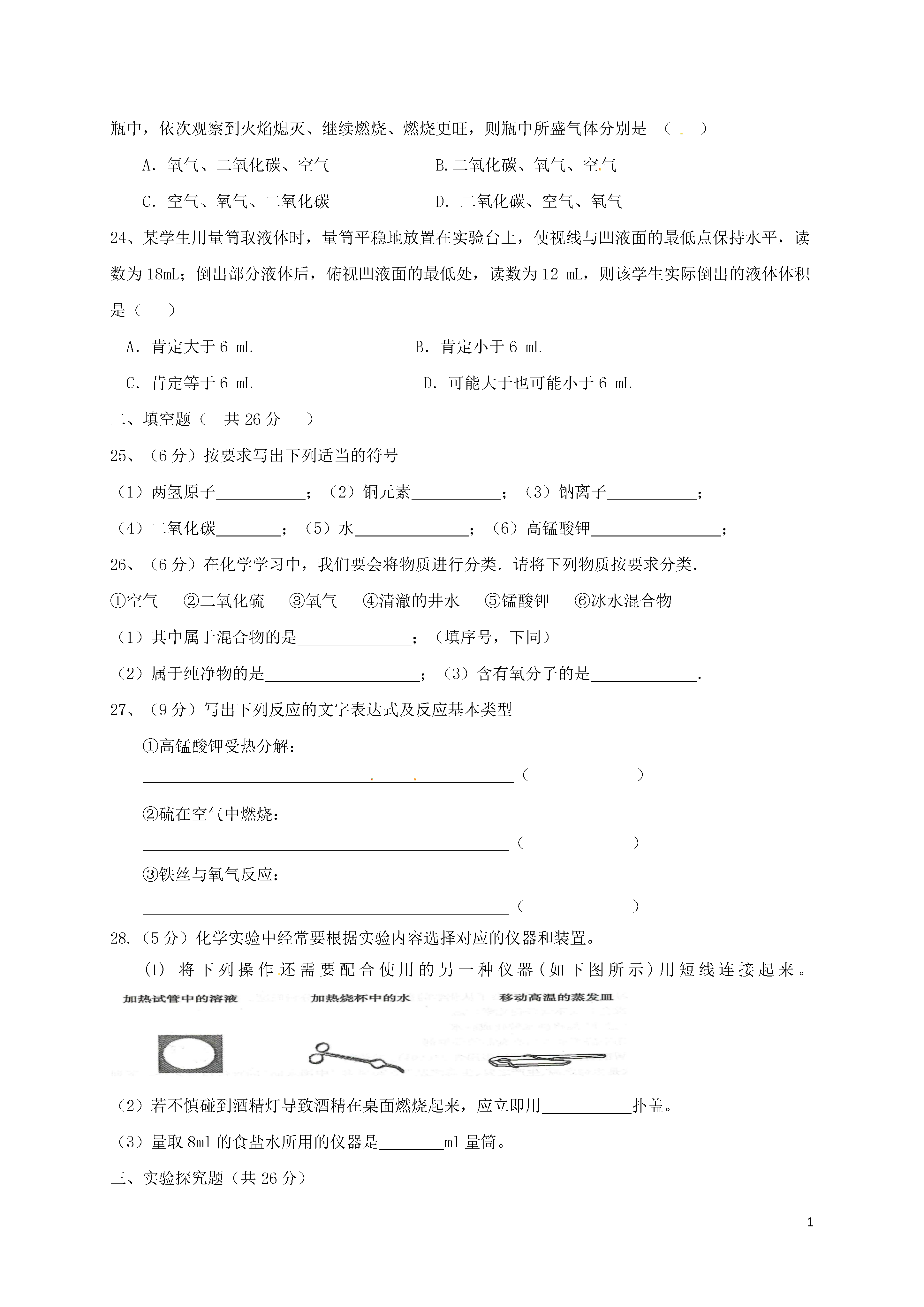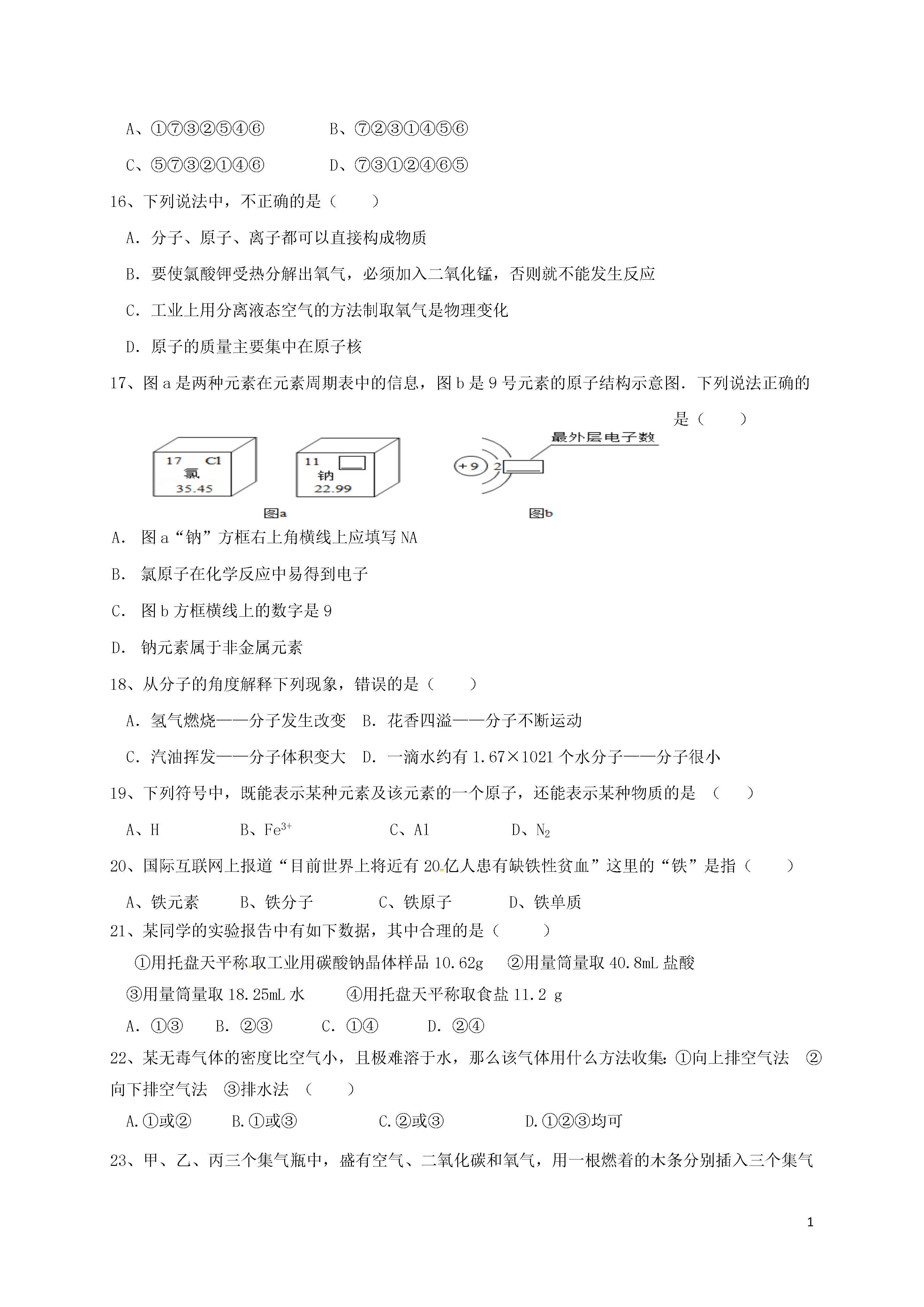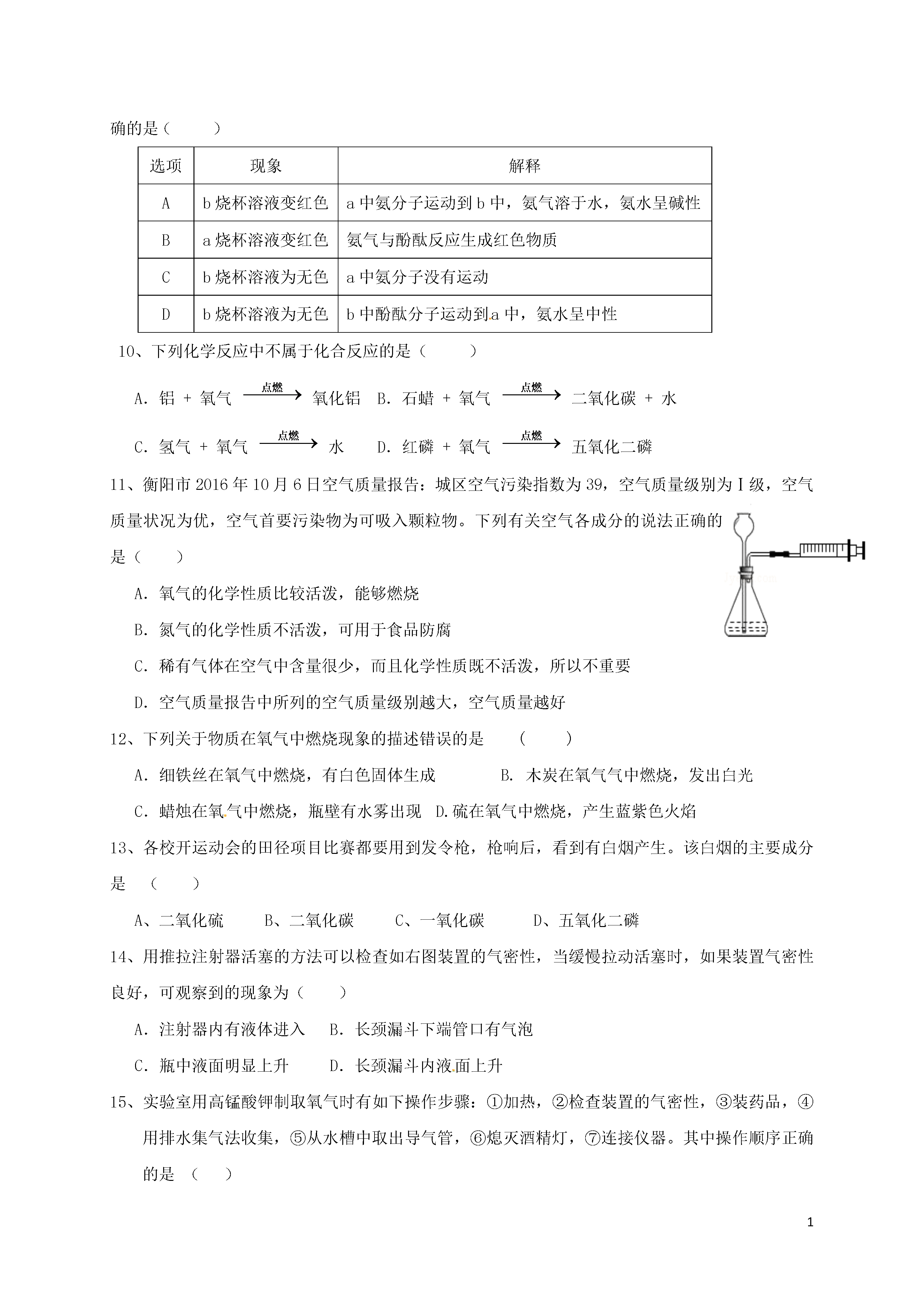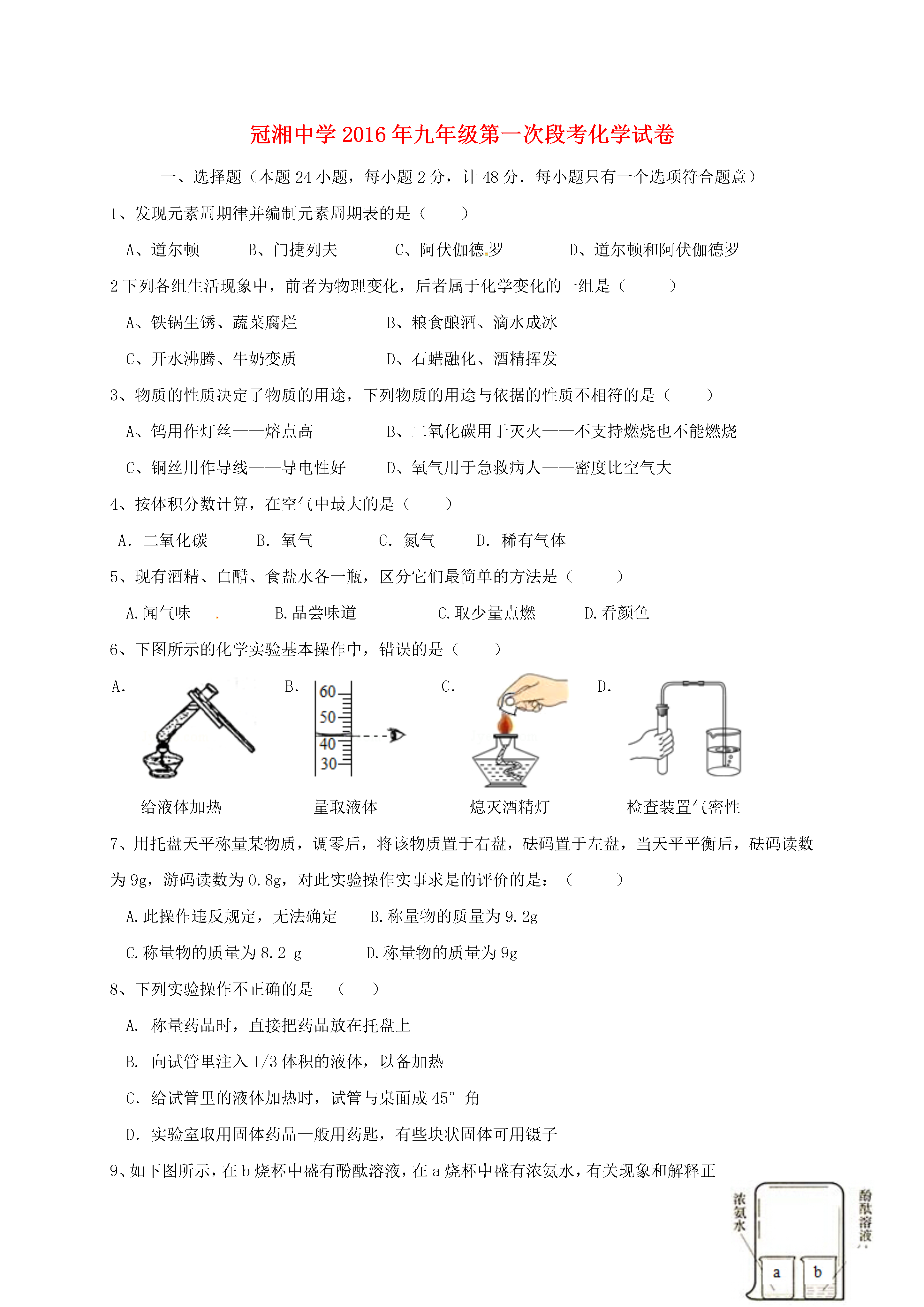 1冠湘中学2016年九年级第一次段考化学试卷一、选择题(本题24小题,每小题2分,计48分.每小题只有一个选项符合题意)1、发现元素周期律并编制元素周期表的是()A、道尔顿B、门捷列夫C、阿伏伽德罗D、道尔顿和阿伏伽德罗2下列各组生活现象中,前者为物理变化,后者属于化学变化的一组是()A、铁锅生锈、蔬菜腐烂B、粮食酿酒、滴水成冰C、开水沸腾、牛奶变质D、石蜡融化、酒精挥发物质的性质决定了物质的用途,下列物质的用途与依据的性质不相符的是()A、钨用作灯丝——熔点高B、二氧化碳用于灭火——不支持燃烧也不能燃烧C、铜丝用作导线——导电性好D、氧气用于急救病人——密度比空气大4、按体积分数计算,在空气中最大的是()A.二氧化碳B.氧气C.氮气D.稀有气体5、现有酒精、白醋、食盐水各一瓶,区分它们最简单的方法是()A.闻气味B.品尝味道C.取少量点燃D.看颜色6、下图所示的化学实验基本操作中,错误的是()A.给液体加热B.量取液体C.熄灭酒精灯D.检查装置气密性7、用托盘天平称量某物质,调零后,将该物质置于右盘,砝码置于左盘,当天平平衡后,砝码读数为9g,游码读数为0.8g,对此实验操作实事求是的评价的是:()A.此操作违反规定,无法确定B.称量物的质量为9.2gC.称量物的质量为8.2gD.称量物的质量为9g8、下列实验操作不正确的是()A.称量药品时,直接把药品放在托盘上B.向试管里注入1/3体积的液体,以备加热C.给试管里的液体加热时,试管与桌面成45°角D.实验室取用固体药品一般用药匙,有些块状固体可用镊子9、如下图所示,在b烧杯中盛有酚酞溶液,在a烧杯中盛有浓氨水,有关现象和解释正确的是()选项现象解释Ab烧杯溶液变红色a中氨分子运动到b中,氨气溶于水,氨水呈碱性Ba烧杯溶液变红色氨气与酚酞反应生成红色物质Cb烧杯溶液为无色a中氨分子没有运动Db烧杯溶液为无色b中酚酞分子运动到a中,氨水呈中性10、下列化学反应中不属于化合反应的是()A.铝+氧气氧化铝B.石蜡+氧气二氧化碳+水C.氢气+氧气水D.红磷+氧气五氧化二磷11、衡阳市2016年10月6日空气质量报告:城区空气污染指数为39,空气质量级别为Ⅰ级,空气质量状况为优,空气首要污染物为可吸入颗粒物。下列有关空气各成分的说法正确的是()A.氧气的化学性质比较活泼,能够燃烧B.氮气的化学性质不活泼,可用于食品防腐C.稀有气体在空气中含量很少,而且化学性质既不活泼,所以不重要D.空气质量报告中所列的空气质量级别越大,空气质量越好12、下列关于物质在氧气中燃烧现象的描述错误的是()A.细铁丝在氧气中燃烧,有白色固体生成B.木炭在氧气气中燃烧,发出白光C.蜡烛在氧气中燃烧,瓶壁有水雾出现D.硫在氧气中燃烧,产生蓝紫色火焰13、各校开运动会的田径项目比赛都要用到发令枪,枪响后,看到有白烟产生。该白烟的主要成分是()A、二氧化硫B、二氧化碳C、一氧化碳D、五氧化二磷14、用推拉注射器活塞的方法可以检查如右图装置的气密性,当缓慢拉动活塞时,如果装置气密性良好,可观察到的现象为()A.注射器内有液体进入B.长颈漏斗下端管口有气泡C.瓶中液面明显上升D.长颈漏斗内液面上升15、实验室用高锰酸钾制取氧气时有如下操作步骤:①加热,②检查装置的气密性,③装药品,④用排水集气法收集,⑤从水槽中取出导气管,⑥熄灭酒精灯,⑦连接仪器。其中操作顺序正确的是()A、①⑦③②⑤④⑥B、⑦②③①④⑤⑥C、⑤⑦③②①④⑥D、⑦③①②④⑥⑤16、下列说法中,不正确的是()A.分子、原子、离子都可以直接构成物质B.要使氯酸钾受热分解出氧气,必须加入二氧化锰,否则就不能发生反应C.工业上用分离液态空气的方法制取氧气是物理变化D.原子的质量主要集中在原子核17、图a是两种元素在元素周期表中的信息,图b是9号元素的原子结构示意图.下列说法正确的是()A.图a“钠”方框右上角横线上应填写NAB.氯原子在化学反应中易得到电子C.图b方框横线上的数字是9D.钠元素属于非金属元素18、从分子的角度解释下列现象,错误的是()A.氢气燃烧——分子发生改变B.花香四溢——分子不断运动C.汽油挥发——分子体积变大D.一滴水约有1.67×1021个水分子——分子很小19、下列符号中,既能表示某种元素及该元素的一个原子,还能表示某种物质的是()A、HB、Fe3+C、AlD、N220、国际互联网上报道“目前世界上将近有20亿人患有缺铁性贫血”这里的“铁”是指()A、铁元素B、铁分子C、铁原子D、铁单质21、某同学的实验报告中有如下数据,其中合理的是()①用托盘天平称取工业用碳酸钠晶体样品10.62g②用量筒量取