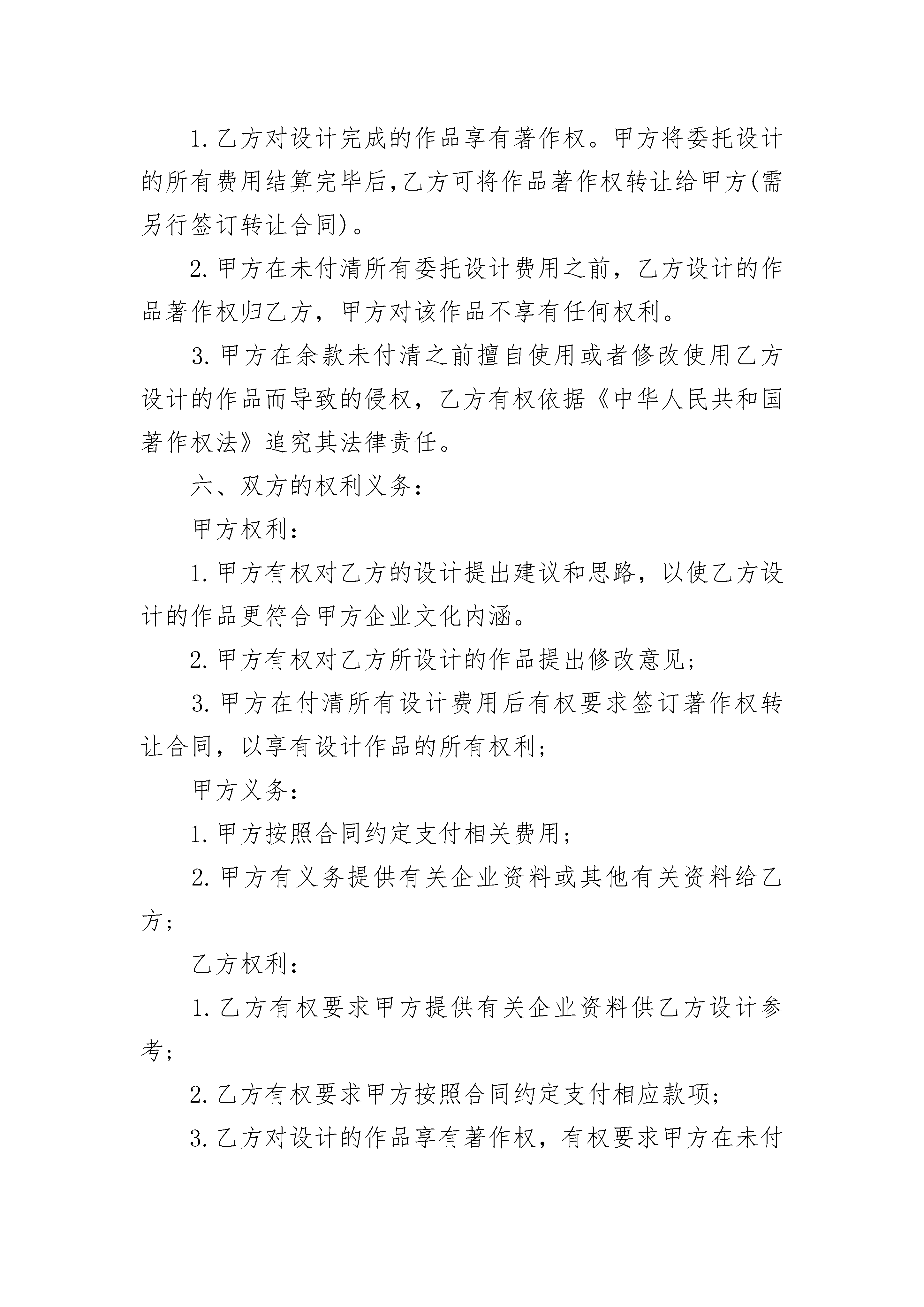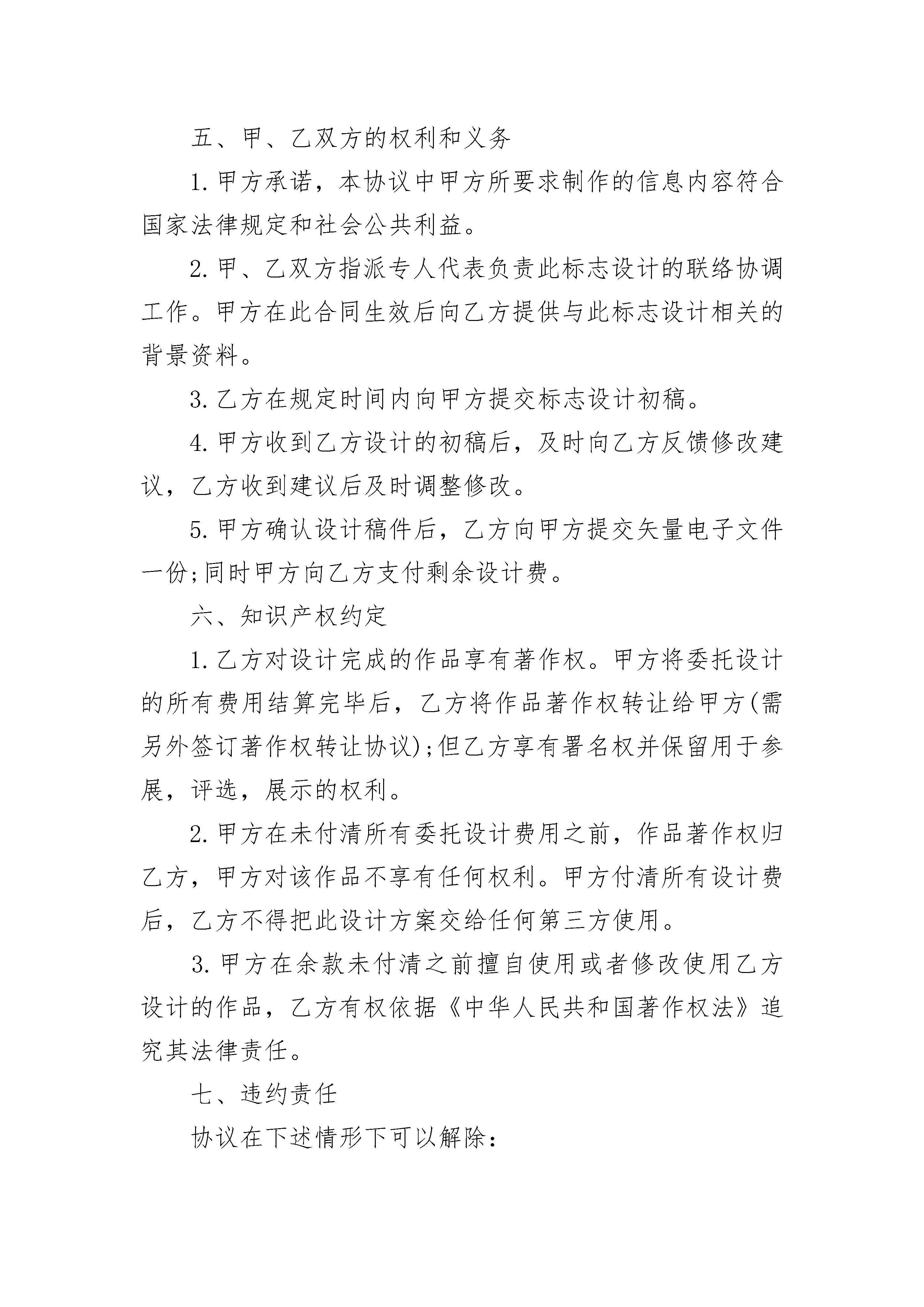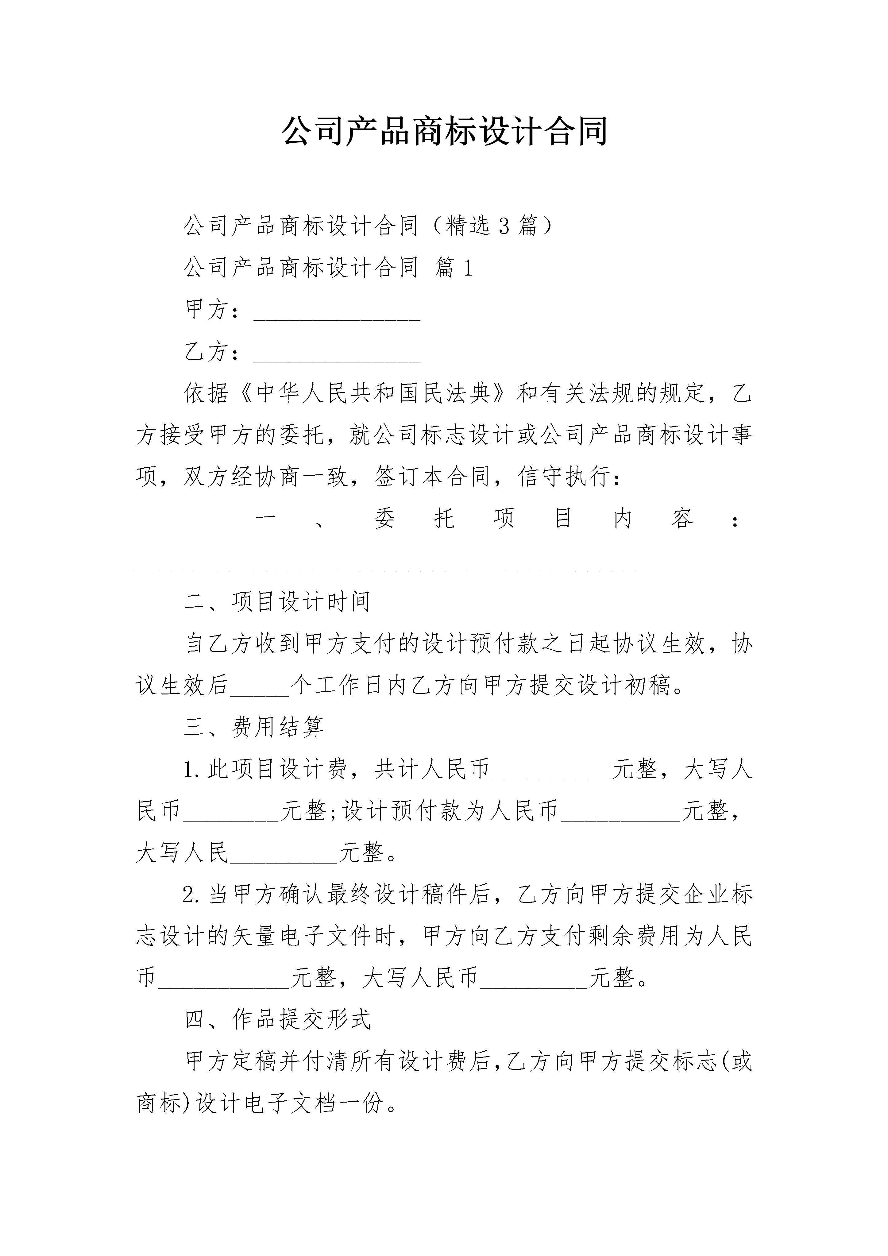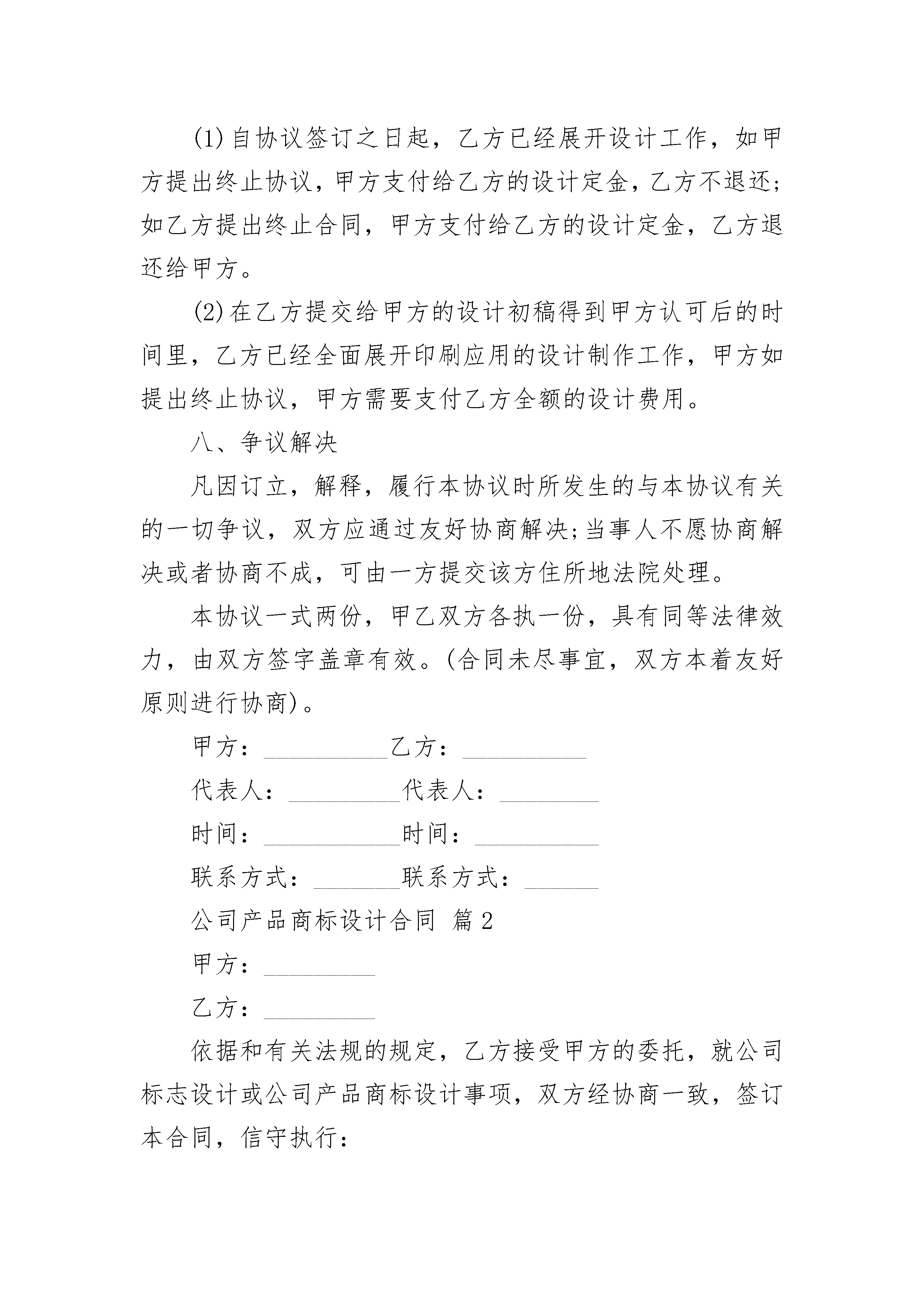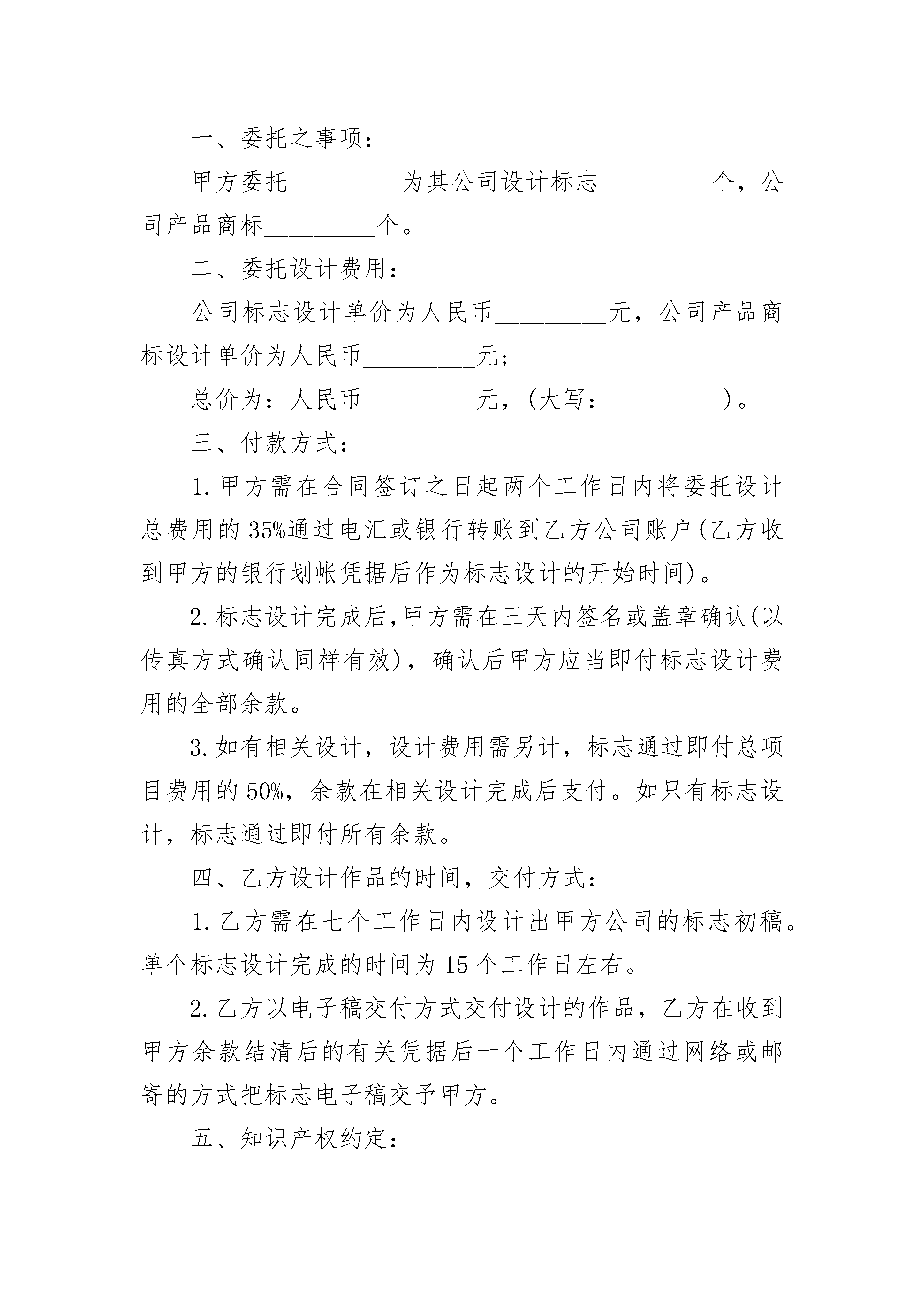 公司产品商标设计合同公司产品商标设计合同(精选3篇)公司产品商标设计合同篇1甲方:______________乙方:______________依据《中华人民共和国民法典》和有关法规的规定,乙方接受甲方的委托,就公司标志设计或公司产品商标设计事项,双方经协商一致,签订本合同,信守执行:一、委托项目内容:__________________________________________二、项目设计时间自乙方收到甲方支付的设计预付款之日起协议生效,协议生效后_____个工作日内乙方向甲方提交设计初稿。三、费用结算1.此项目设计费,共计人民币__________元整,大写人民币________元整;设计预付款为人民币__________元整,大写人民_________元整。2.当甲方确认最终设计稿件后,乙方向甲方提交企业标志设计的矢量电子文件时,甲方向乙方支付剩余费用为人民币___________元整,大写人民币_________元整。四、作品提交形式甲方定稿并付清所有设计费后,乙方向甲方提交标志(或商标)设计电子文档一份。五、甲、乙双方的权利和义务1.甲方承诺,本协议中甲方所要求制作的信息内容符合国家法律规定和社会公共利益。2.甲、乙双方指派专人代表负责此标志设计的联络协调工作。甲方在此合同生效后向乙方提供与此标志设计相关的背景资料。3.乙方在规定时间内向甲方提交标志设计初稿。4.甲方收到乙方设计的初稿后,及时向乙方反馈修改建议,乙方收到建议后及时调整修改。5.甲方确认设计稿件后,乙方向甲方提交矢量电子文件一份;同时甲方向乙方支付剩余设计费。六、知识产权约定1.乙方对设计完成的作品享有著作权。甲方将委托设计的所有费用结算完毕后,乙方将作品著作权转让给甲方(需另外签订著作权转让协议);但乙方享有署名权并保留用于参展,评选,展示的权利。2.甲方在未付清所有委托设计费用之前,作品著作权归乙方,甲方对该作品不享有任何权利。甲方付清所有设计费后,乙方不得把此设计方案交给任何第三方使用。3.甲方在余款未付清之前擅自使用或者修改使用乙方设计的作品,乙方有权依据《中华人民共和国著作权法》追究其法律责任。七、违约责任协议在下述情形下可以解除:(1)自协议签订之日起,乙方已经展开设计工作,如甲方提出终止协议,甲方支付给乙方的设计定金,乙方不退还;如乙方提出终止合同,甲方支付给乙方的设计定金,乙方退还给甲方。(2)在乙方提交给甲方的设计初稿得到甲方认可后的时间里,乙方已经全面展开印刷应用的设计制作工作,甲方如提出终止协议,甲方需要支付乙方全额的设计费用。八、争议解决凡因订立,解释,履行本协议时所发生的与本协议有关的一切争议,双方应通过友好协商解决;当事人不愿协商解决或者协商不成,可由一方提交该方住所地法院处理。本协议一式两份,甲乙双方各执一份,具有同等法律效力,由双方签字盖章有效。(合同未尽事宜,双方本着友好原则进行协商)。甲方:__________乙方:__________代表人:_________代表人:________时间:___________时间:__________联系方式:_______联系方式:______公司产品商标设计合同篇2甲方:_________乙方:_________依据和有关法规的规定,乙方接受甲方的委托,就公司标志设计或公司产品商标设计事项,双方经协商一致,签订本合同,信守执行:一、委托之事项:甲方委托_________为其公司设计标志_________个,公司产品商标_________个。二、委托设计费用:公司标志设计单价为人民币_________元,公司产品商标设计单价为人民币_________元;总价为:人民币_________元,(大写:_________)。三、付款方式:1.甲方需在合同签订之日起两个工作日内将委托设计总费用的35%通过电汇或银行转账到乙方公司账户(乙方收到甲方的银行划帐凭据后作为标志设计的开始时间)。2.标志设计完成后,甲方需在三天内签名或盖章确认(以传真方式确认同样有效),确认后甲方应当即付标志设计费用的全部余款。3.如有相关设计,设计费用需另计,标志通过即付总项目费用的50%,余款在相关设计完成后支付。如只有标志设计,标志通过即付所有余款。四、乙方设计作品的时间,交付方式:1.乙方需在七个工作日内设计出甲方公司的标志初稿。单个标志设计完成的时间为15个工作日左右。2.乙方以电子稿交付方式交付设计的作品,乙方在收到甲方余款结清后的有关凭据后一个工作日内通过网络或邮寄的方式把标志电子稿交予甲方。五、知识产权约定:1.乙方对设计完成的作品享有著作权。甲方将委托设计的所有费用结算完毕后,乙方可将作品著作权转让给甲方(需另行签订转让合同)。2.甲方在未付清所有委托设计费用之前,乙方设计的作品著作