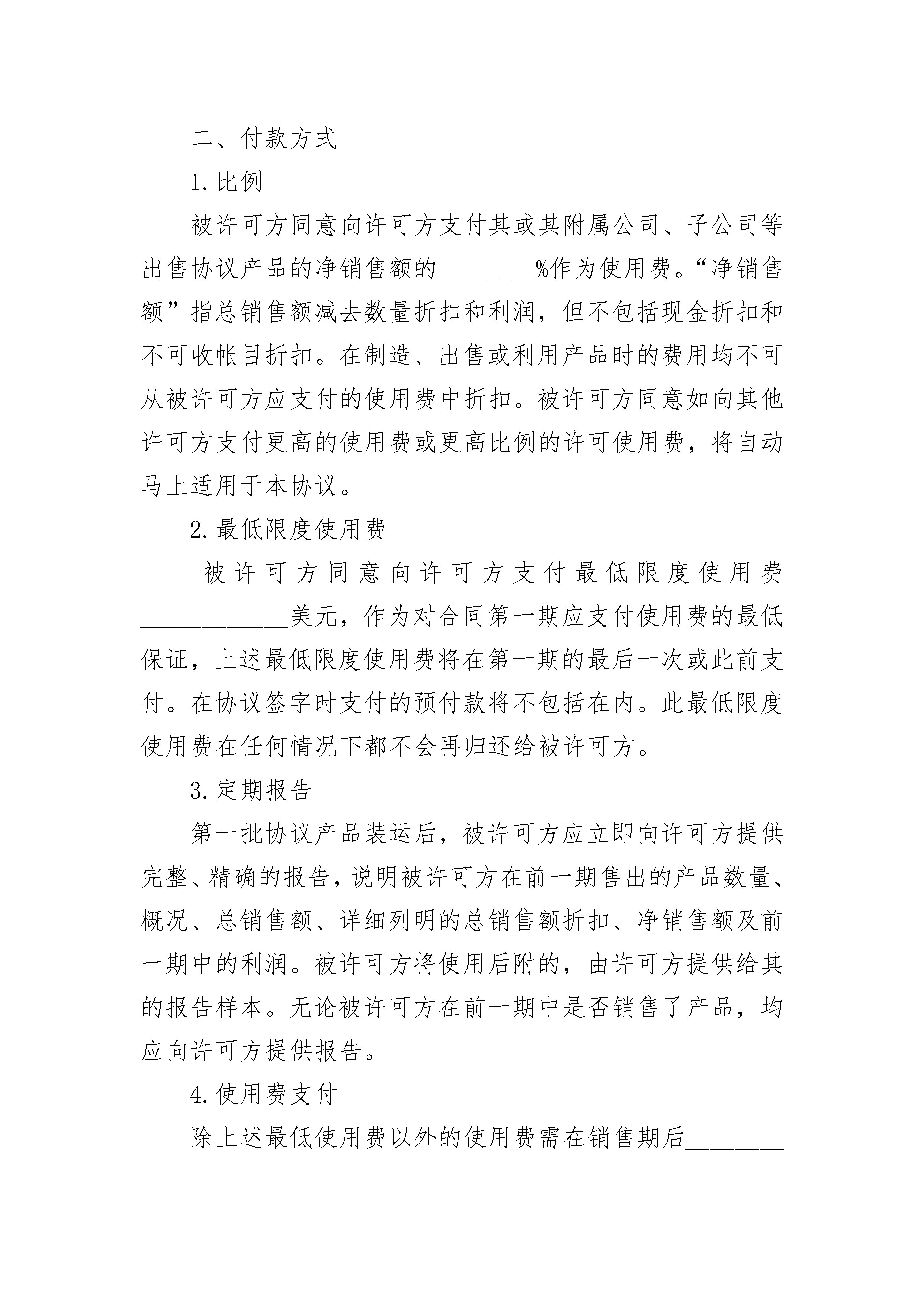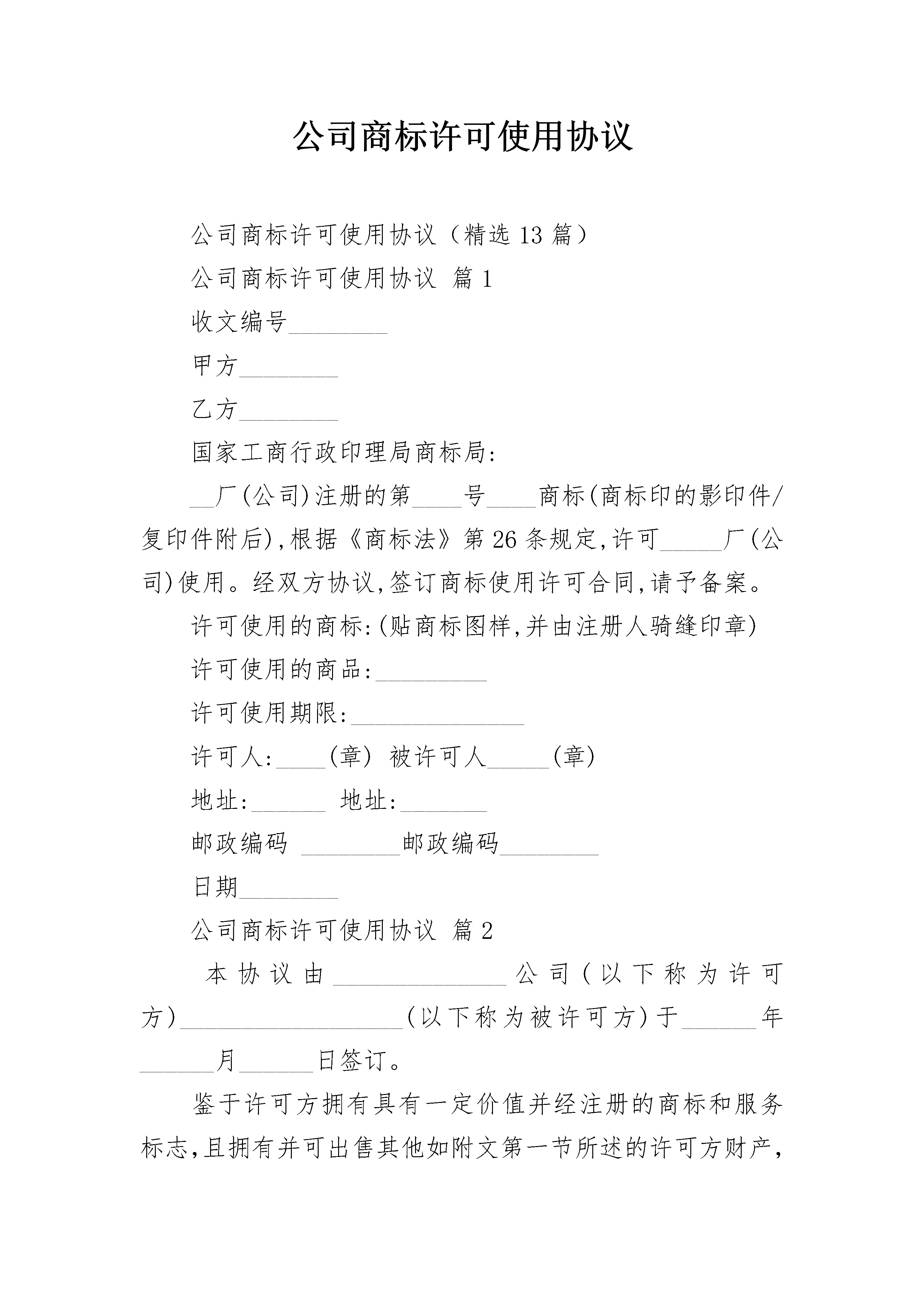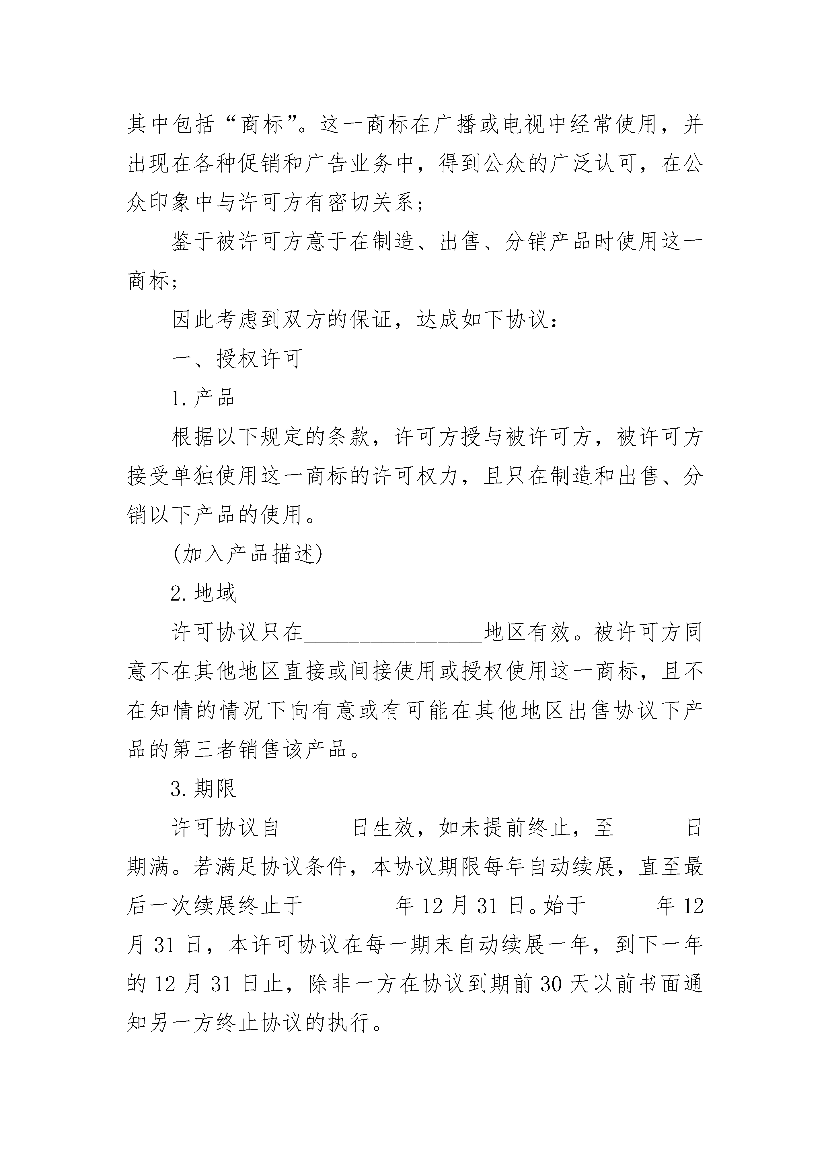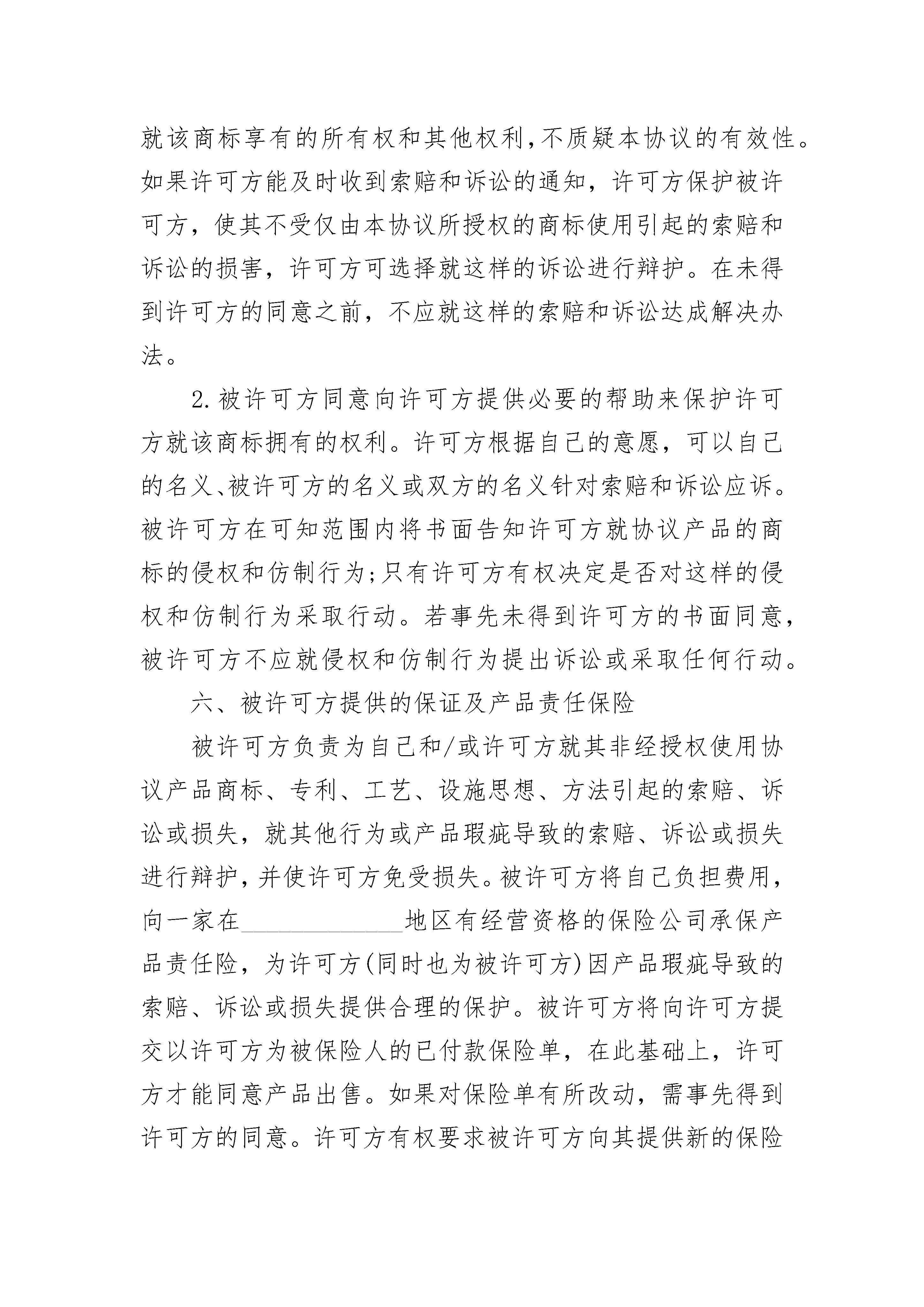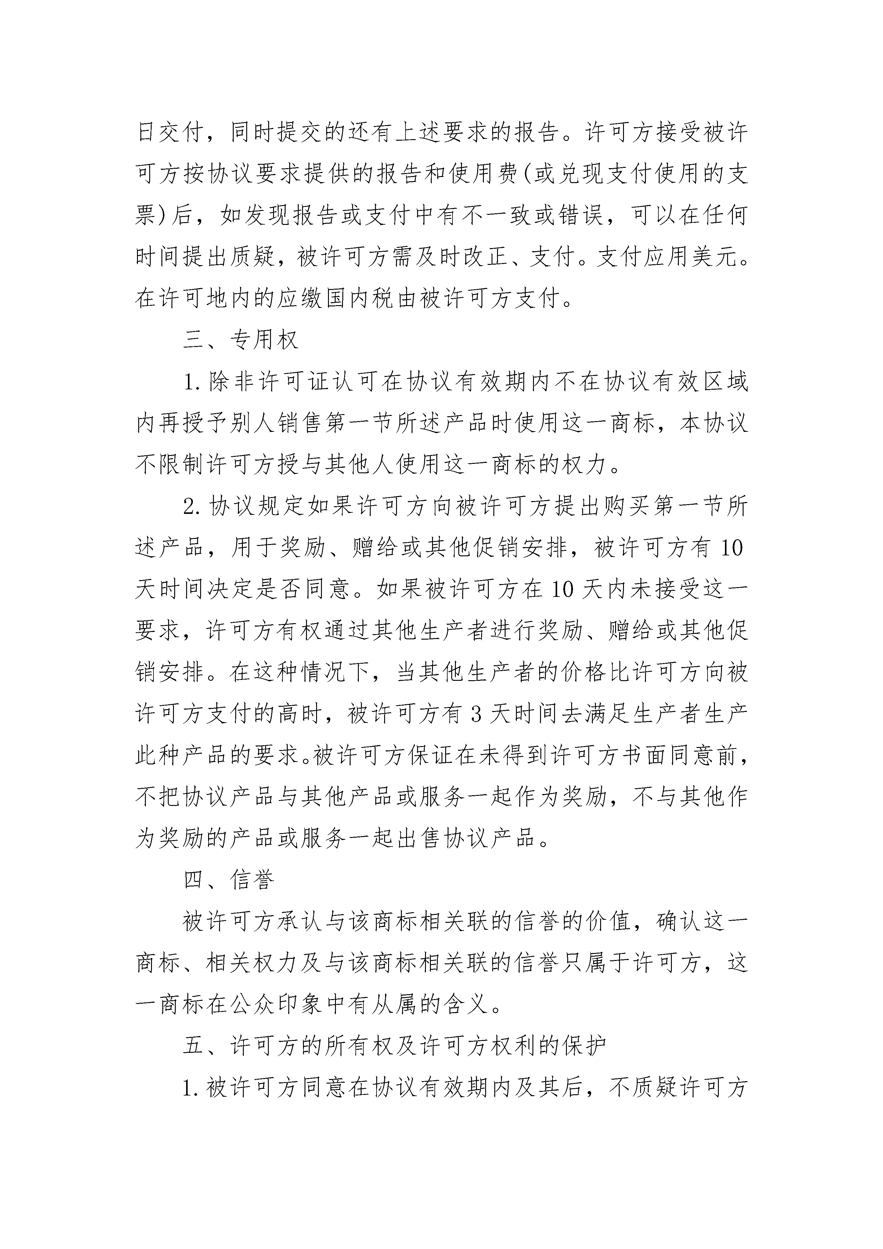 公司商标许可使用协议公司商标许可使用协议(精选13篇)公司商标许可使用协议篇1收文编号________甲方________乙方________国家工商行政印理局商标局:__厂(公司)注册的第____号____商标(商标印的影印件/复印件附后),根据《商标法》第26条规定,许可_____厂(公司)使用。经双方协议,签订商标使用许可合同,请予备案。许可使用的商标:(贴商标图样,并由注册人骑缝印章)许可使用的商品:_________许可使用期限:______________许可人:____(章)被许可人_____(章)地址:______地址:_______邮政编码________邮政编码________日期________公司商标许可使用协议篇2本协议由______________公司(以下称为许可方)__________________(以下称为被许可方)于______年______月______日签订。鉴于许可方拥有具有一定价值并经注册的商标和服务标志,且拥有并可出售其他如附文第一节所述的许可方财产,其中包括“商标”。这一商标在广播或电视中经常使用,并出现在各种促销和广告业务中,得到公众的广泛认可,在公众印象中与许可方有密切关系;鉴于被许可方意于在制造、出售、分销产品时使用这一商标;因此考虑到双方的保证,达成如下协议:一、授权许可1.产品根据以下规定的条款,许可方授与被许可方,被许可方接受单独使用这一商标的许可权力,且只在制造和出售、分销以下产品的使用。(加入产品描述)2.地域许可协议只在________________地区有效。被许可方同意不在其他地区直接或间接使用或授权使用这一商标,且不在知情的情况下向有意或有可能在其他地区出售协议下产品的第三者销售该产品。3.期限许可协议自______日生效,如未提前终止,至______日期满。若满足协议条件,本协议期限每年自动续展,直至最后一次续展终止于________年12月31日。始于______年12月31日,本许可协议在每一期末自动续展一年,到下一年的12月31日止,除非一方在协议到期前30天以前书面通知另一方终止协议的执行。二、付款方式1.比例被许可方同意向许可方支付其或其附属公司、子公司等出售协议产品的净销售额的________%作为使用费。“净销售额”指总销售额减去数量折扣和利润,但不包括现金折扣和不可收帐目折扣。在制造、出售或利用产品时的费用均不可从被许可方应支付的使用费中折扣。被许可方同意如向其他许可方支付更高的使用费或更高比例的许可使用费,将自动马上适用于本协议。2.最低限度使用费被许可方同意向许可方支付最低限度使用费____________美元,作为对合同第一期应支付使用费的最低保证,上述最低限度使用费将在第一期的最后一次或此前支付。在协议签字时支付的预付款将不包括在内。此最低限度使用费在任何情况下都不会再归还给被许可方。3.定期报告第一批协议产品装运后,被许可方应立即向许可方提供完整、精确的报告,说明被许可方在前一期售出的产品数量、概况、总销售额、详细列明的总销售额折扣、净销售额及前一期中的利润。被许可方将使用后附的,由许可方提供给其的报告样本。无论被许可方在前一期中是否销售了产品,均应向许可方提供报告。4.使用费支付除上述最低使用费以外的使用费需在销售期后________日交付,同时提交的还有上述要求的报告。许可方接受被许可方按协议要求提供的报告和使用费(或兑现支付使用的支票)后,如发现报告或支付中有不一致或错误,可以在任何时间提出质疑,被许可方需及时改正、支付。支付应用美元。在许可地内的应缴国内税由被许可方支付。三、专用权1.除非许可证认可在协议有效期内不在协议有效区域内再授予别人销售第一节所述产品时使用这一商标,本协议不限制许可方授与其他人使用这一商标的权力。2.协议规定如果许可方向被许可方提出购买第一节所述产品,用于奖励、赠给或其他促销安排,被许可方有10天时间决定是否同意。如果被许可方在10天内未接受这一要求,许可方有权通过其他生产者进行奖励、赠给或其他促销安排。在这种情况下,当其他生产者的价格比许可方向被许可方支付的高时,被许可方有3天时间去满足生产者生产此种产品的要求。被许可方保证在未得到许可方书面同意前,不把协议产品与其他产品或服务一起作为奖励,不与其他作为奖励的产品或服务一起出售协议产品。四、信誉被许可方承认与该商标相关联的信誉的价值,确认这一商标、相关权力及与该商标相关联的信誉只属于许可方,这一商标在公众印象中有从属的含义。五、许可方的所有权及许可方权利的保护1.被许可方同意在协议有效期内及其后,不质疑许可方就该商标享有的所有权和其他权利,不质疑本协议的有效性。如果许可方能及时收到索赔和诉讼的通知,许可方保护被许可方,使其不受仅由本协议所授